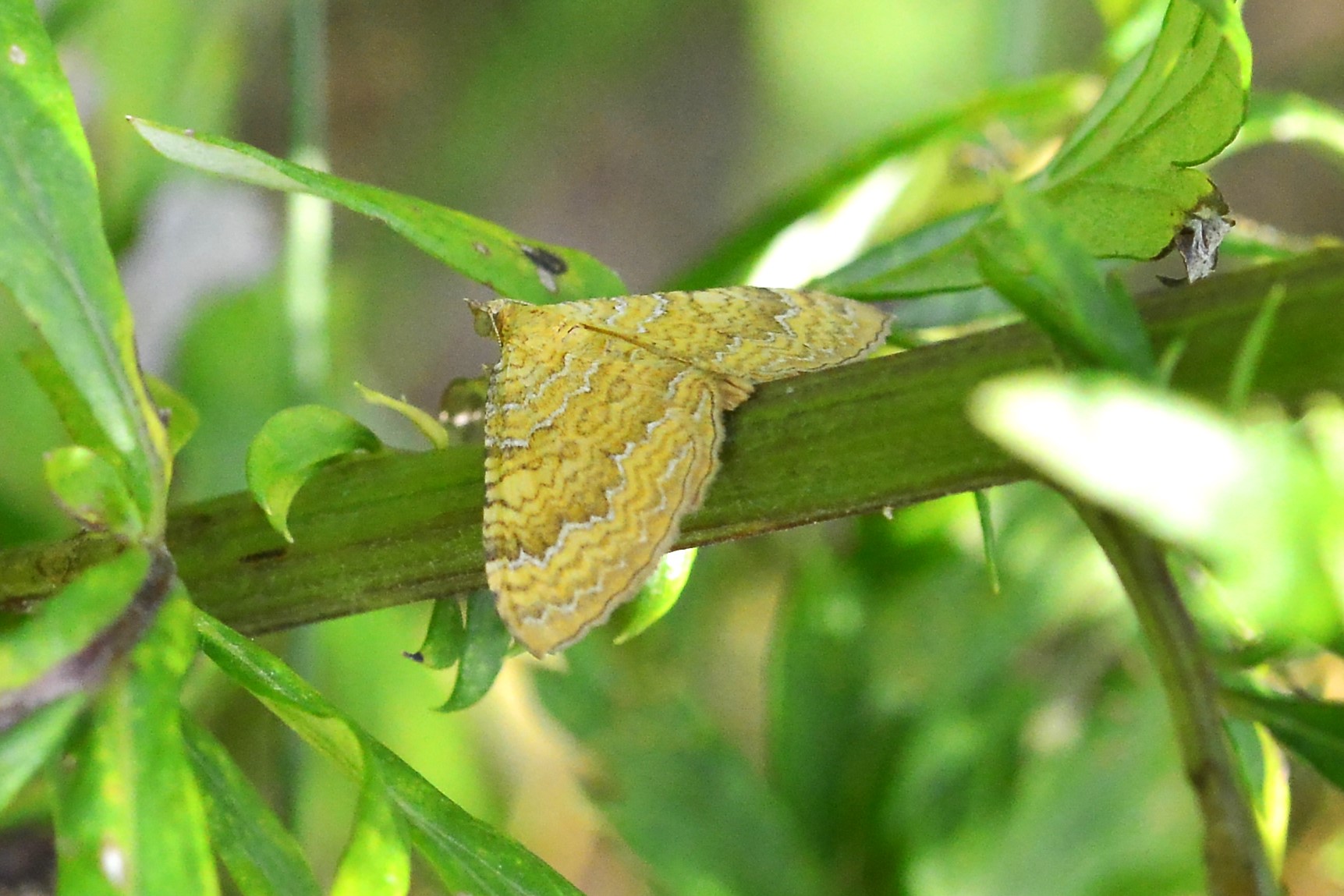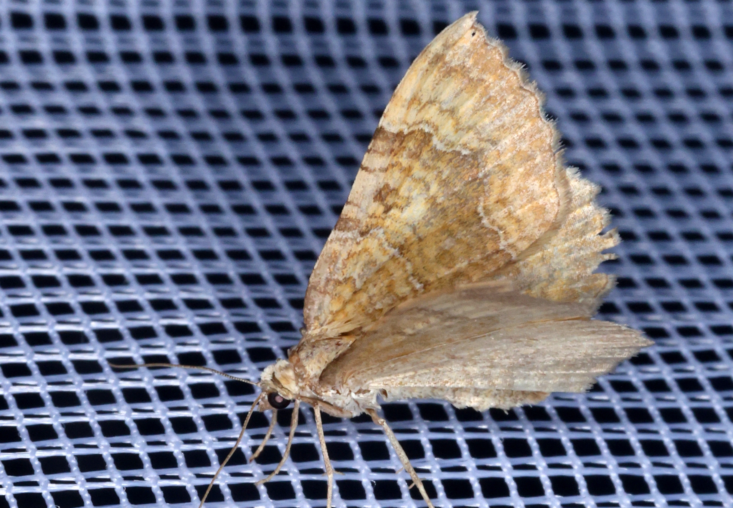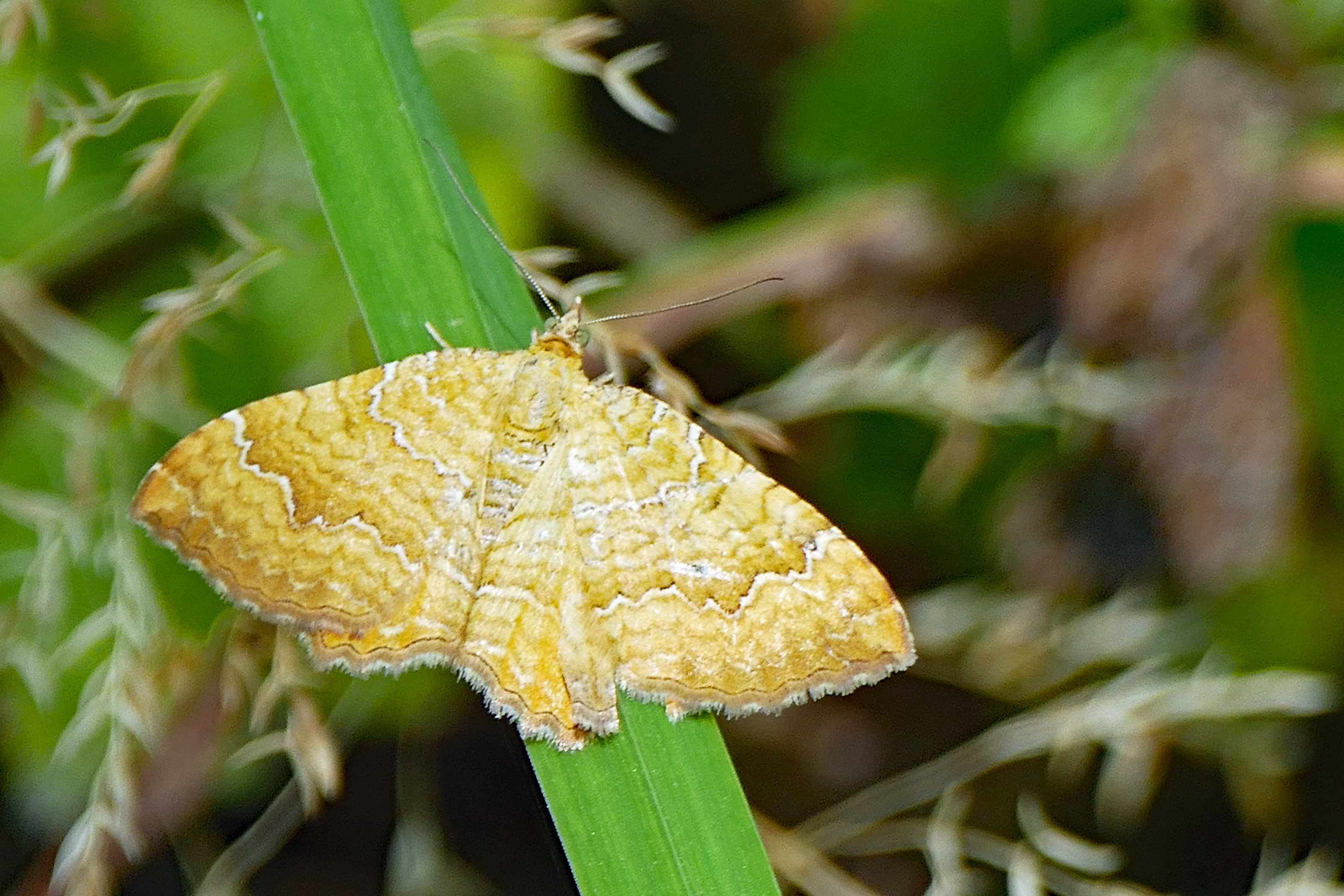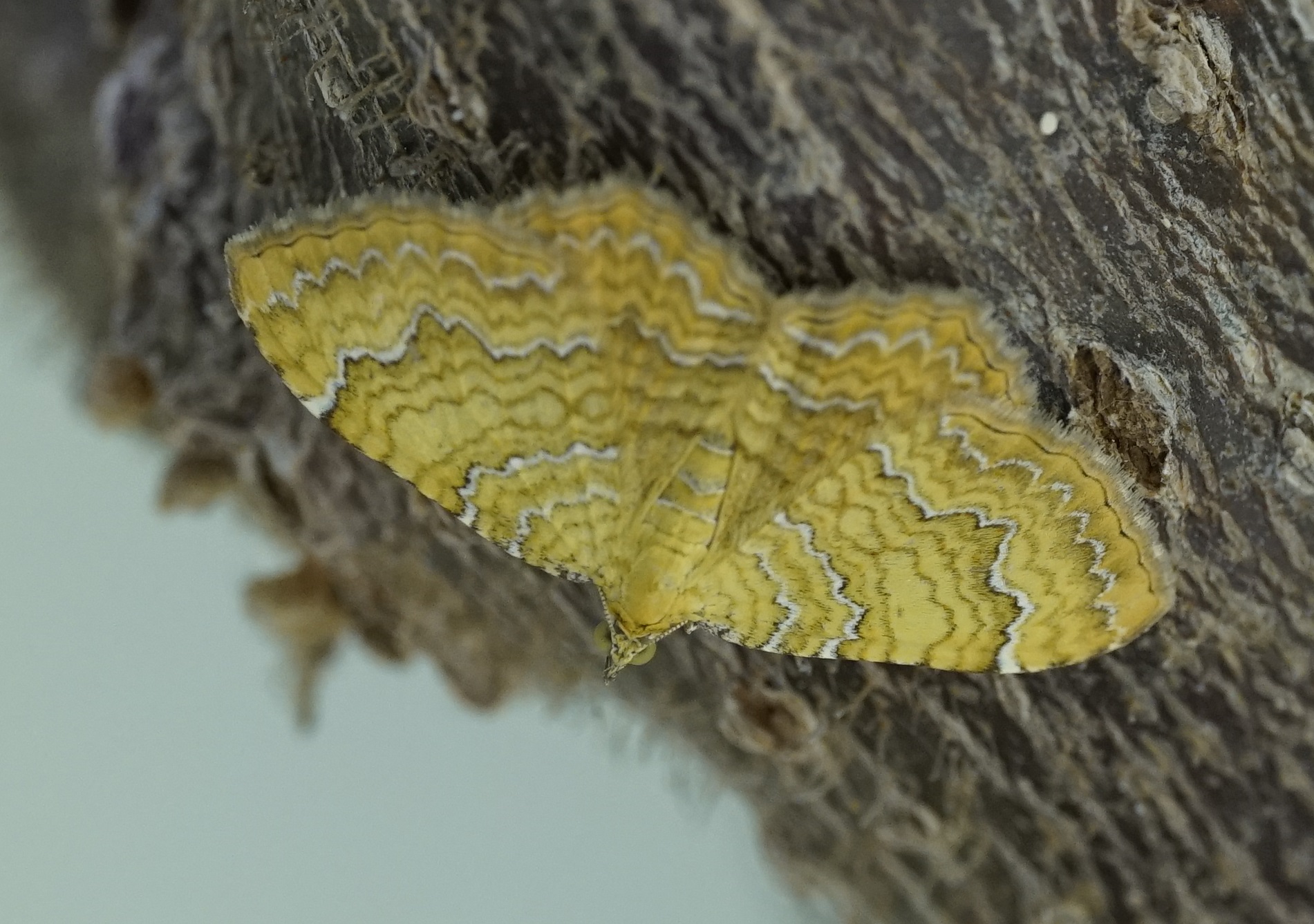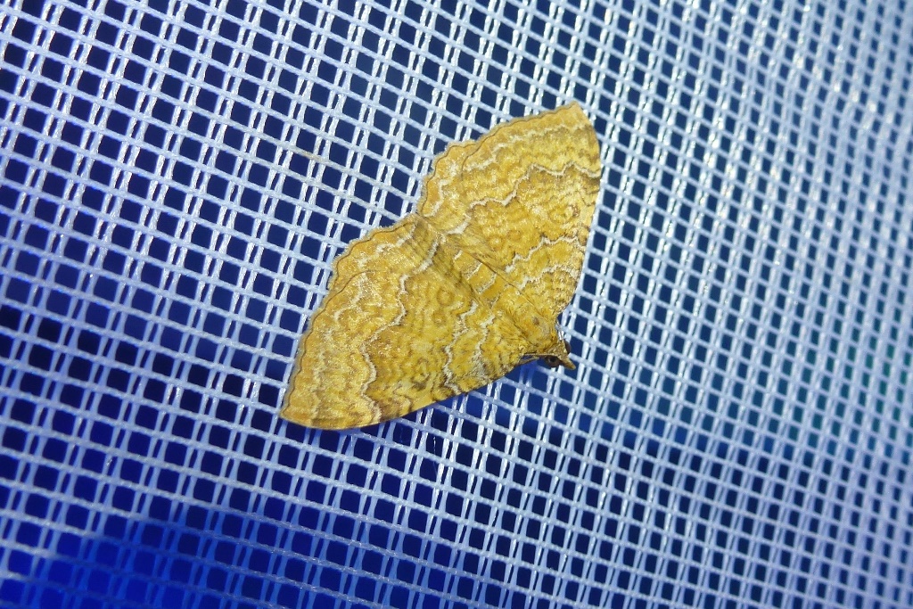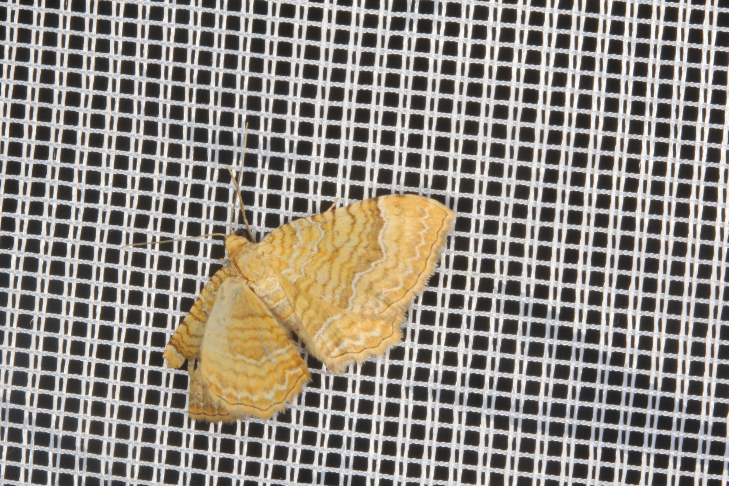 Ockergelbe Blattspanner, oder Löwenzahnspanner oder Brennnesselspanner (Camptogramma bilineata (Linnaeus, 1758)), am Licht, Radeberg, August 2013.
