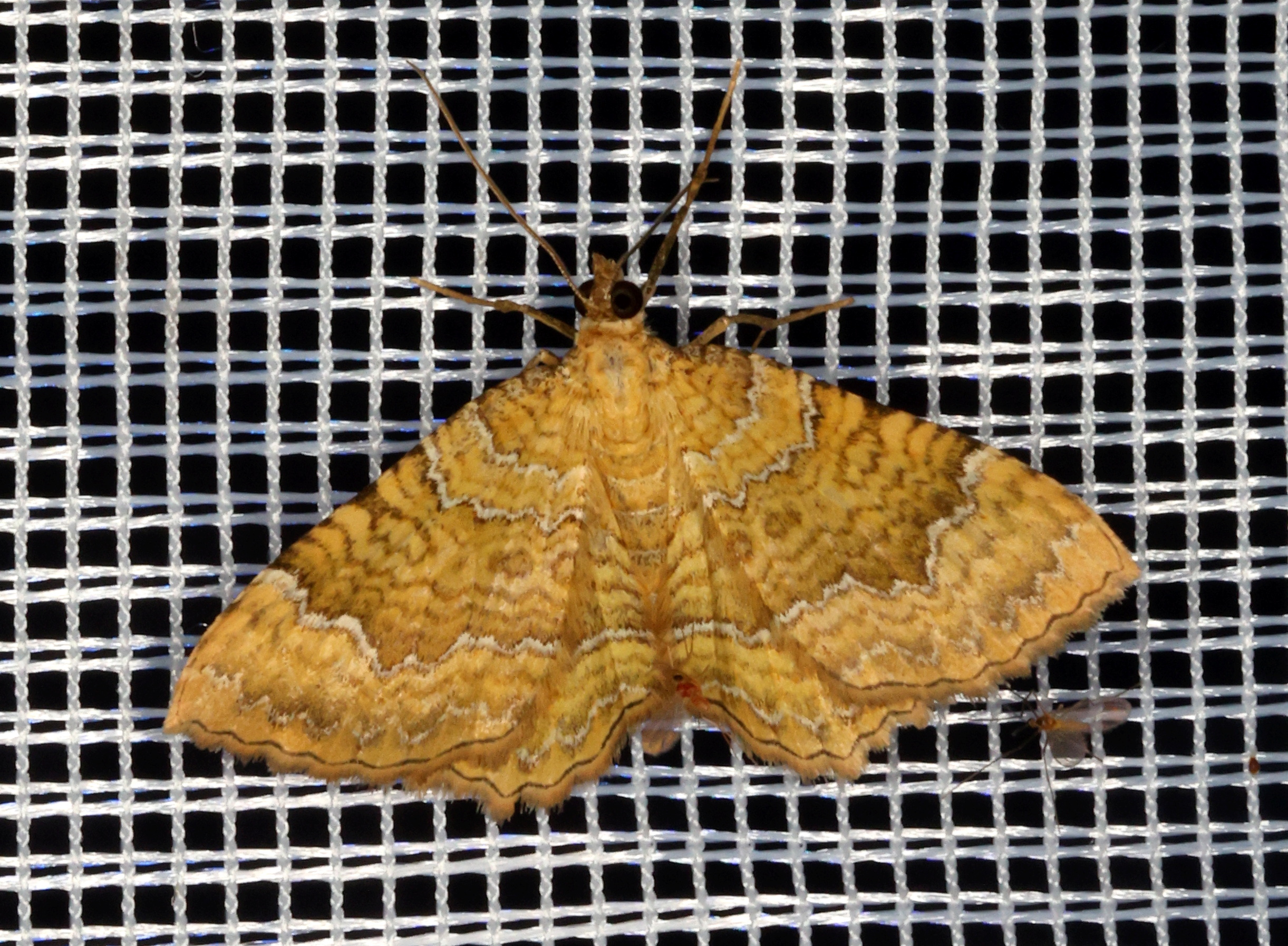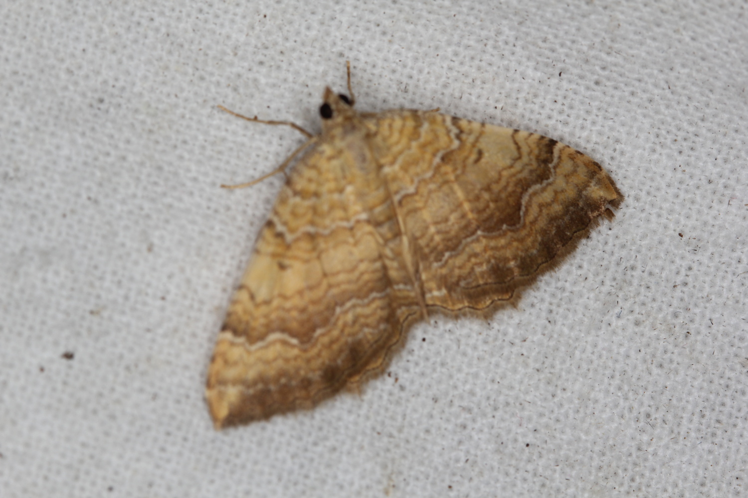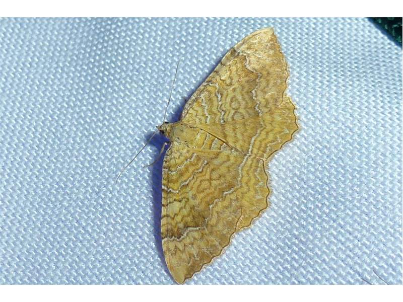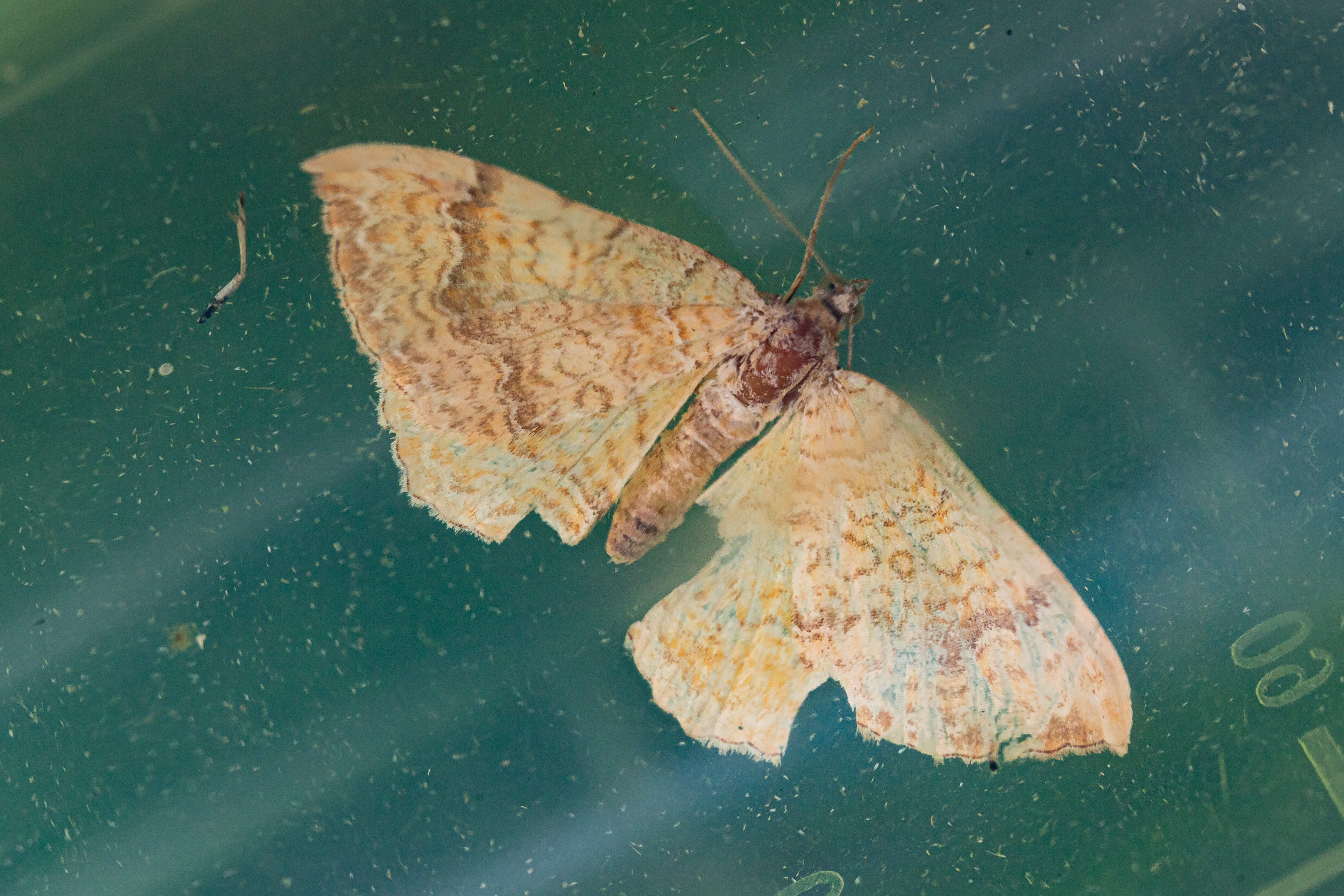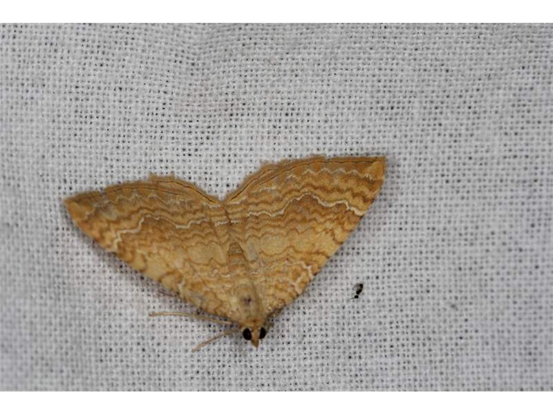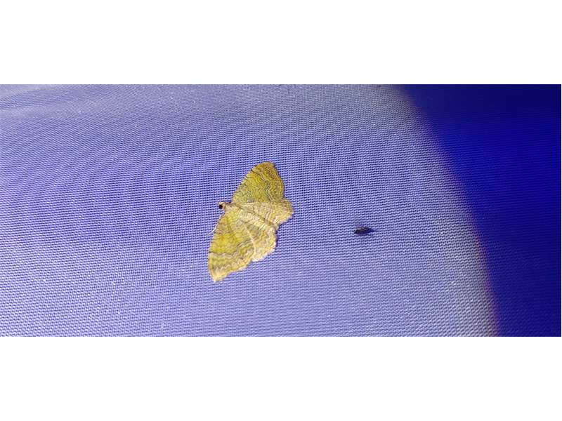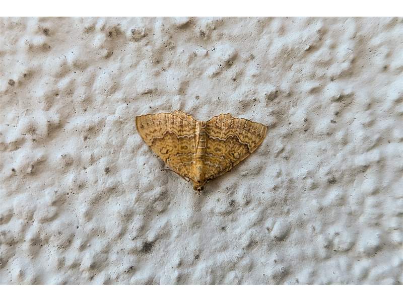 Ockergelbe Blattspanner, oder Löwenzahnspanner oder Brennnesselspanner (Camptogramma bilineata (Linnaeus, 1758)), am Licht, Radeberg, August 2013.