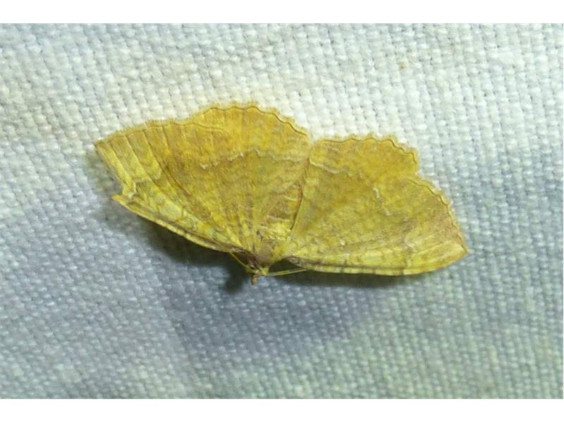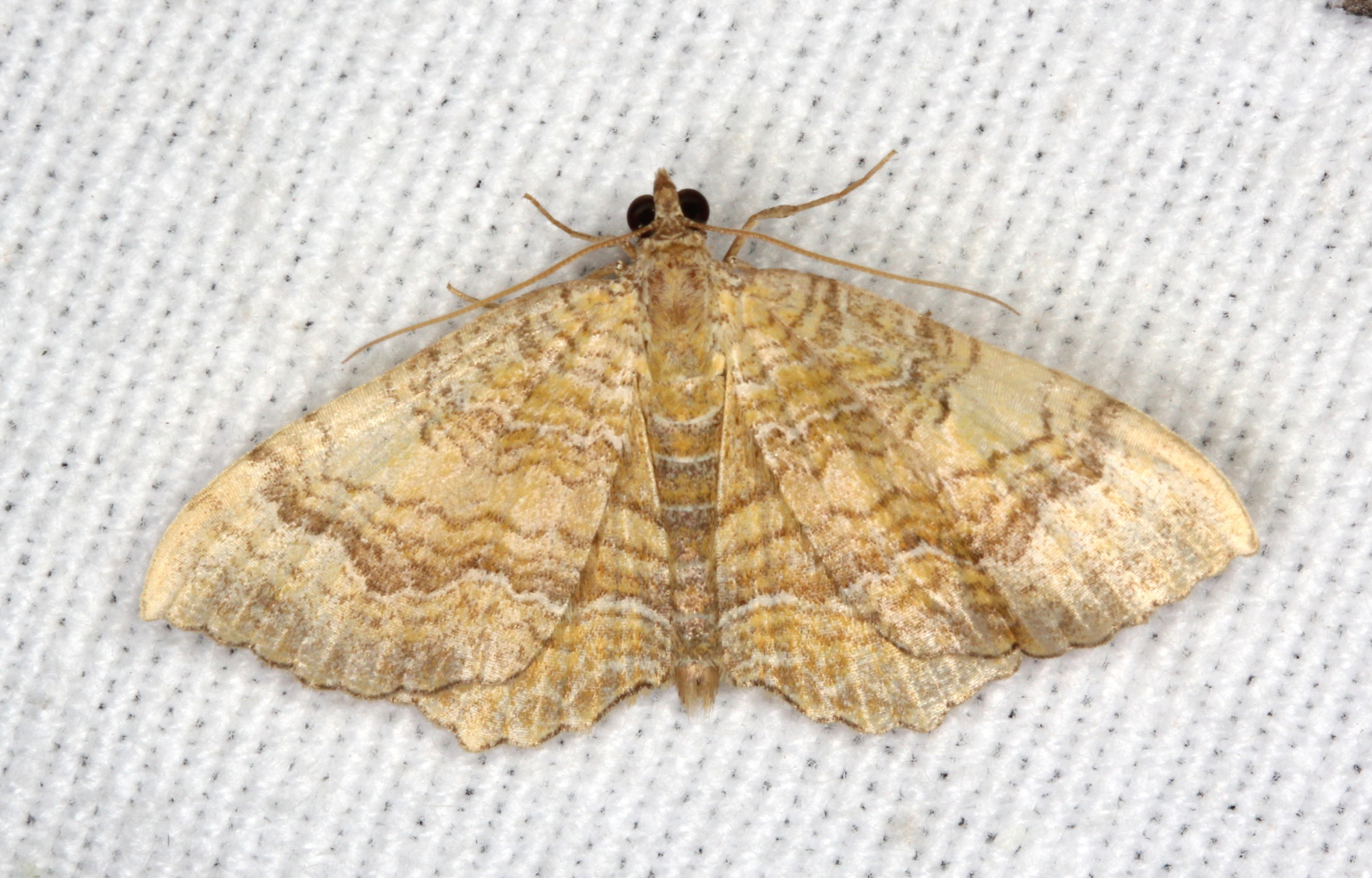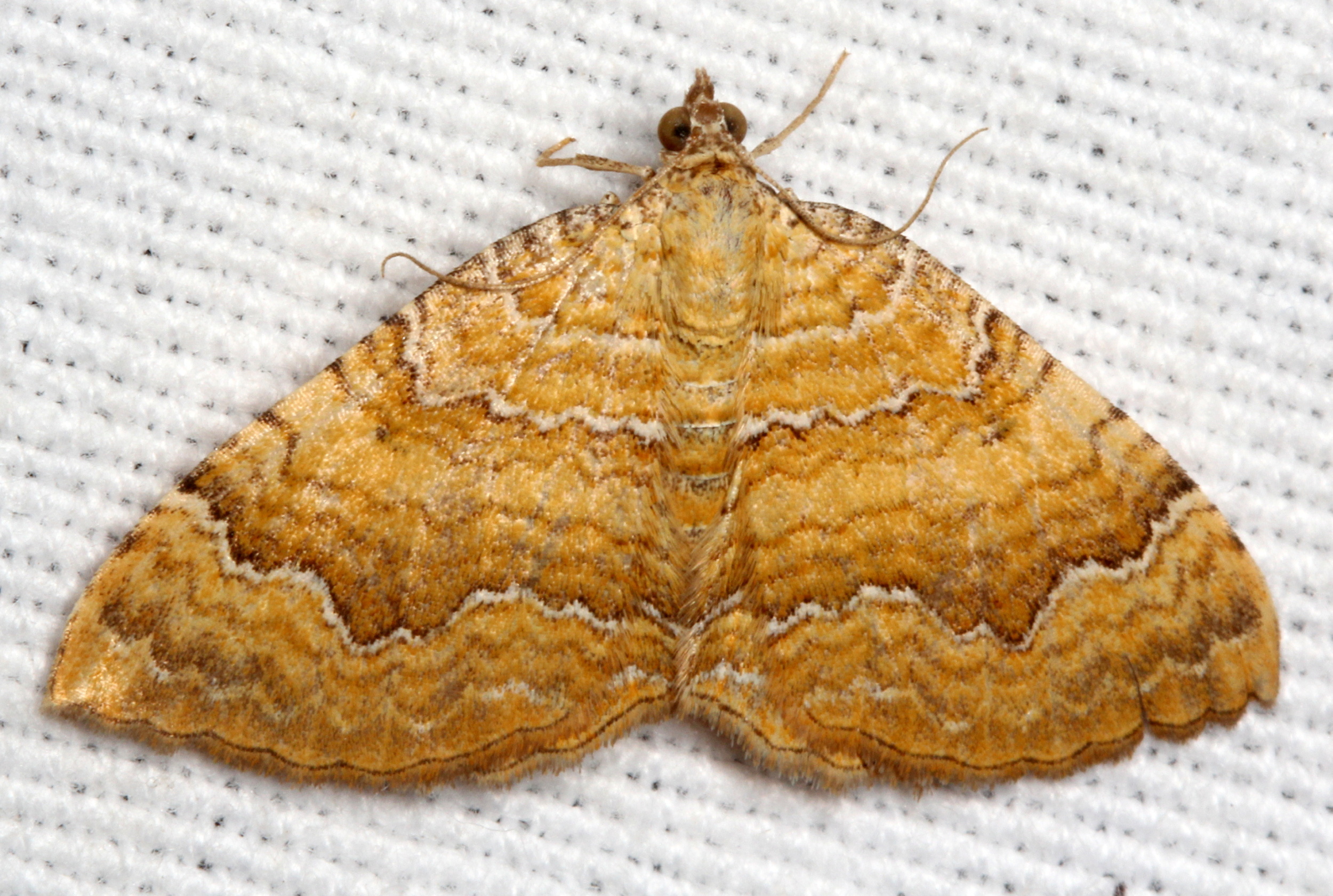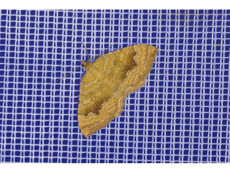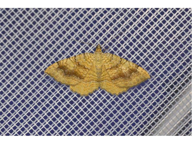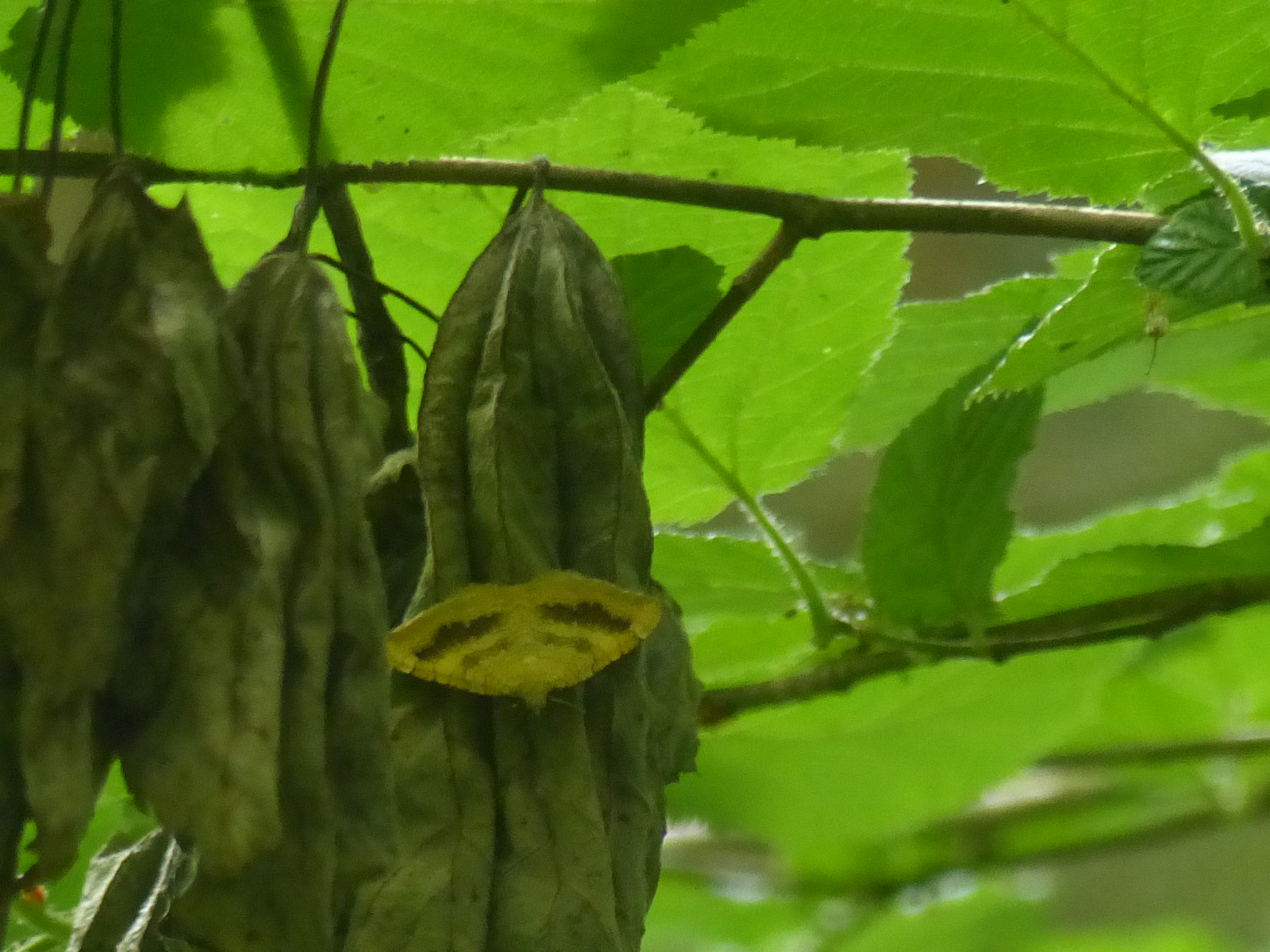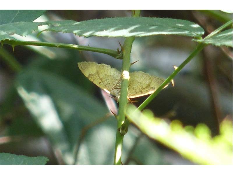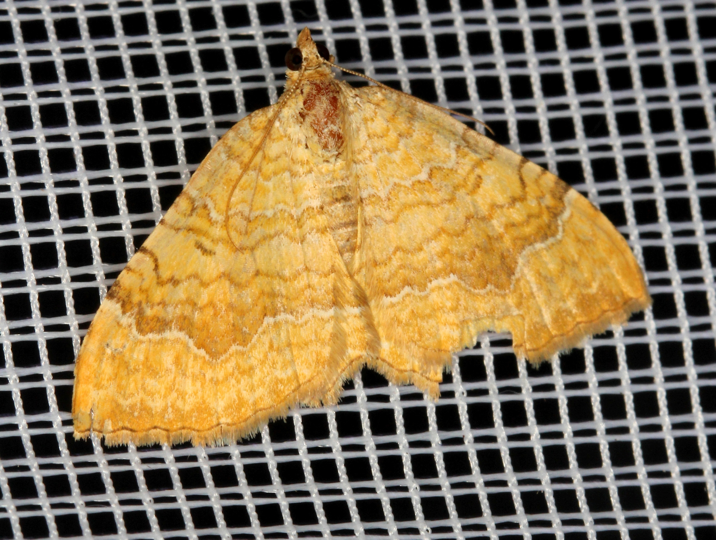 Ockergelbe Blattspanner, oder Löwenzahnspanner oder Brennnesselspanner (Camptogramma bilineata (Linnaeus, 1758)), am Licht, Radeberg, August 2013.