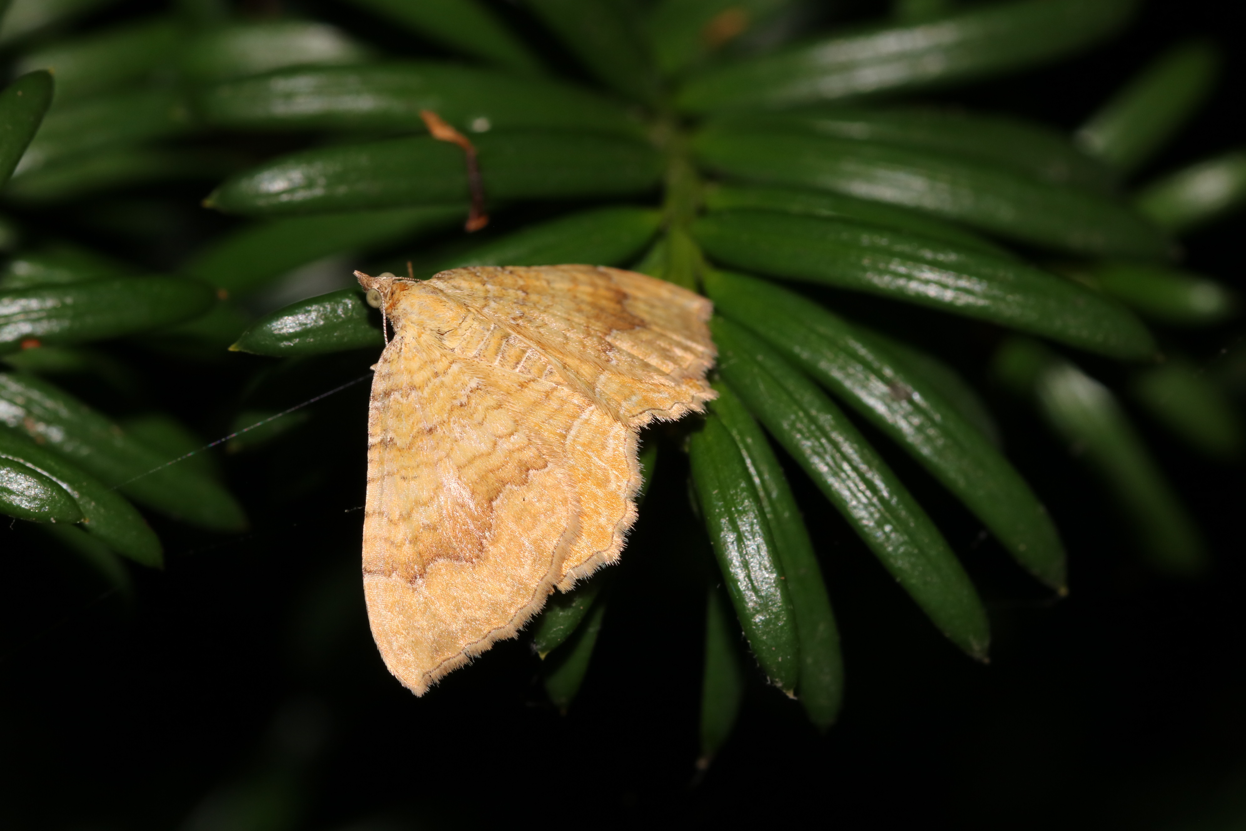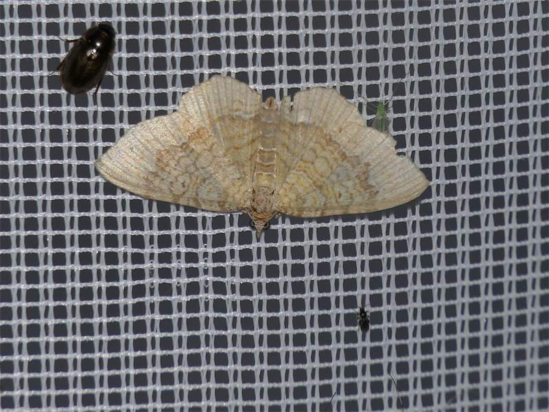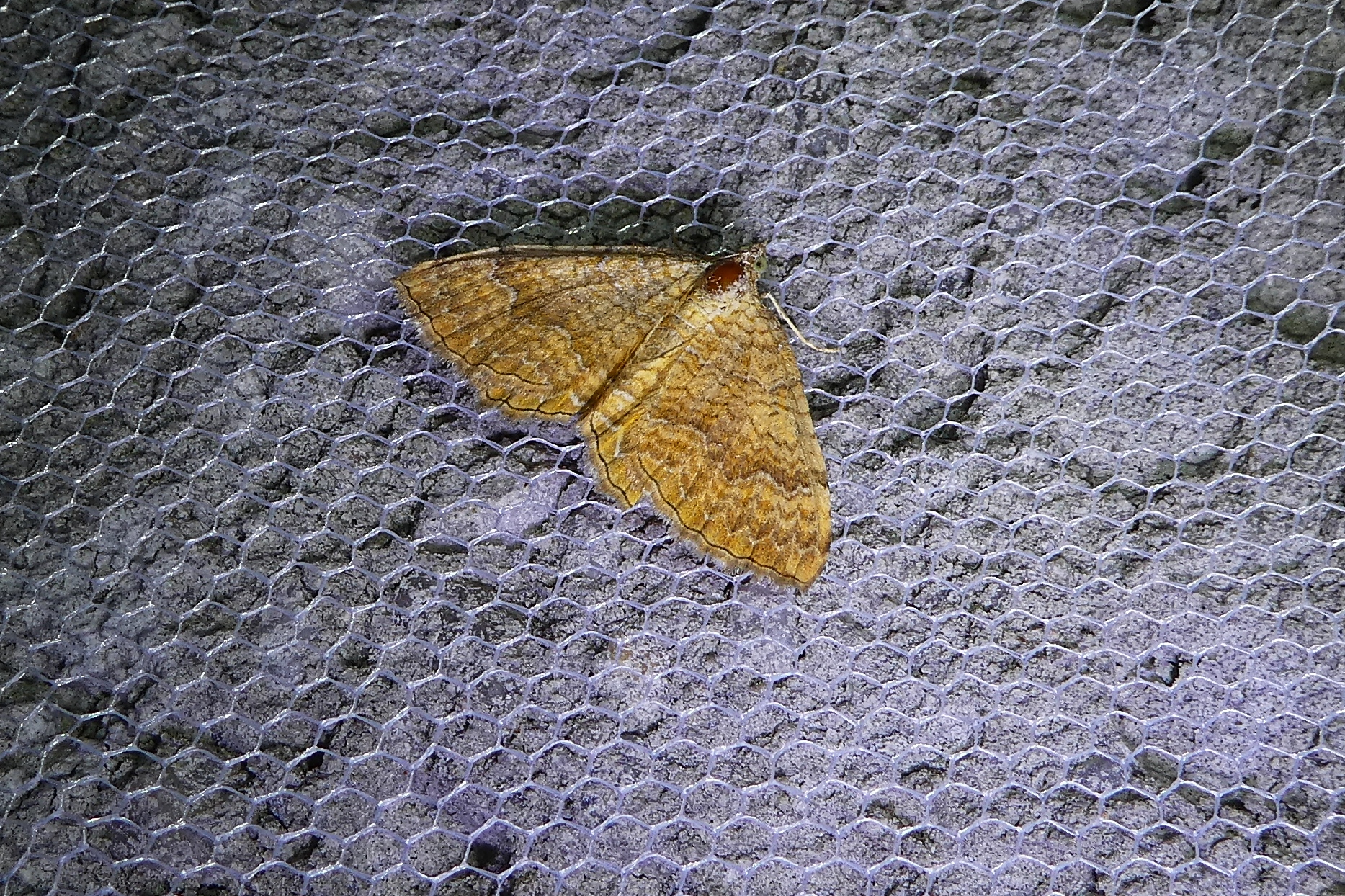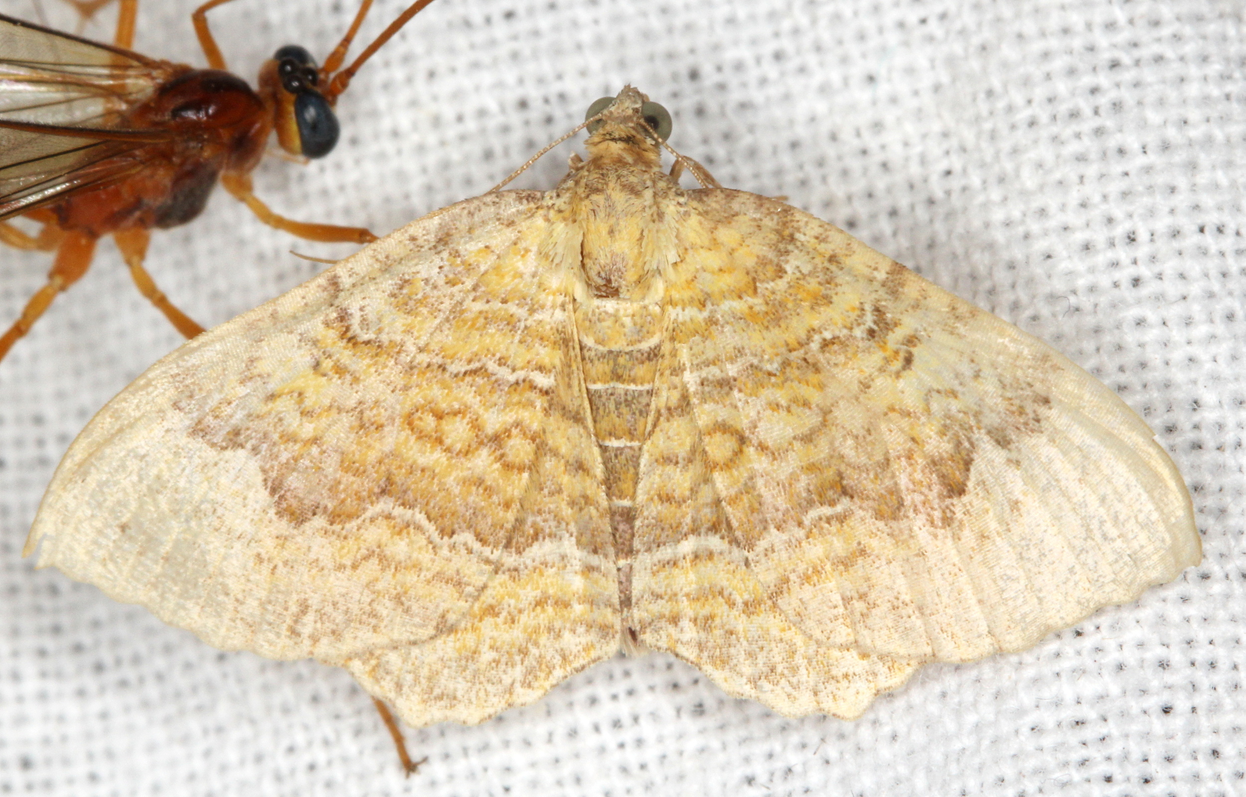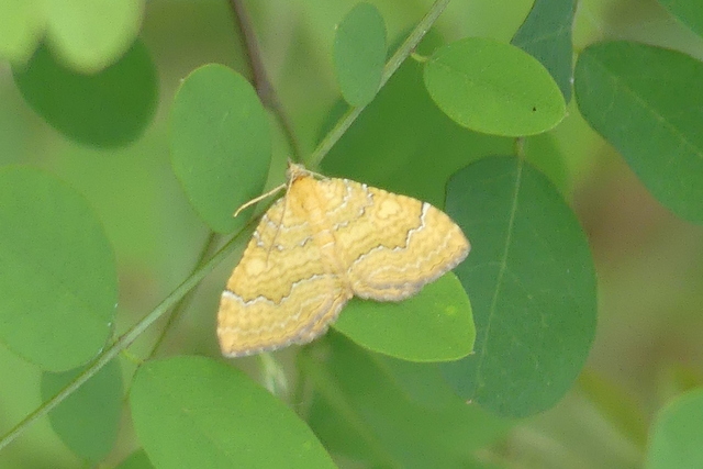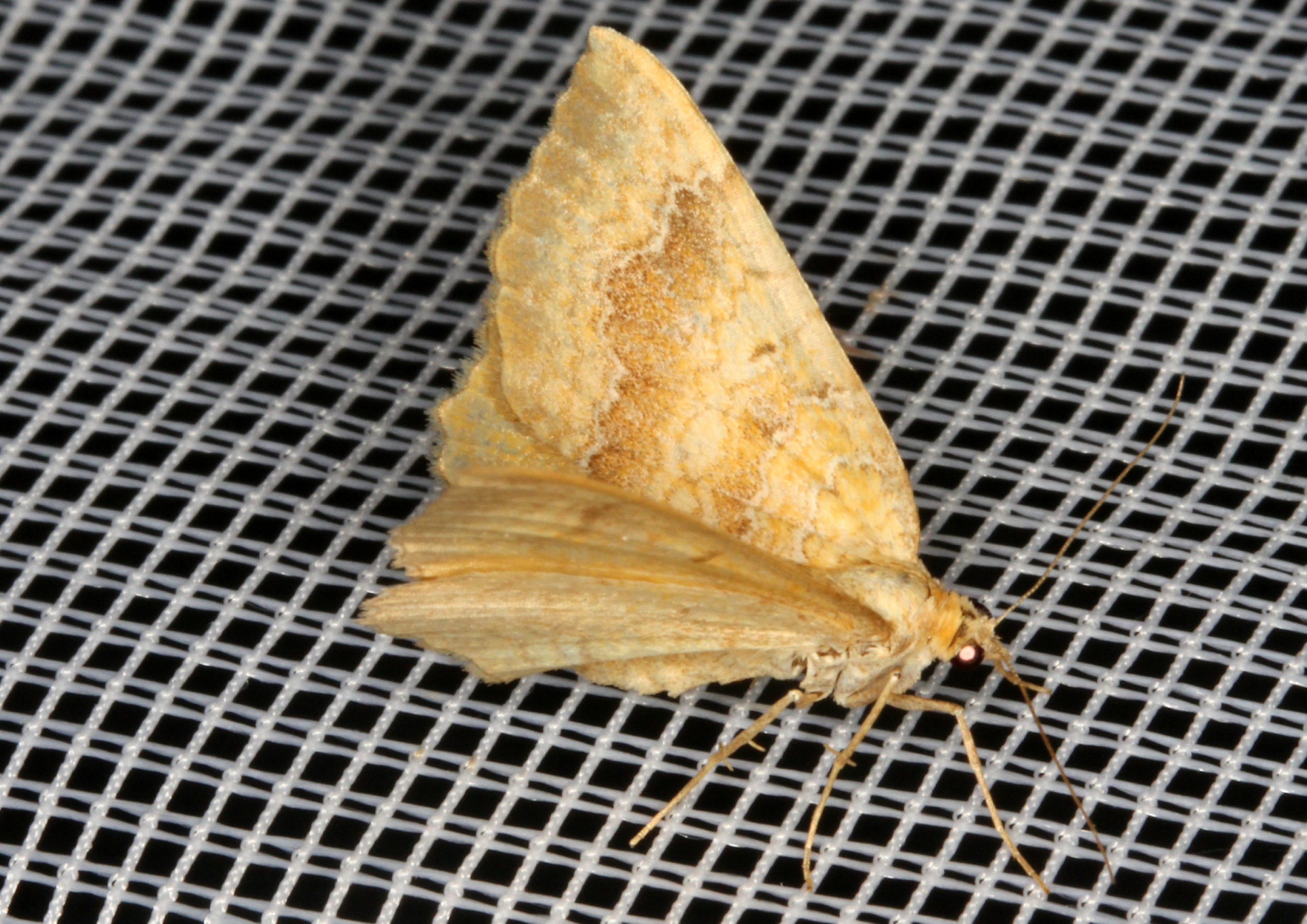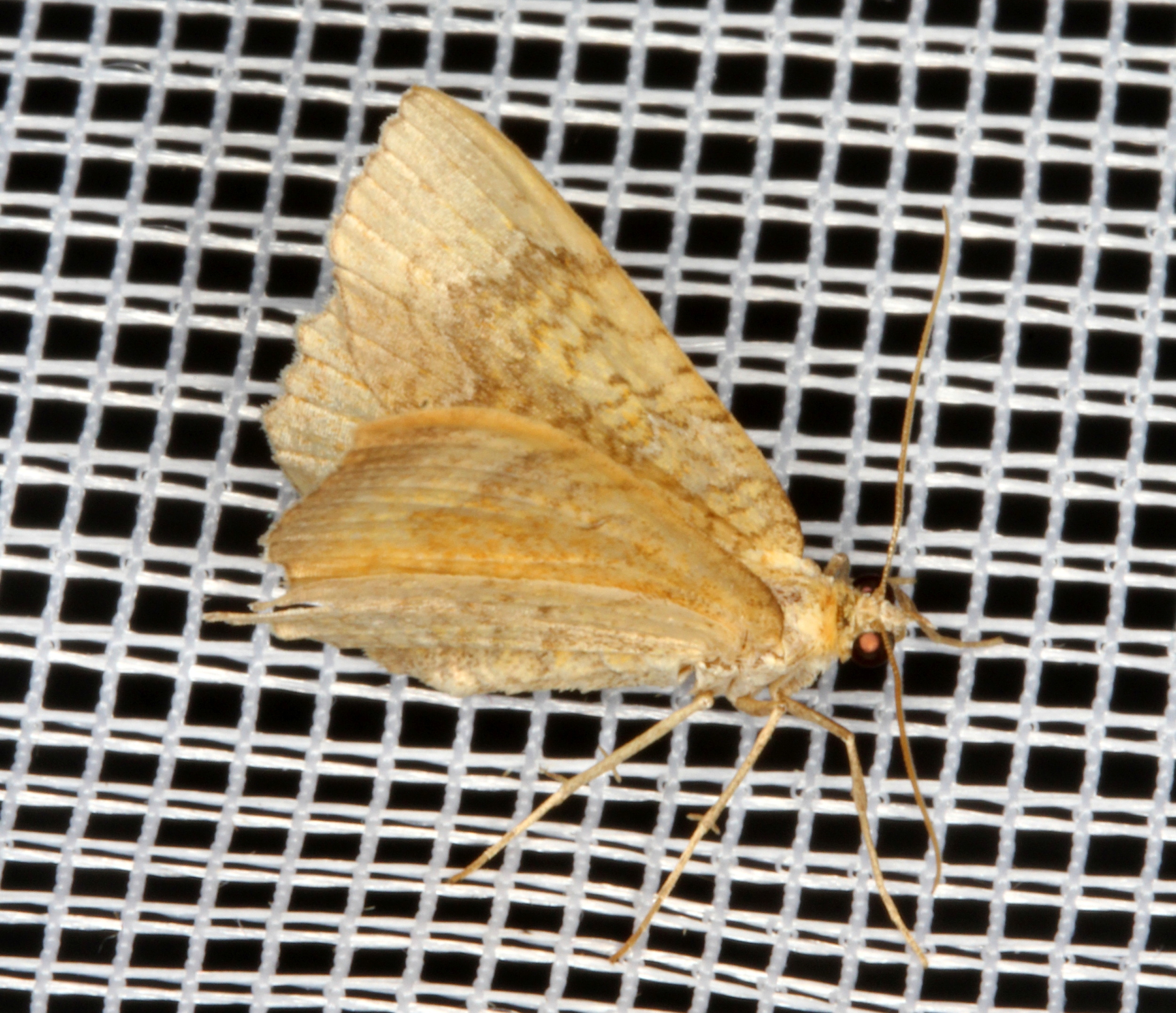 Ockergelbe Blattspanner, oder Löwenzahnspanner oder Brennnesselspanner (Camptogramma bilineata (Linnaeus, 1758)), am Licht, Radeberg, August 2013.