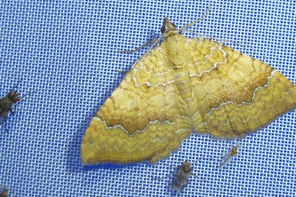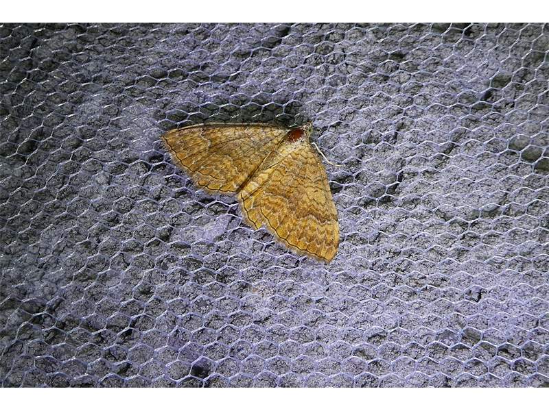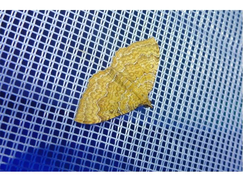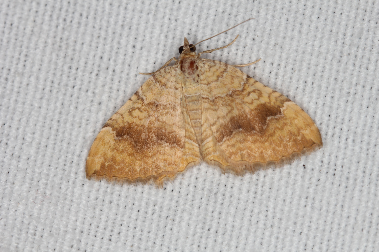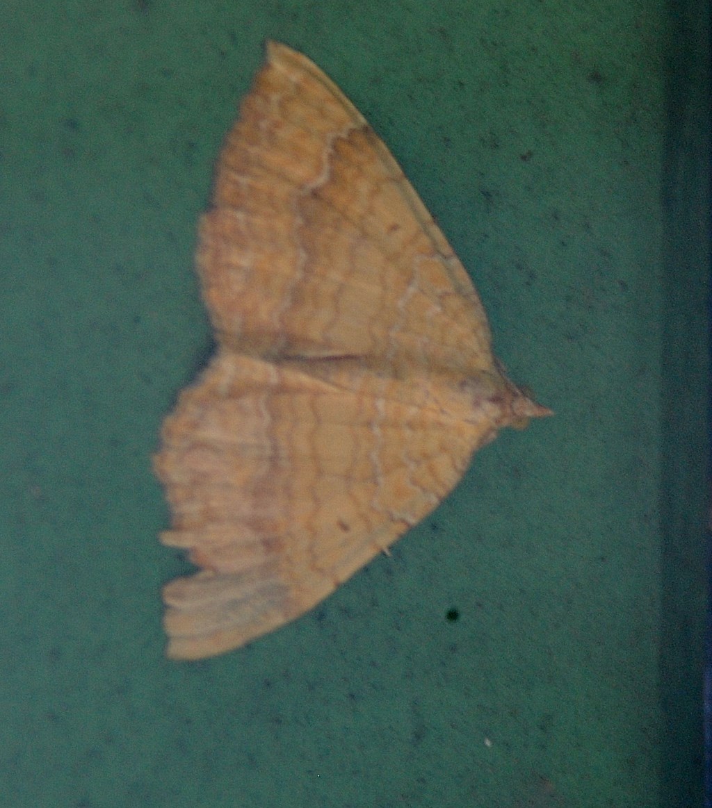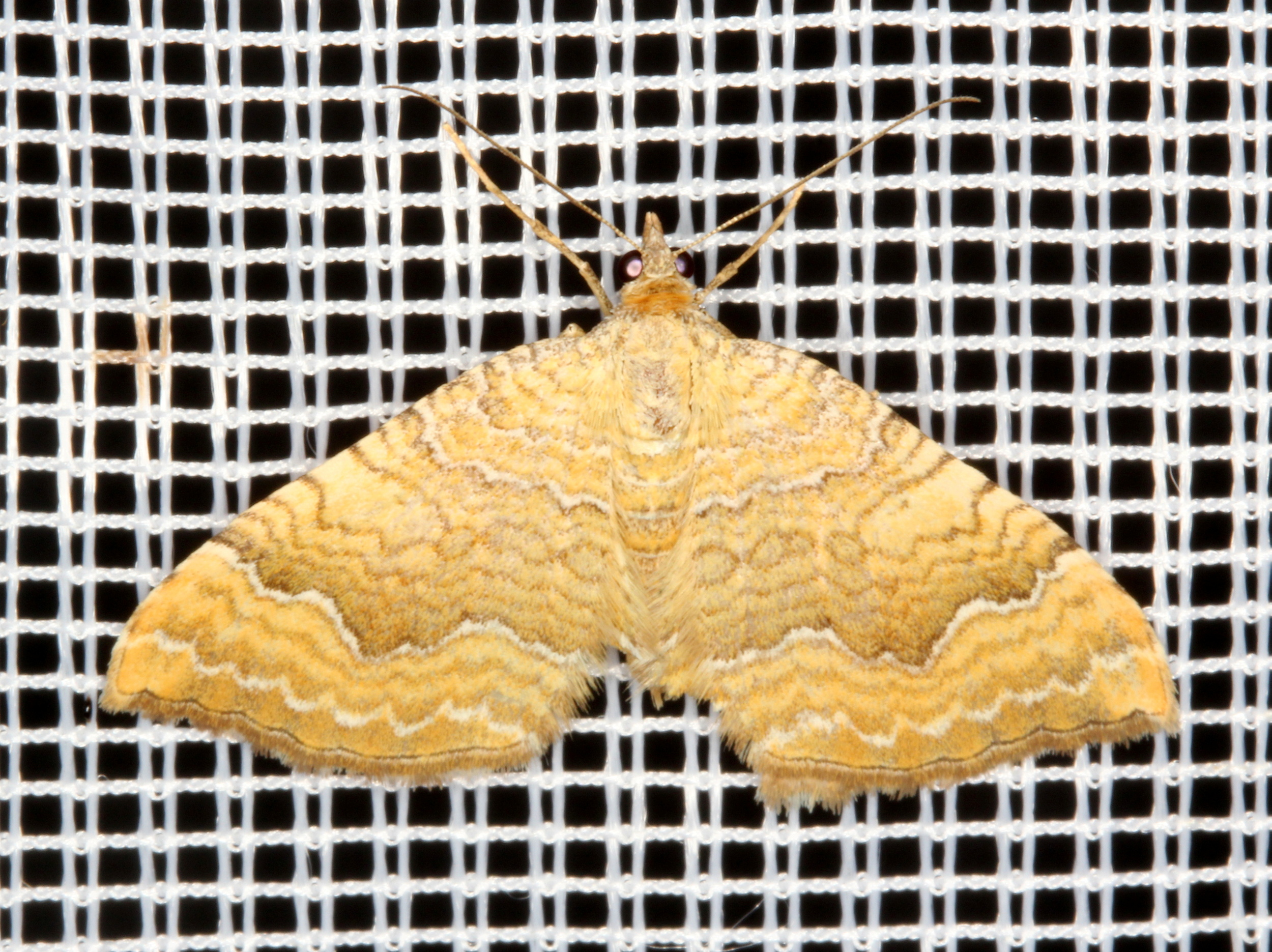 Ockergelbe Blattspanner, oder Löwenzahnspanner oder Brennnesselspanner (Camptogramma bilineata (Linnaeus, 1758)), am Licht, Radeberg, August 2013.