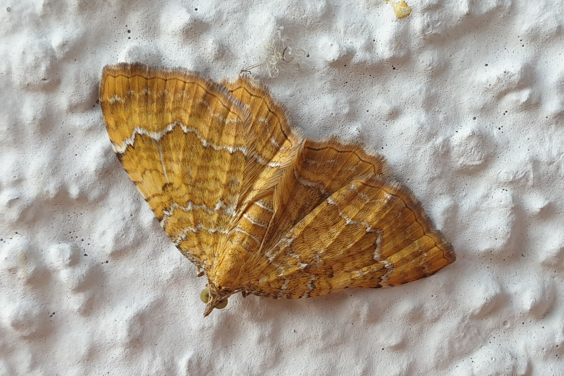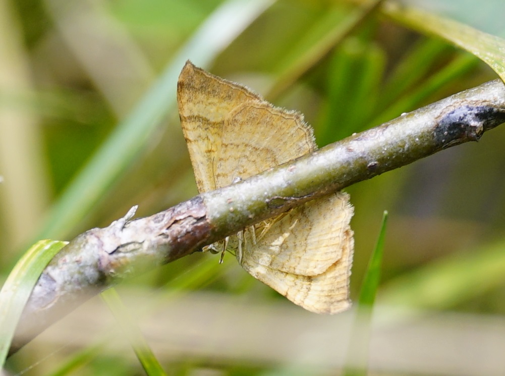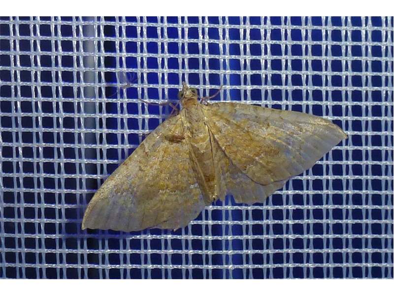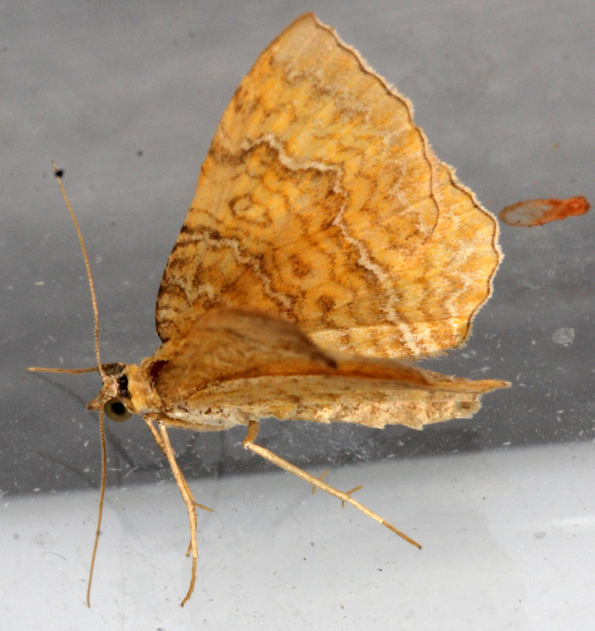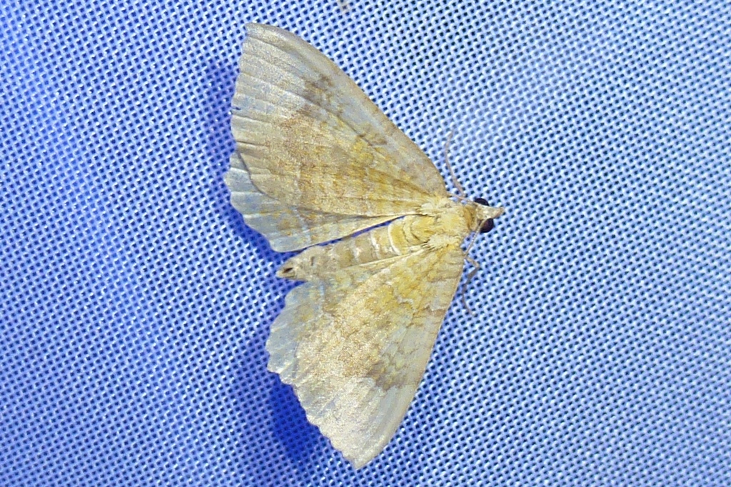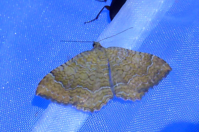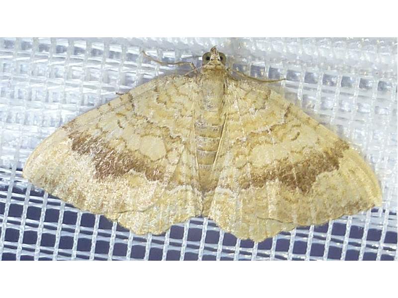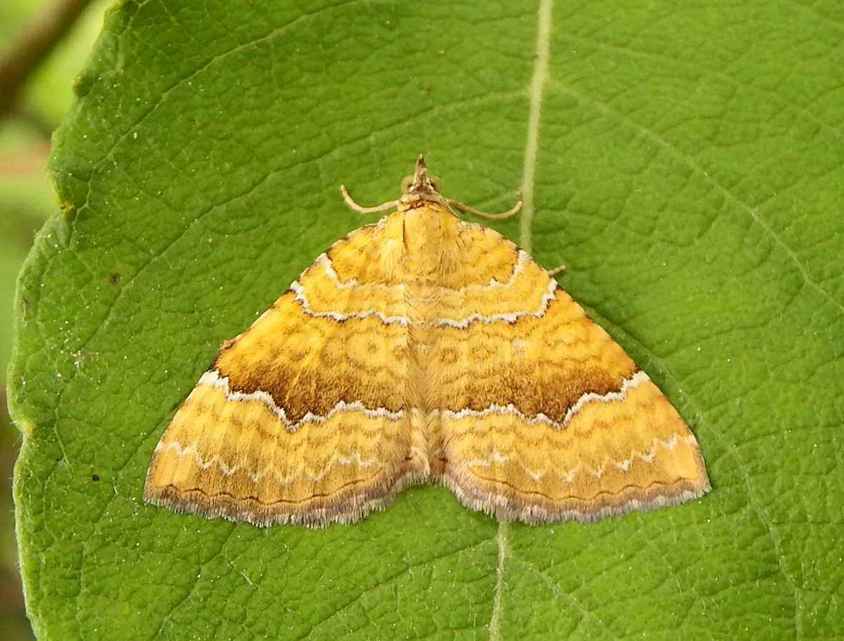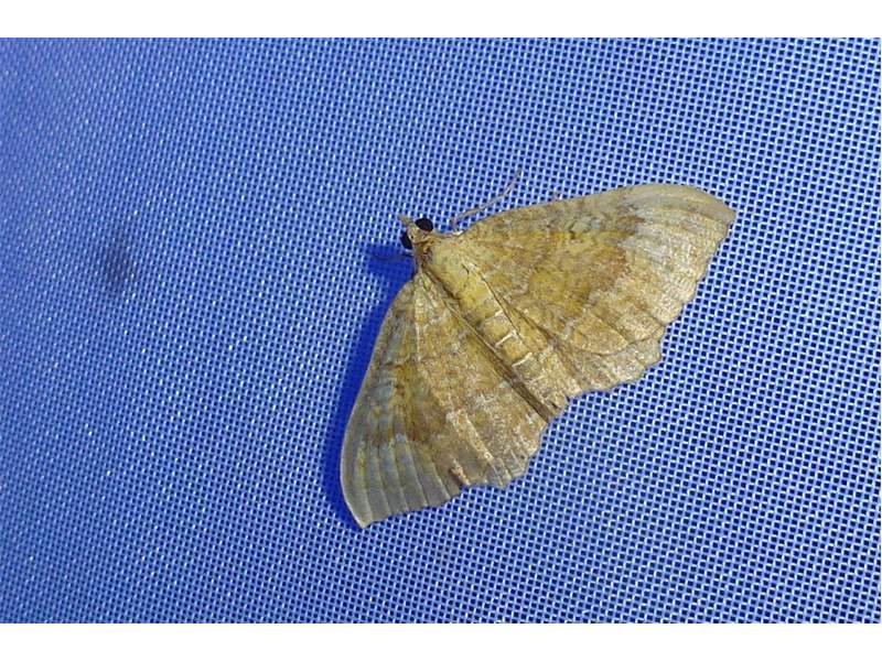 Ockergelbe Blattspanner, oder Löwenzahnspanner oder Brennnesselspanner (Camptogramma bilineata (Linnaeus, 1758)), am Licht, Radeberg, August 2013.