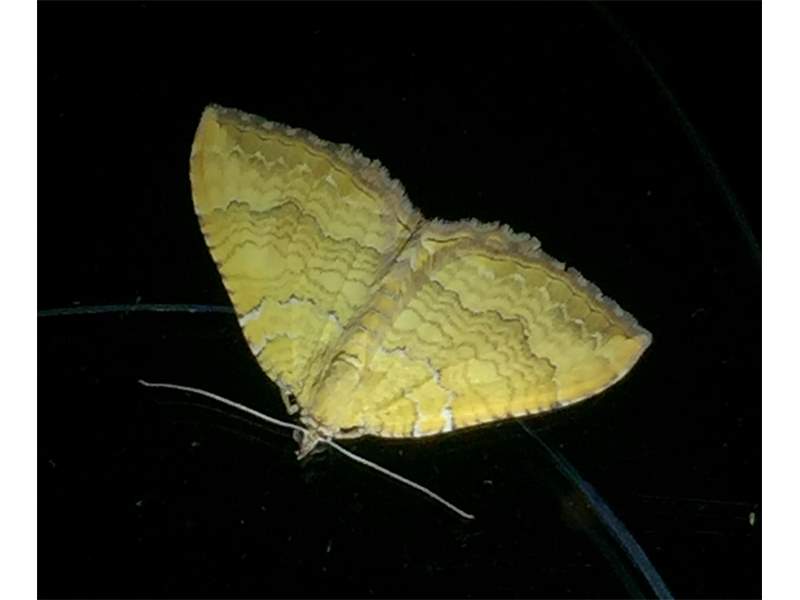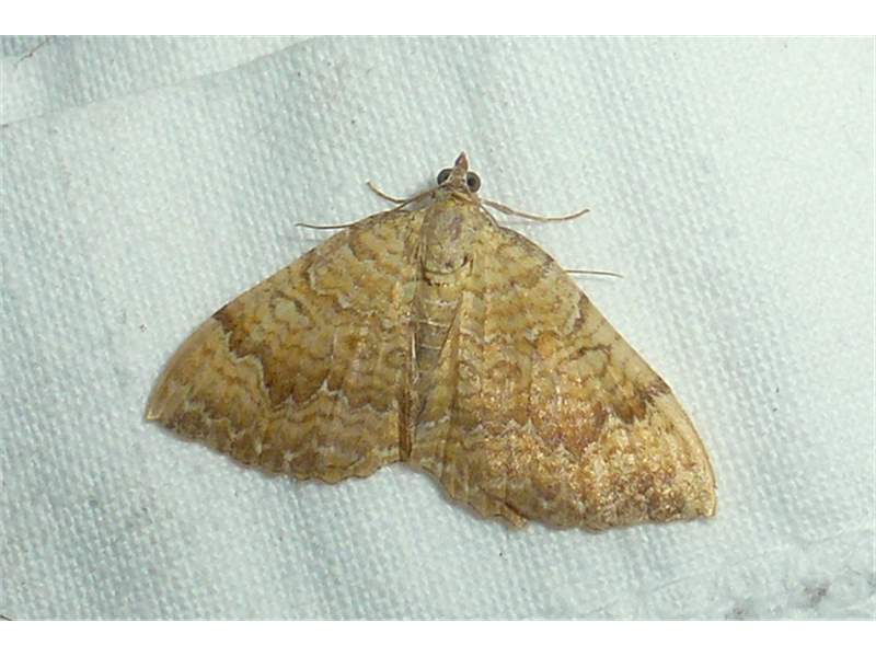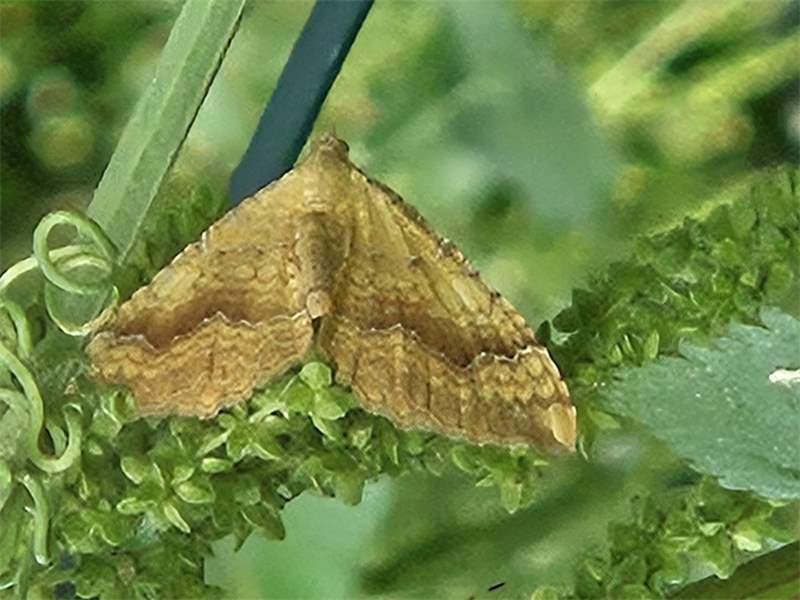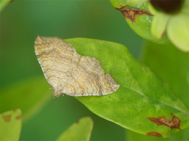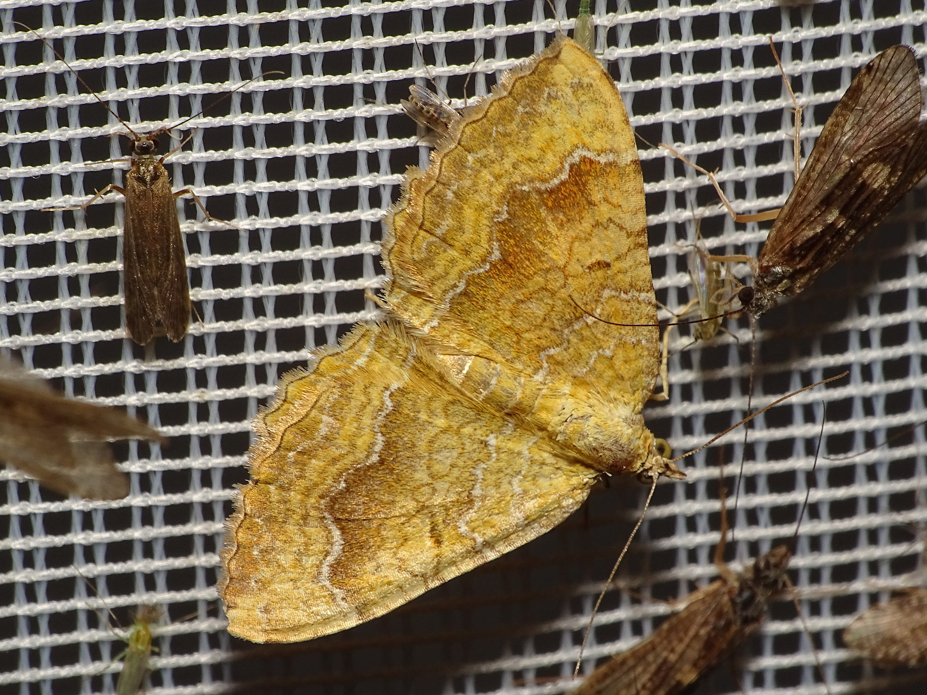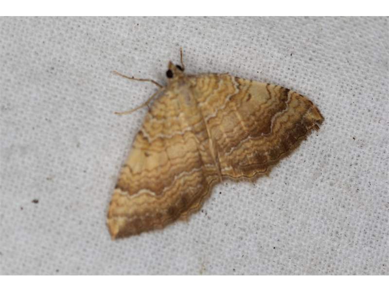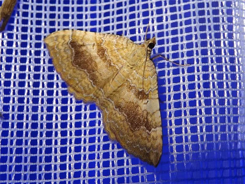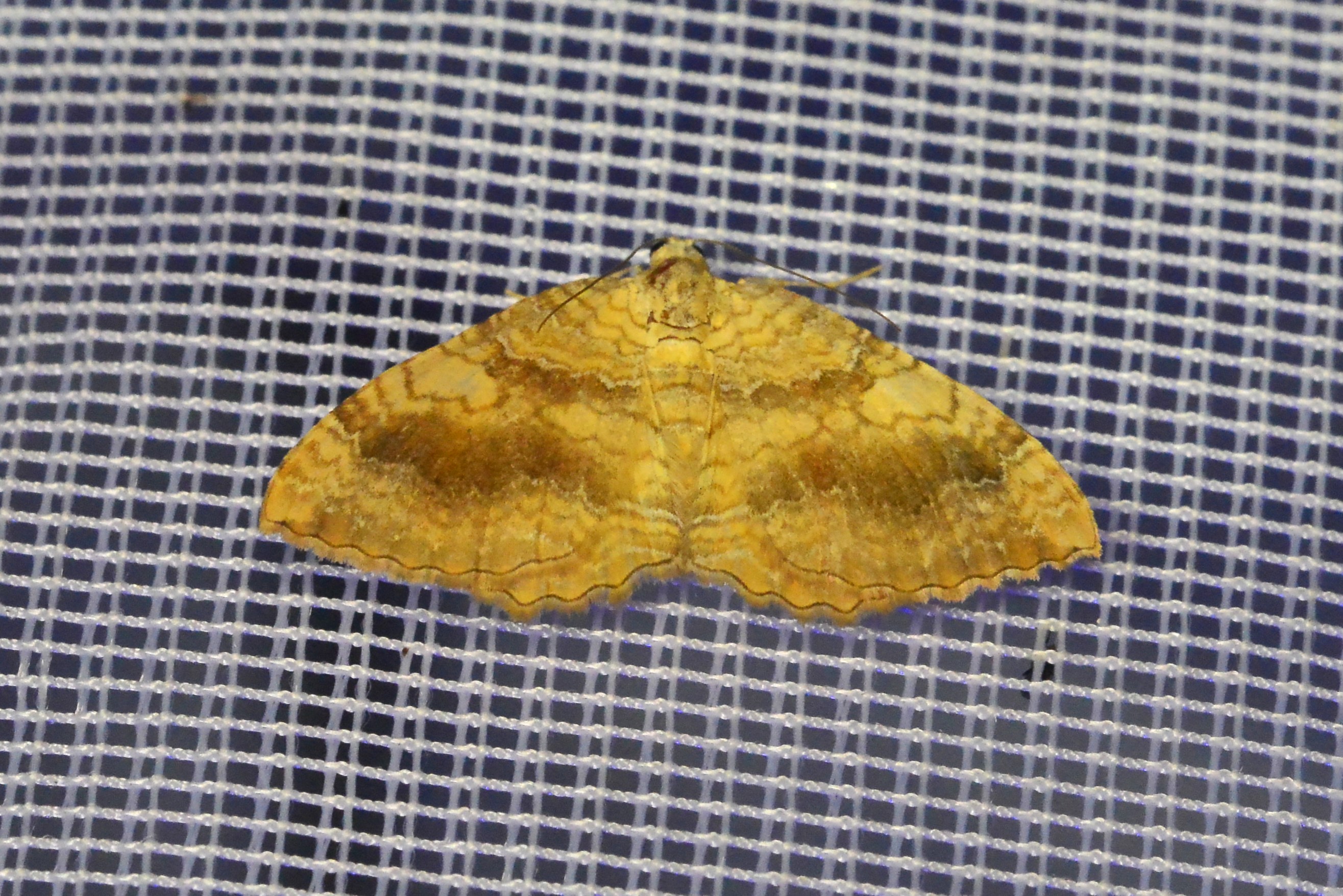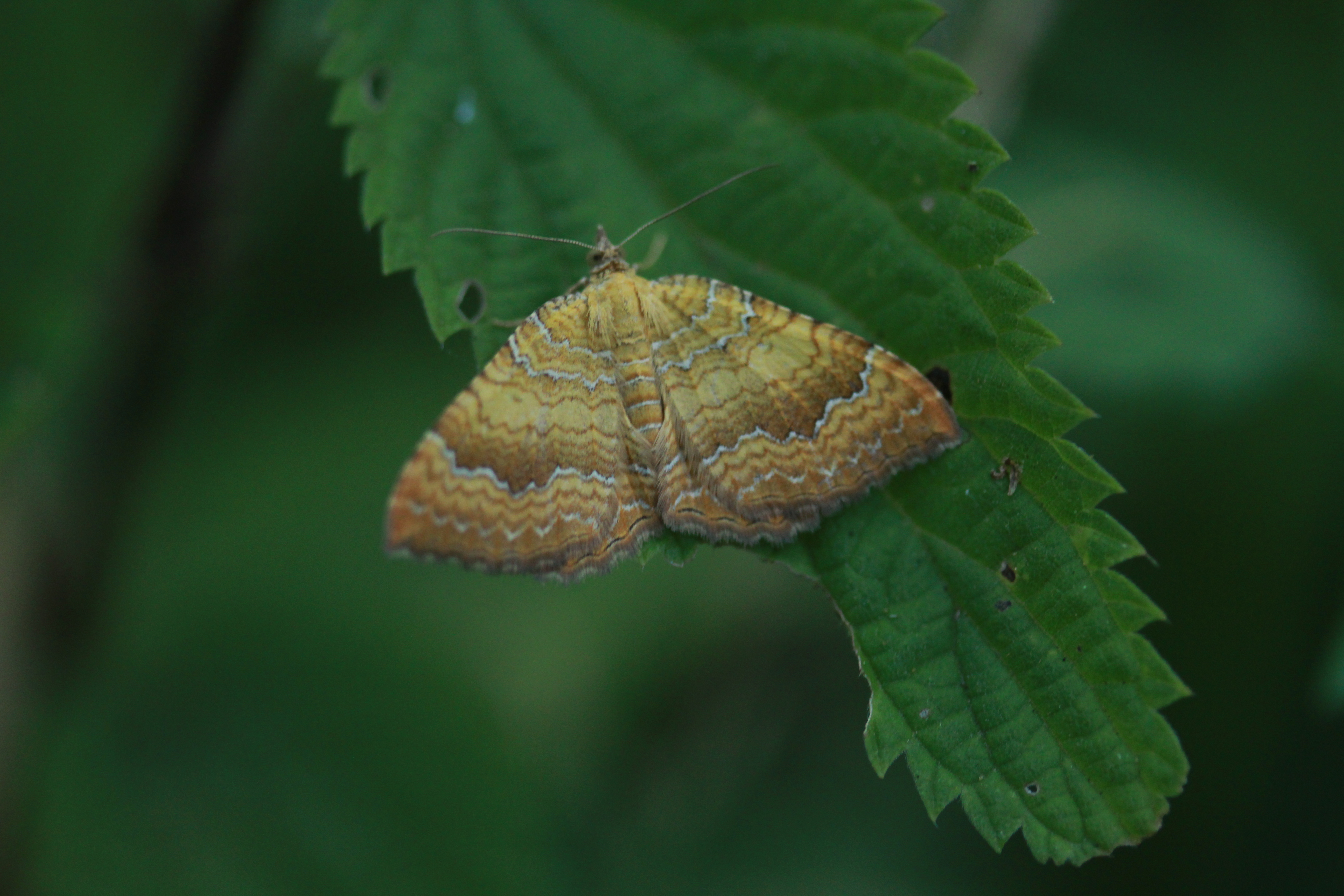 Ockergelbe Blattspanner, oder Löwenzahnspanner oder Brennnesselspanner (Camptogramma bilineata (Linnaeus, 1758)), am Licht, Radeberg, August 2013.