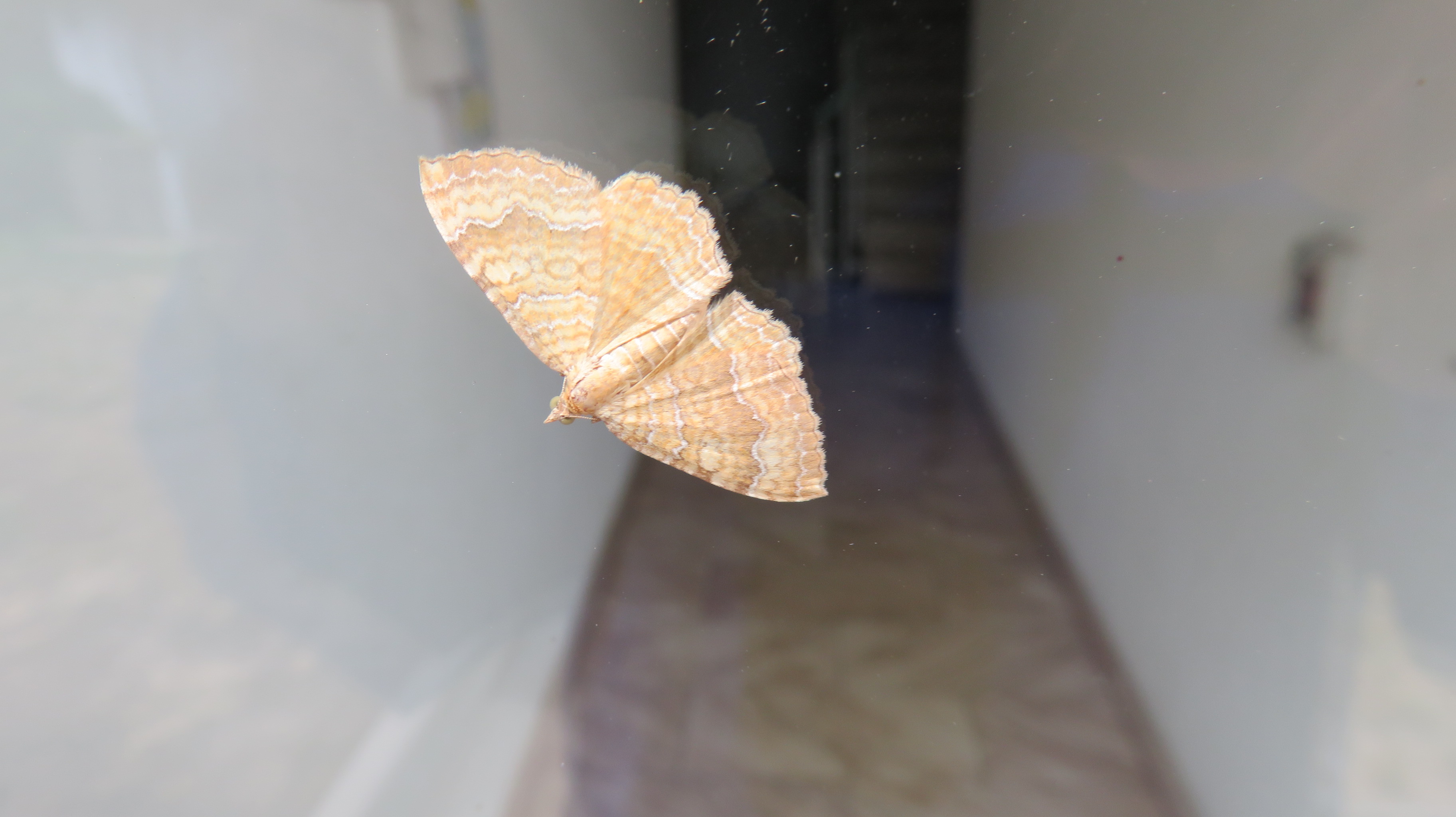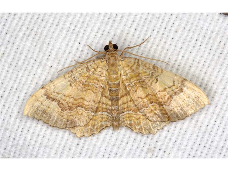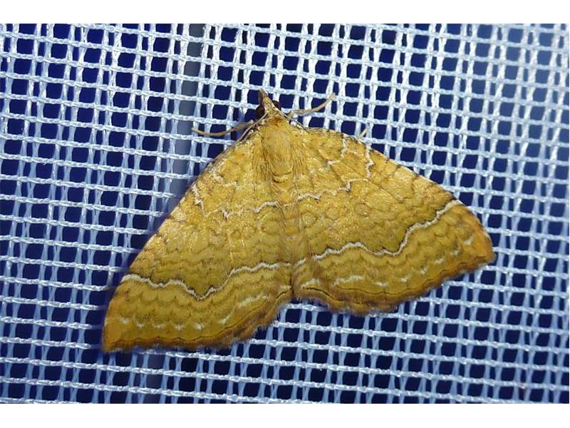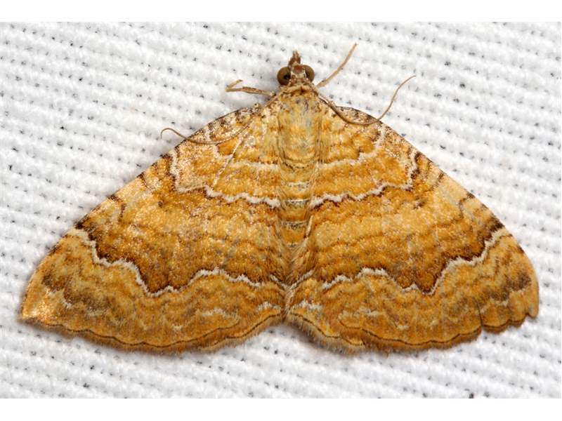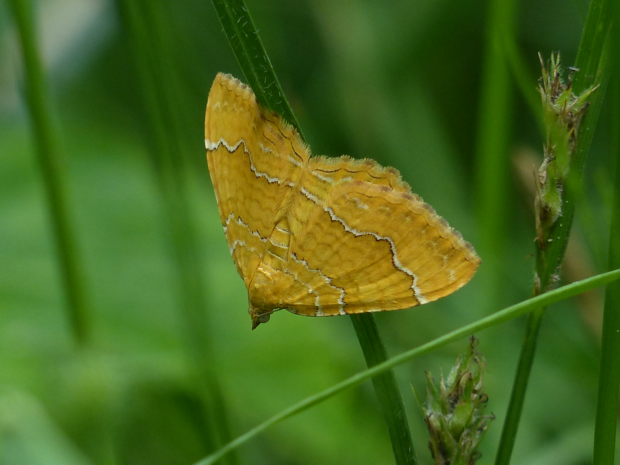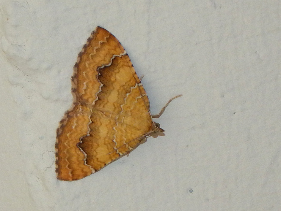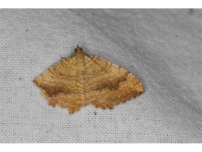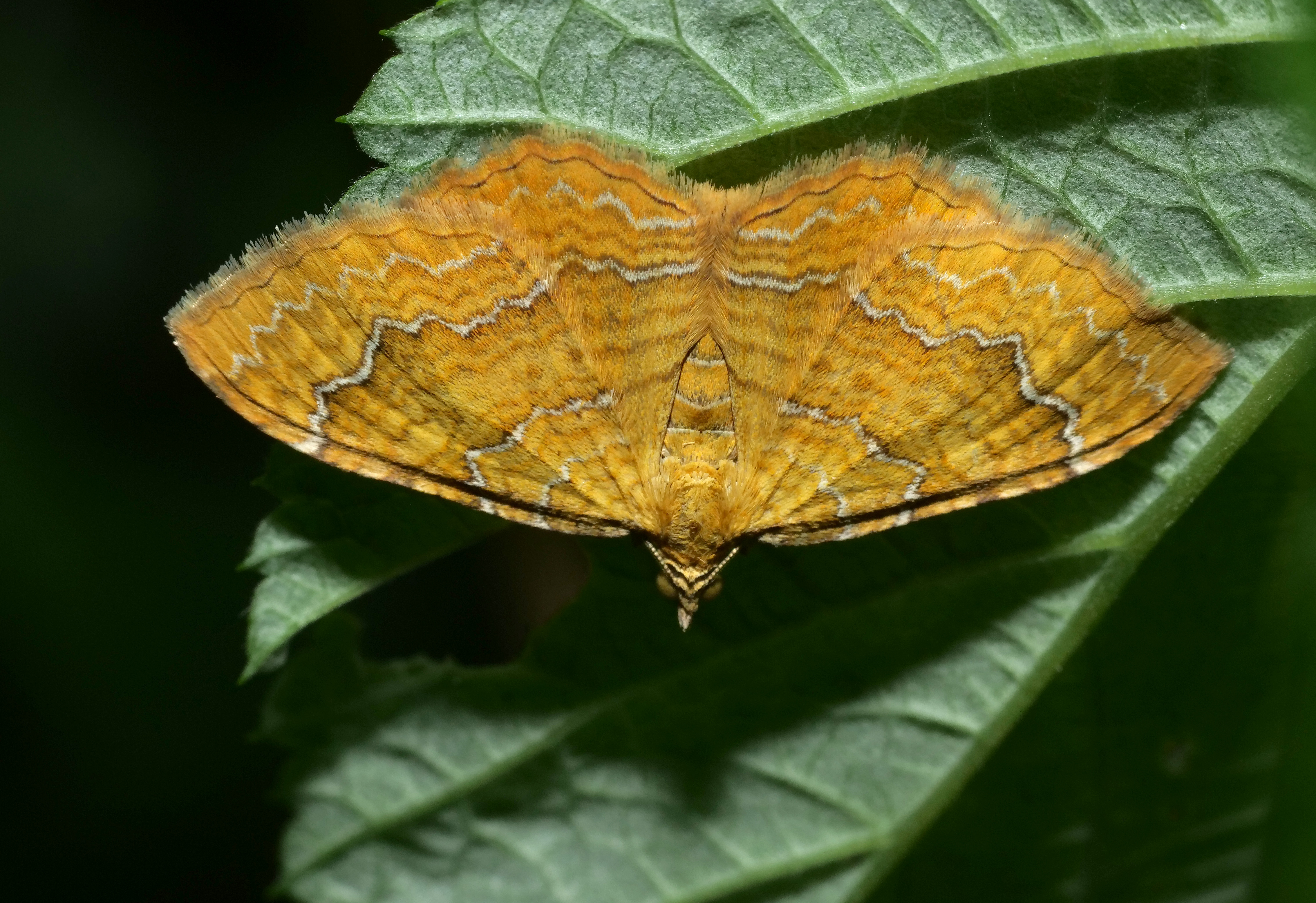 Ockergelbe Blattspanner, oder Löwenzahnspanner oder Brennnesselspanner (Camptogramma bilineata (Linnaeus, 1758)), am Licht, Radeberg, August 2013.
