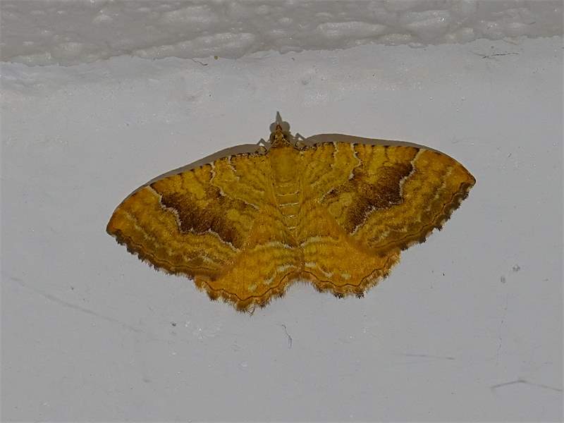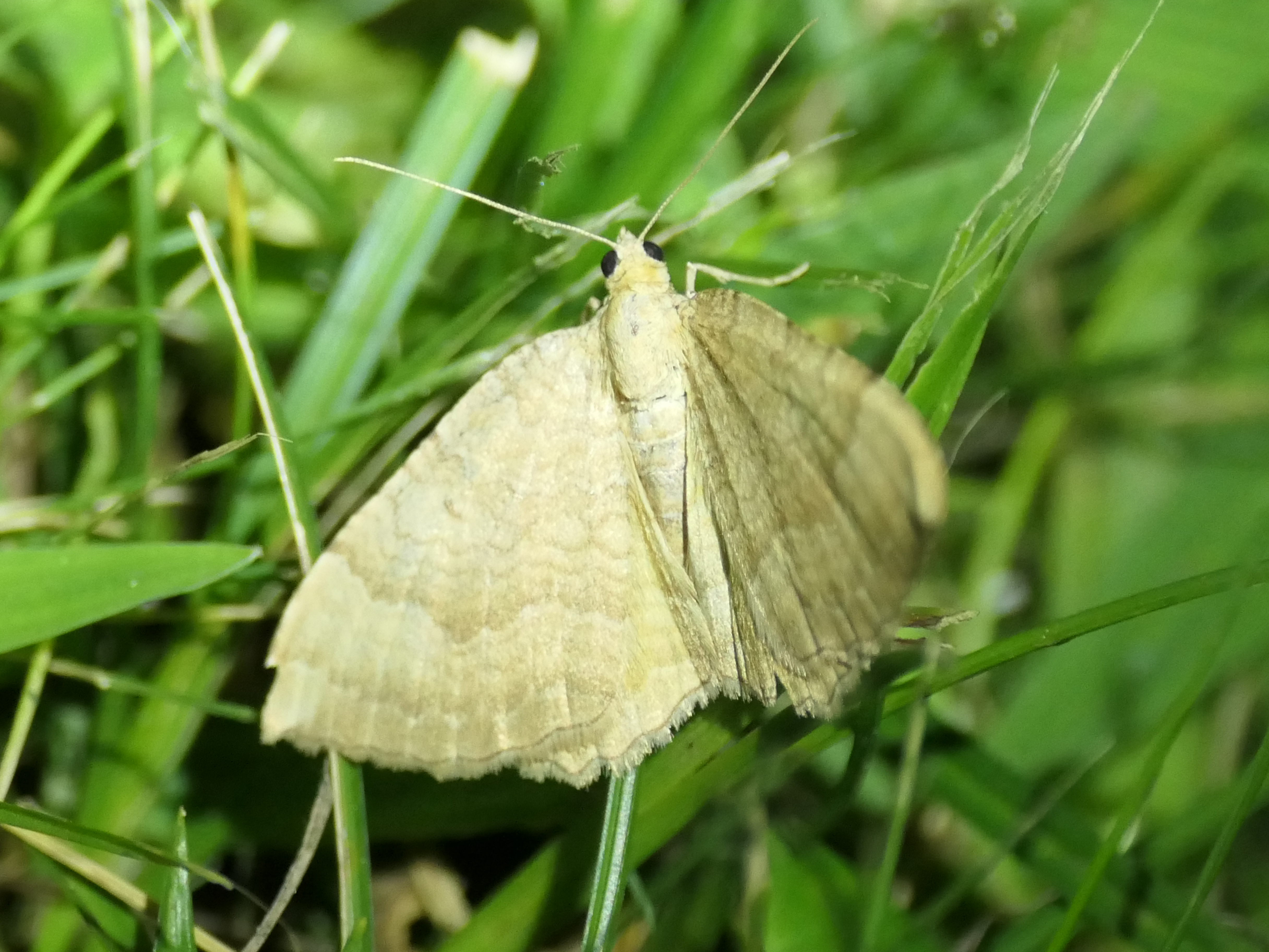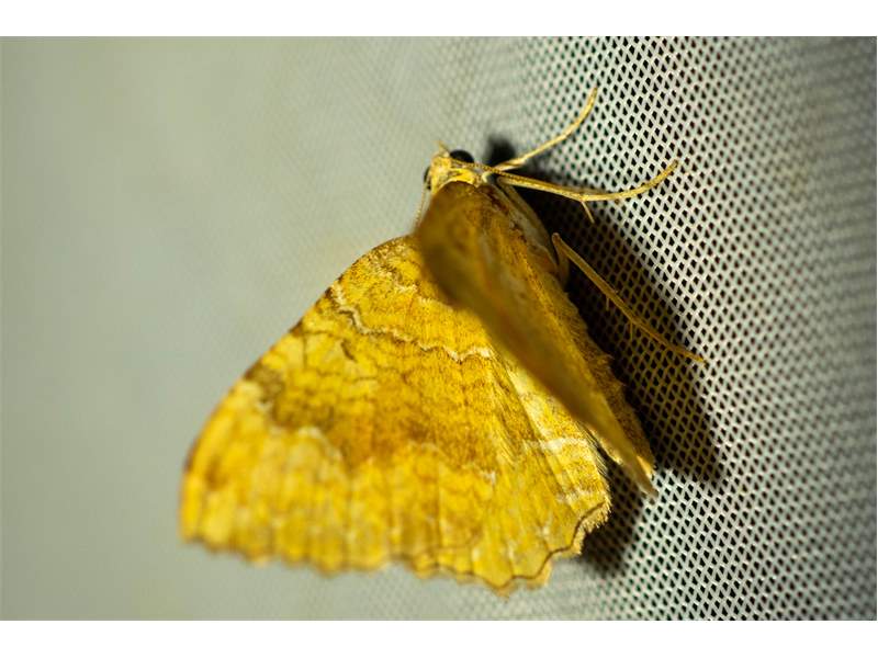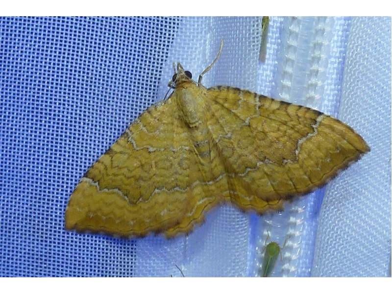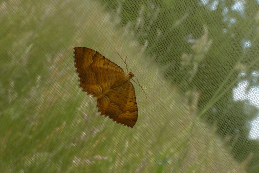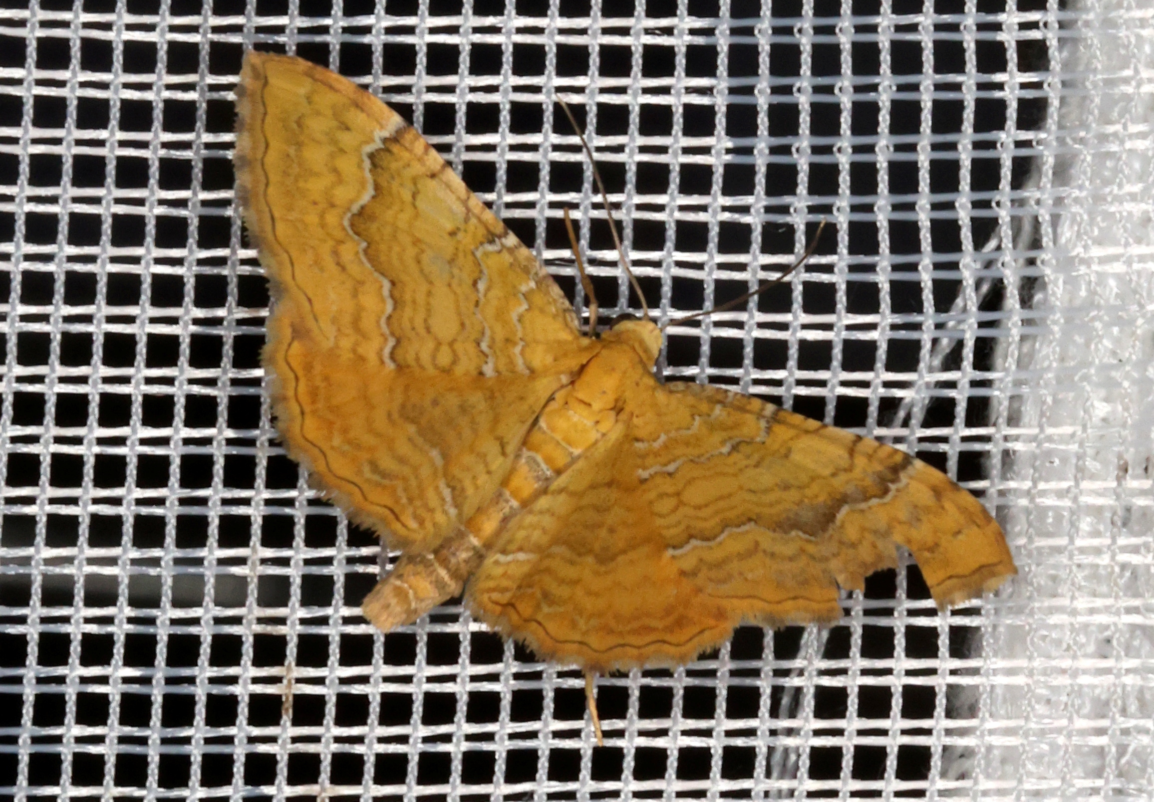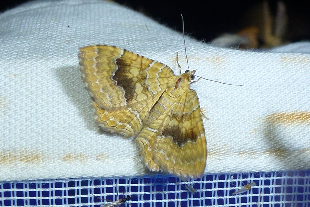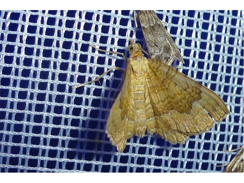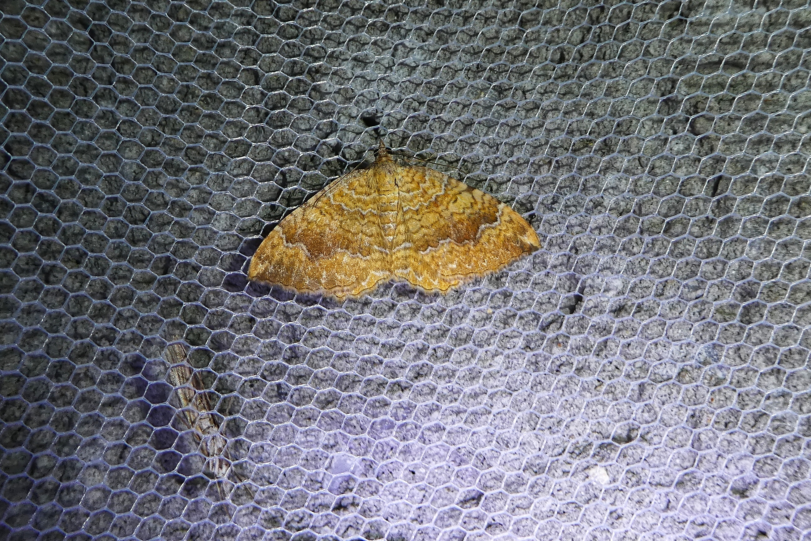 Ockergelbe Blattspanner, oder Löwenzahnspanner oder Brennnesselspanner (Camptogramma bilineata (Linnaeus, 1758)), am Licht, Radeberg, August 2013.