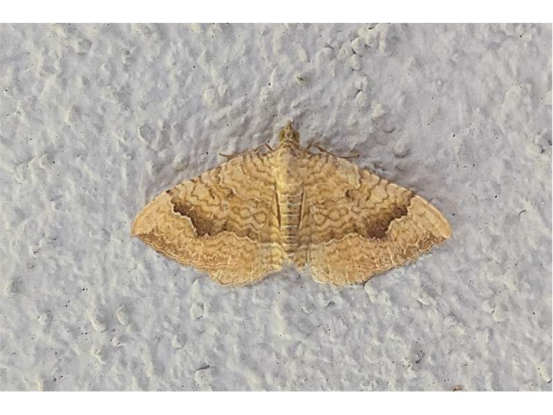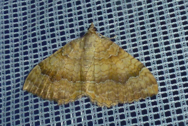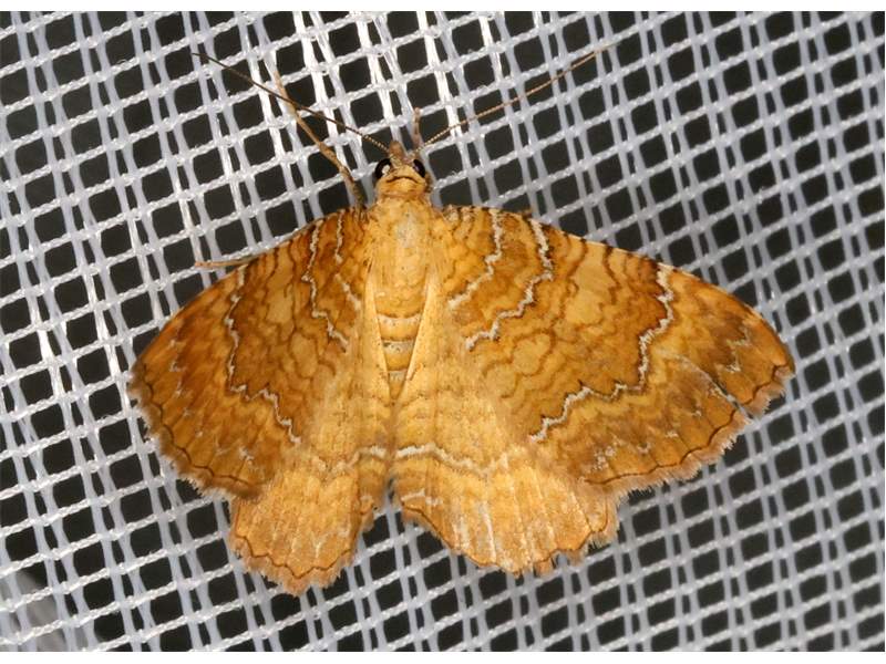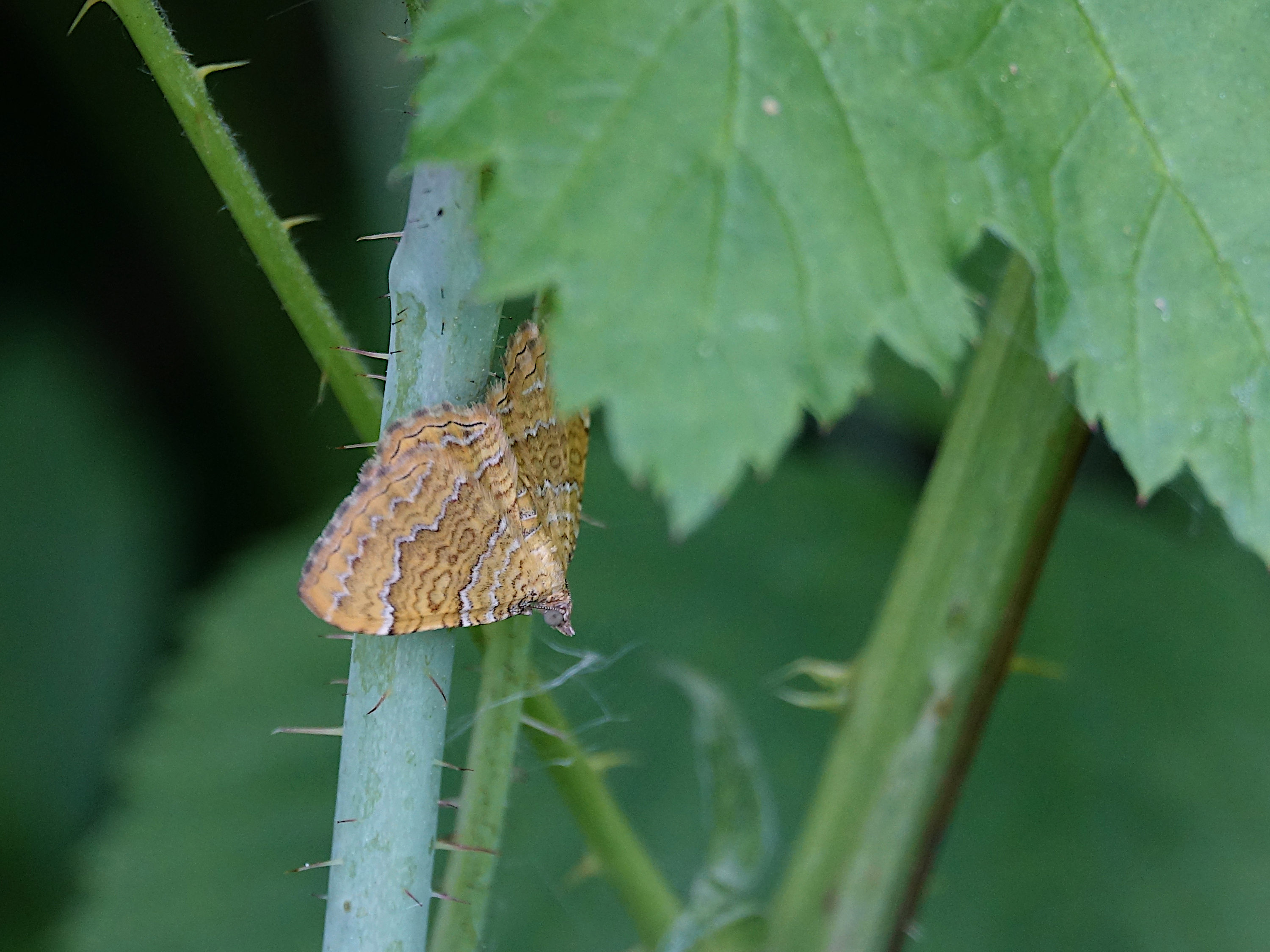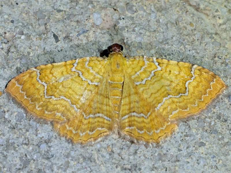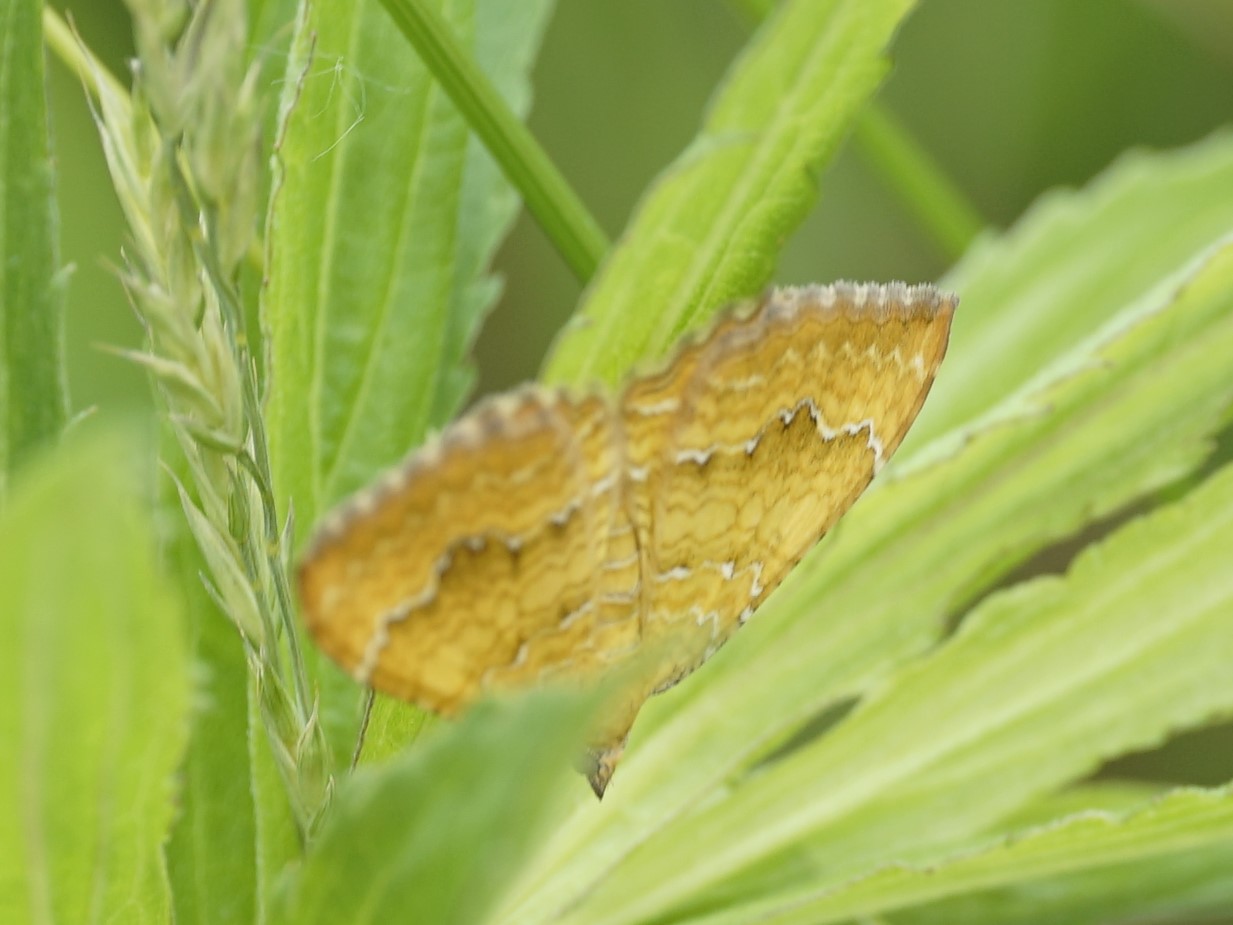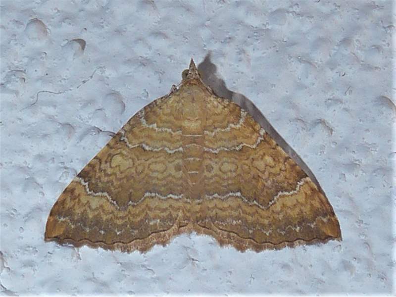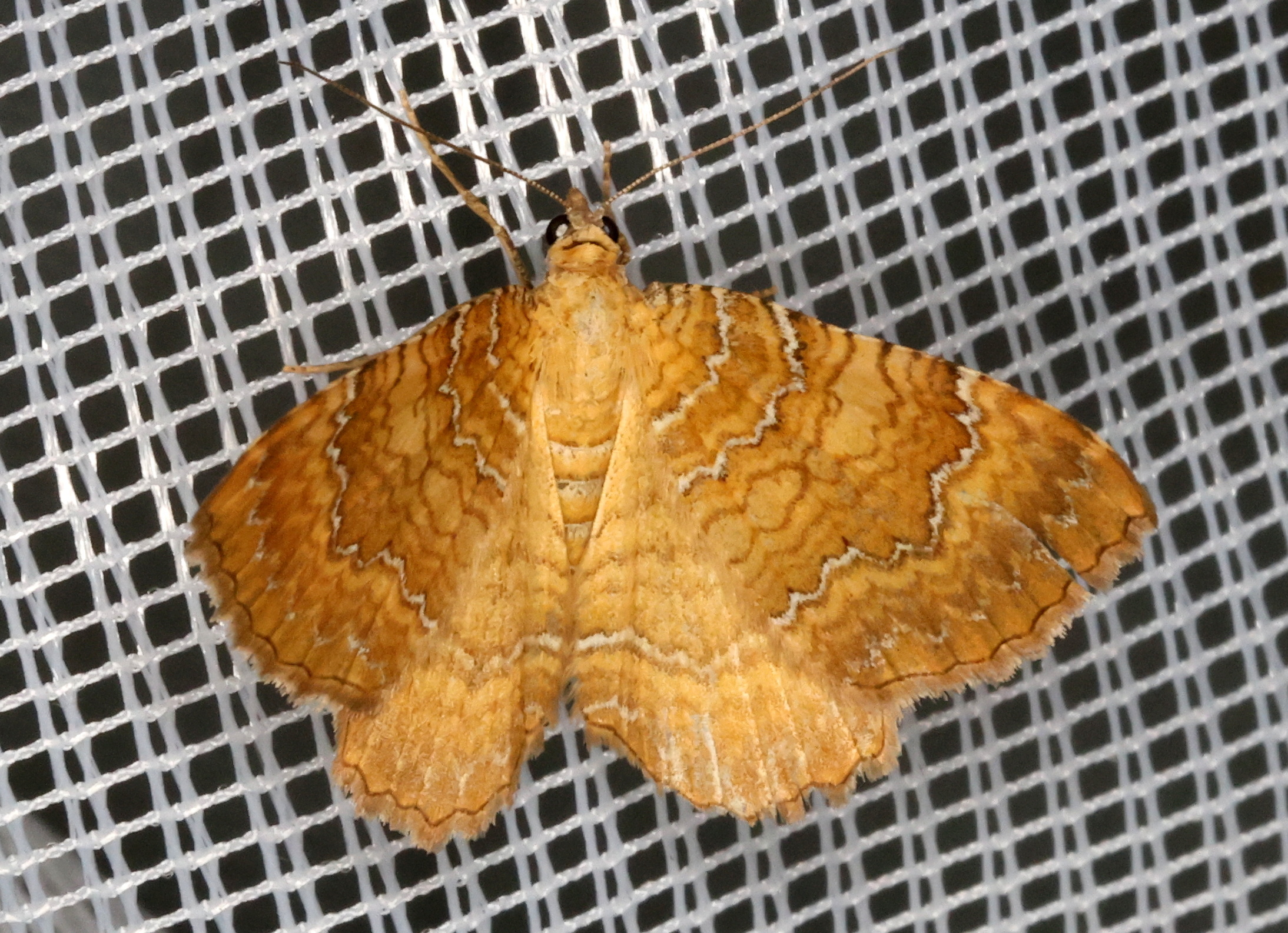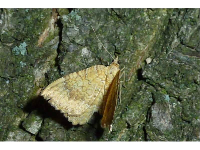 Ockergelbe Blattspanner, oder Löwenzahnspanner oder Brennnesselspanner (Camptogramma bilineata (Linnaeus, 1758)), am Licht, Radeberg, August 2013.