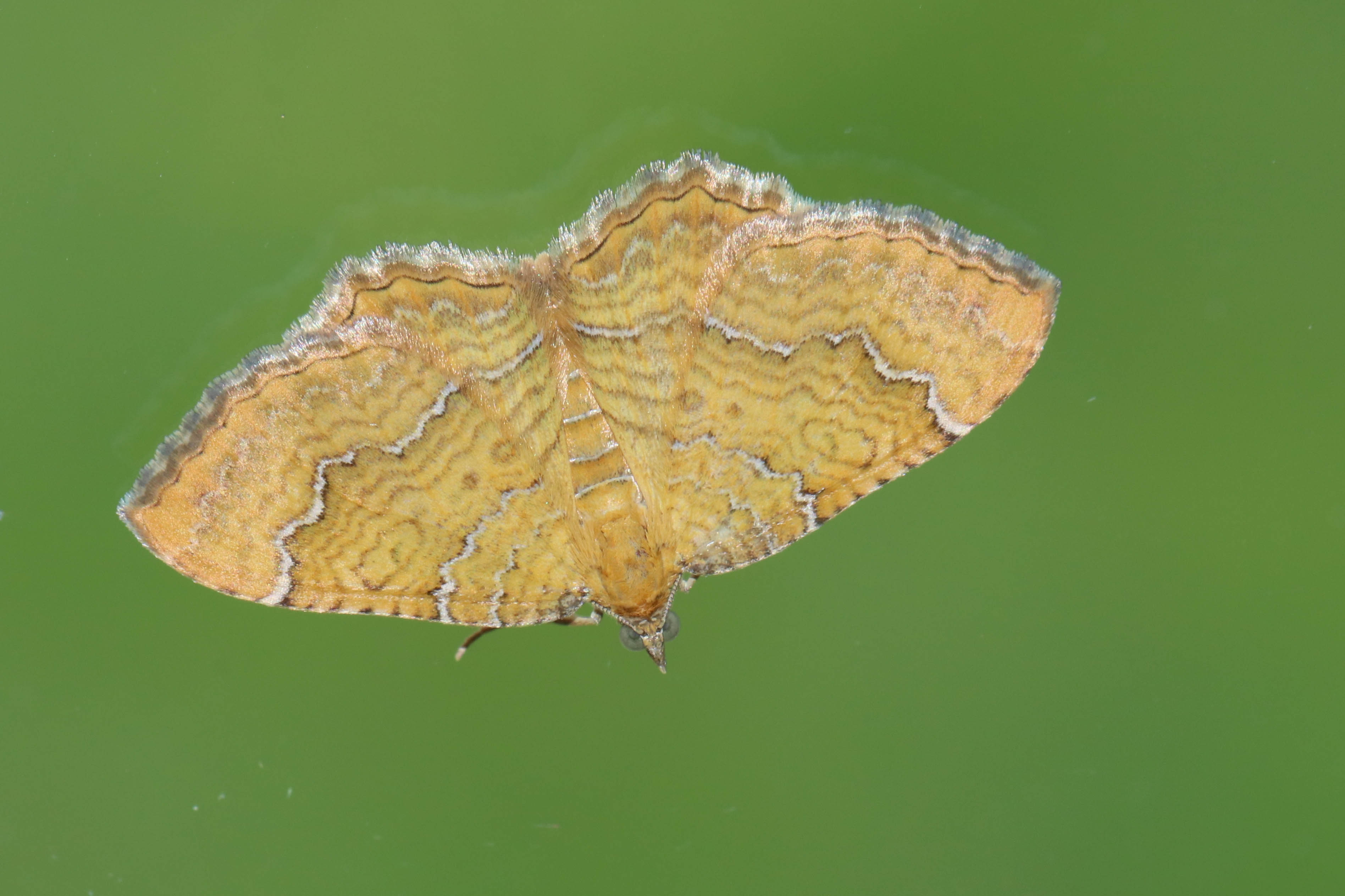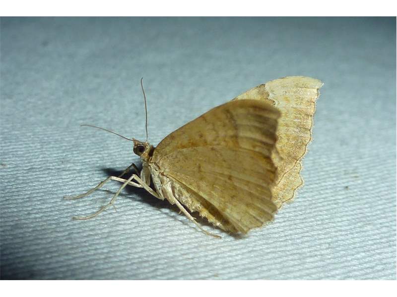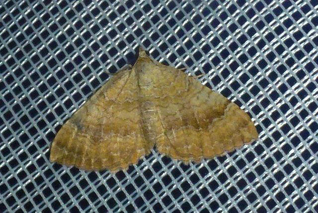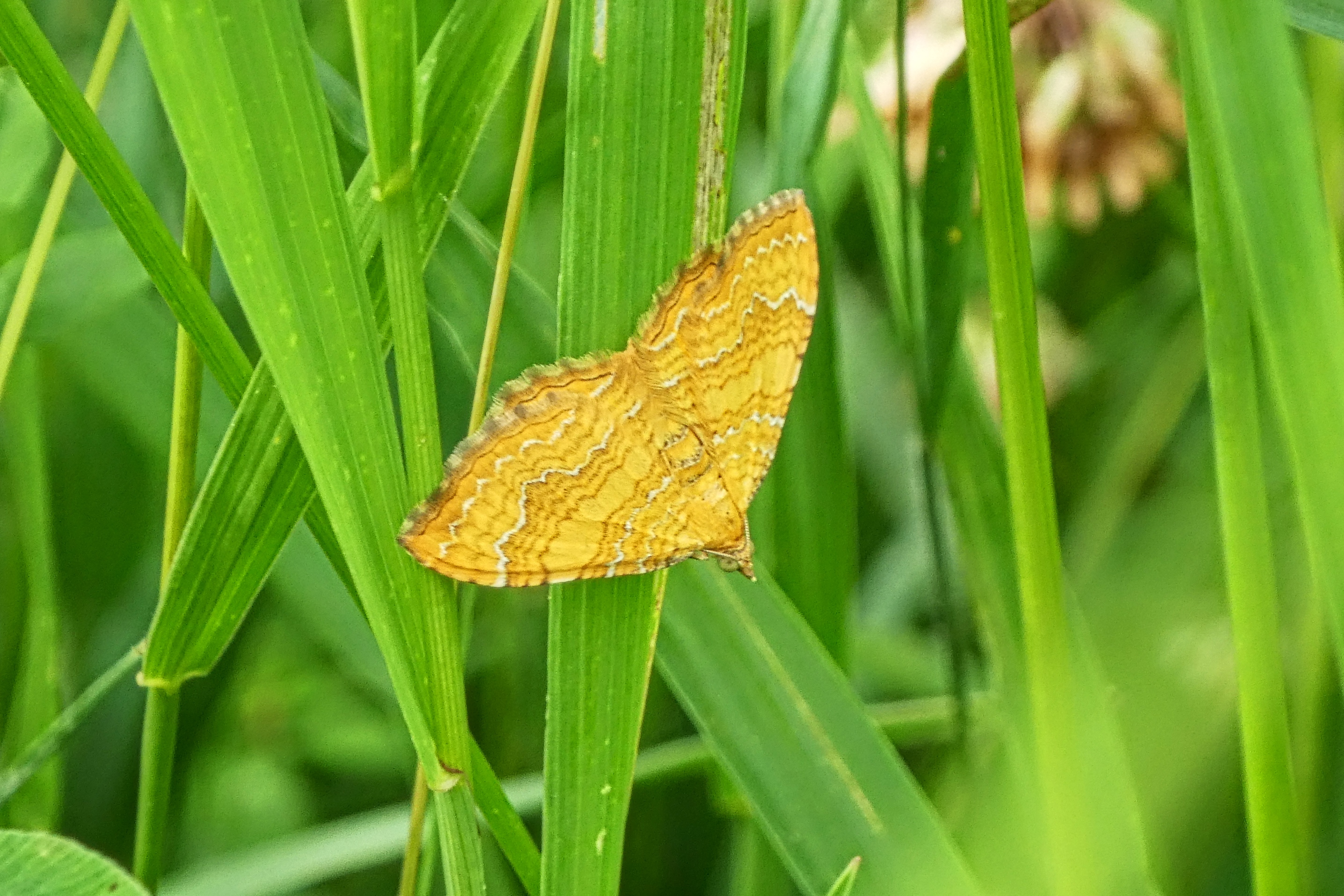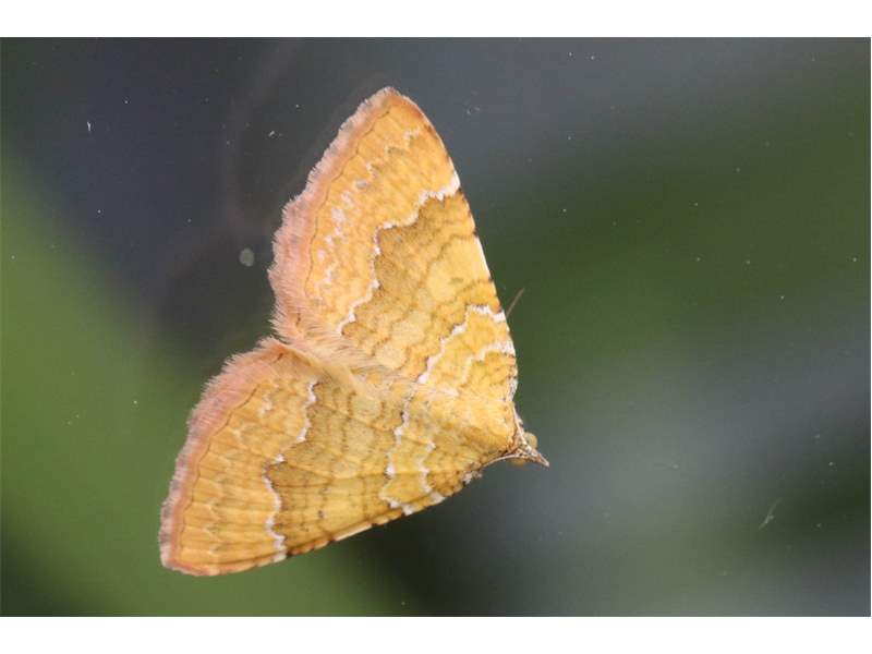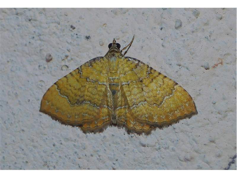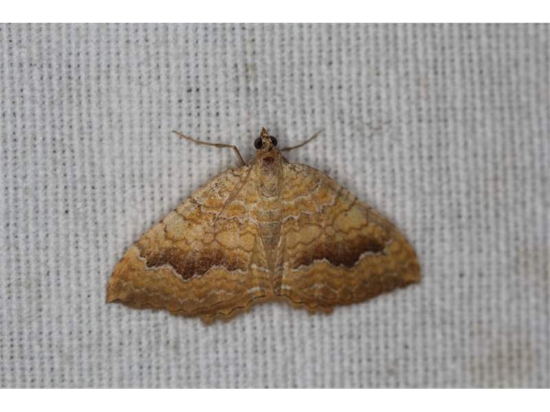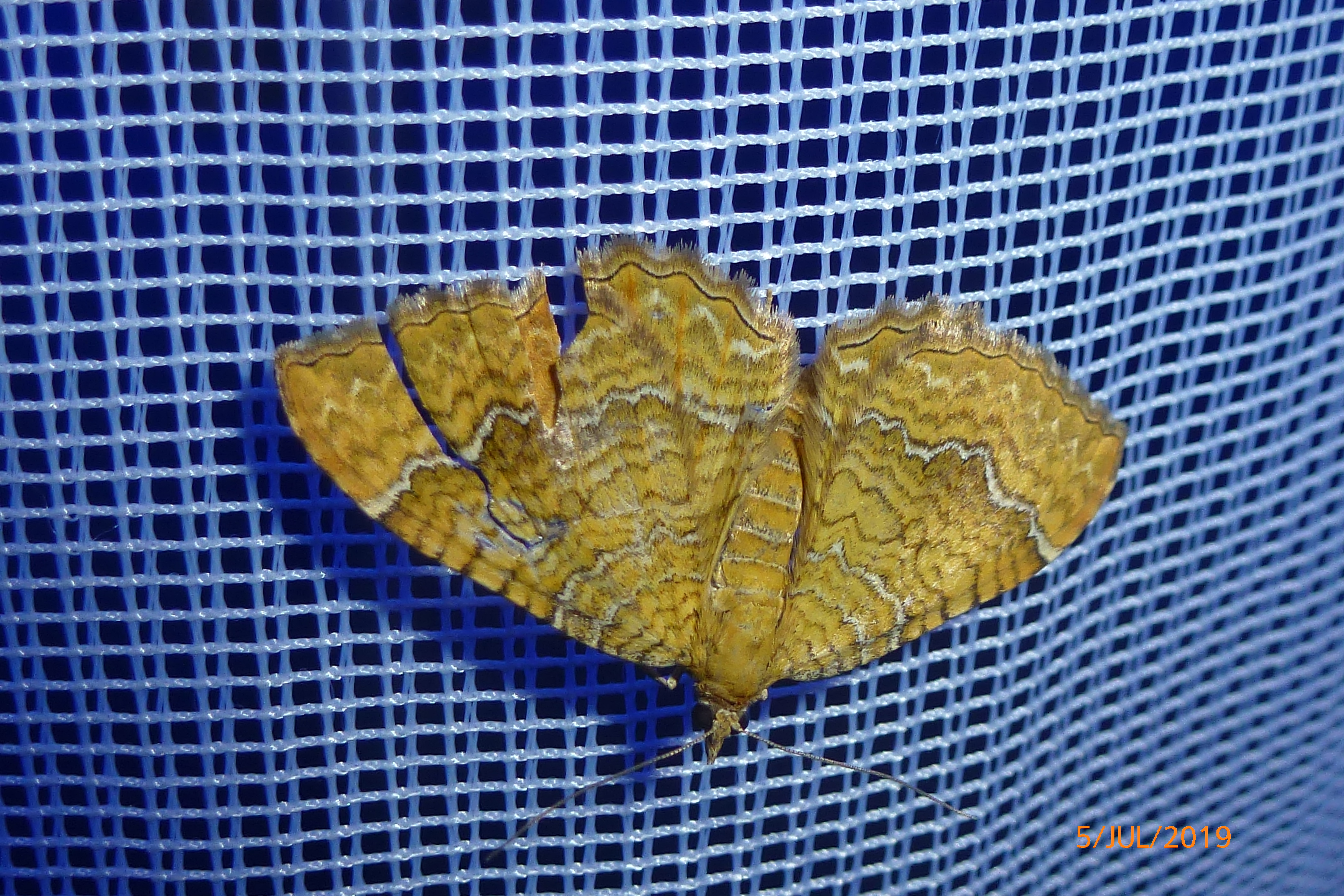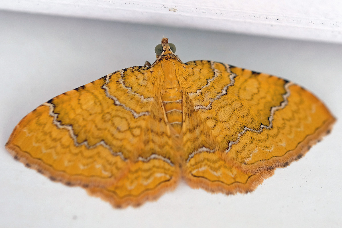 Ockergelbe Blattspanner, oder Löwenzahnspanner oder Brennnesselspanner (Camptogramma bilineata (Linnaeus, 1758)), am Licht, Radeberg, August 2013.