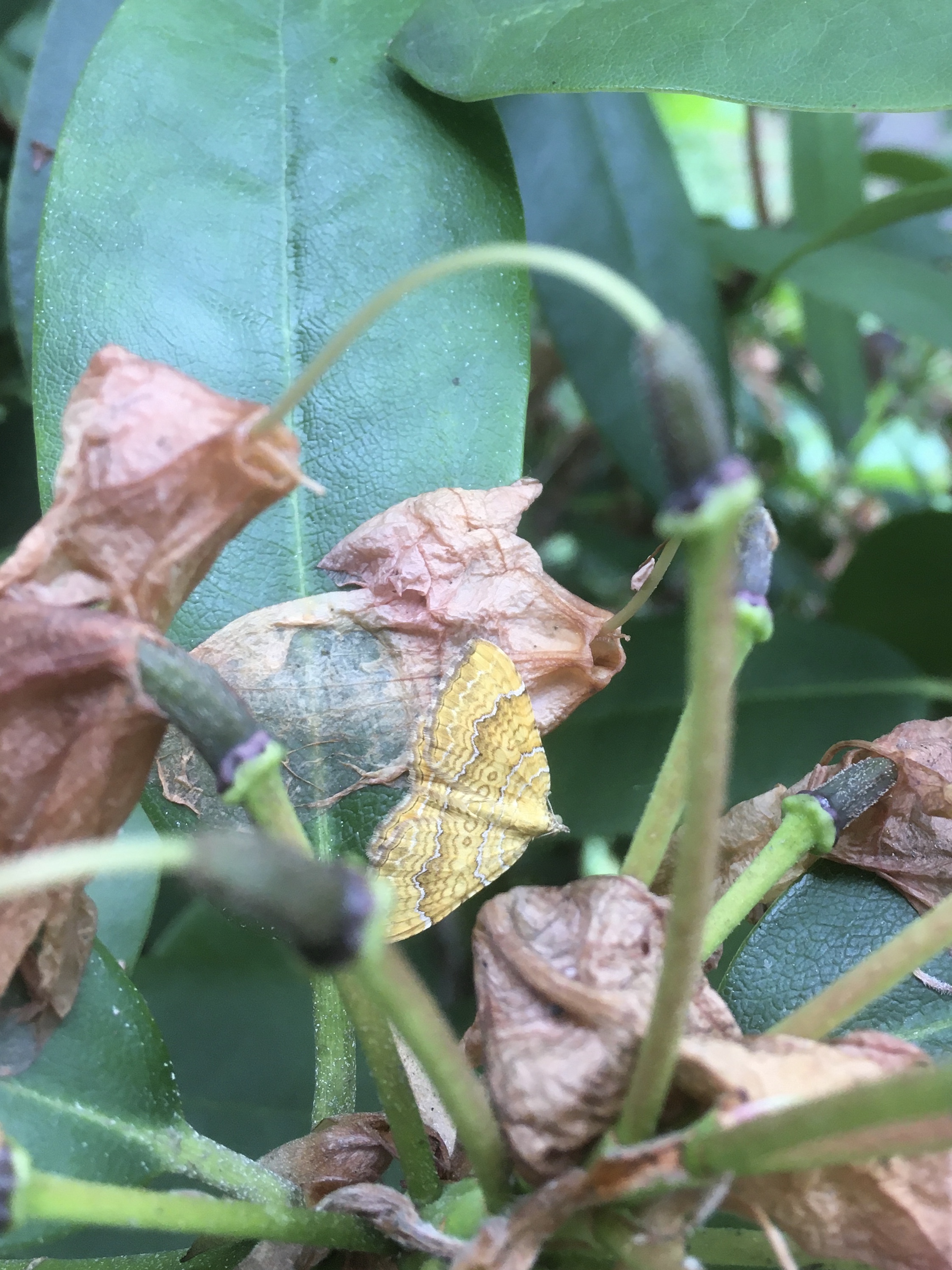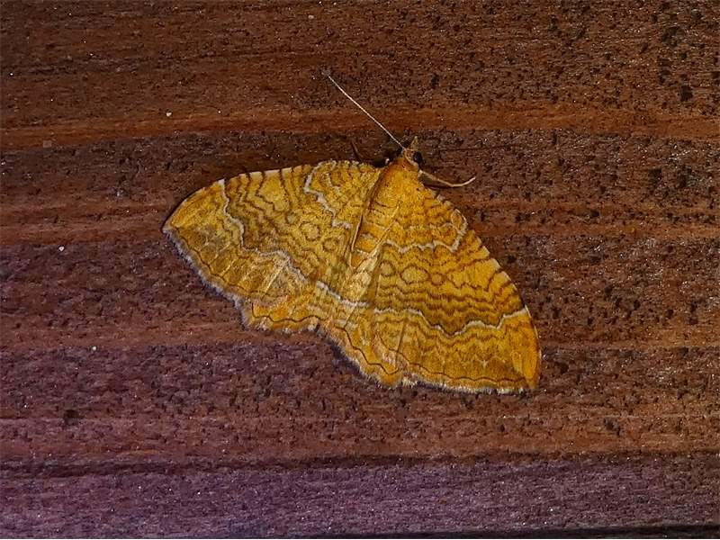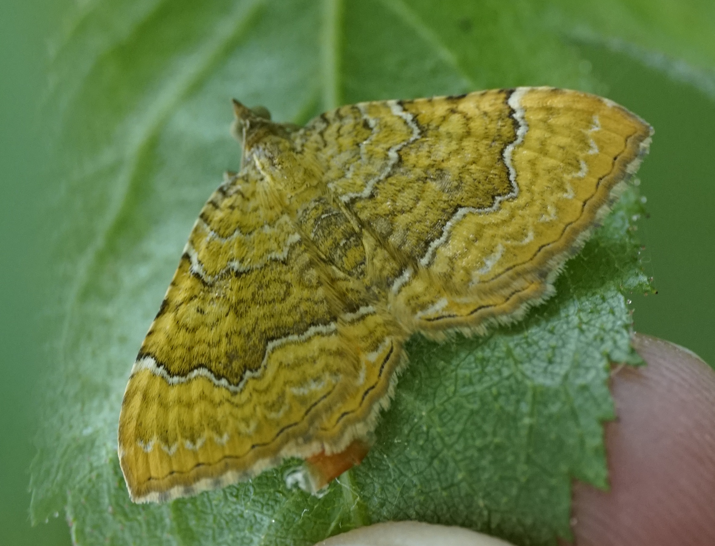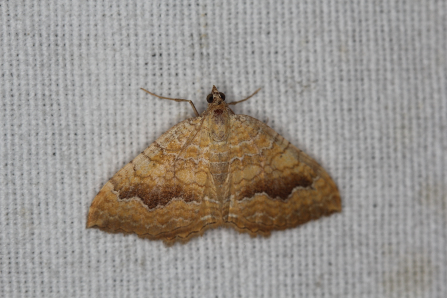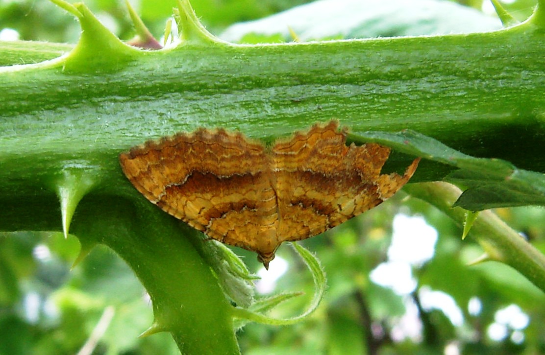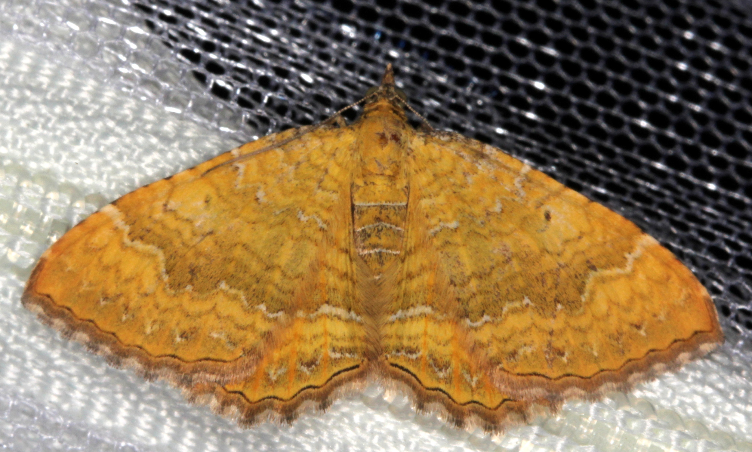 Ockergelbe Blattspanner, oder Löwenzahnspanner oder Brennnesselspanner (Camptogramma bilineata (Linnaeus, 1758)), am Licht, Radeberg, August 2013.
