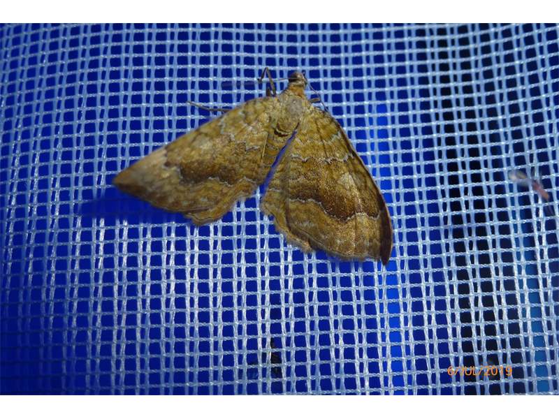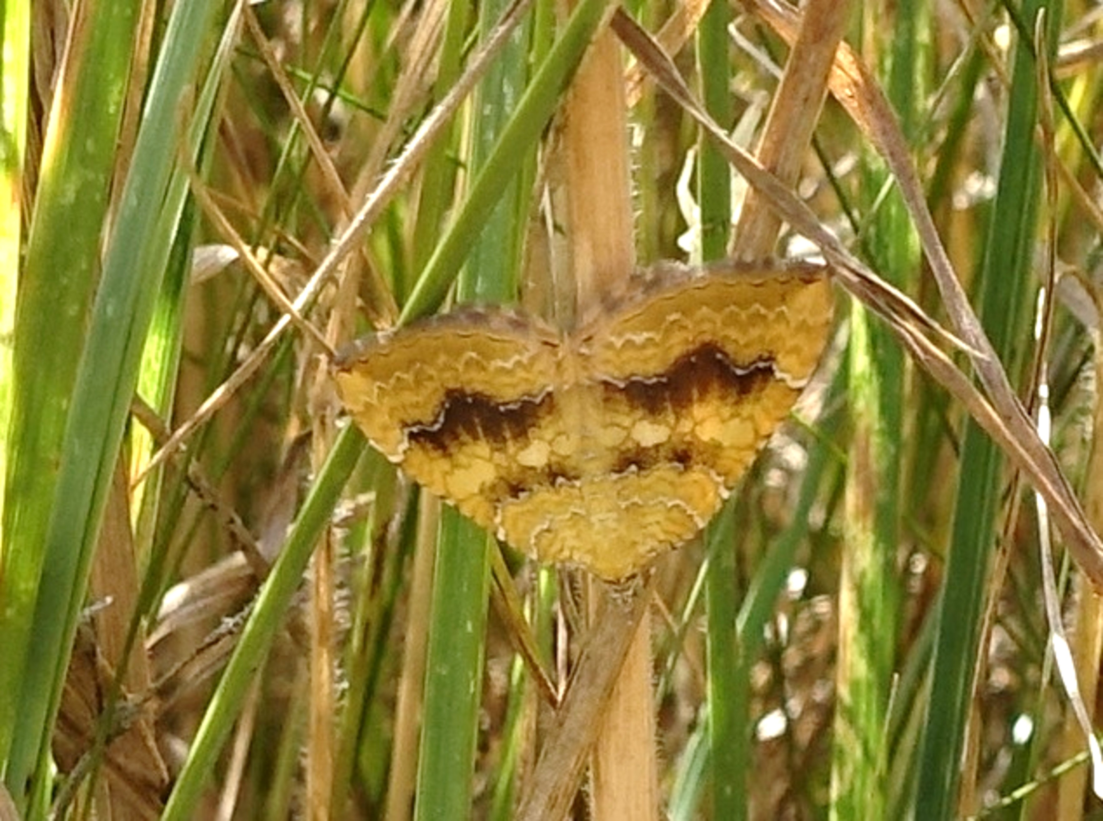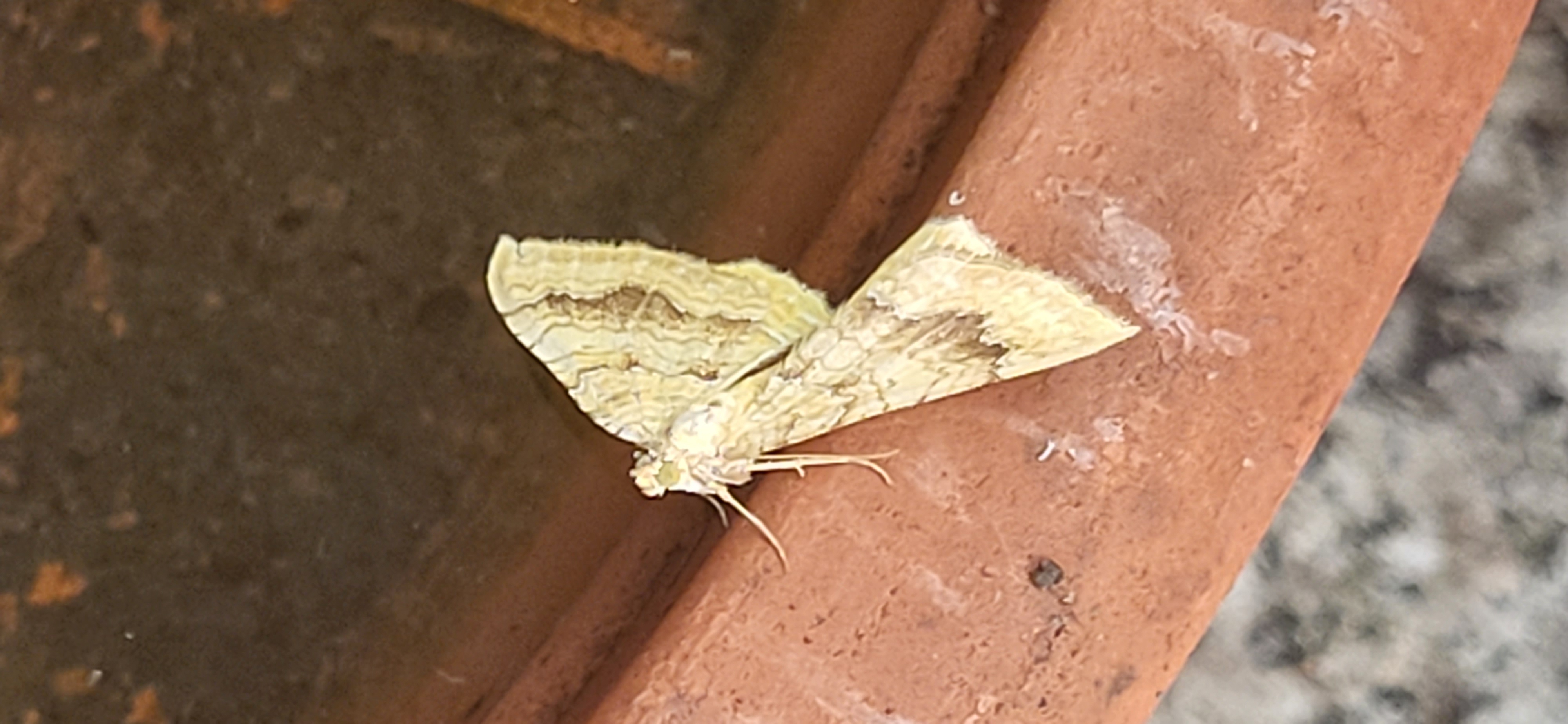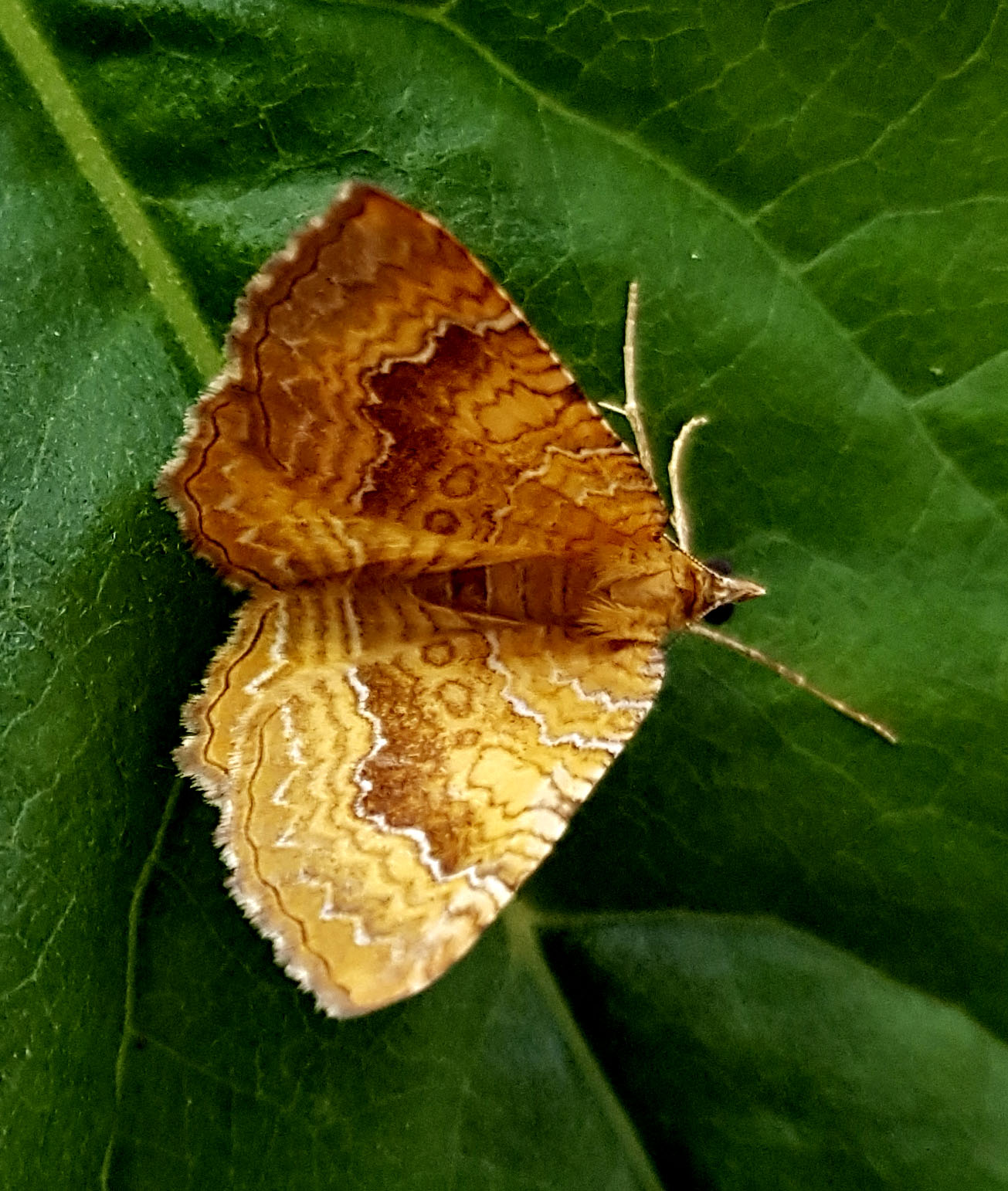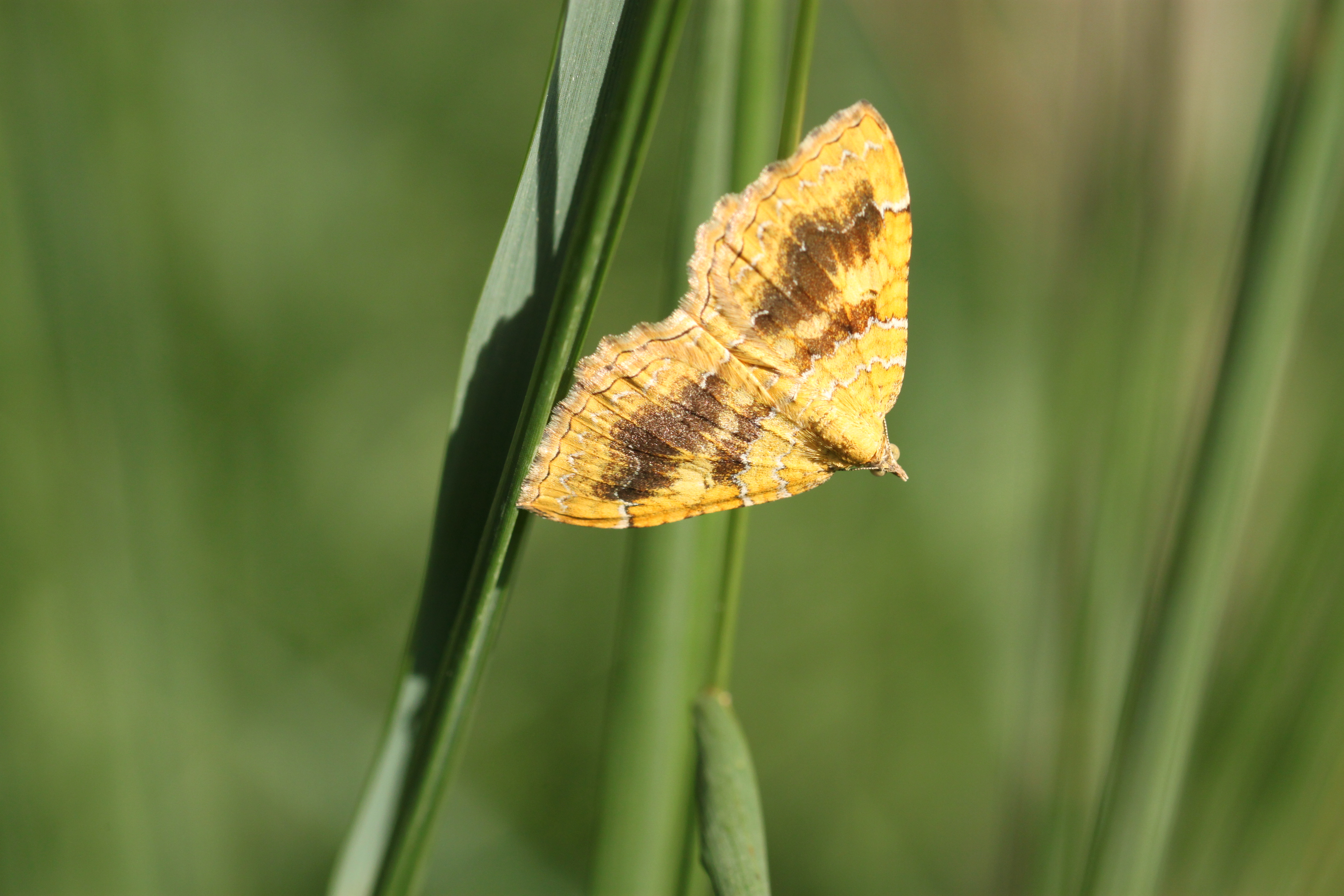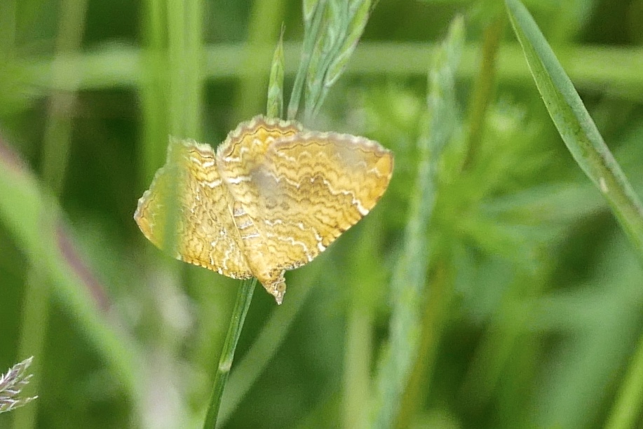 Ockergelbe Blattspanner, oder Löwenzahnspanner oder Brennnesselspanner (Camptogramma bilineata (Linnaeus, 1758)), am Licht, Radeberg, August 2013.