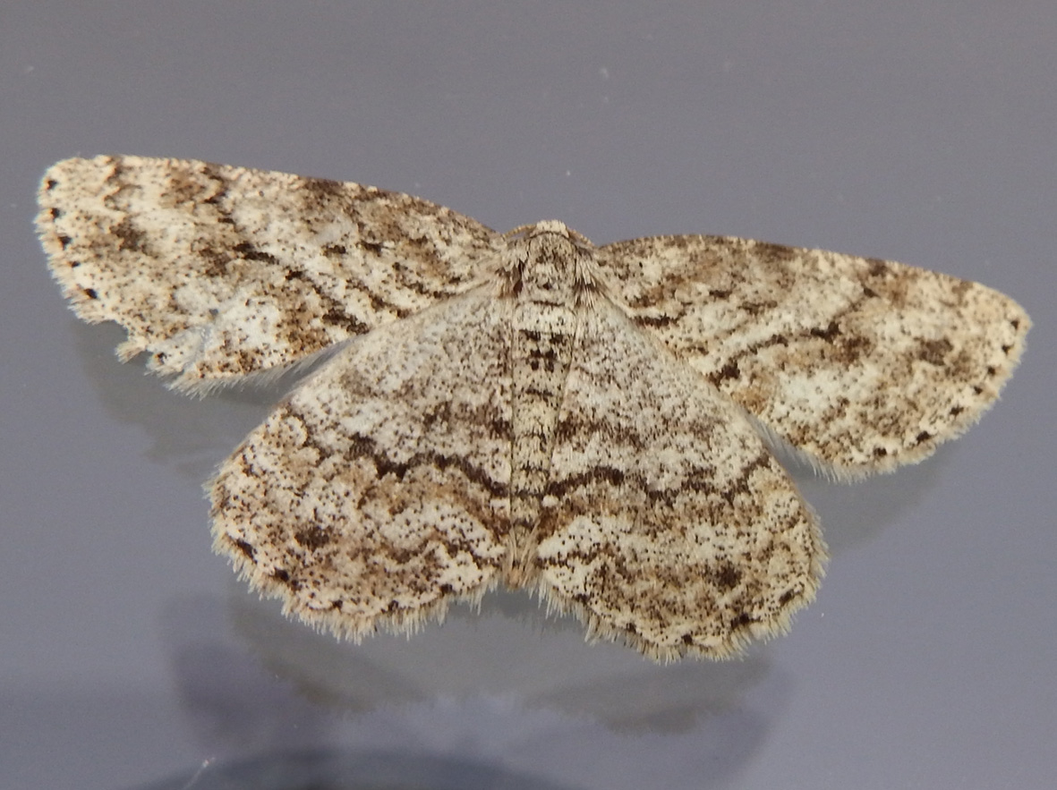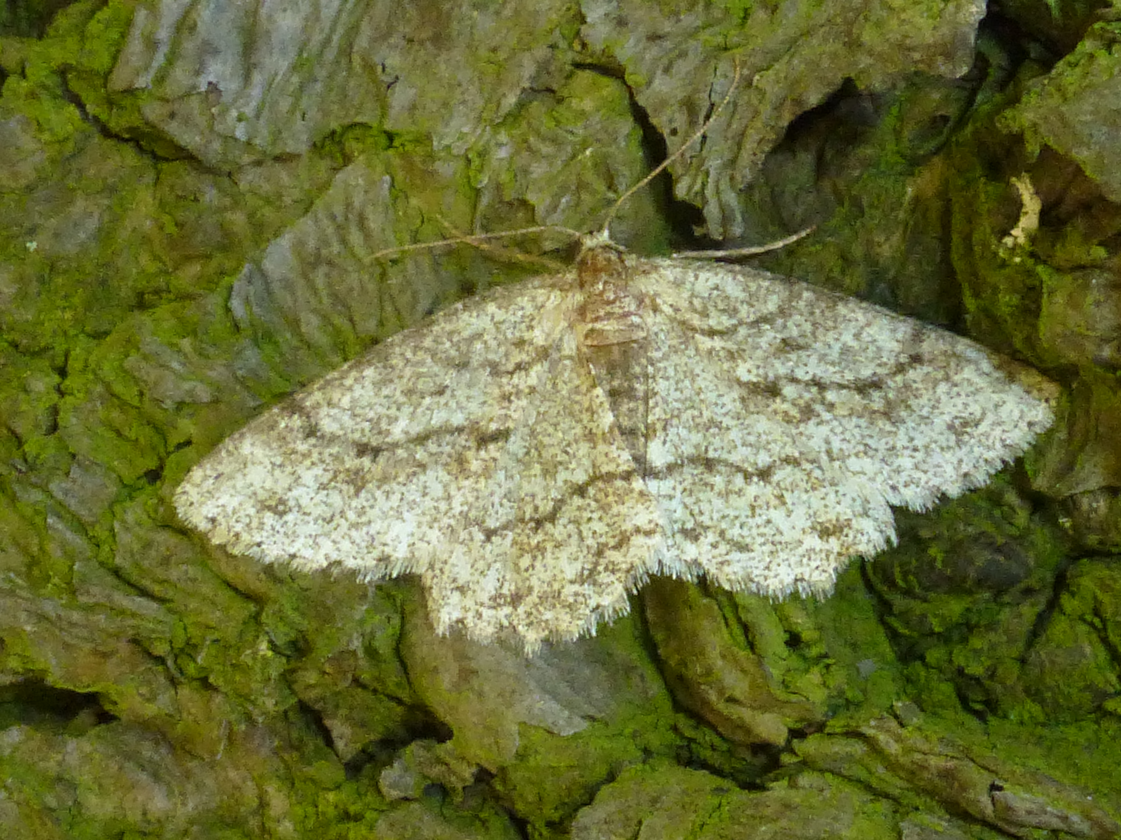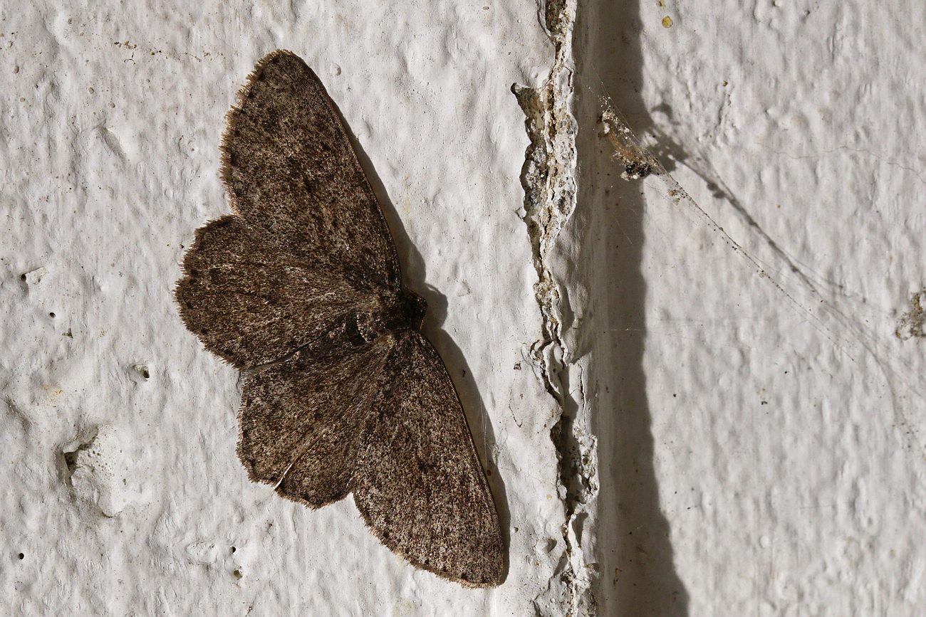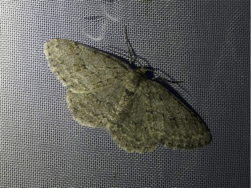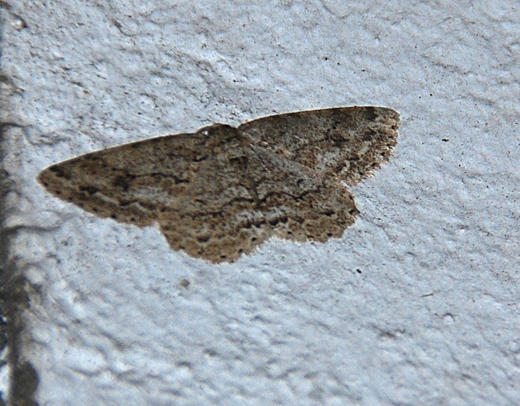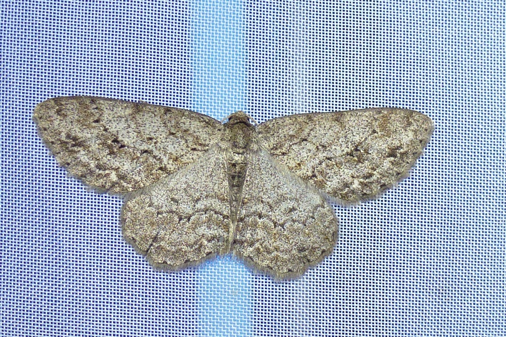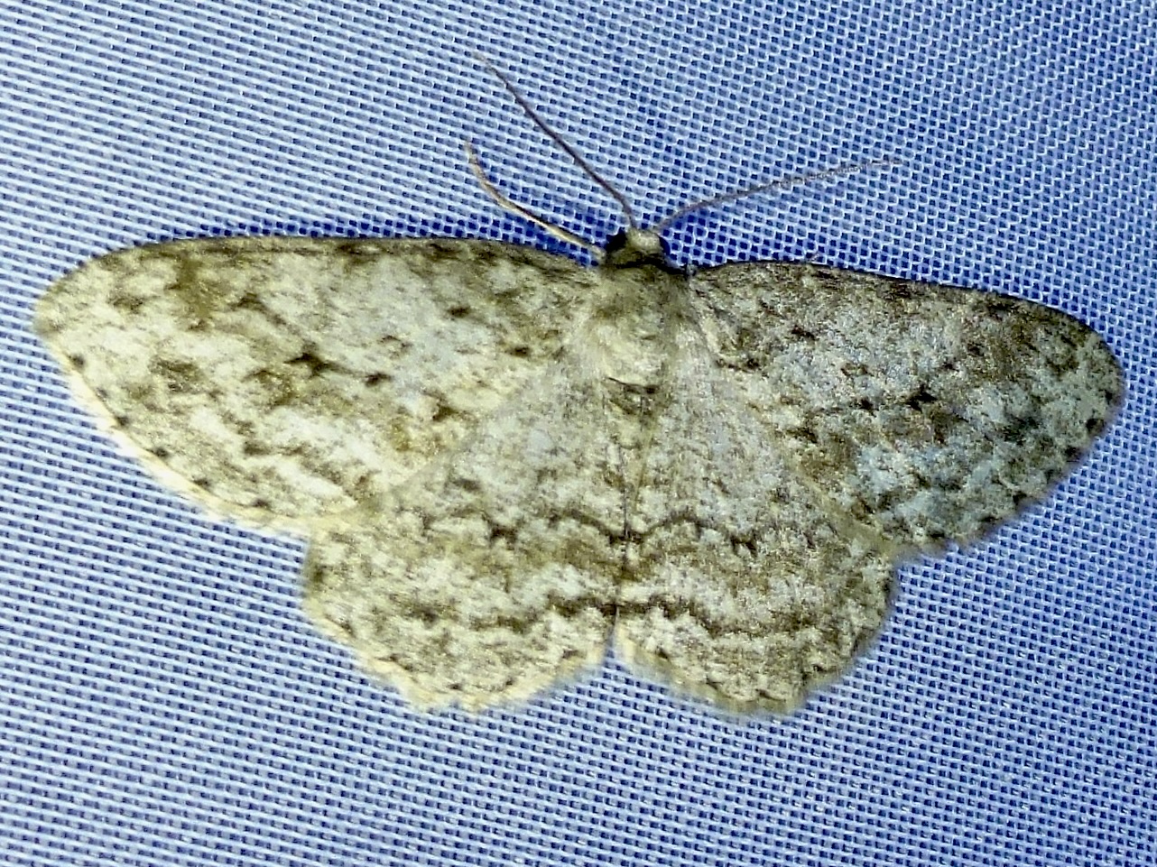 Ectropis crepuscularia (Denis & Schiffermüller, 1775), Chemnitz: Zeisigwald//Planitzwiese, 11.4.2018, seit Tagen frühsommerliche Temperaturen, passiver Lichtfang an hellem Gebäude, natürliche Farbe grau-grün