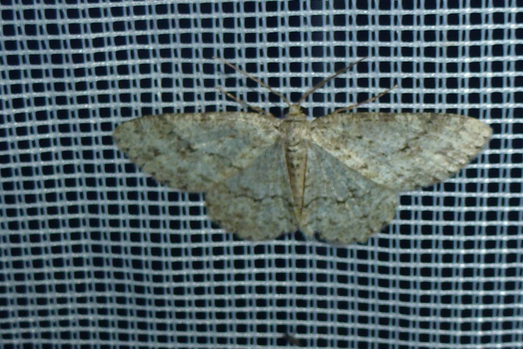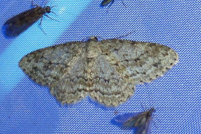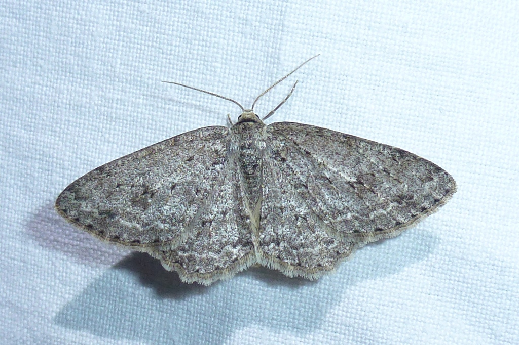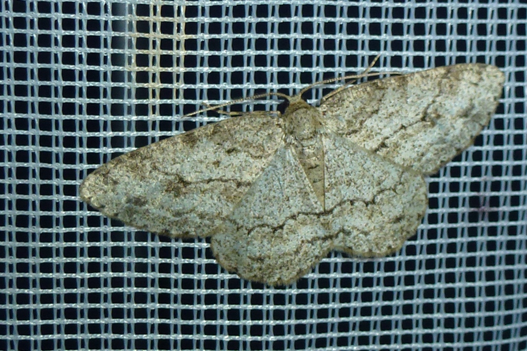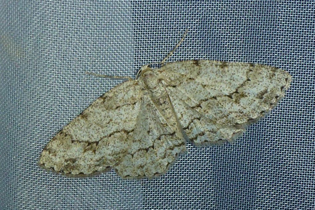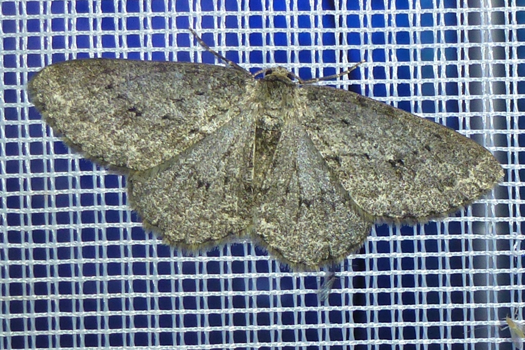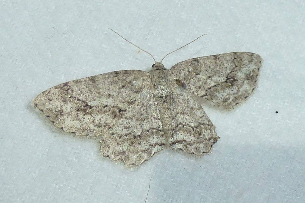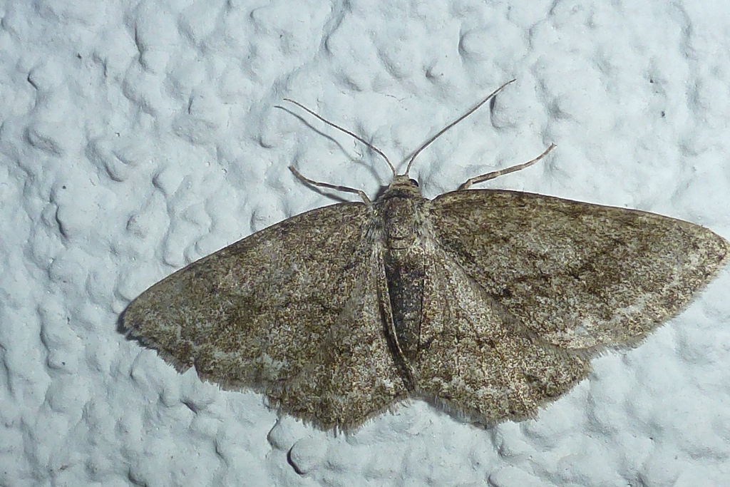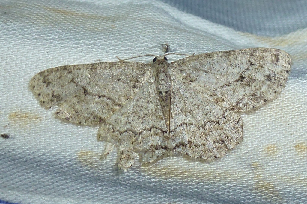 Ectropis crepuscularia (Denis & Schiffermüller, 1775), Chemnitz: Zeisigwald//Planitzwiese, 11.4.2018, seit Tagen frühsommerliche Temperaturen, passiver Lichtfang an hellem Gebäude, natürliche Farbe grau-grün