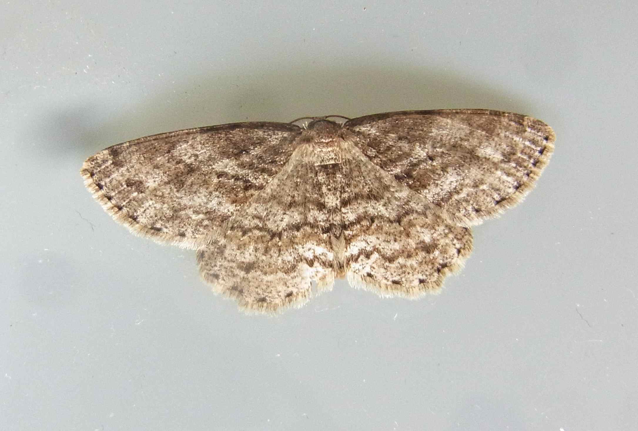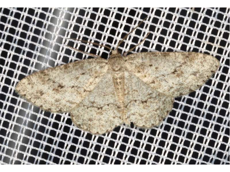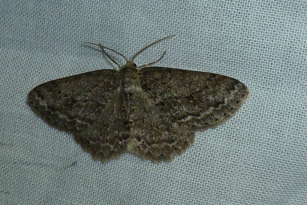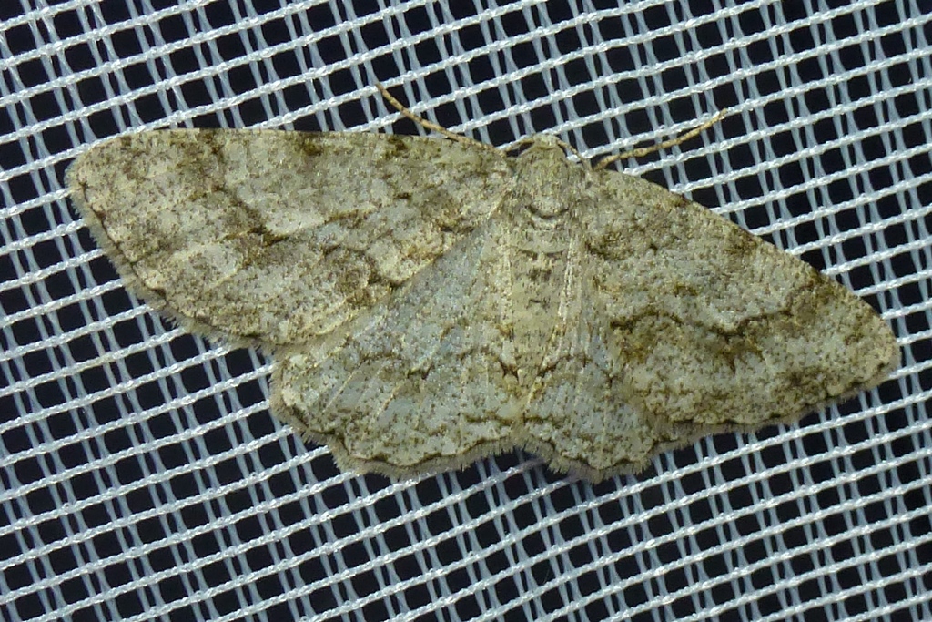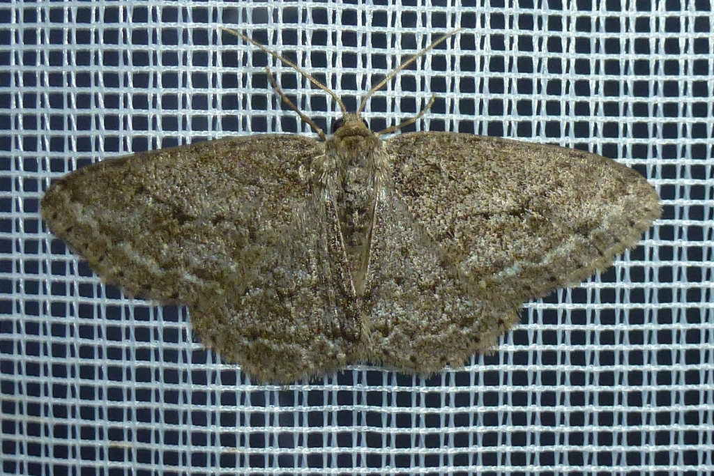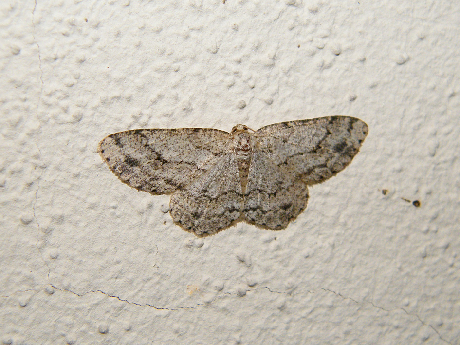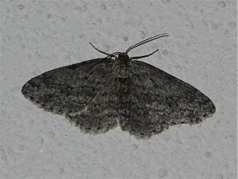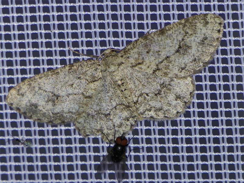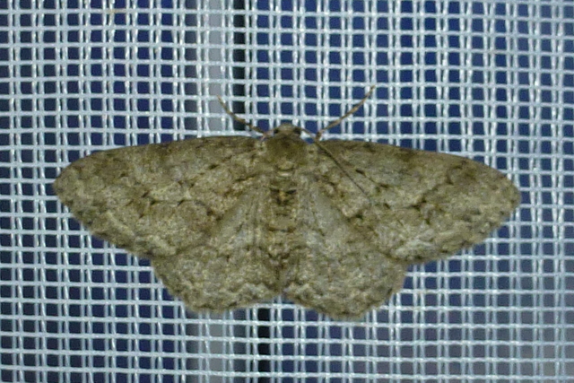 Ectropis crepuscularia (Denis & Schiffermüller, 1775), Chemnitz: Zeisigwald//Planitzwiese, 11.4.2018, seit Tagen frühsommerliche Temperaturen, passiver Lichtfang an hellem Gebäude, natürliche Farbe grau-grün