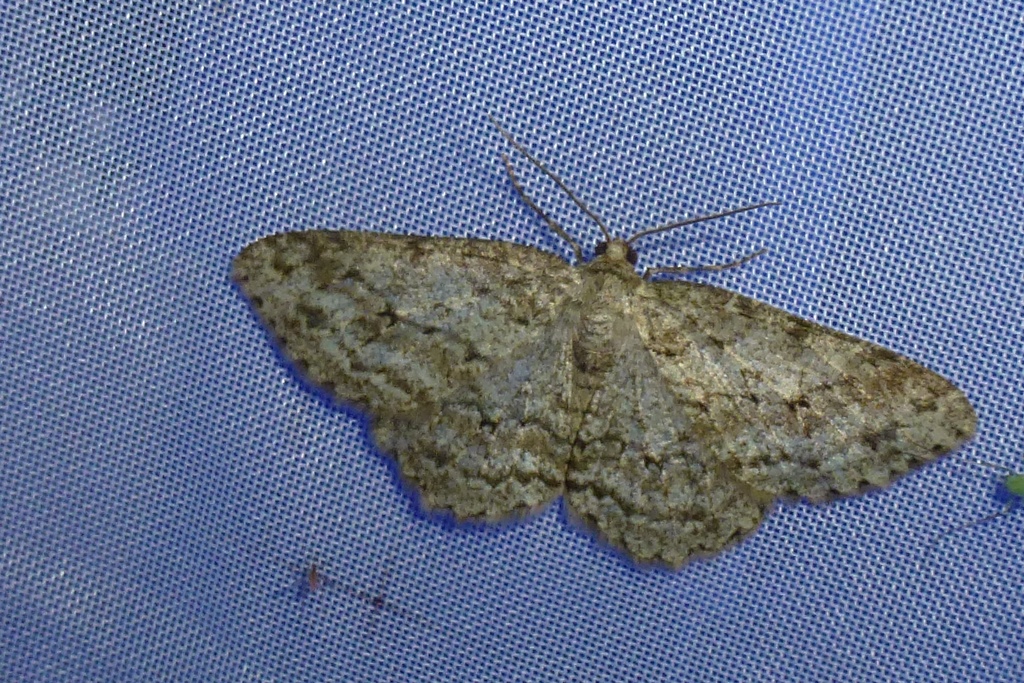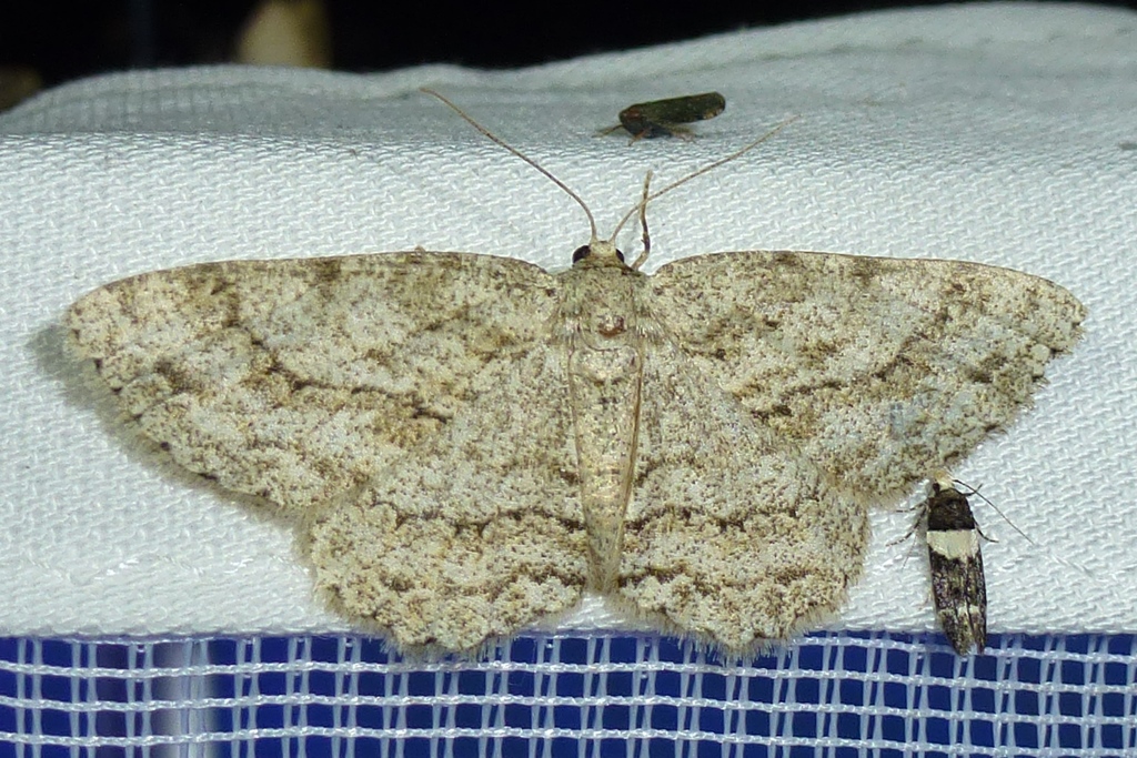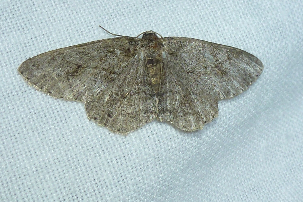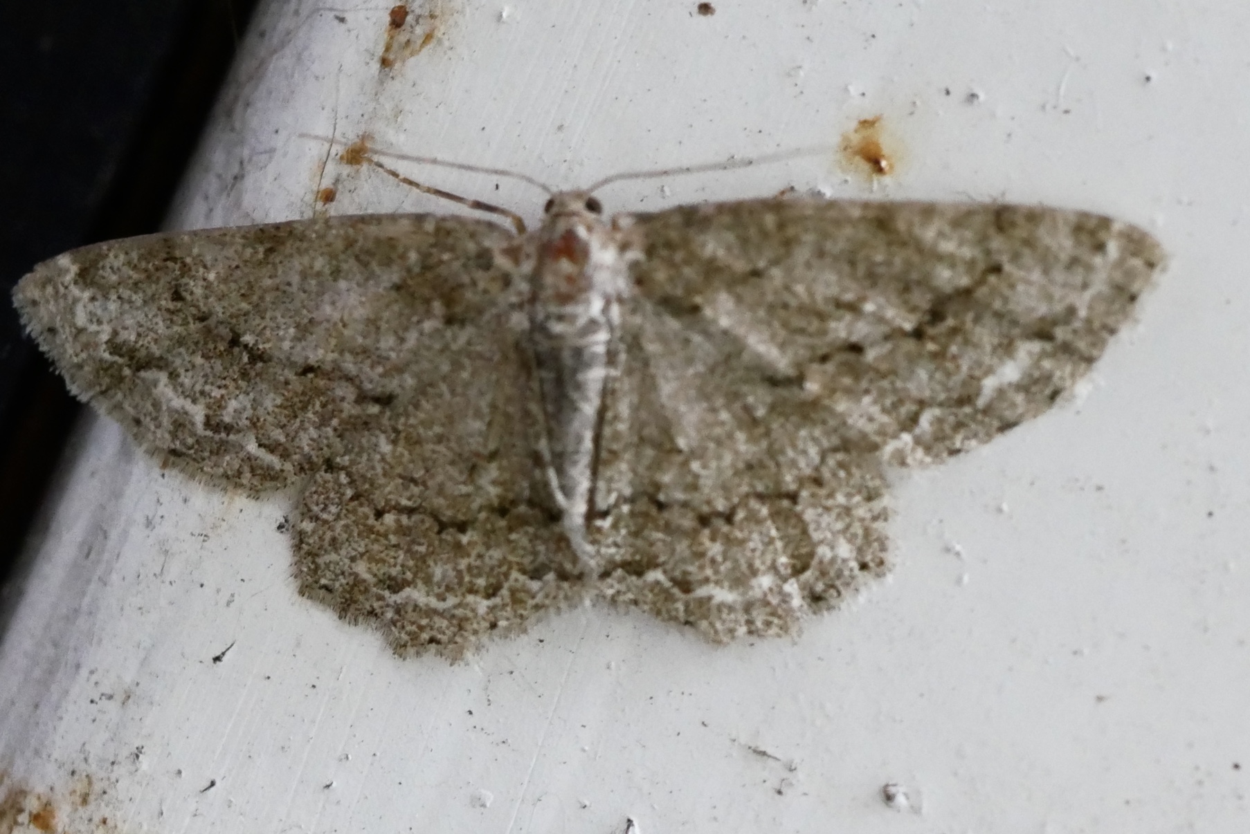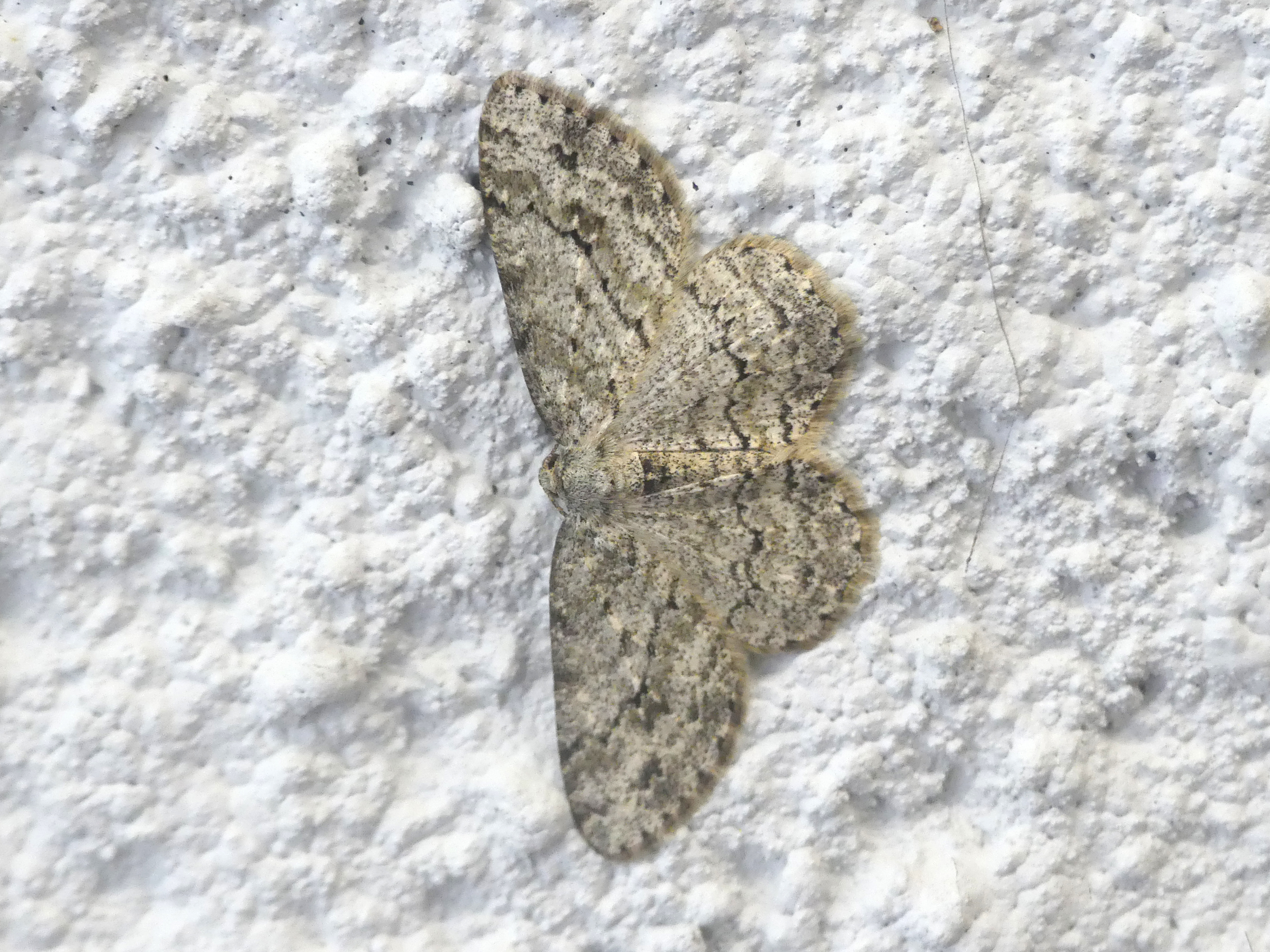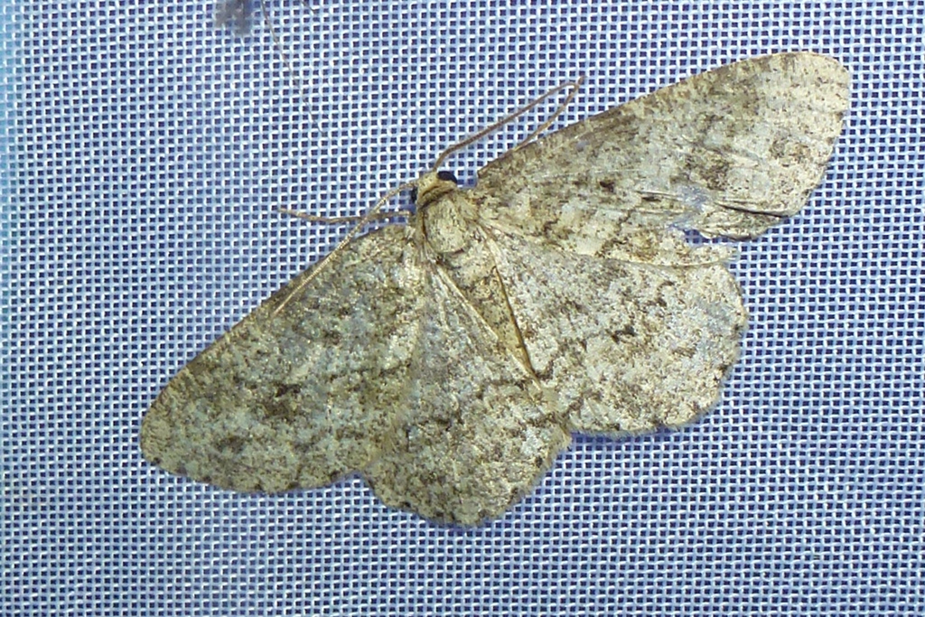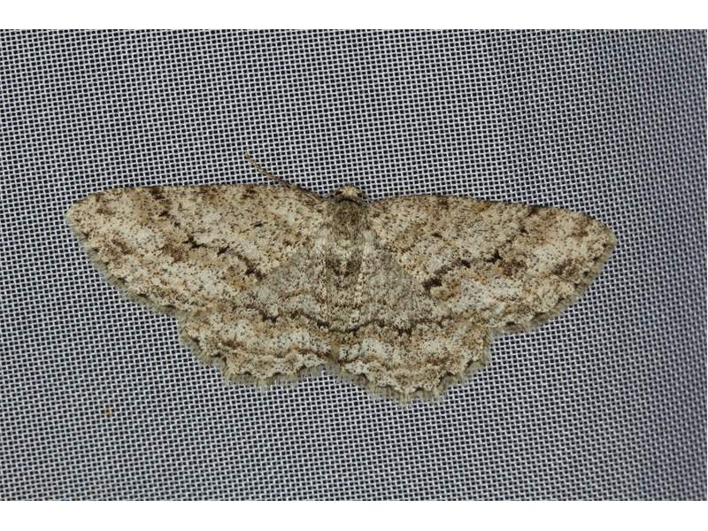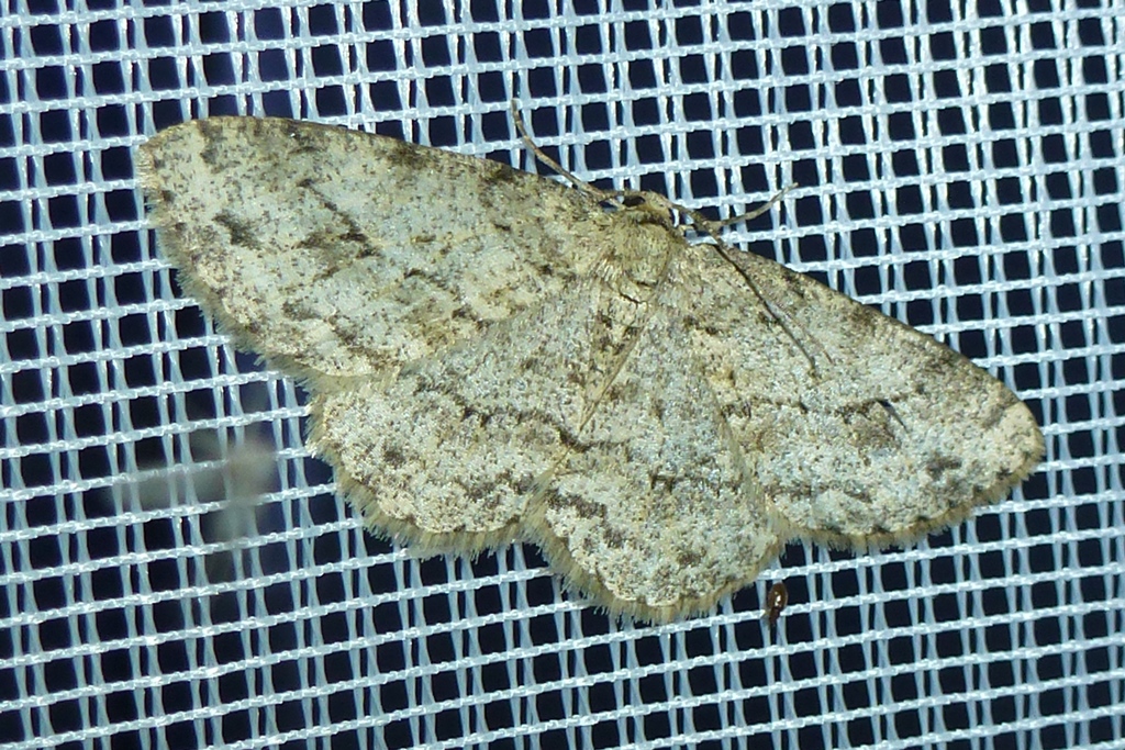 Ectropis crepuscularia (Denis & Schiffermüller, 1775), Chemnitz: Zeisigwald//Planitzwiese, 11.4.2018, seit Tagen frühsommerliche Temperaturen, passiver Lichtfang an hellem Gebäude, natürliche Farbe grau-grün