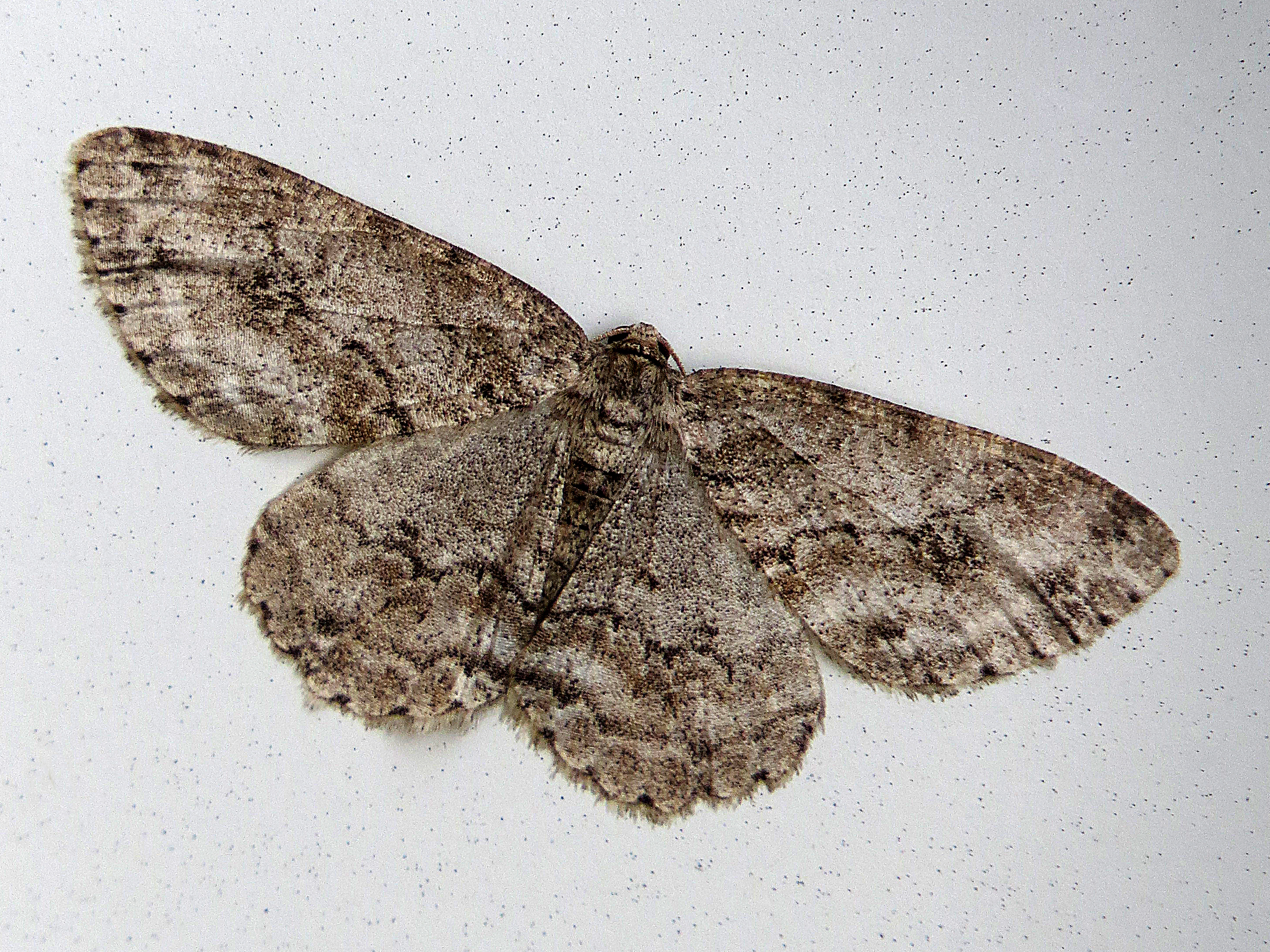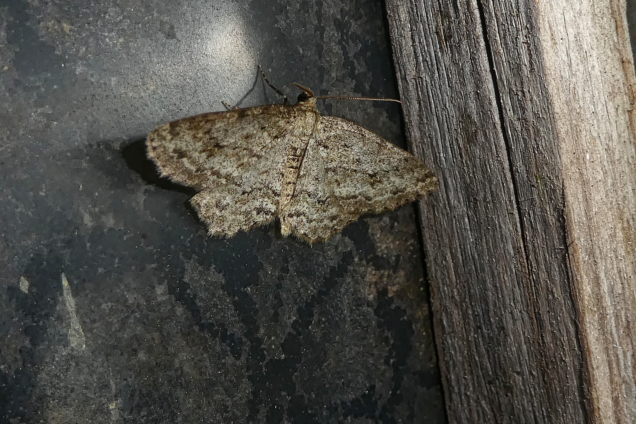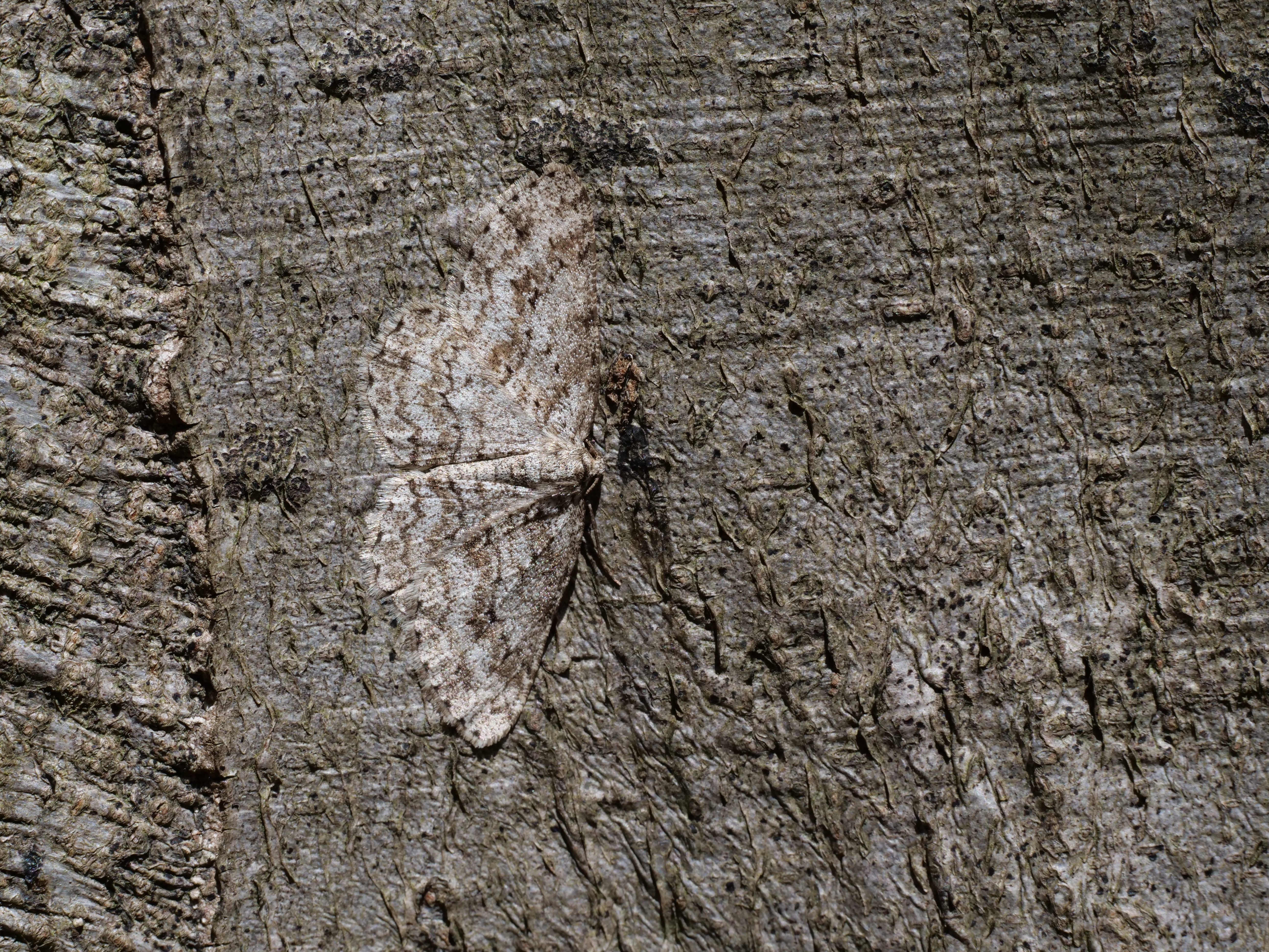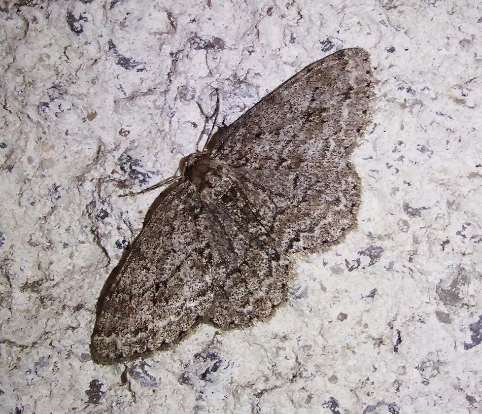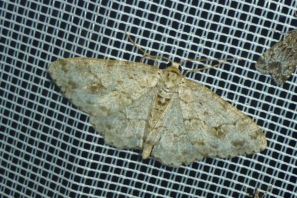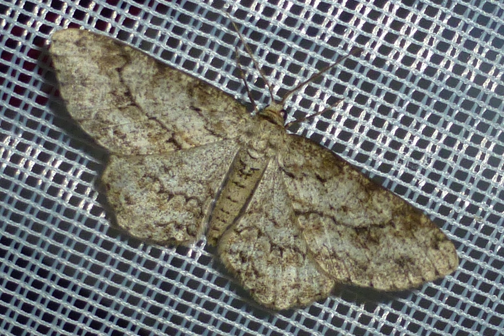 Ectropis crepuscularia (Denis & Schiffermüller, 1775), Chemnitz: Zeisigwald//Planitzwiese, 11.4.2018, seit Tagen frühsommerliche Temperaturen, passiver Lichtfang an hellem Gebäude, natürliche Farbe grau-grün