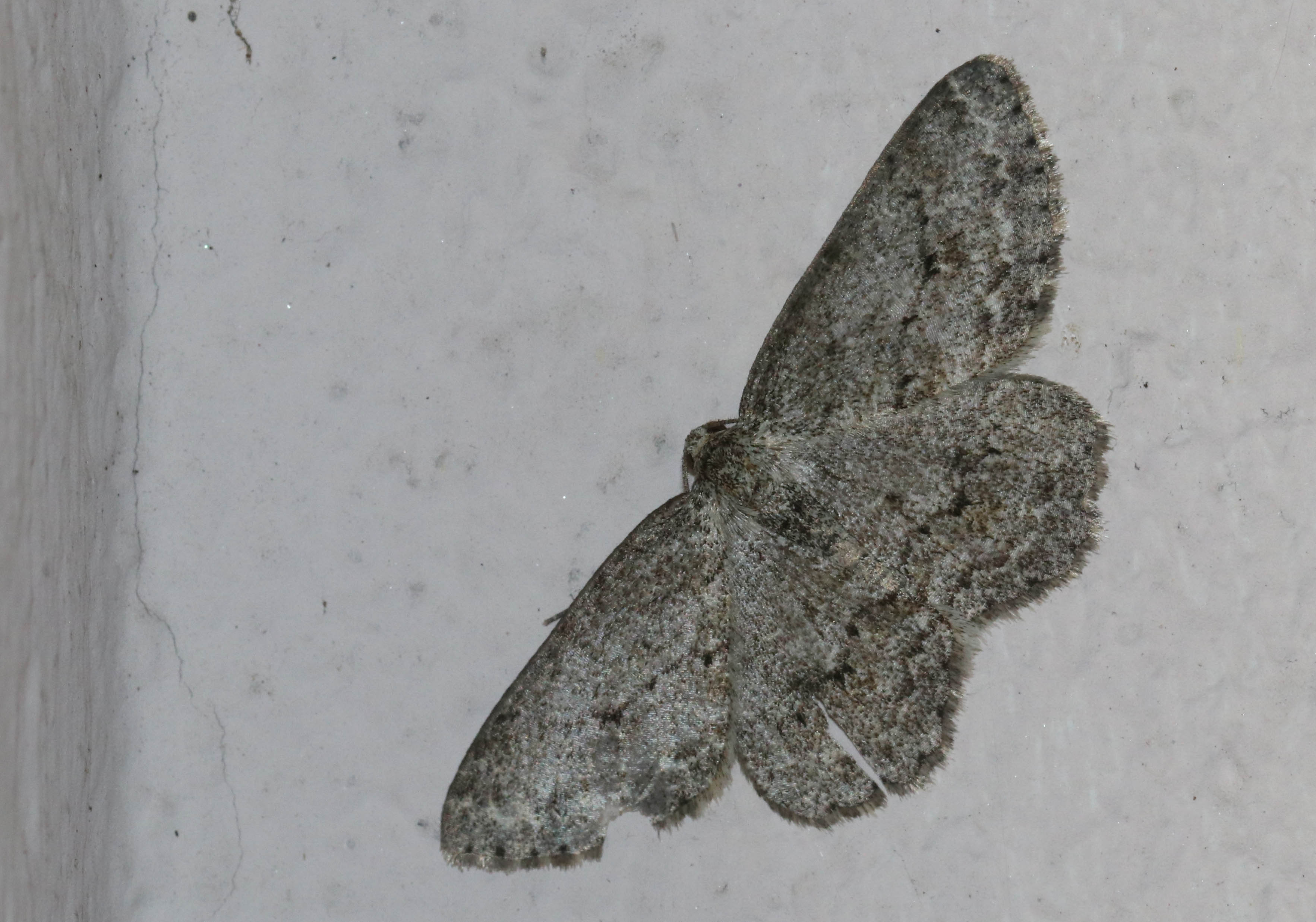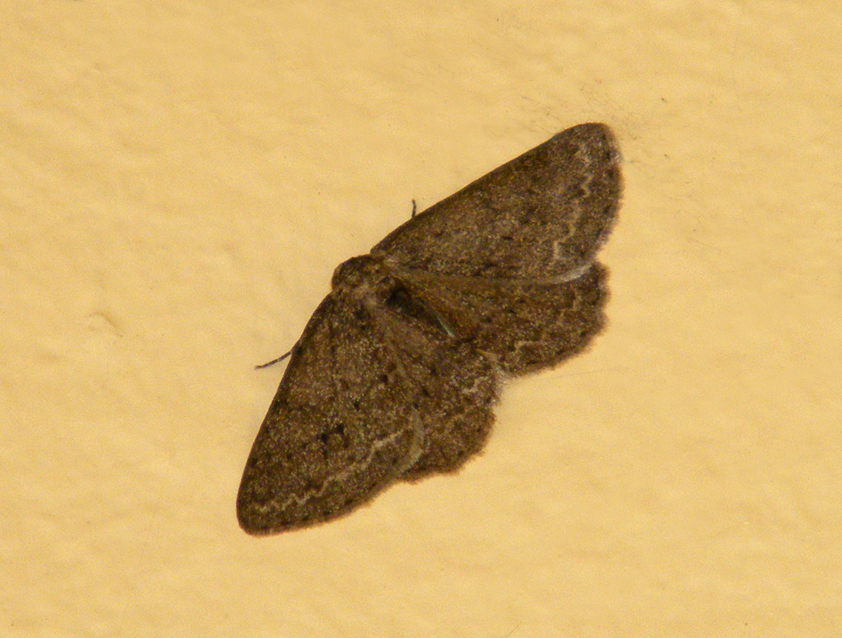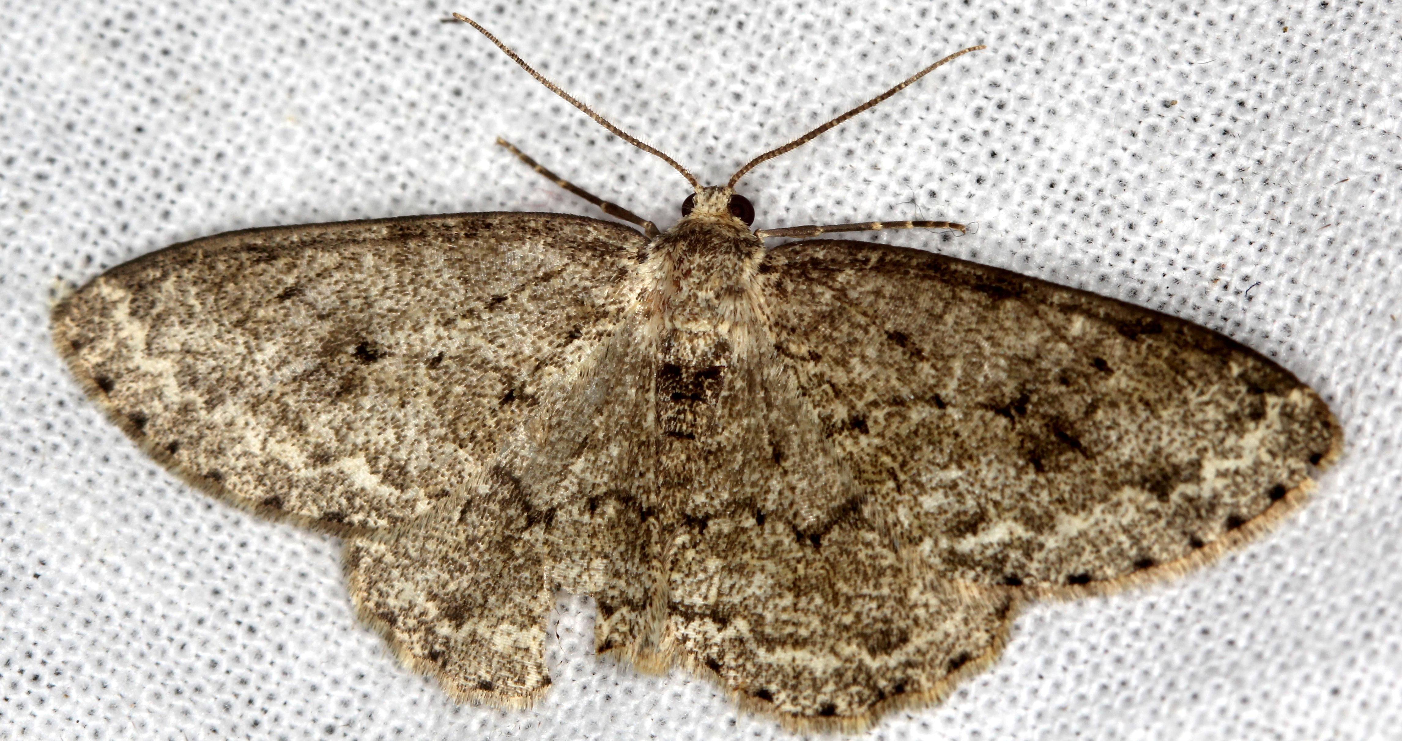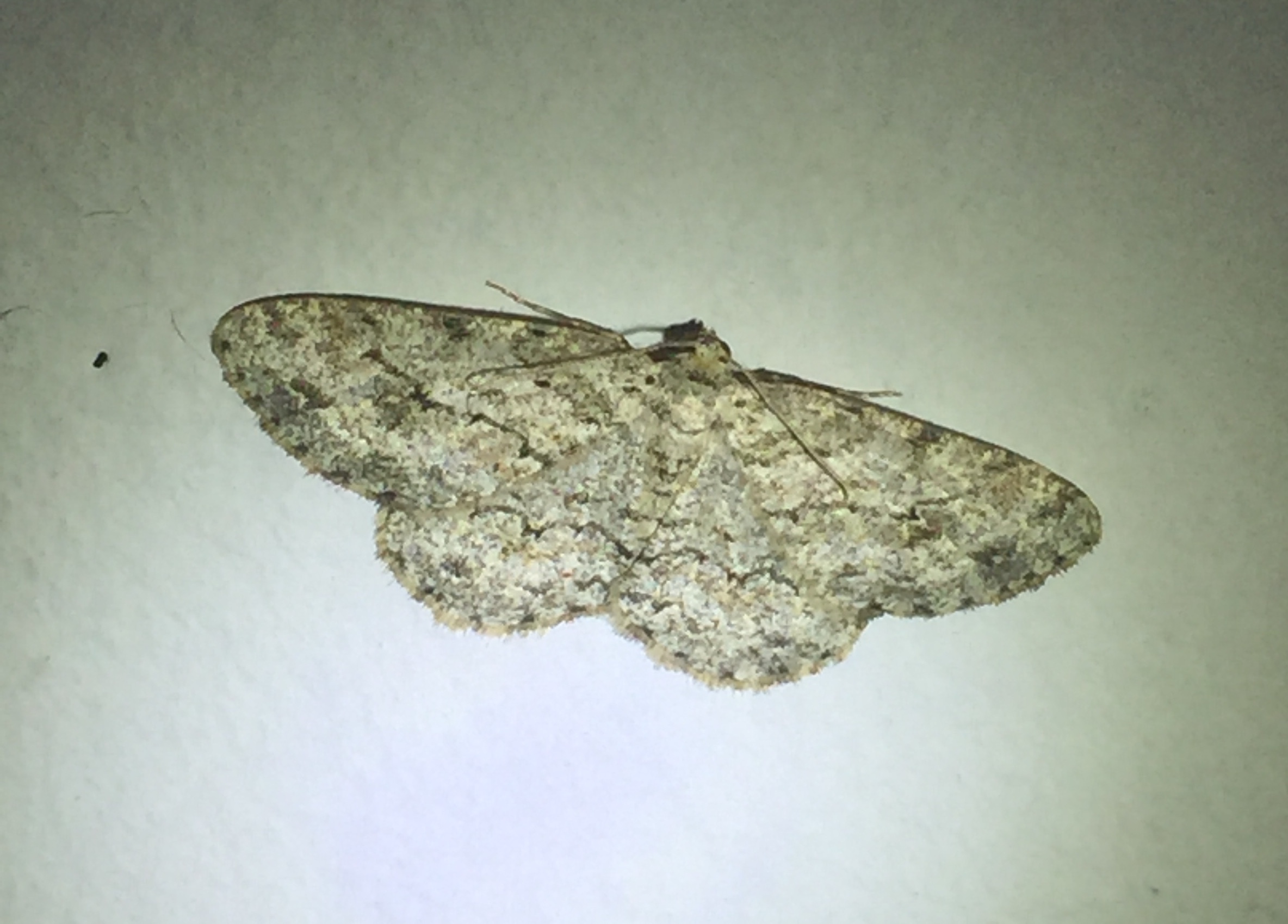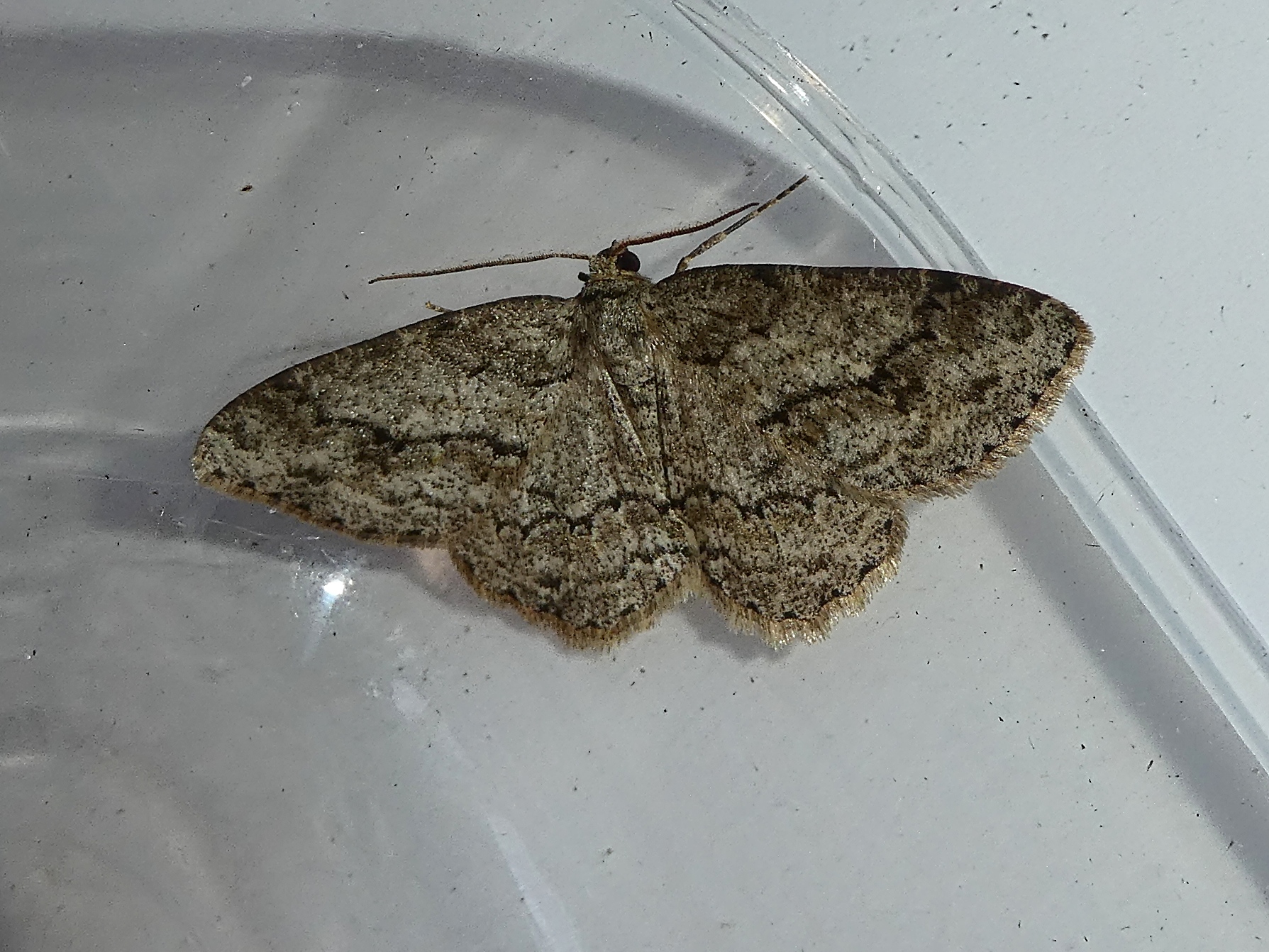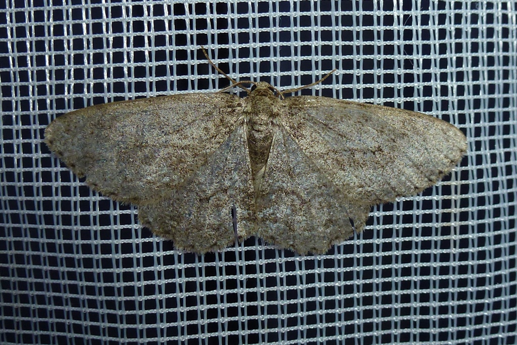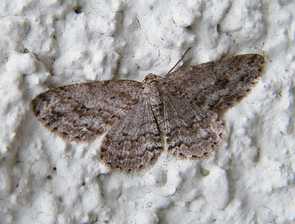 Ectropis crepuscularia (Denis & Schiffermüller, 1775), Chemnitz: Zeisigwald//Planitzwiese, 11.4.2018, seit Tagen frühsommerliche Temperaturen, passiver Lichtfang an hellem Gebäude, natürliche Farbe grau-grün