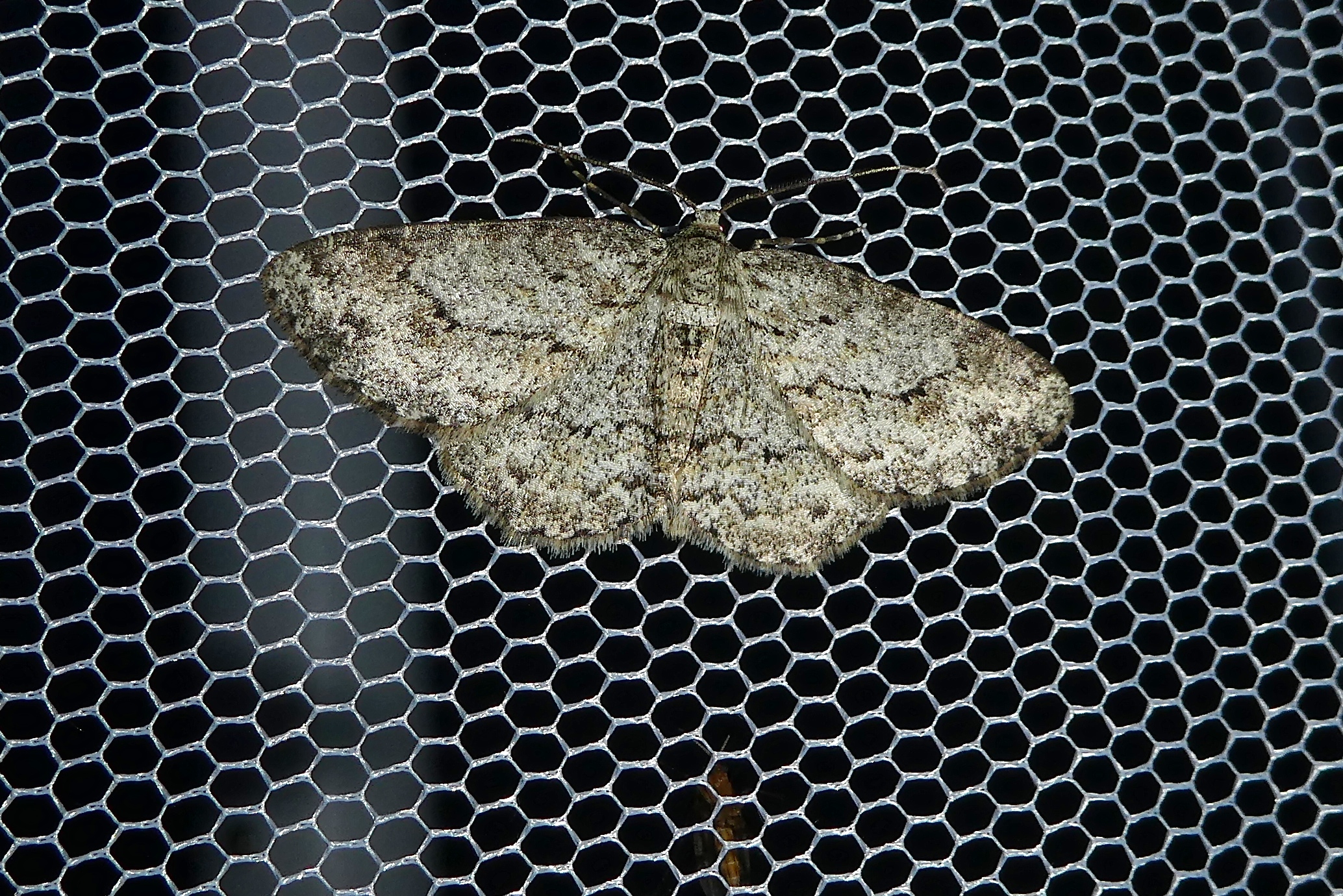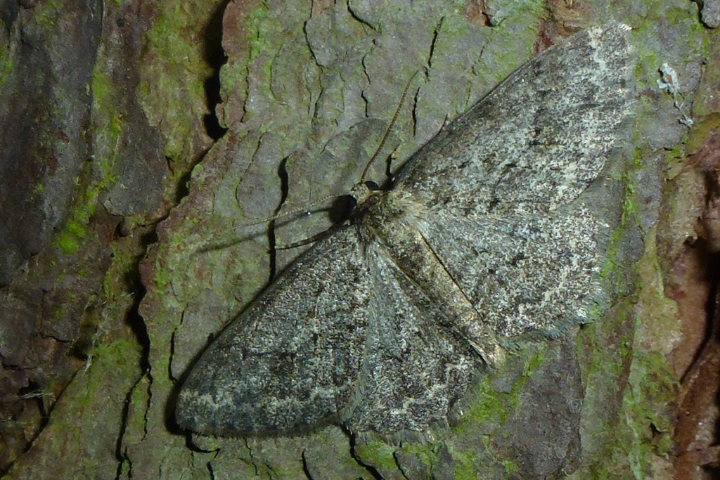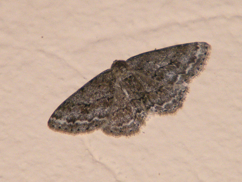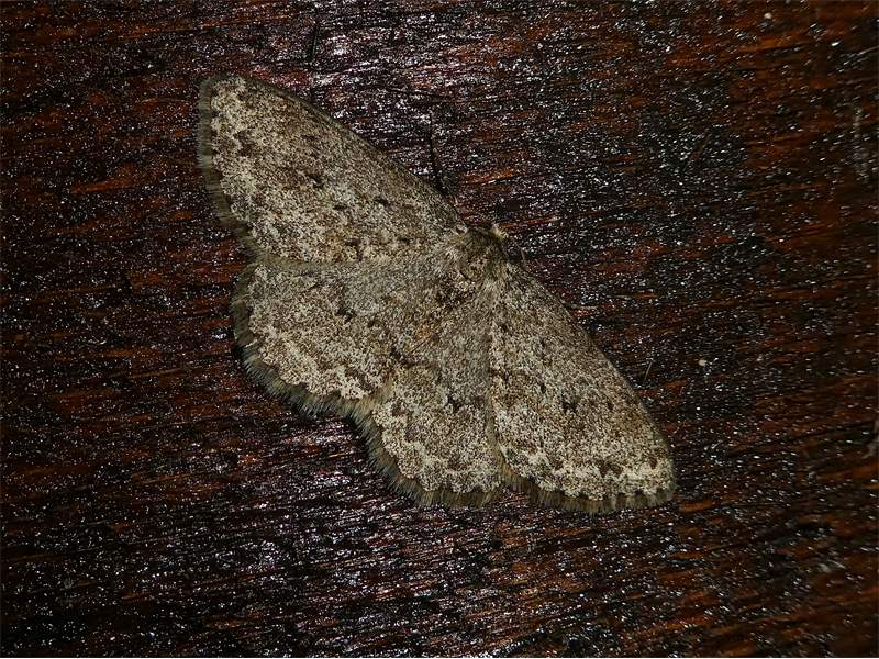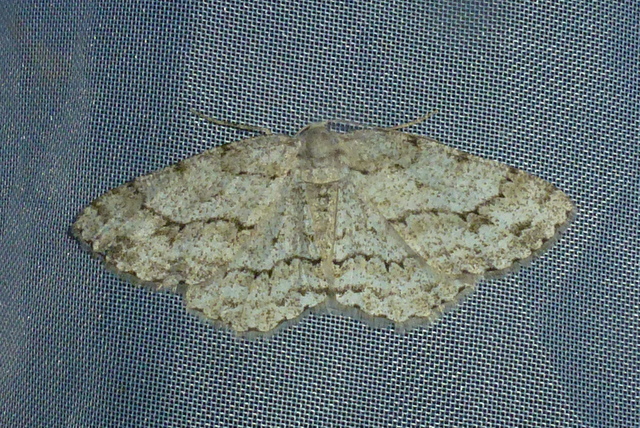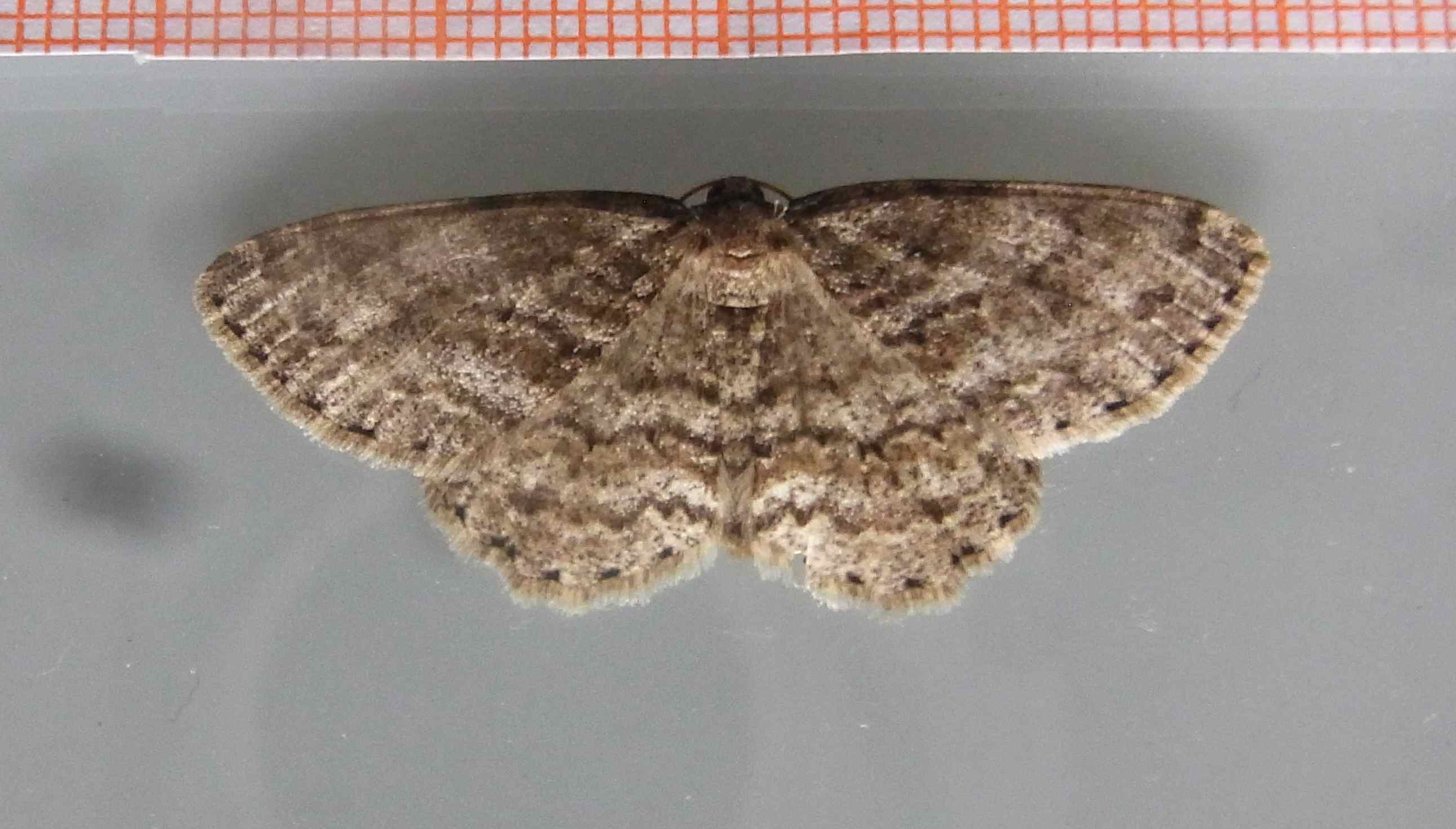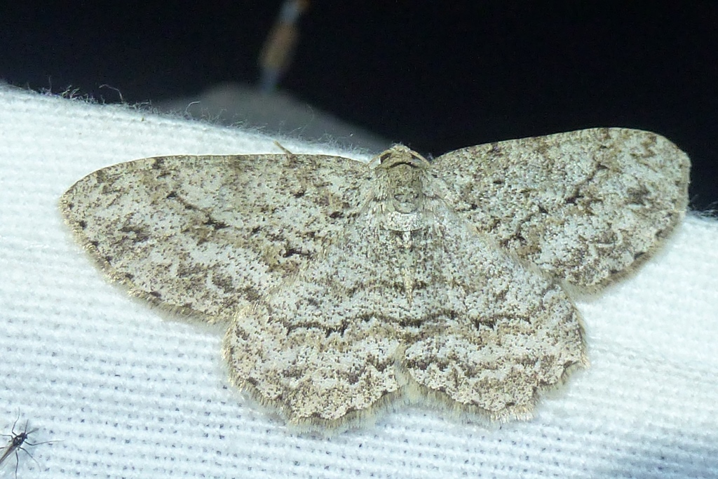Ectropis crepuscularia (Denis & Schiffermüller, 1775), Chemnitz: Zeisigwald//Planitzwiese, 11.4.2018, seit Tagen frühsommerliche Temperaturen, passiver Lichtfang an hellem Gebäude, natürliche Farbe grau-grün