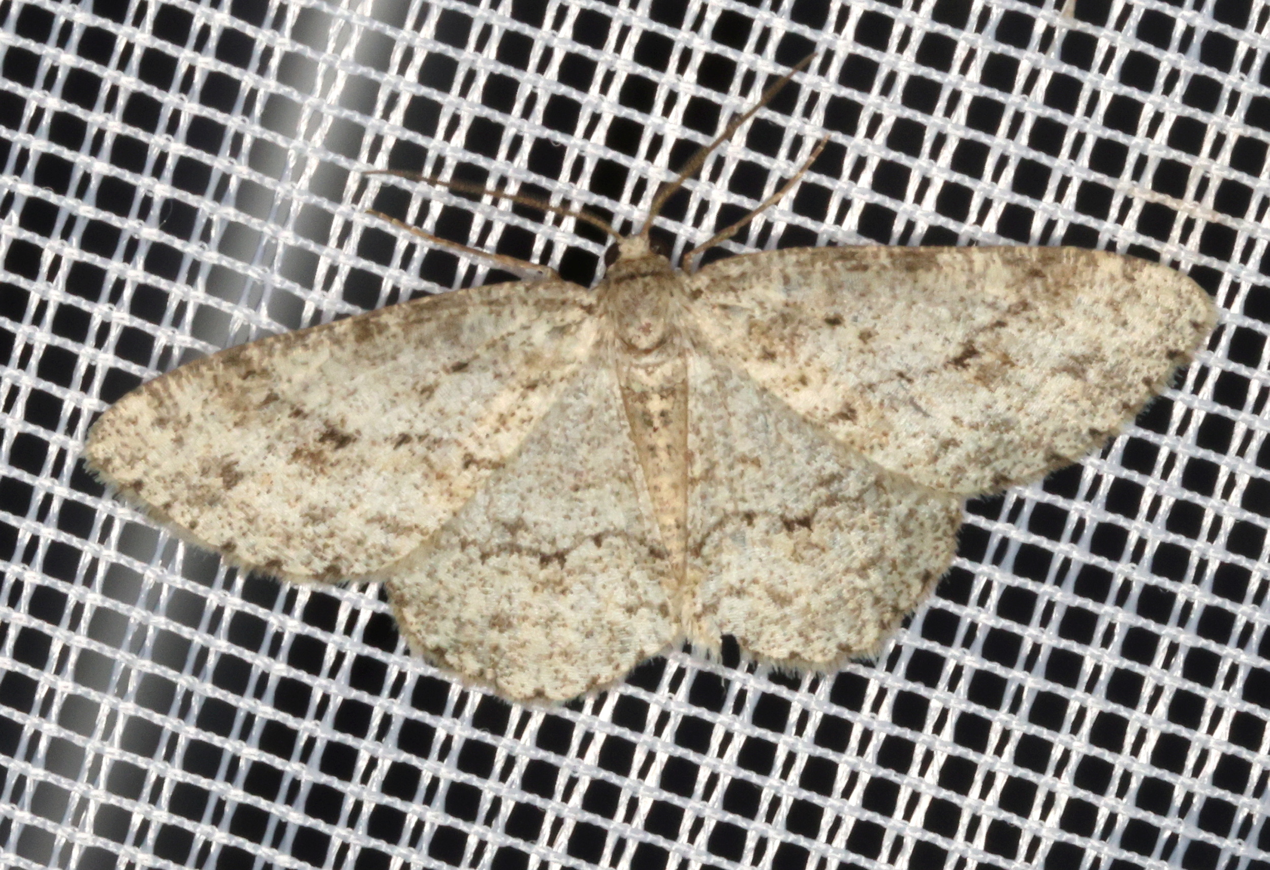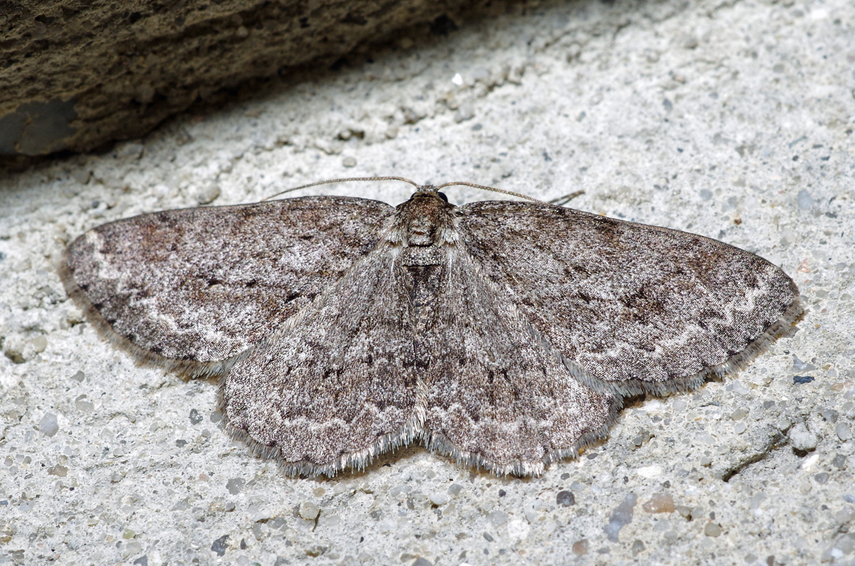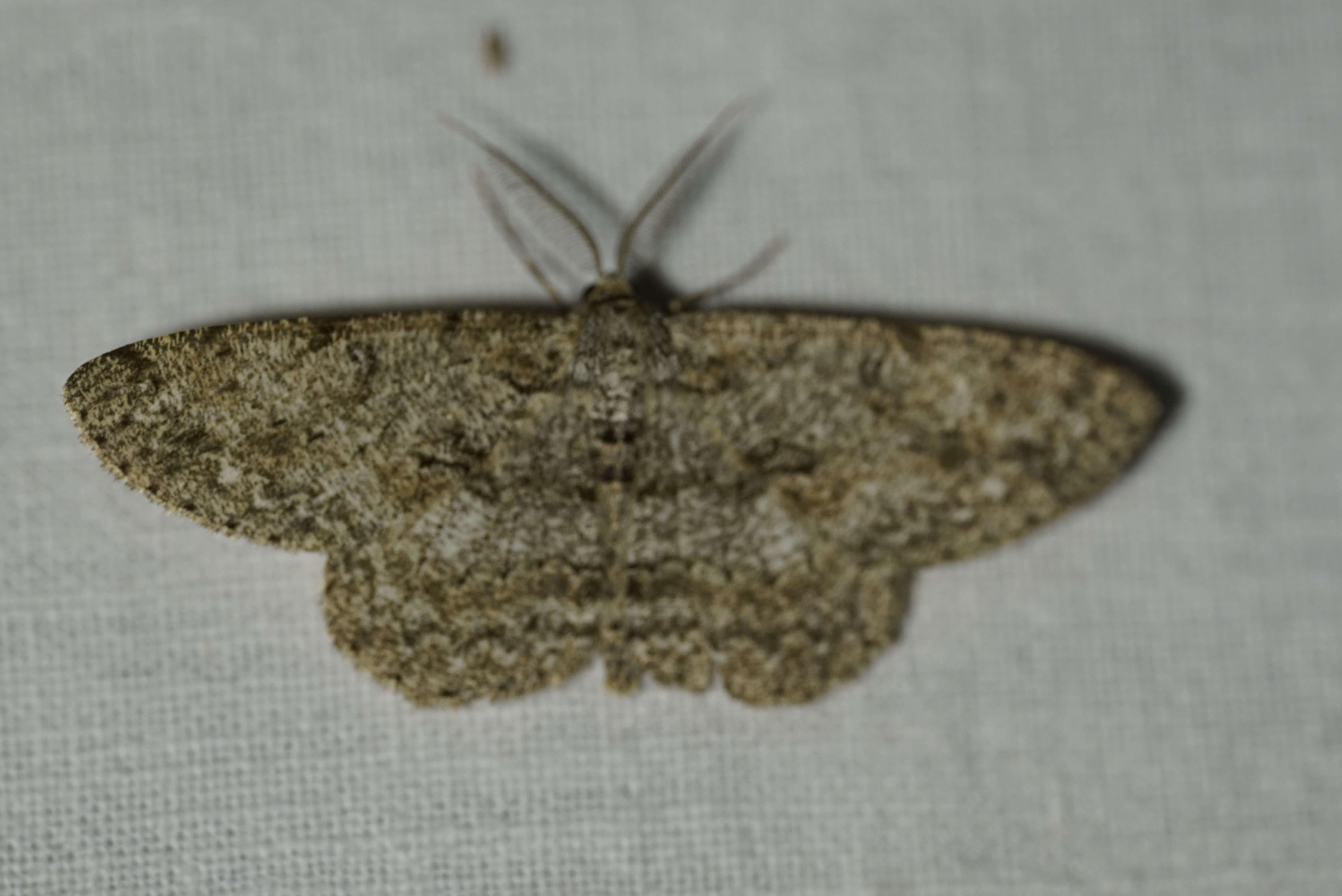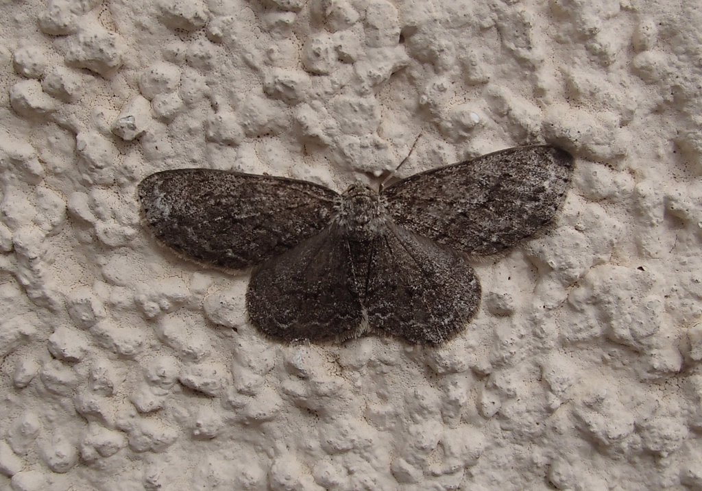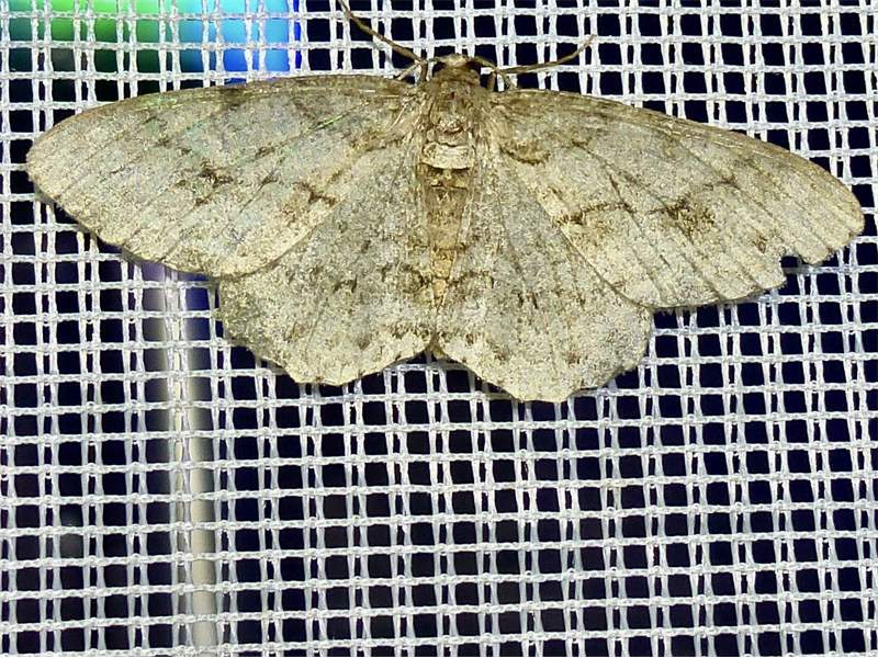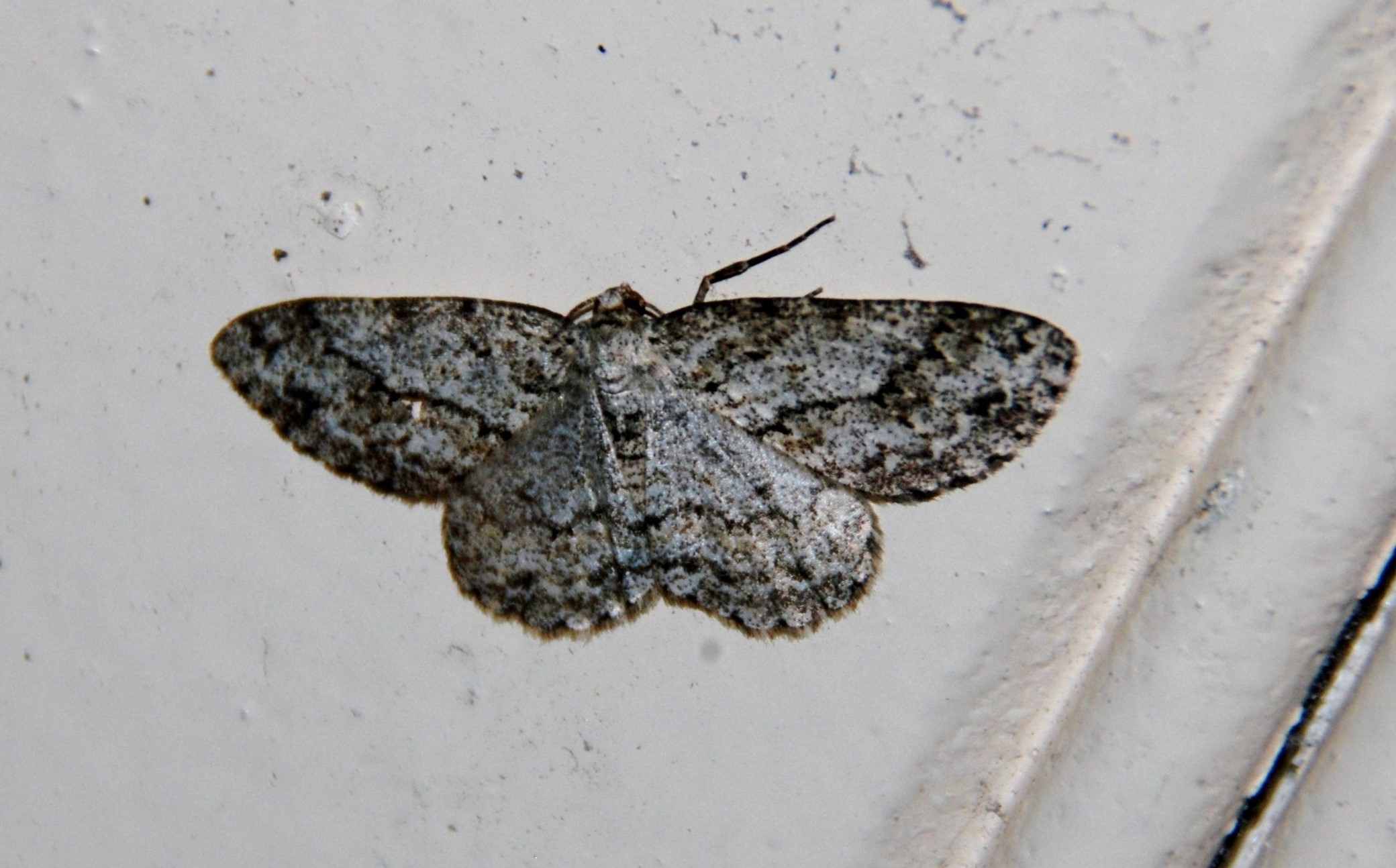 Ectropis crepuscularia (Denis & Schiffermüller, 1775), Chemnitz: Zeisigwald//Planitzwiese, 11.4.2018, seit Tagen frühsommerliche Temperaturen, passiver Lichtfang an hellem Gebäude, natürliche Farbe grau-grün