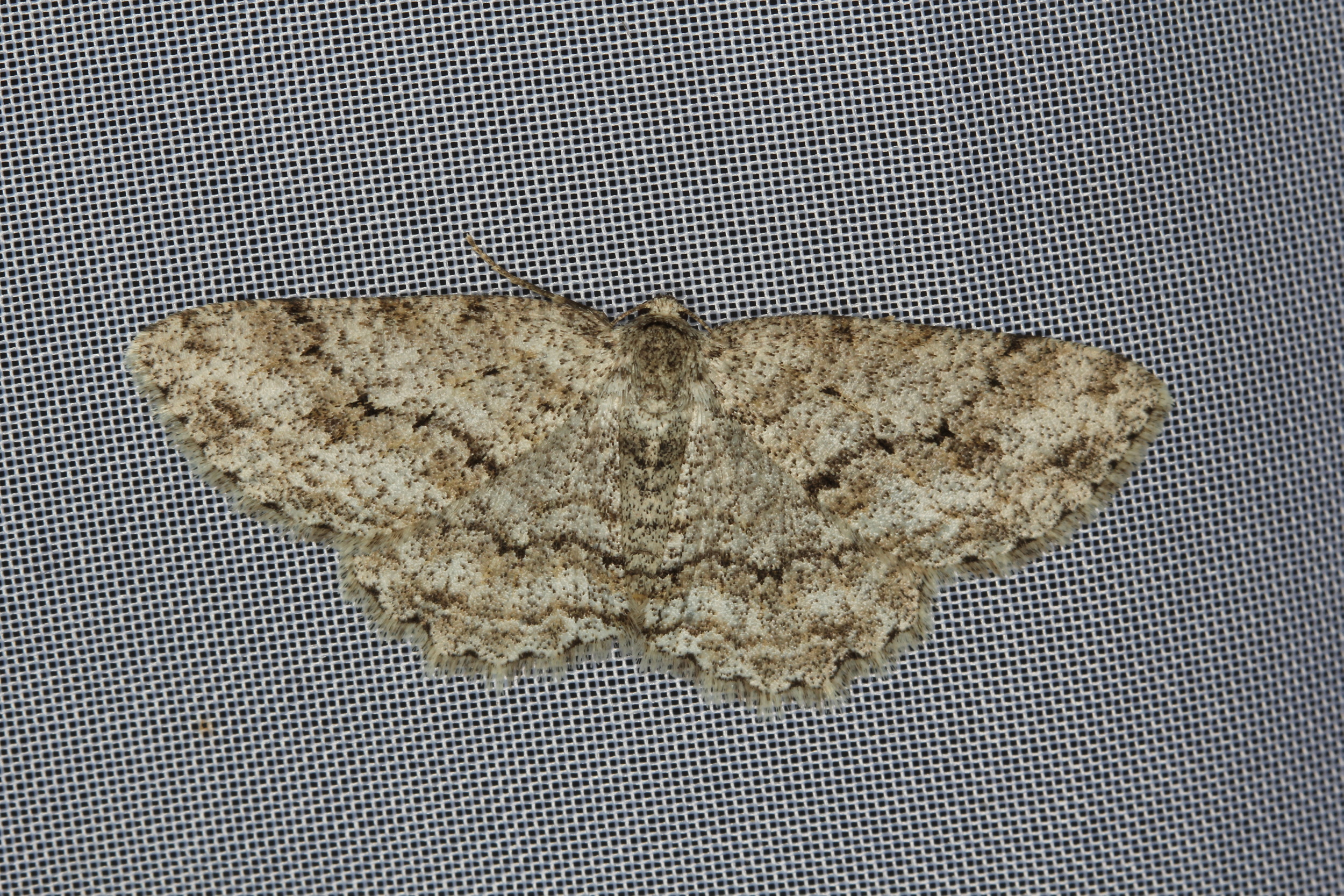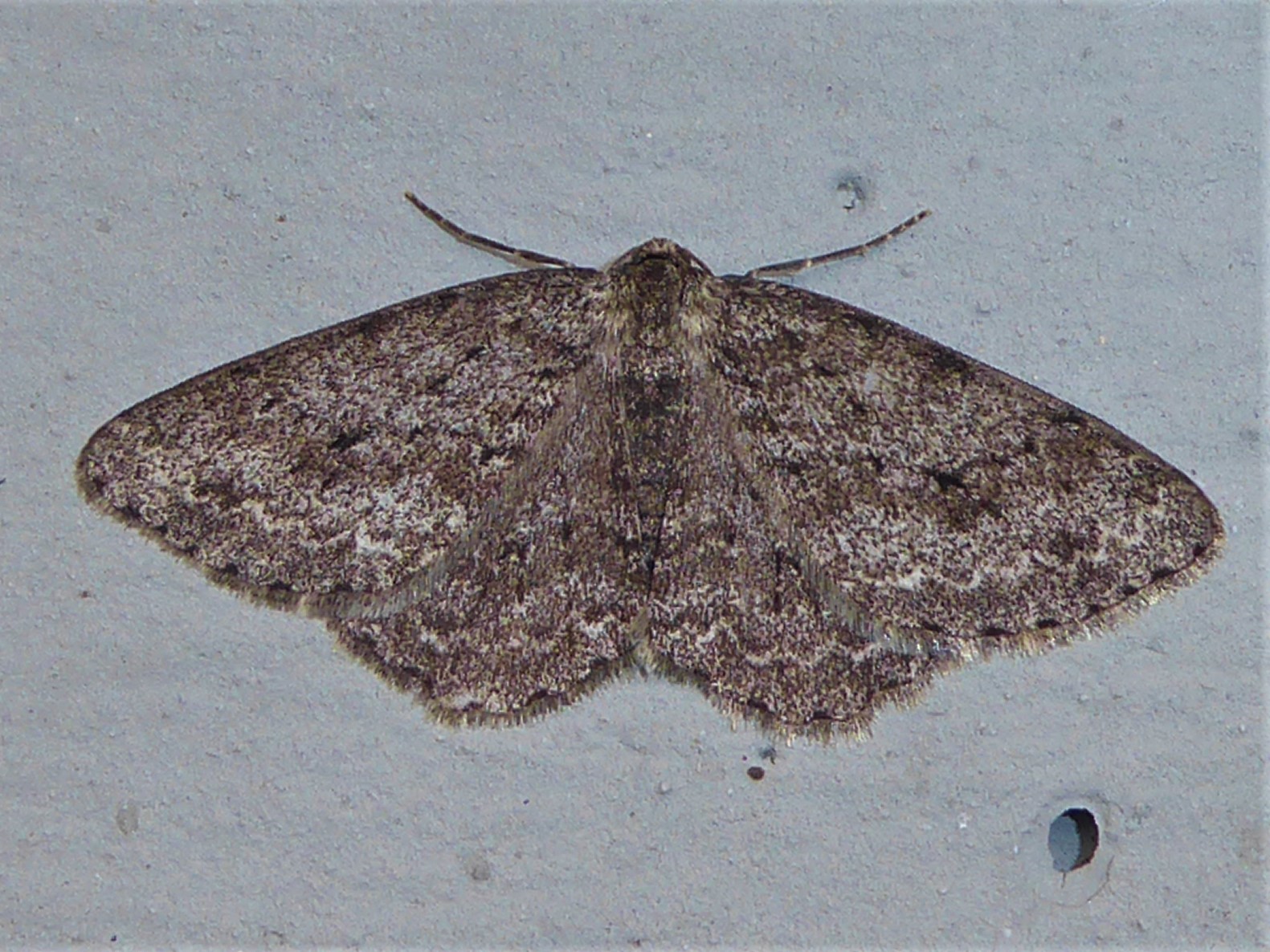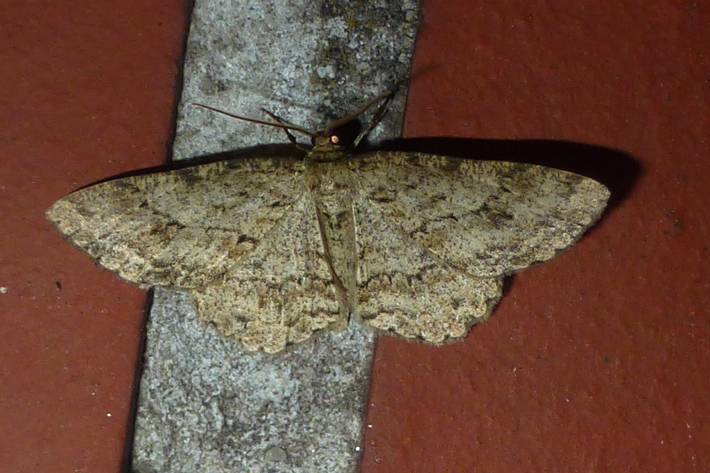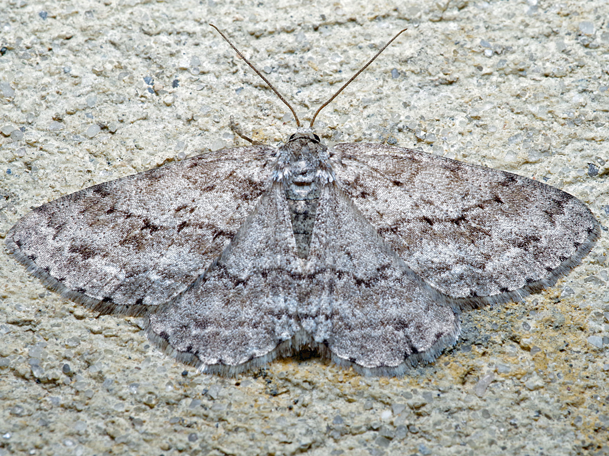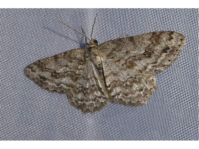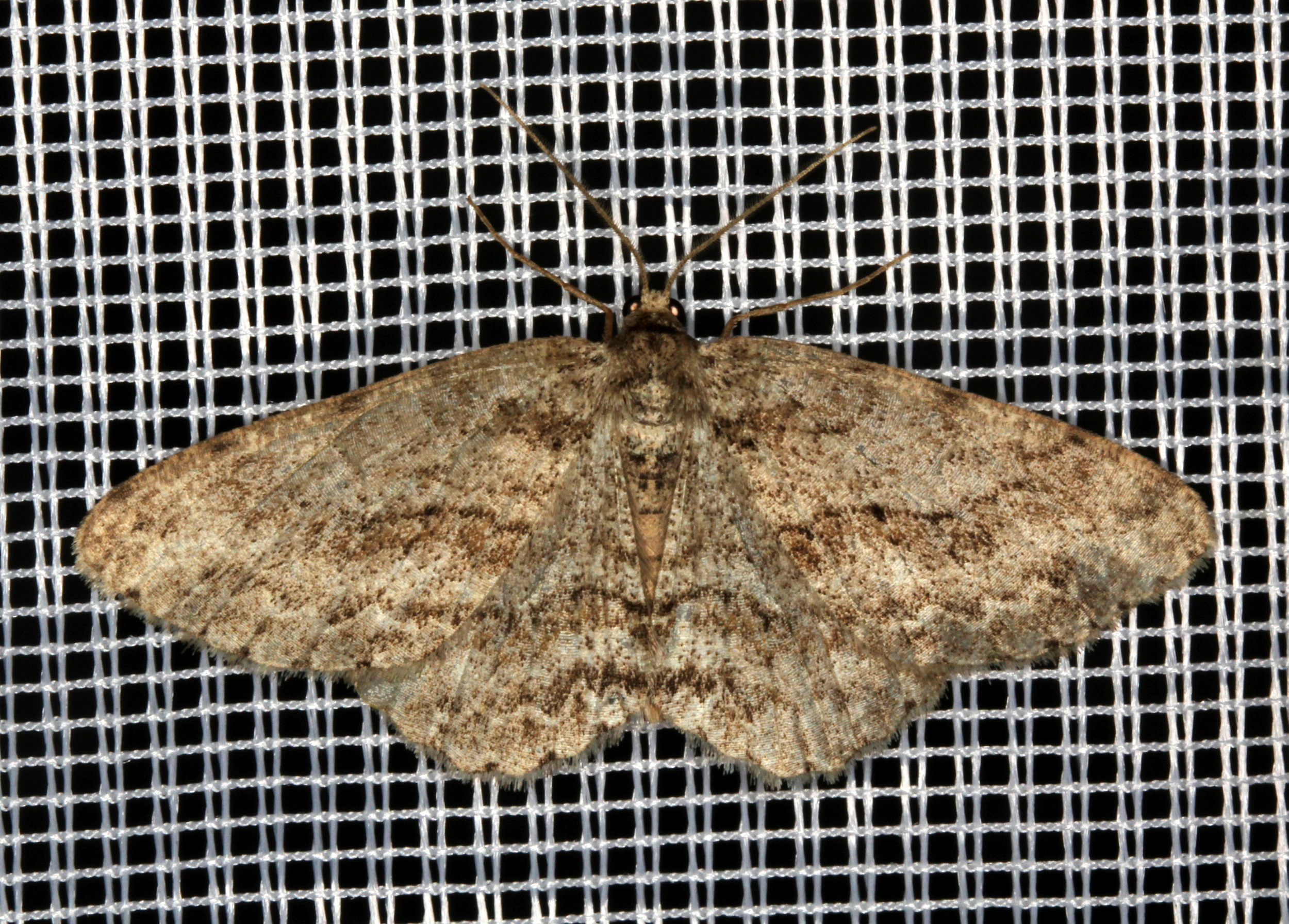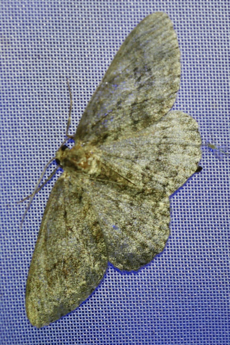 Ectropis crepuscularia (Denis & Schiffermüller, 1775), Chemnitz: Zeisigwald//Planitzwiese, 11.4.2018, seit Tagen frühsommerliche Temperaturen, passiver Lichtfang an hellem Gebäude, natürliche Farbe grau-grün