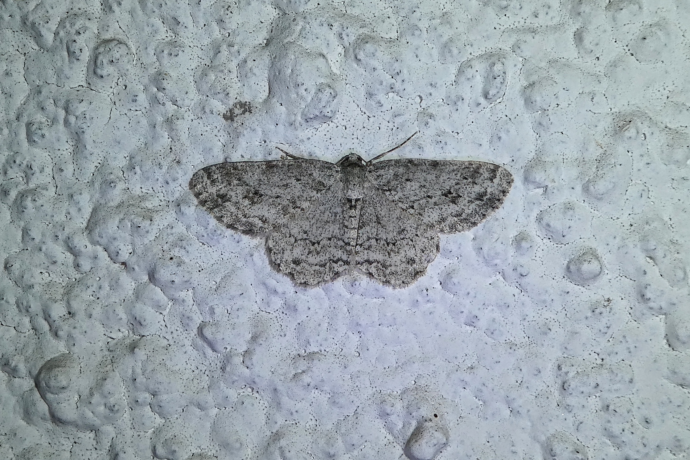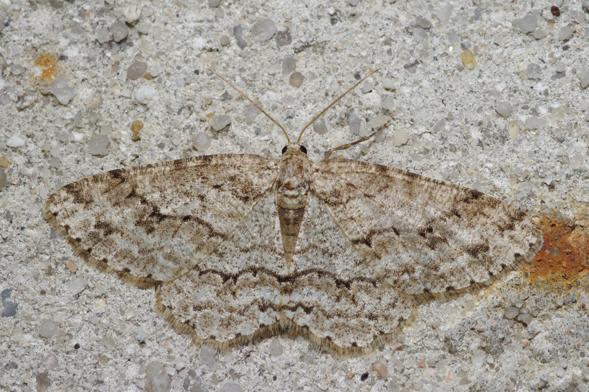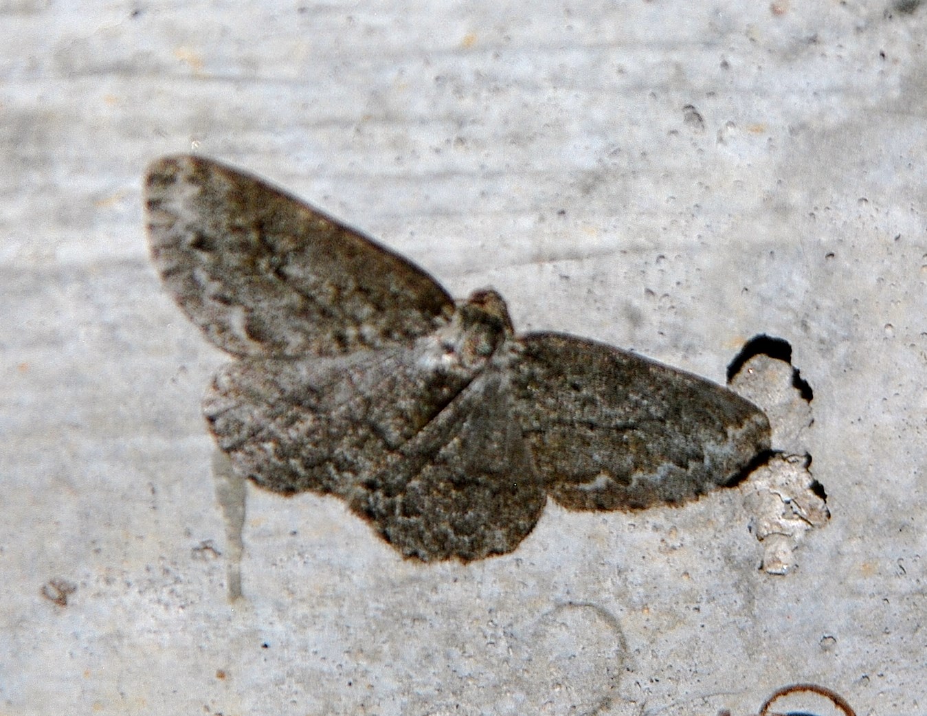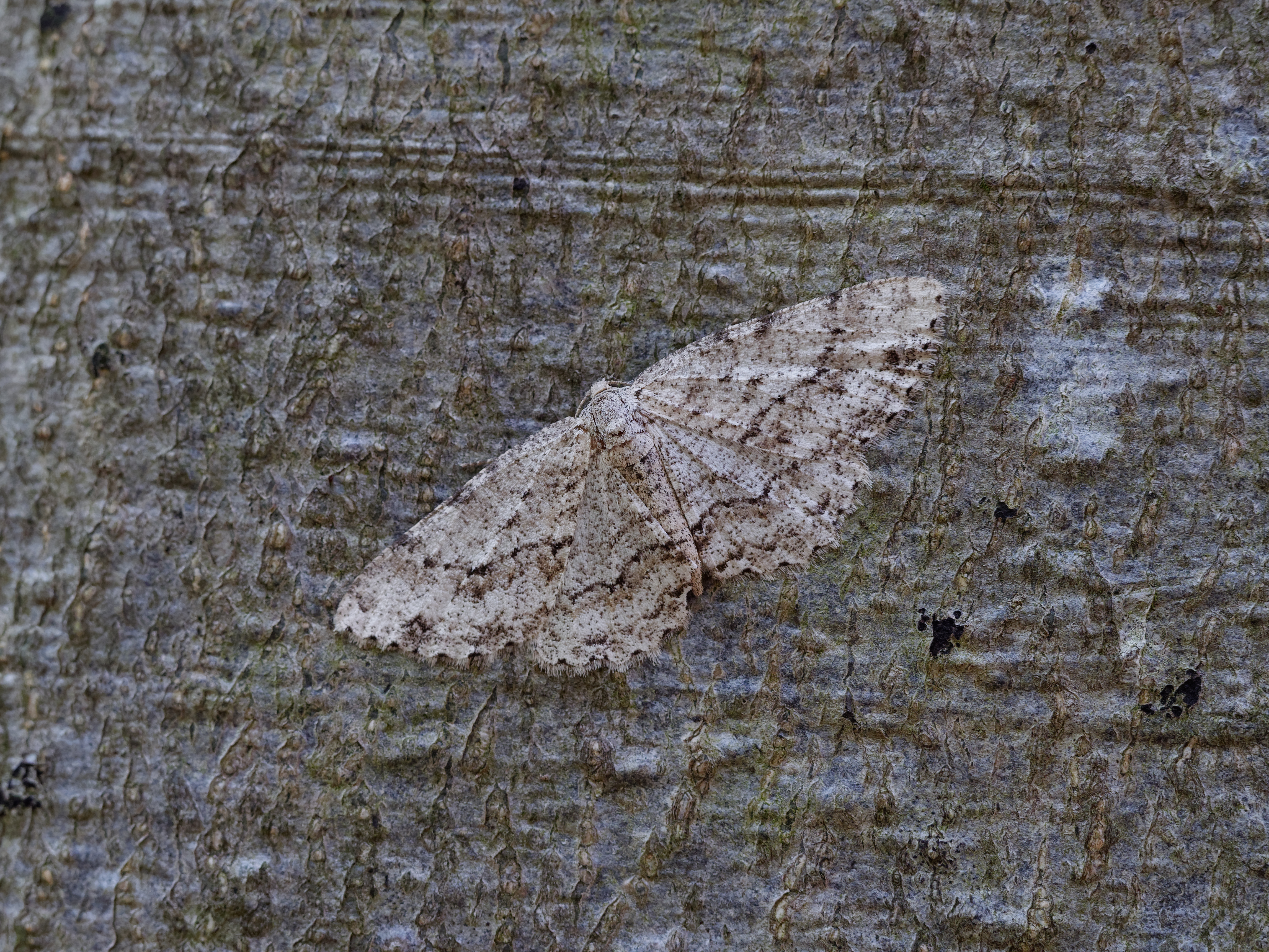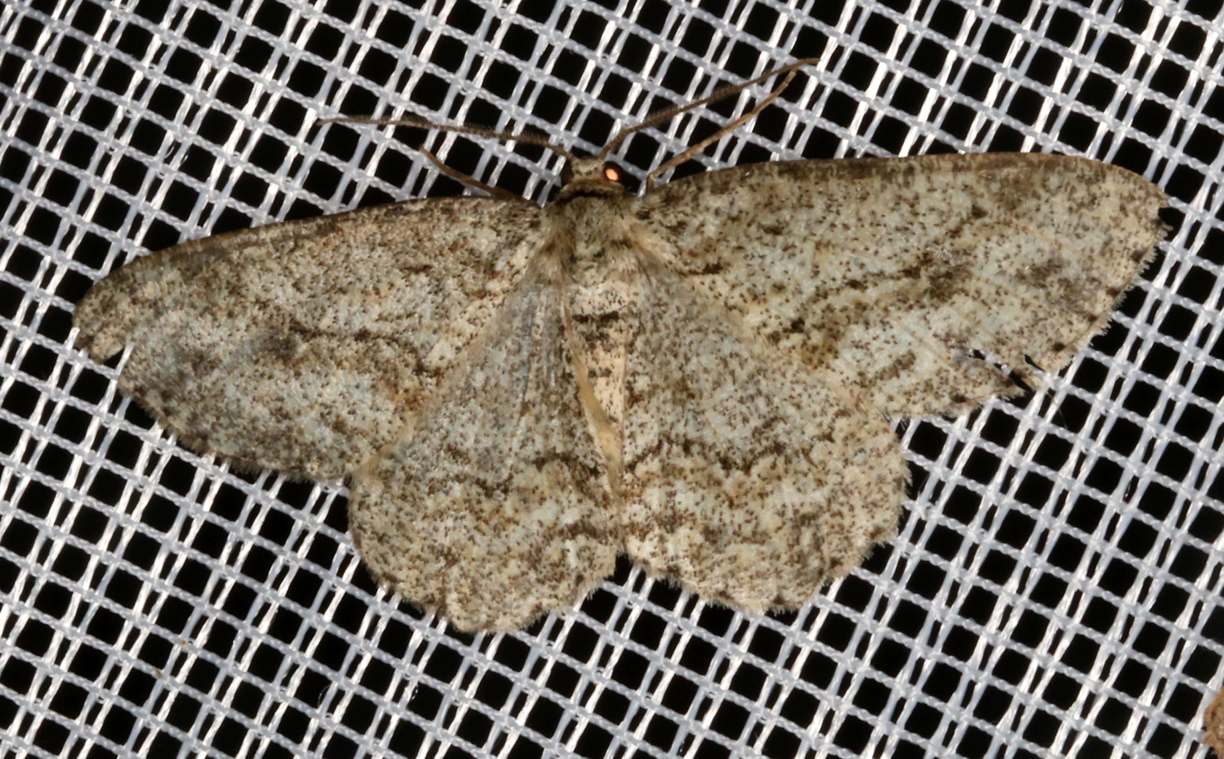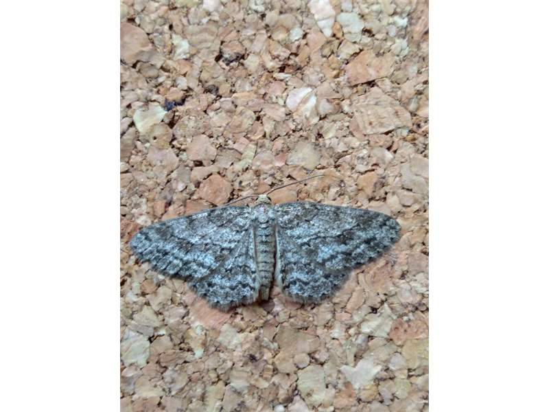 Ectropis crepuscularia (Denis & Schiffermüller, 1775), Chemnitz: Zeisigwald//Planitzwiese, 11.4.2018, seit Tagen frühsommerliche Temperaturen, passiver Lichtfang an hellem Gebäude, natürliche Farbe grau-grün