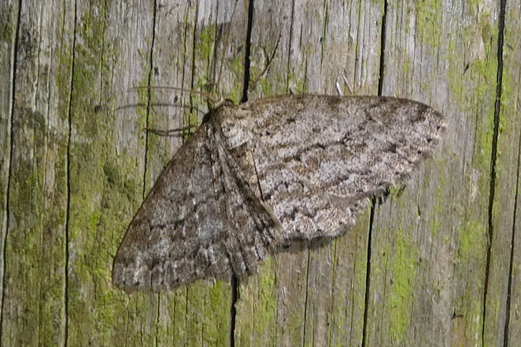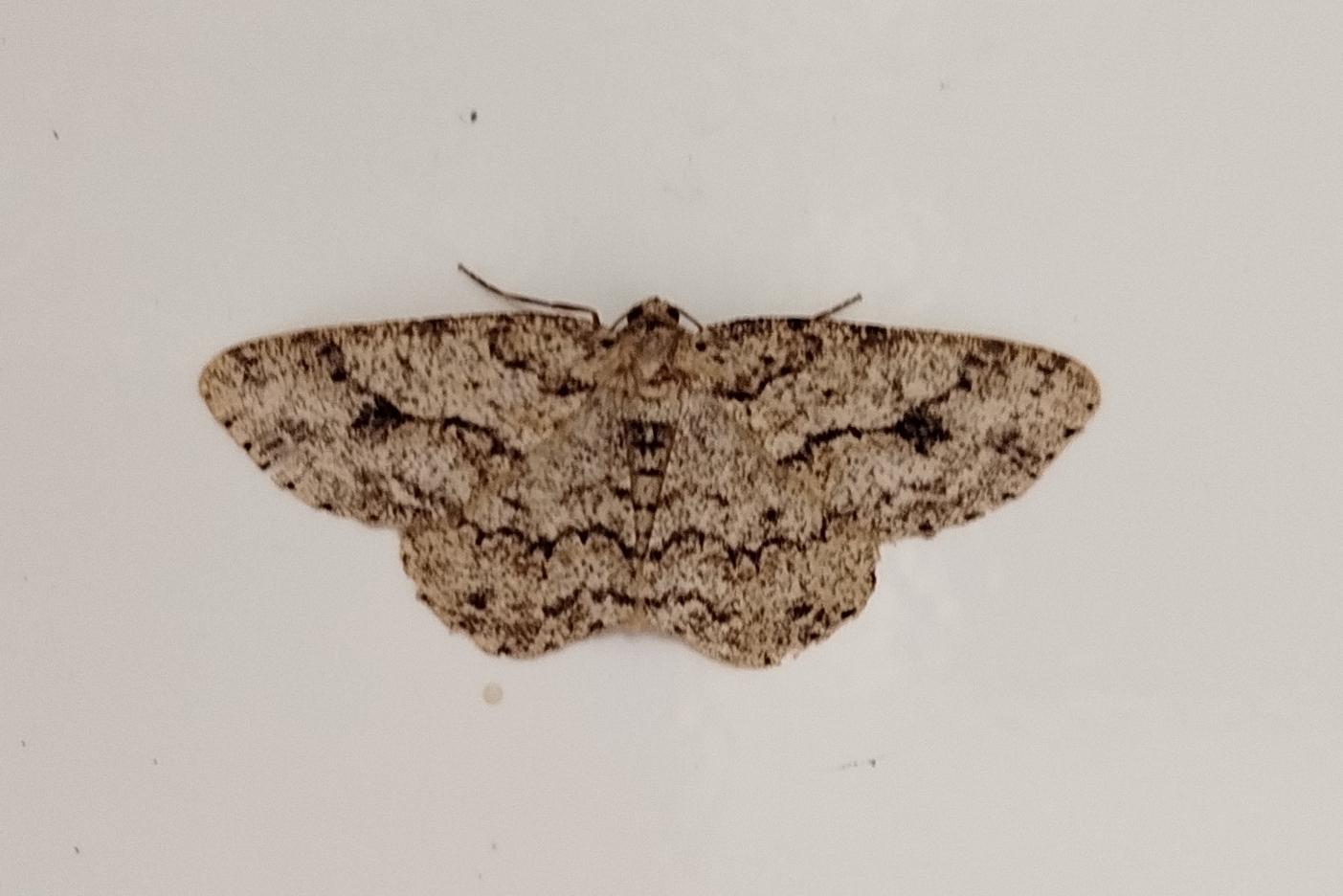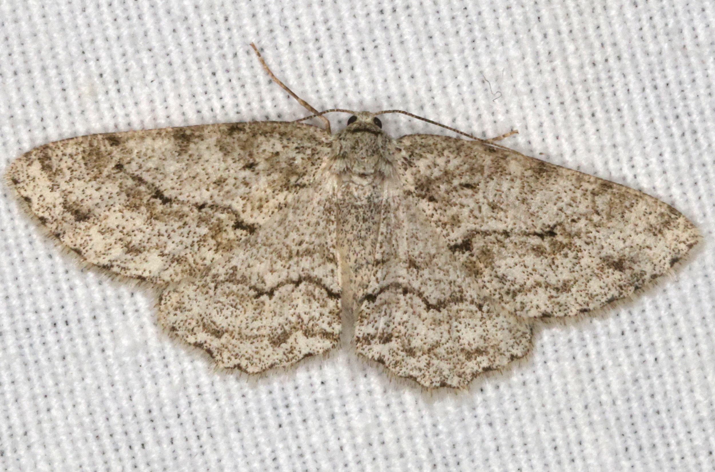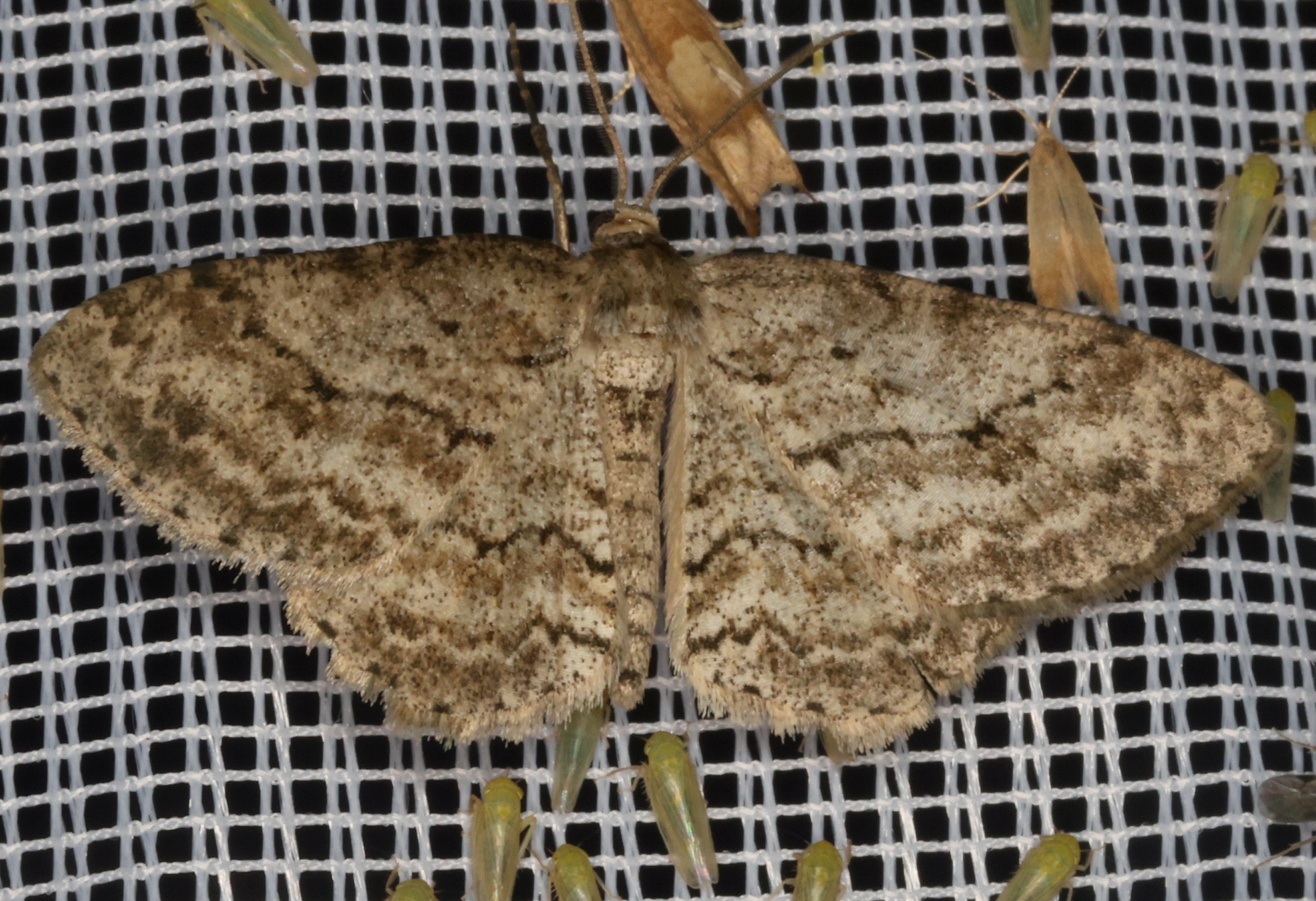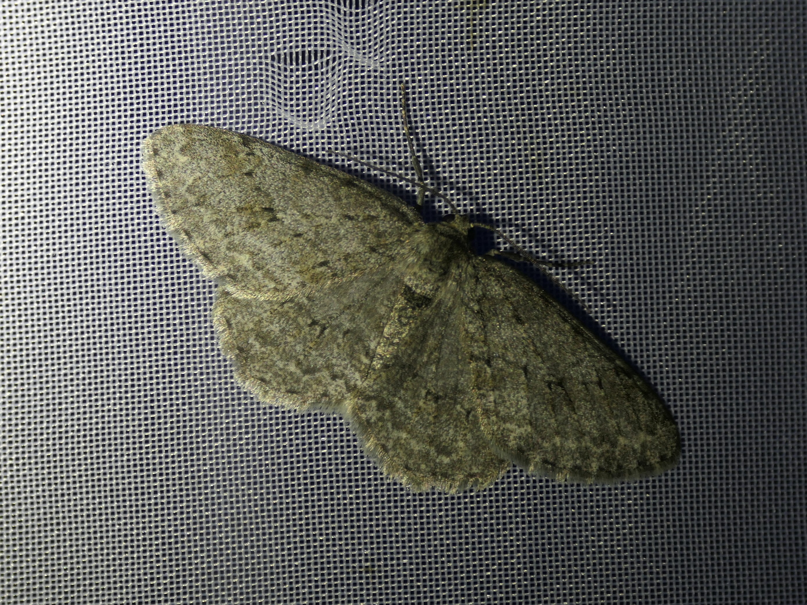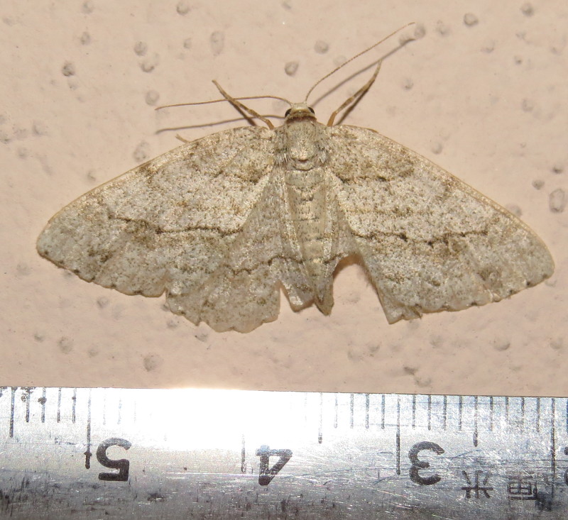 Ectropis crepuscularia (Denis & Schiffermüller, 1775), Chemnitz: Zeisigwald//Planitzwiese, 11.4.2018, seit Tagen frühsommerliche Temperaturen, passiver Lichtfang an hellem Gebäude, natürliche Farbe grau-grün