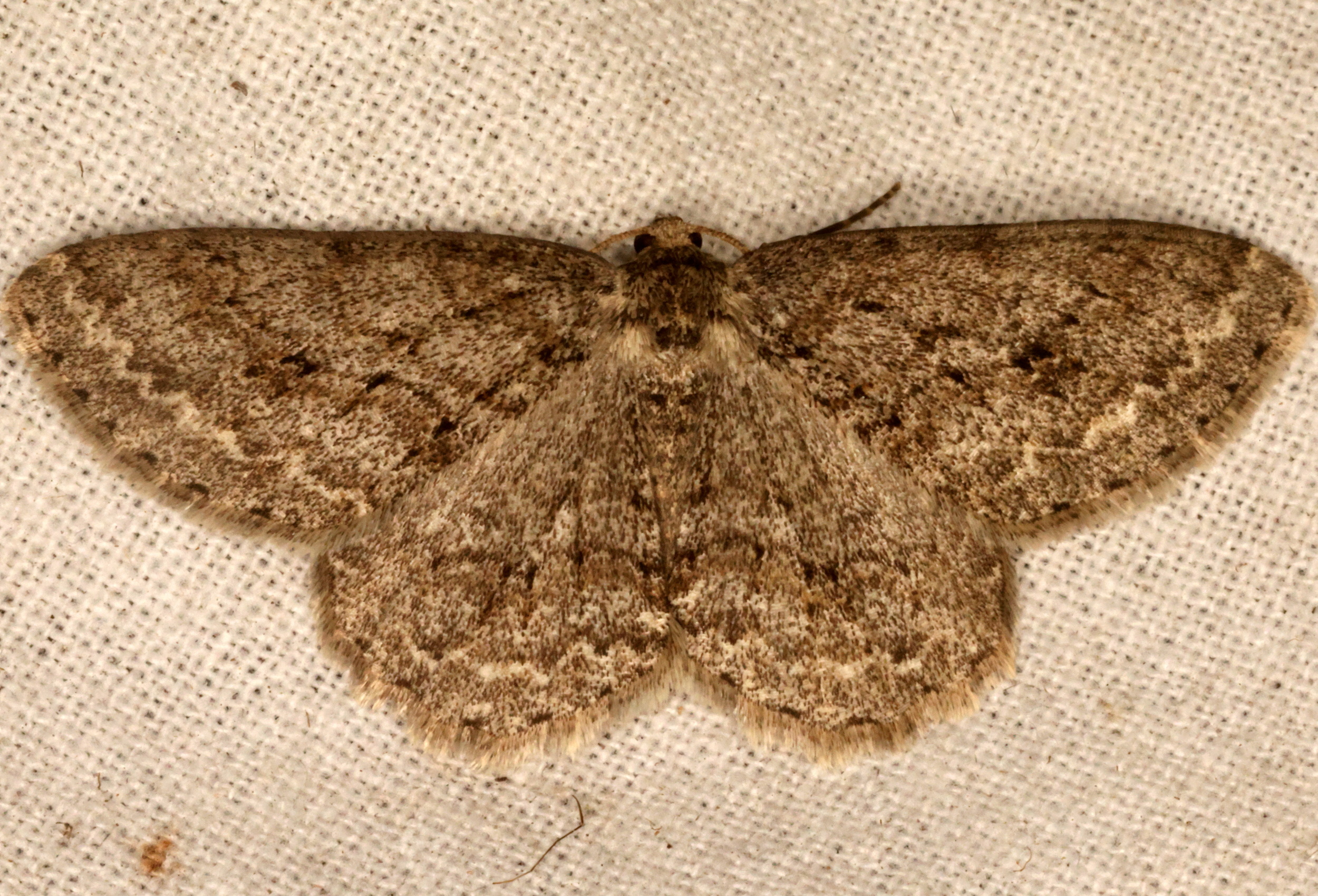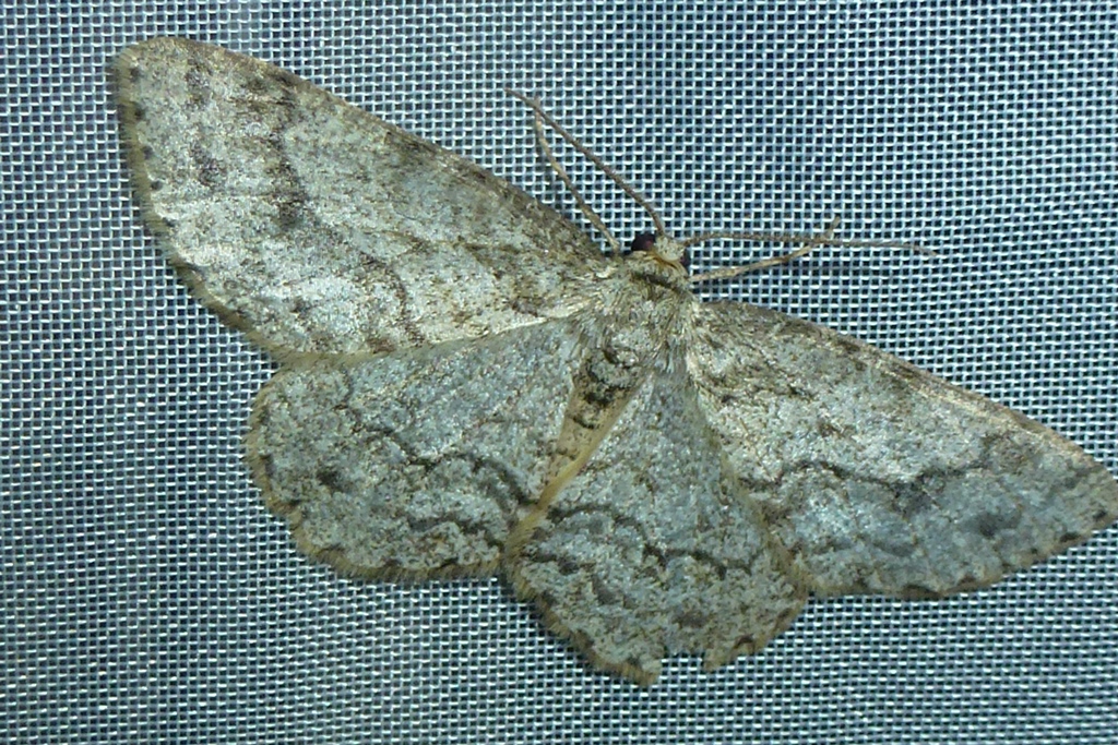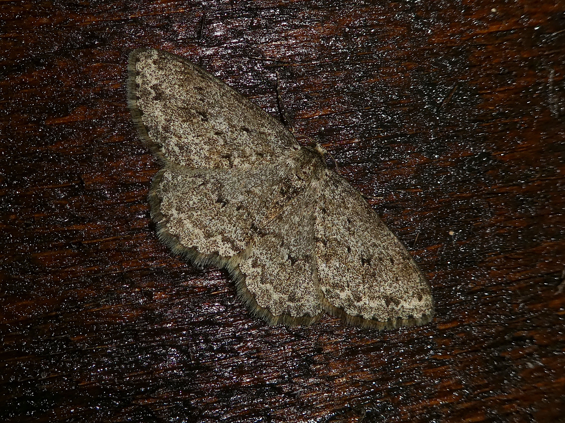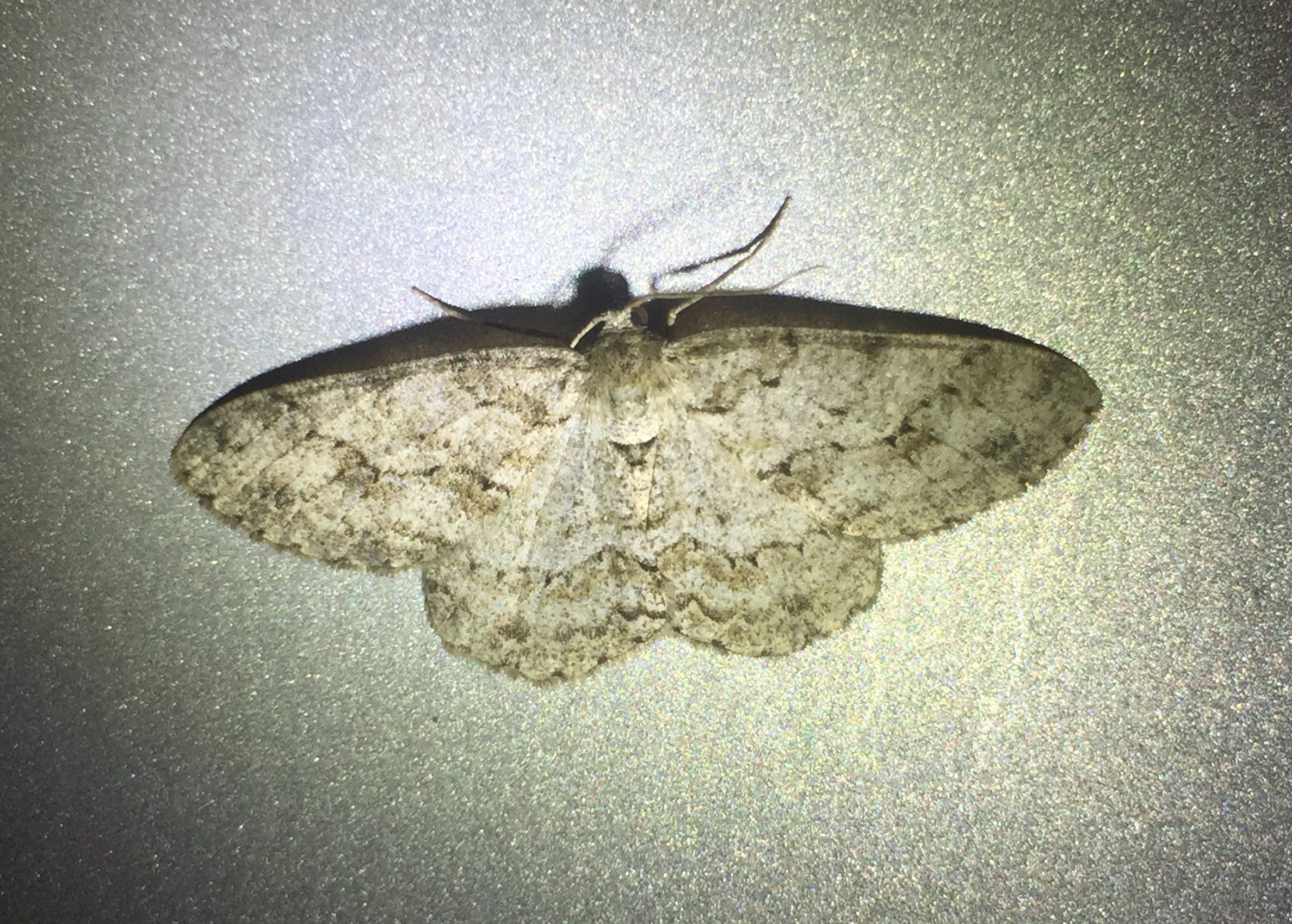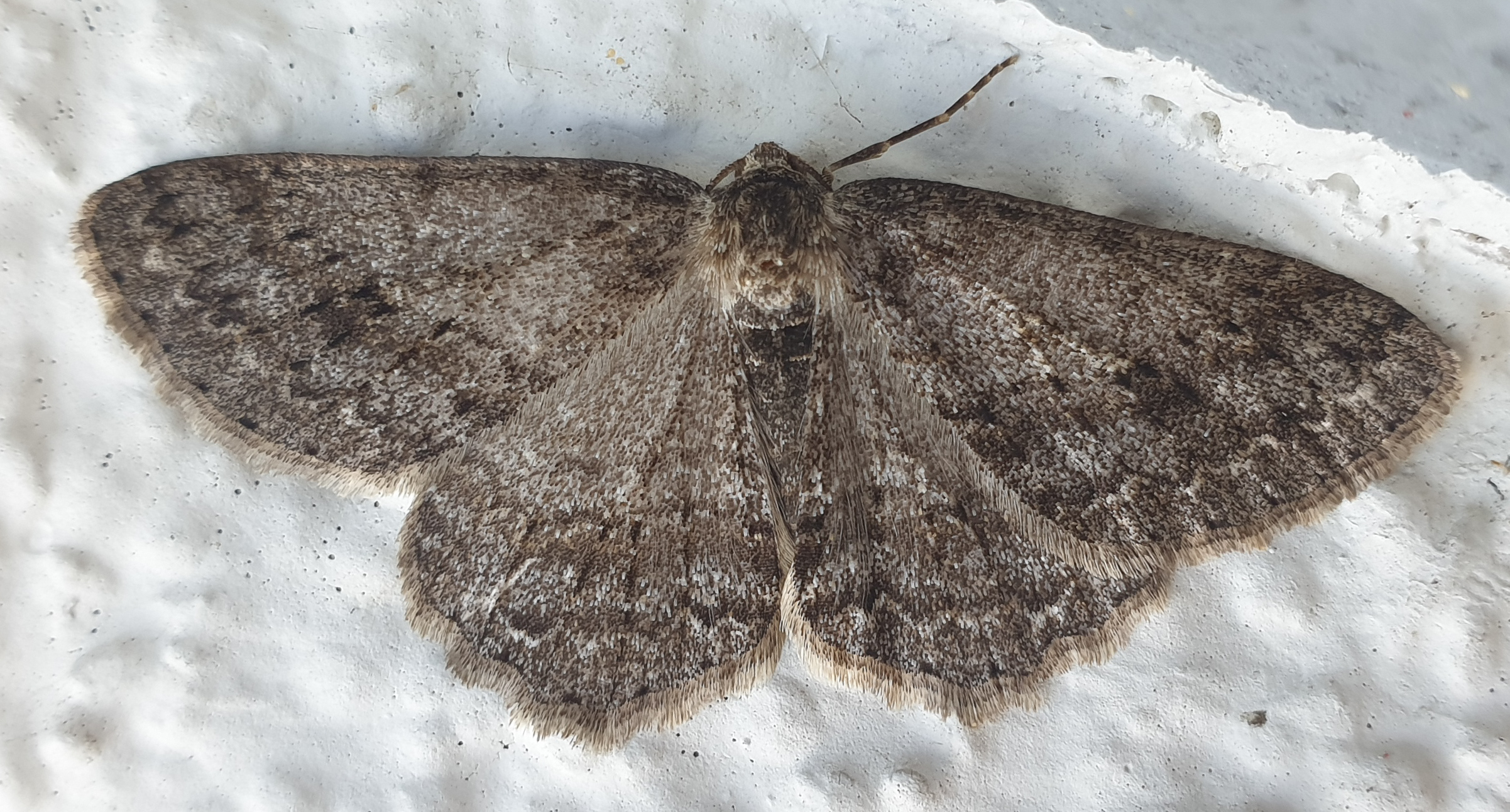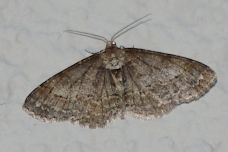 Ectropis crepuscularia (Denis & Schiffermüller, 1775), Chemnitz: Zeisigwald//Planitzwiese, 11.4.2018, seit Tagen frühsommerliche Temperaturen, passiver Lichtfang an hellem Gebäude, natürliche Farbe grau-grün