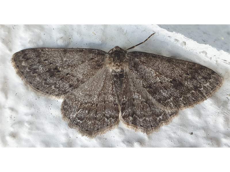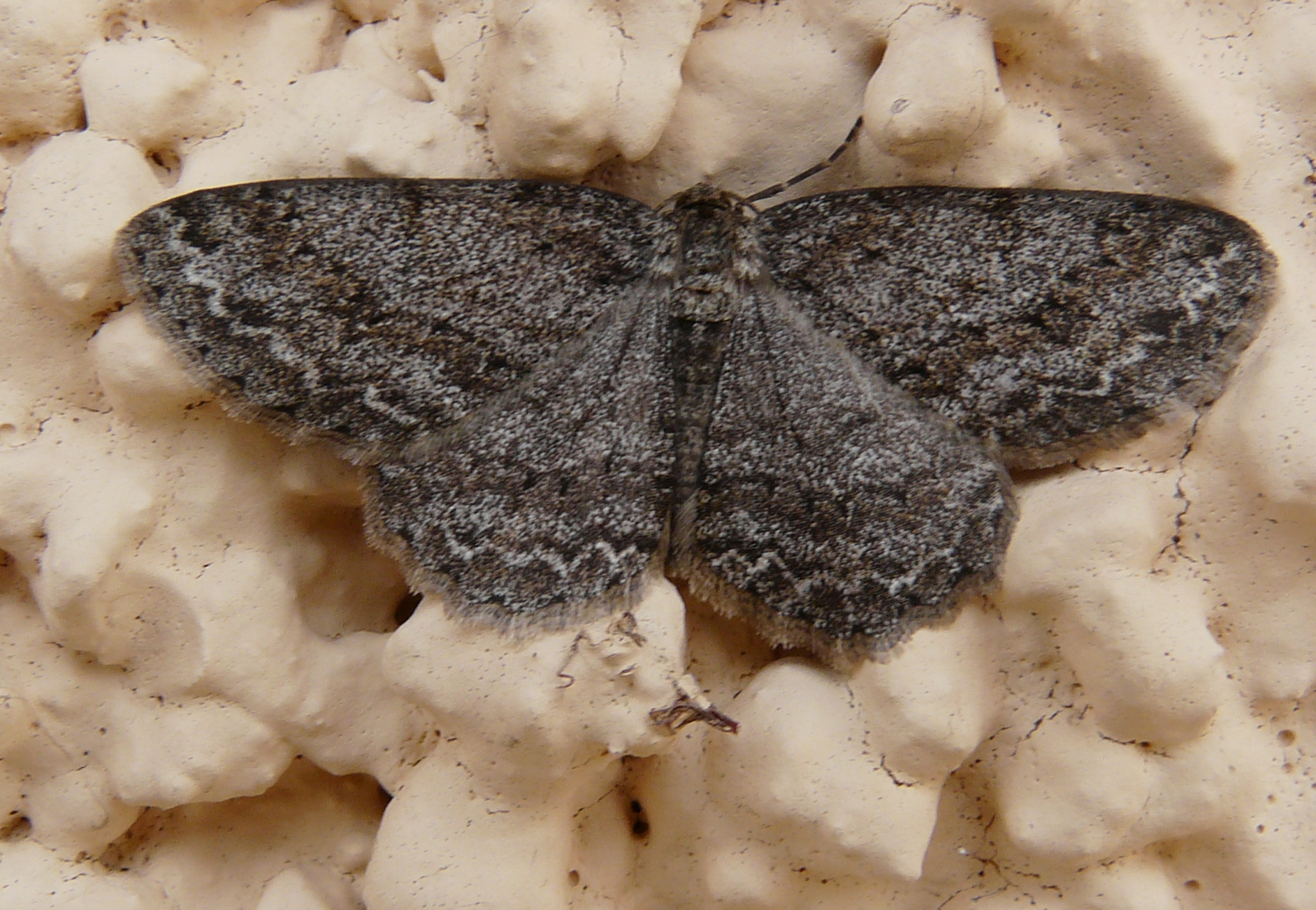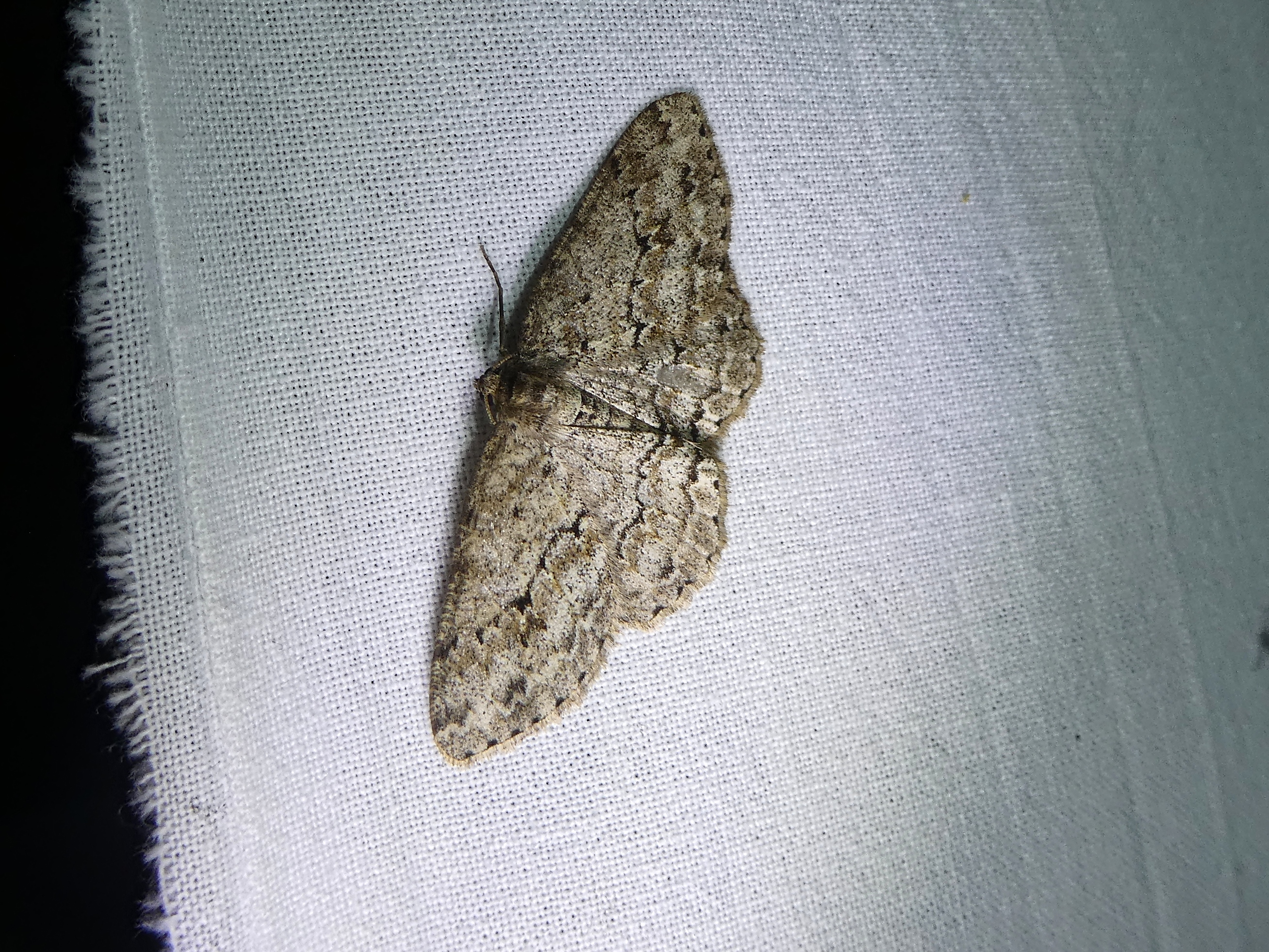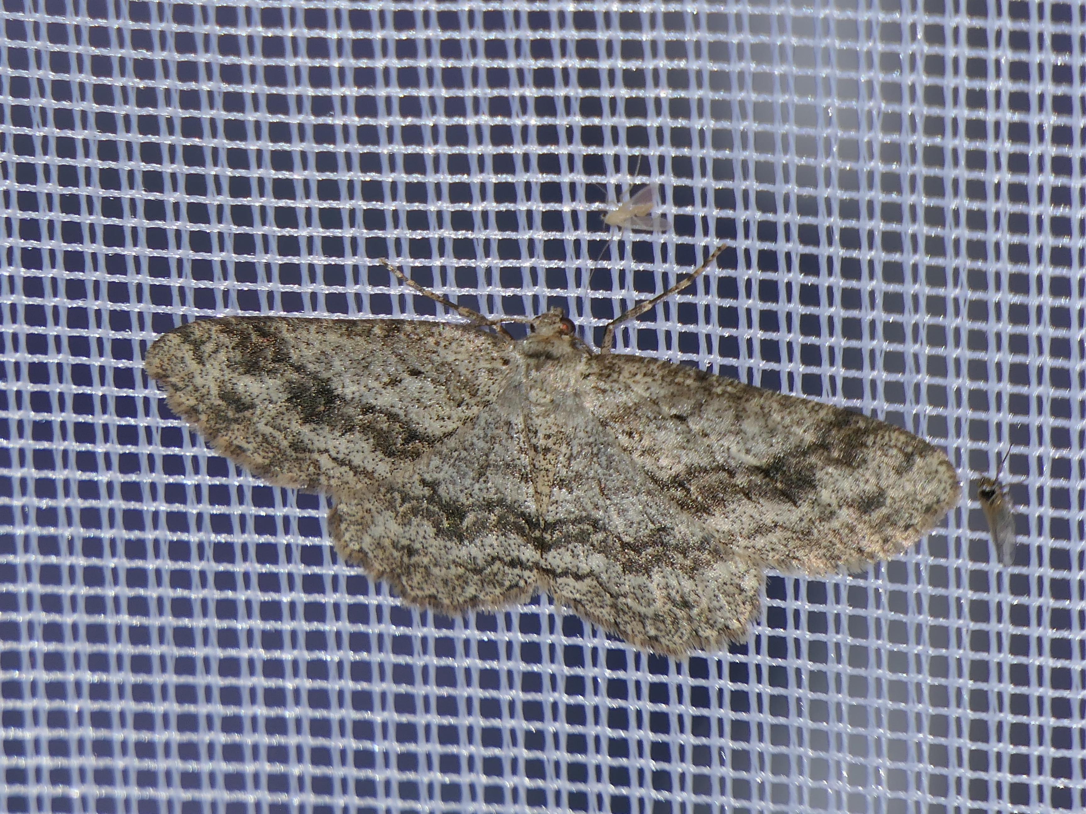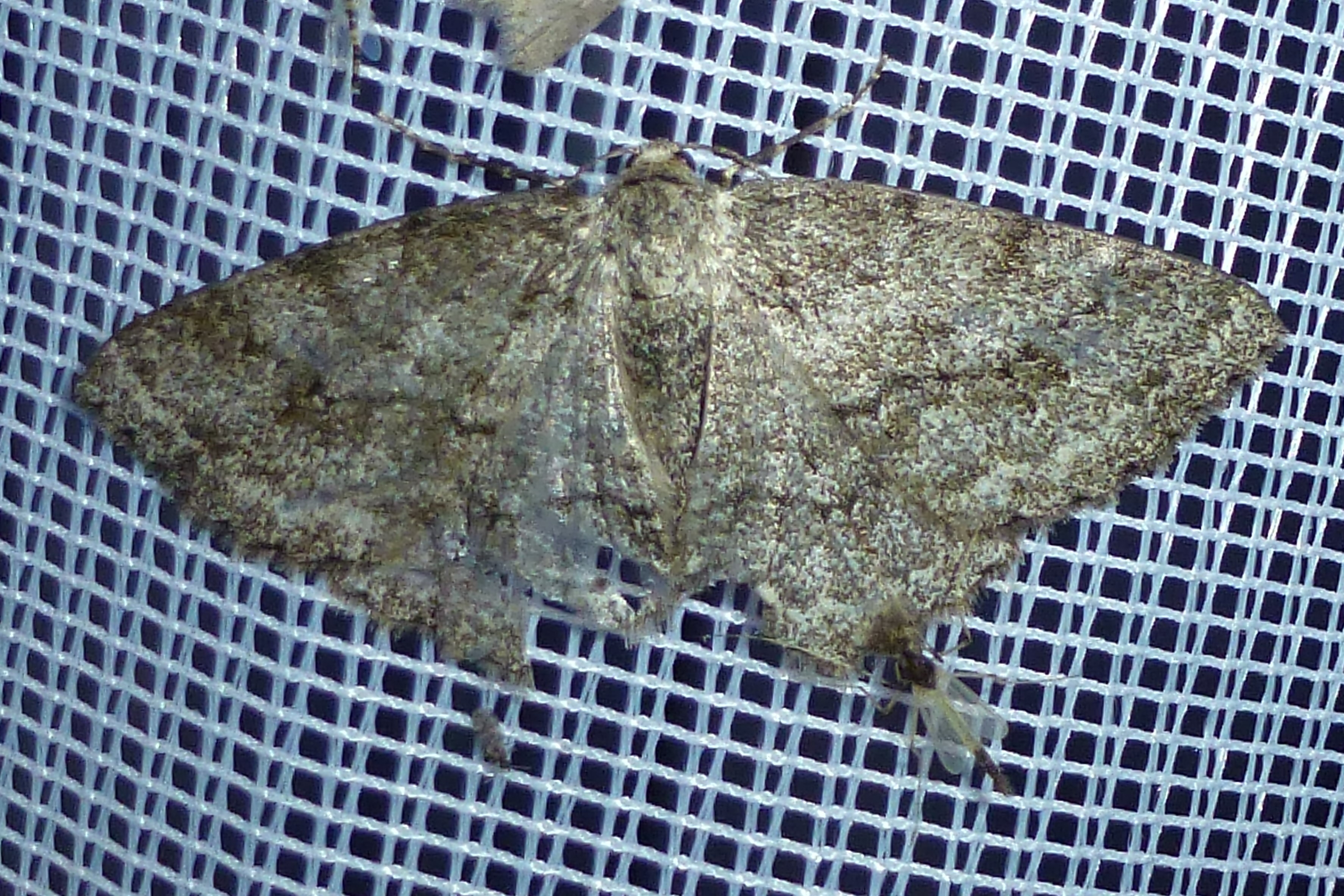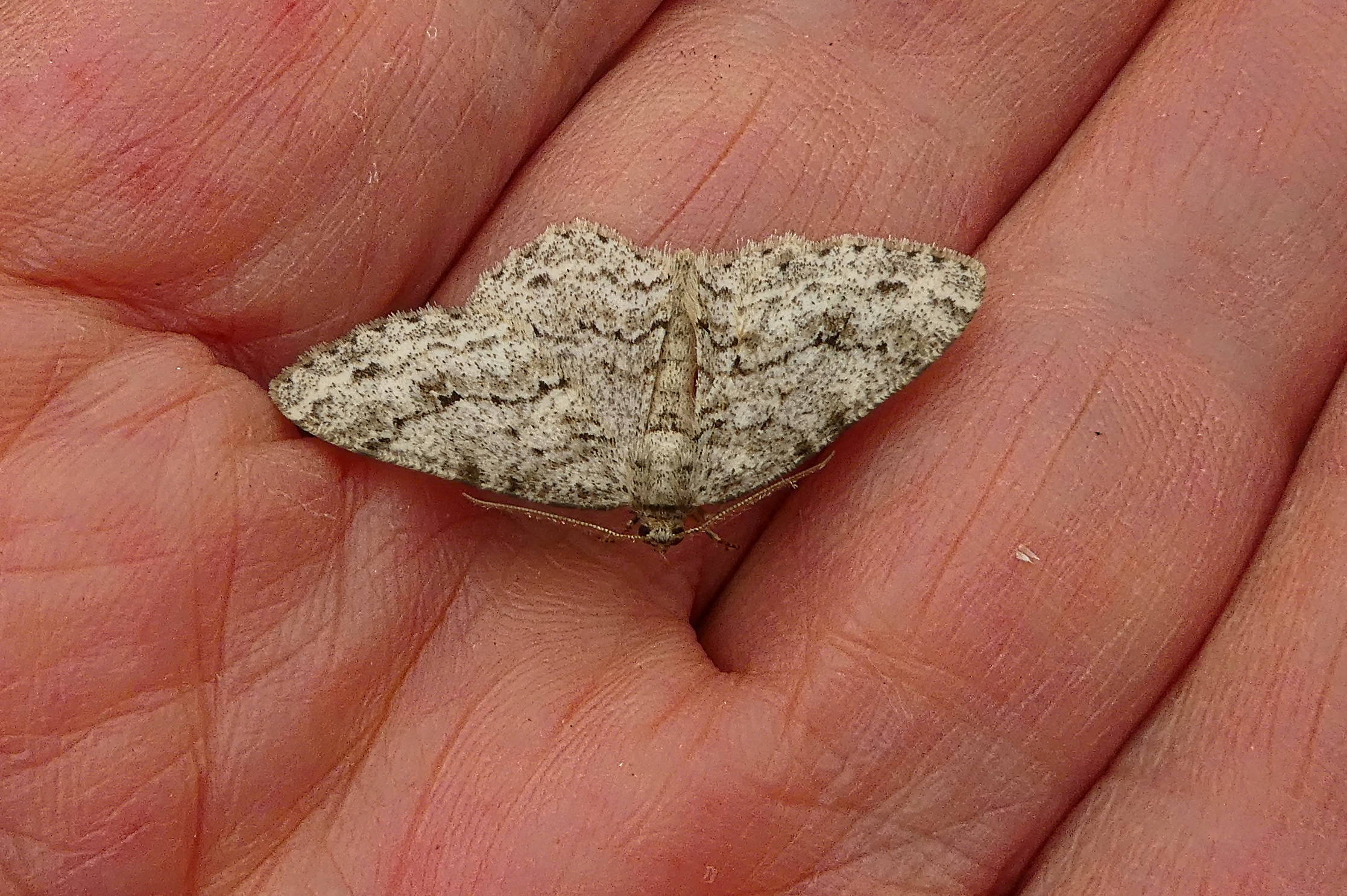 Ectropis crepuscularia (Denis & Schiffermüller, 1775), Chemnitz: Zeisigwald//Planitzwiese, 11.4.2018, seit Tagen frühsommerliche Temperaturen, passiver Lichtfang an hellem Gebäude, natürliche Farbe grau-grün
