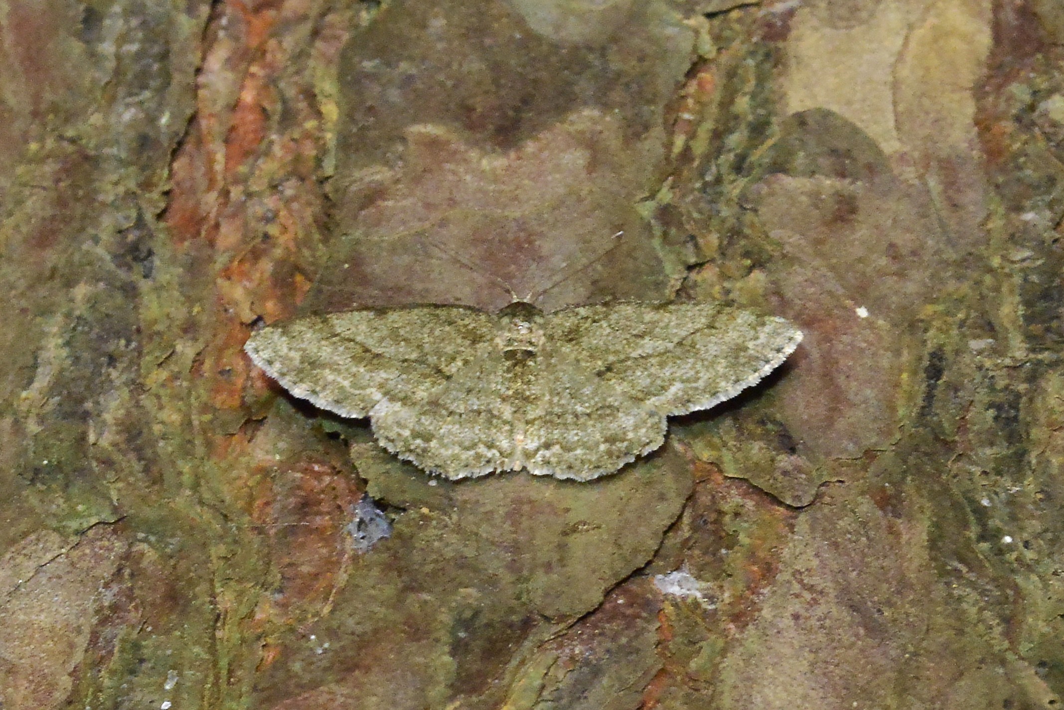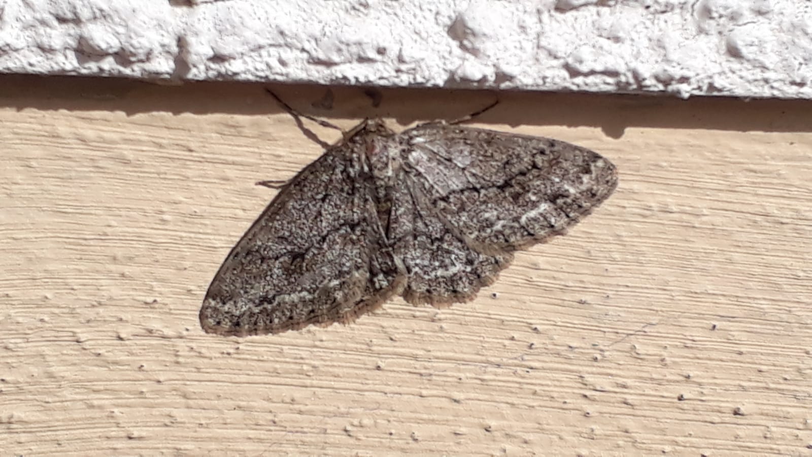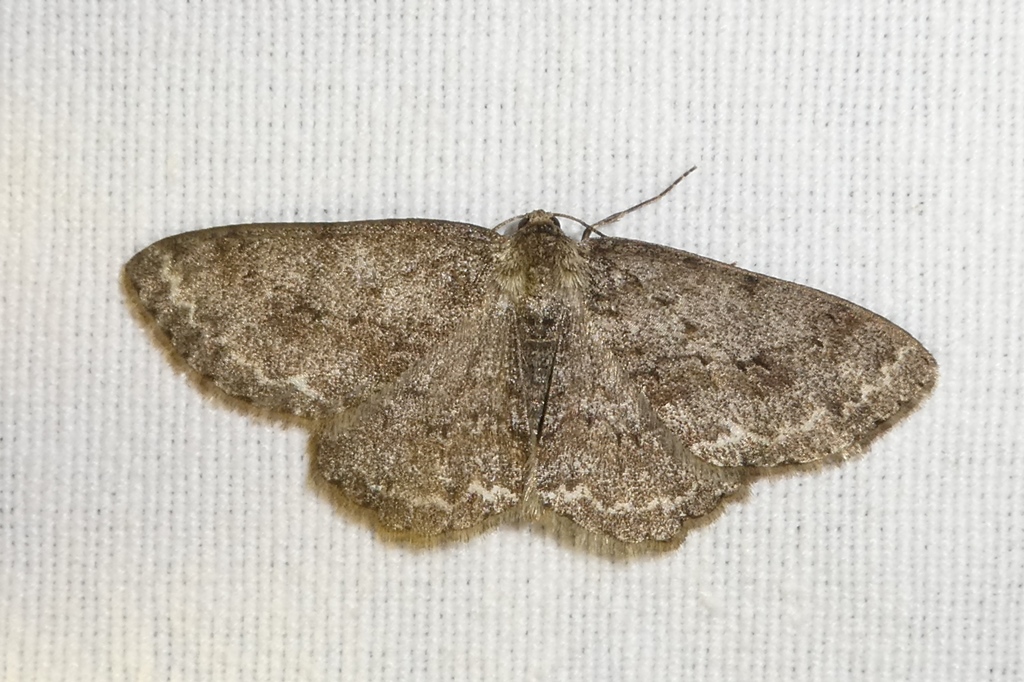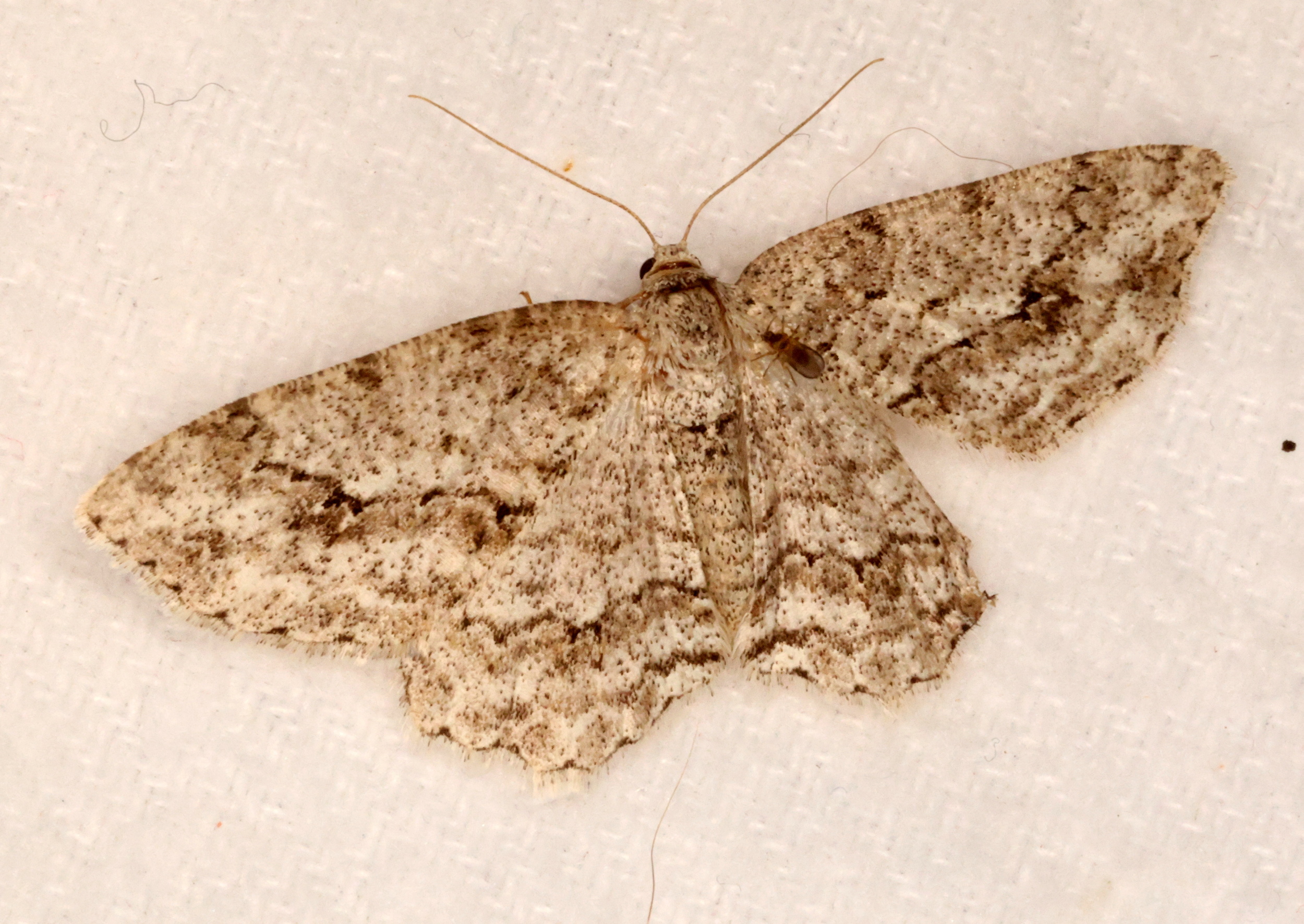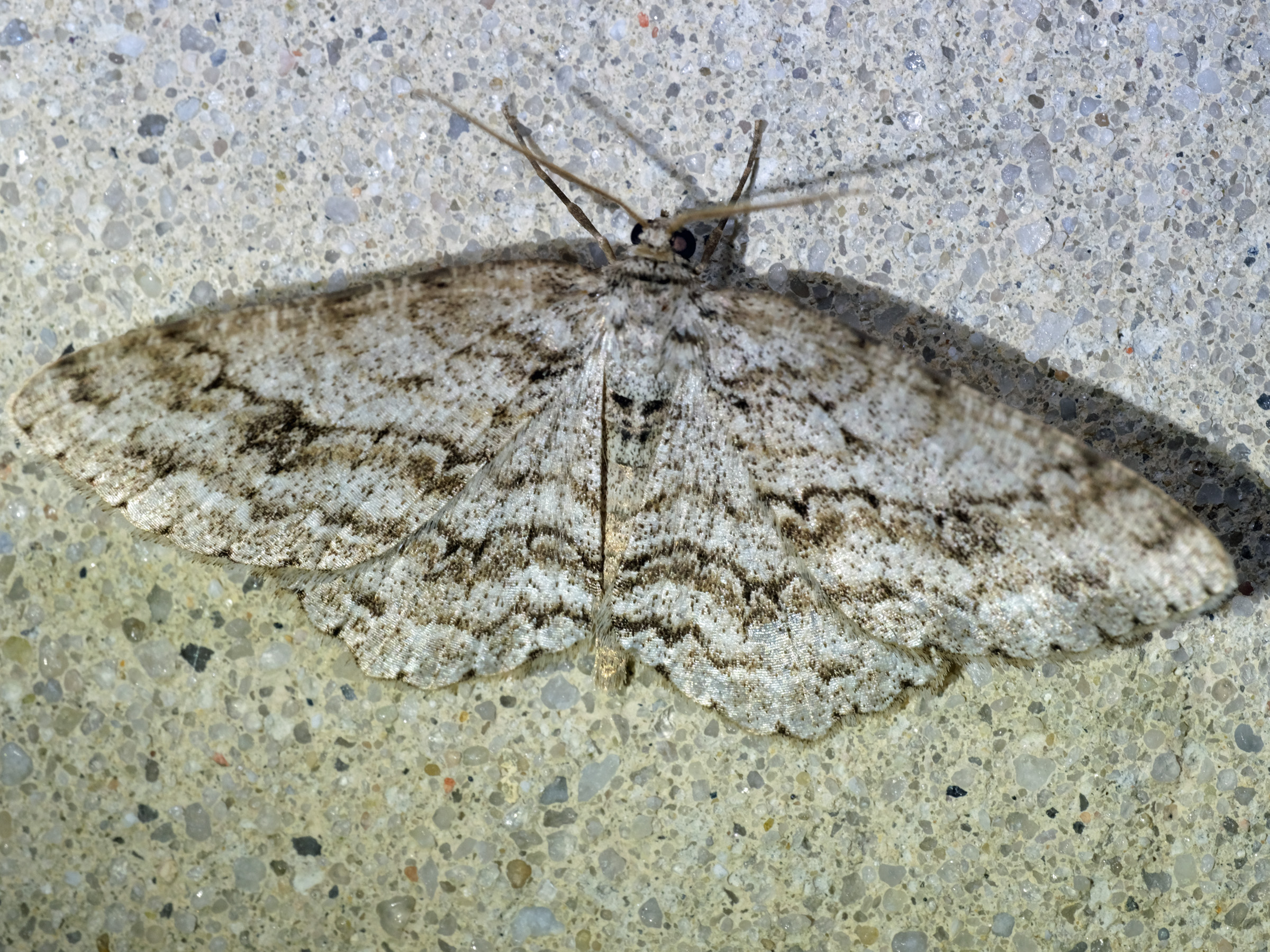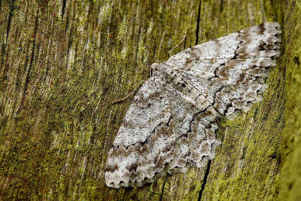 Ectropis crepuscularia (Denis & Schiffermüller, 1775), Chemnitz: Zeisigwald//Planitzwiese, 11.4.2018, seit Tagen frühsommerliche Temperaturen, passiver Lichtfang an hellem Gebäude, natürliche Farbe grau-grün
