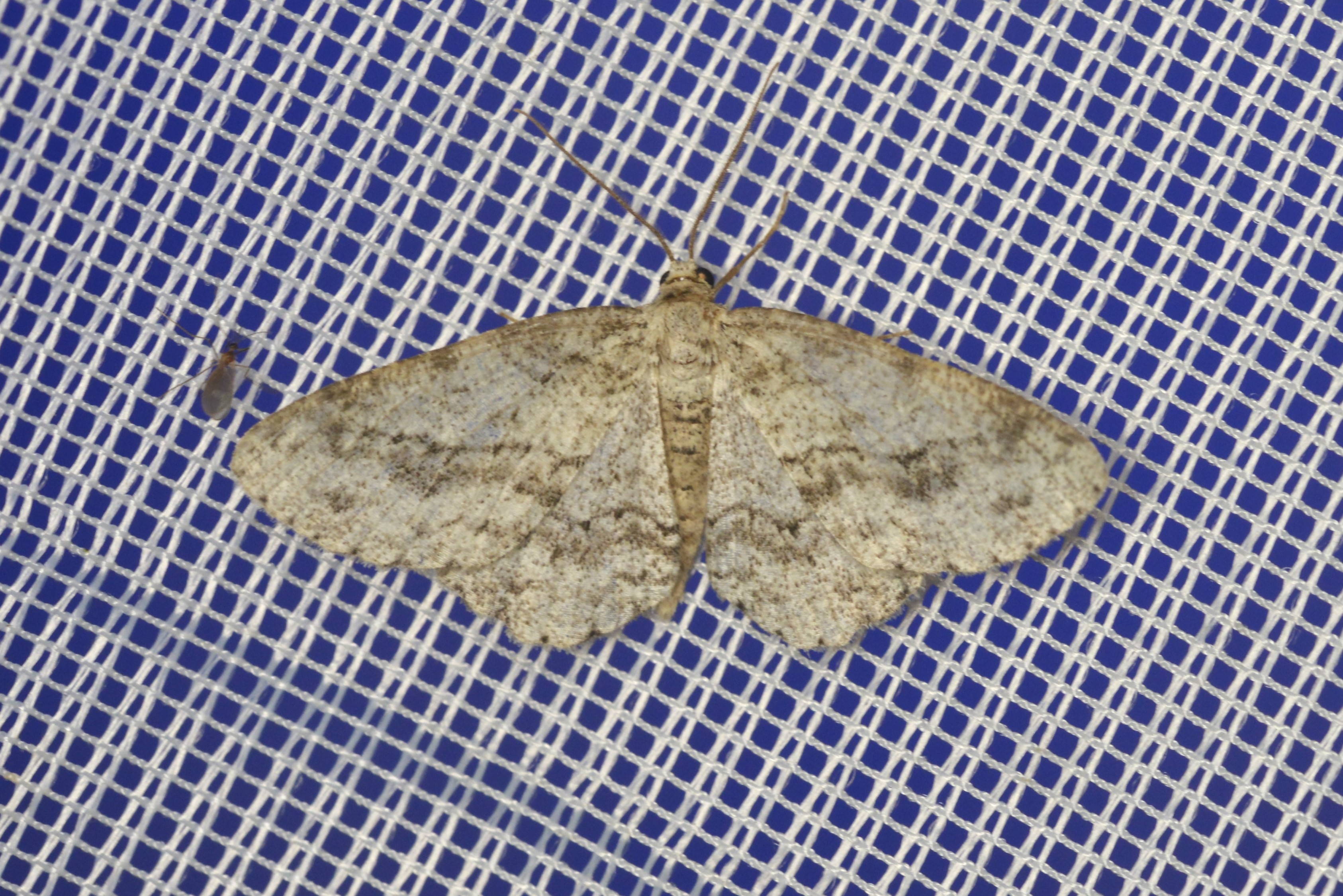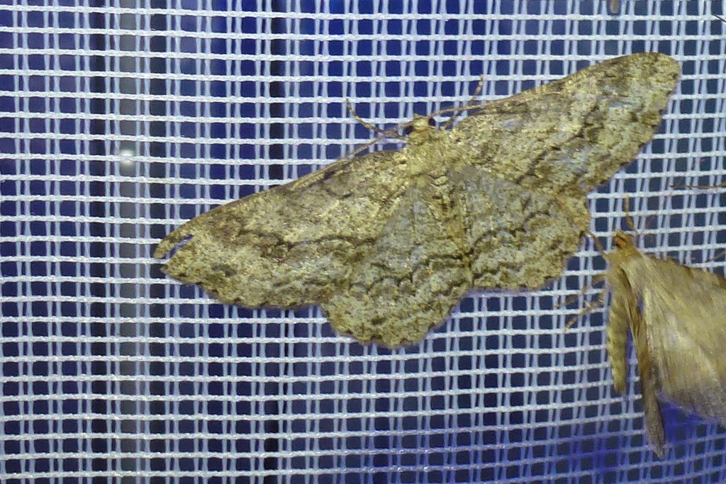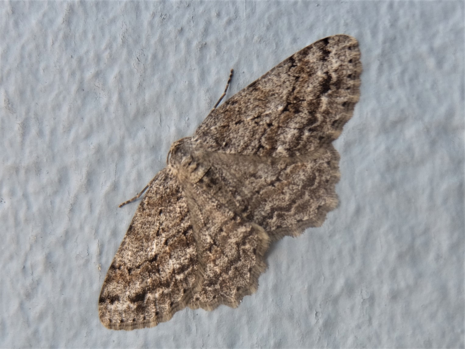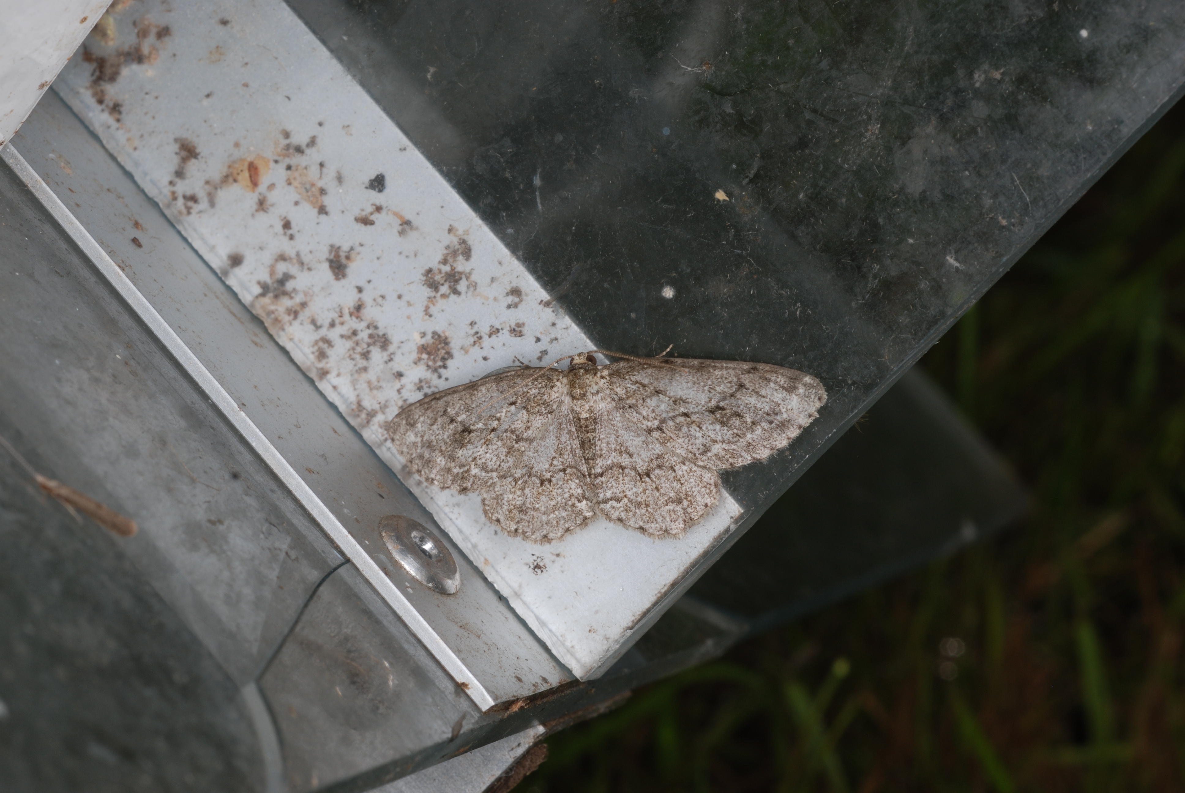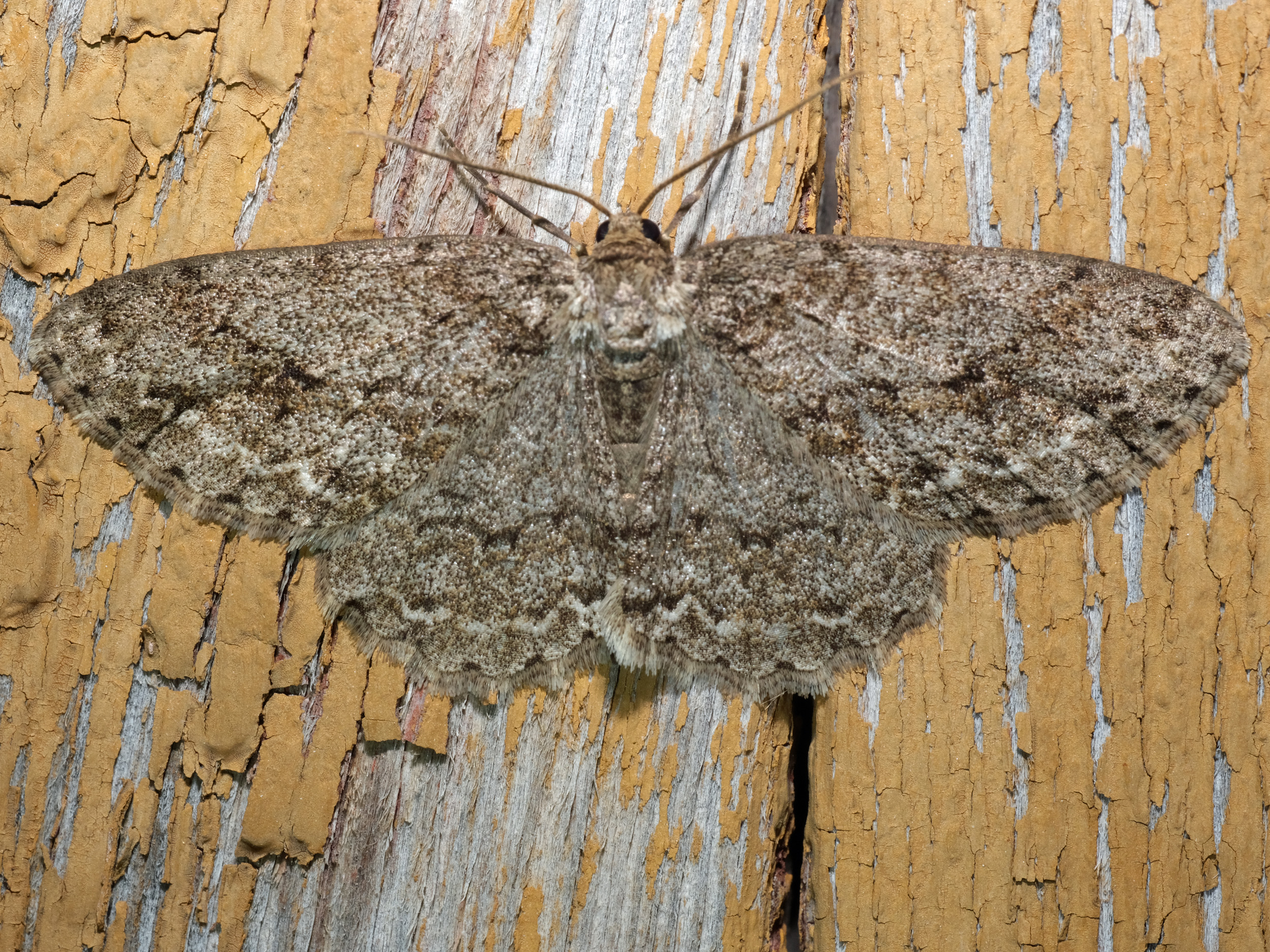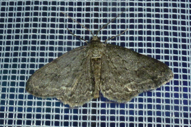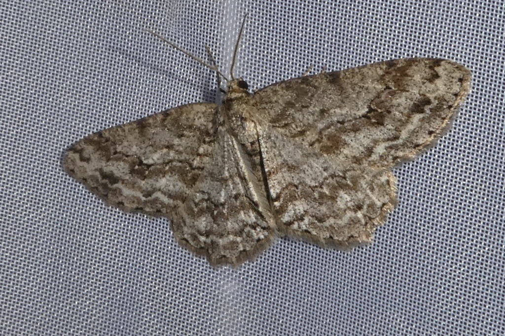 Ectropis crepuscularia (Denis & Schiffermüller, 1775), Chemnitz: Zeisigwald//Planitzwiese, 11.4.2018, seit Tagen frühsommerliche Temperaturen, passiver Lichtfang an hellem Gebäude, natürliche Farbe grau-grün