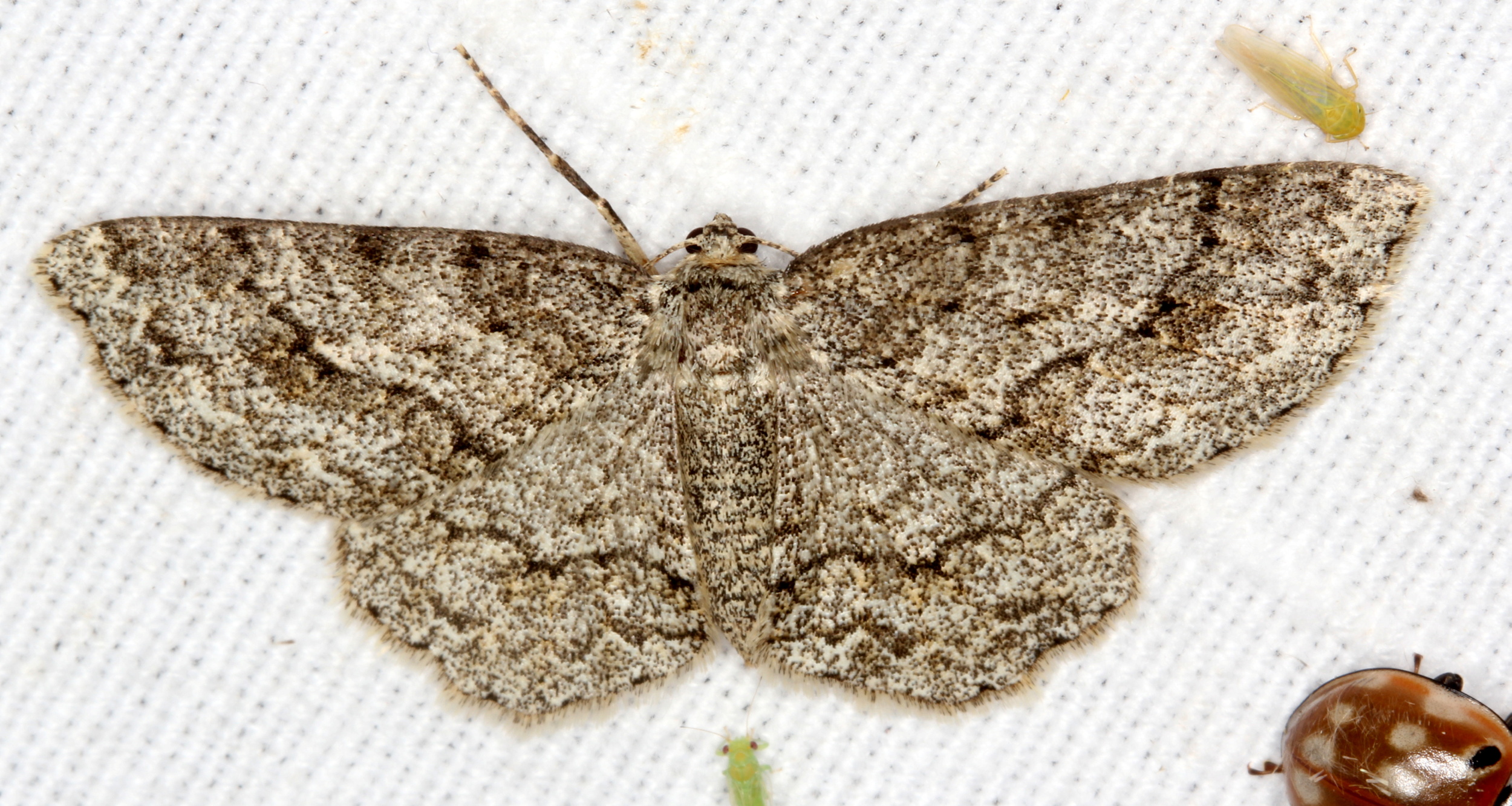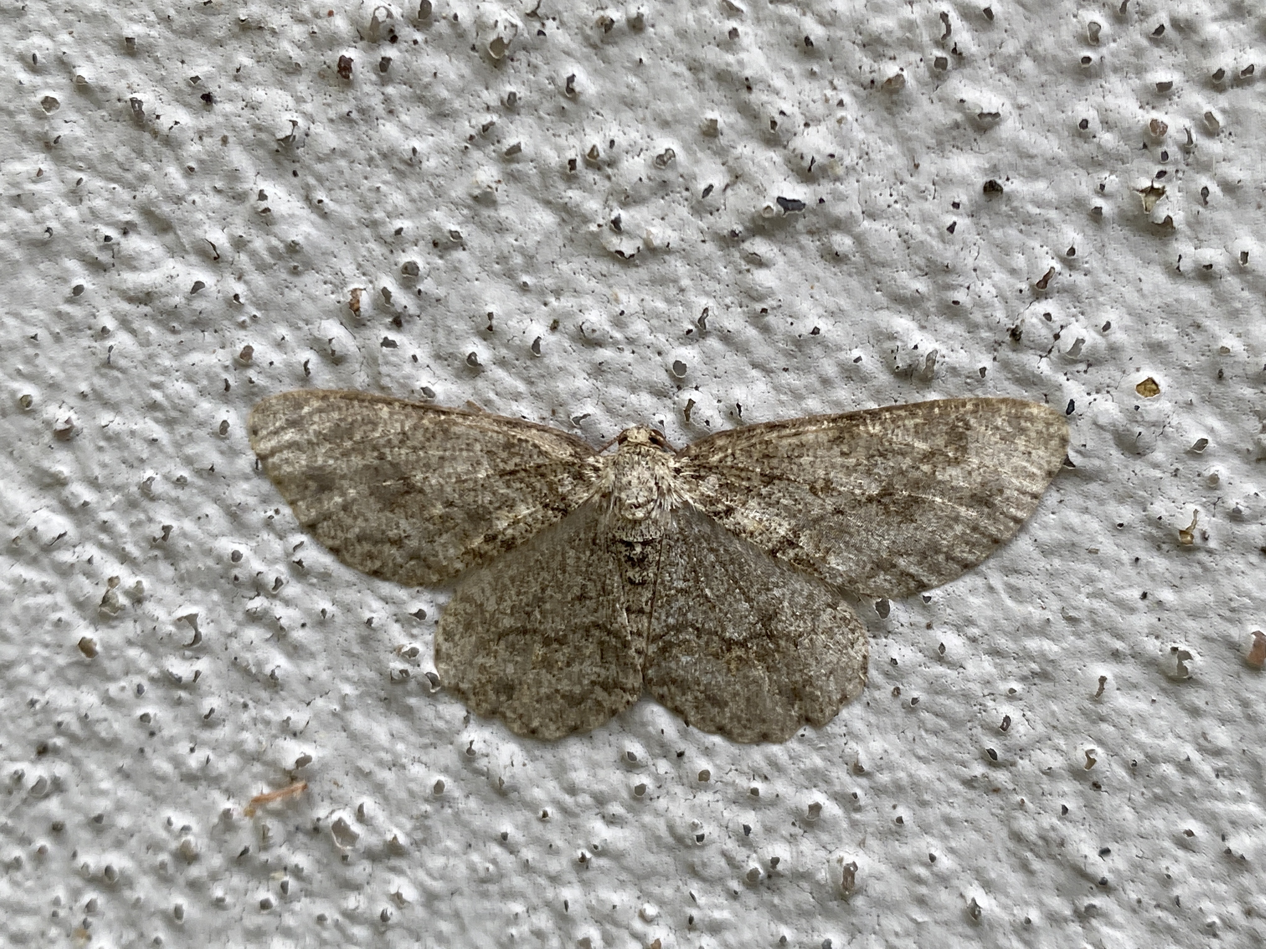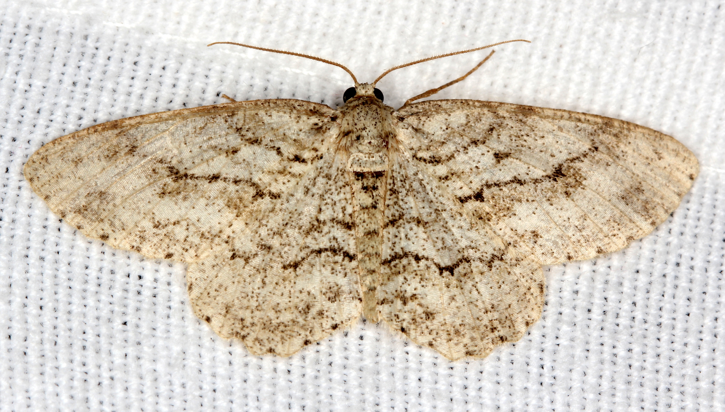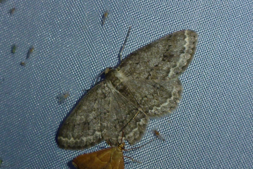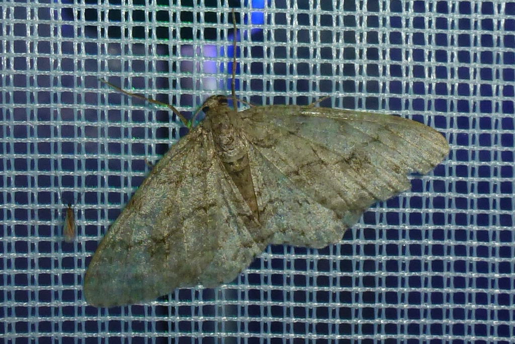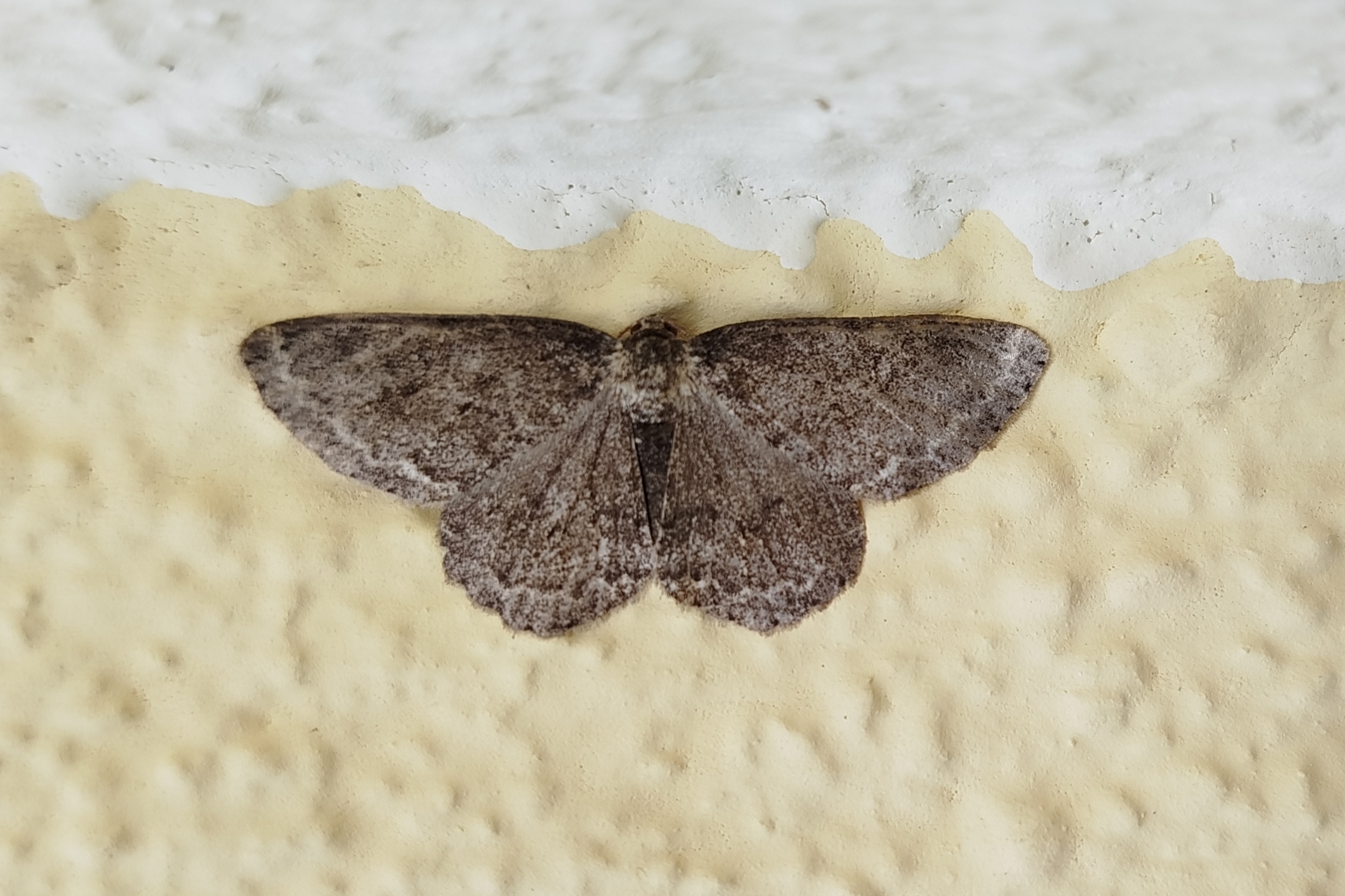 Ectropis crepuscularia (Denis & Schiffermüller, 1775), Chemnitz: Zeisigwald//Planitzwiese, 11.4.2018, seit Tagen frühsommerliche Temperaturen, passiver Lichtfang an hellem Gebäude, natürliche Farbe grau-grün