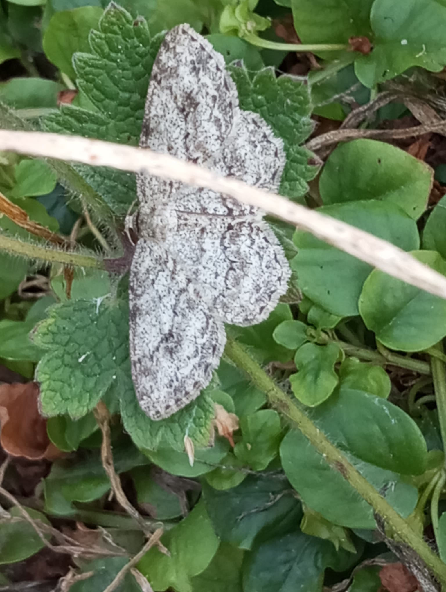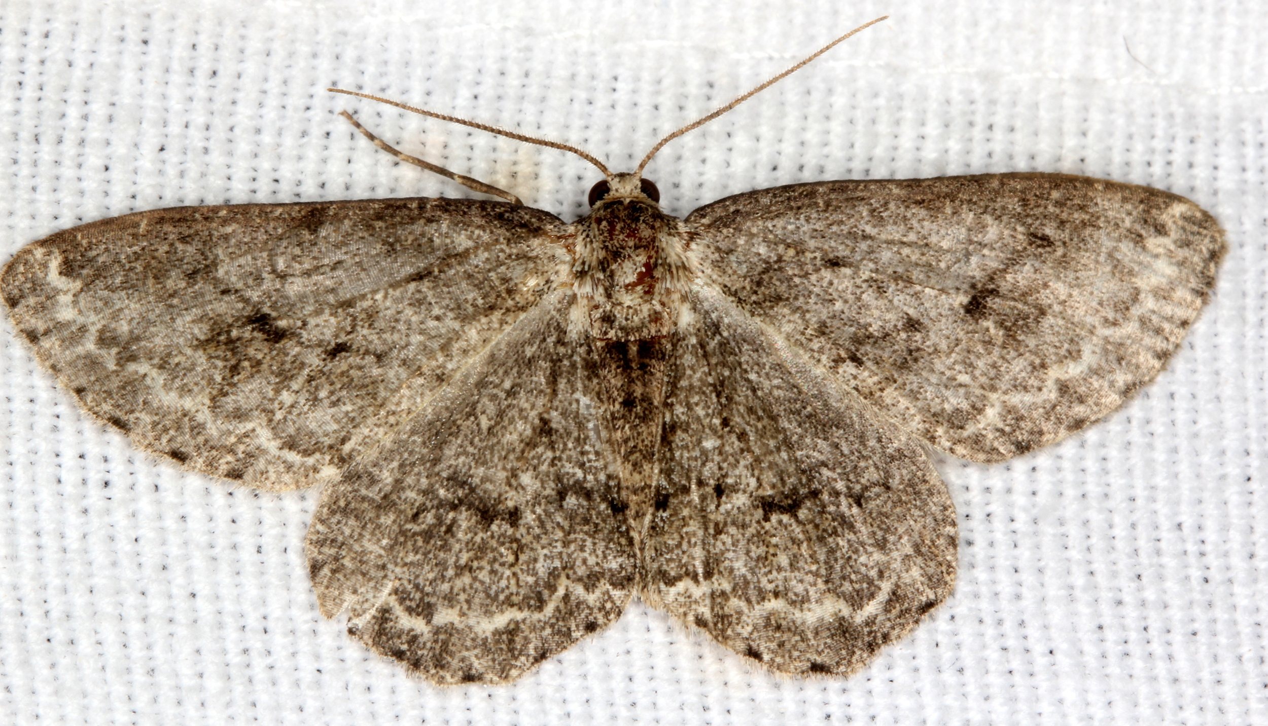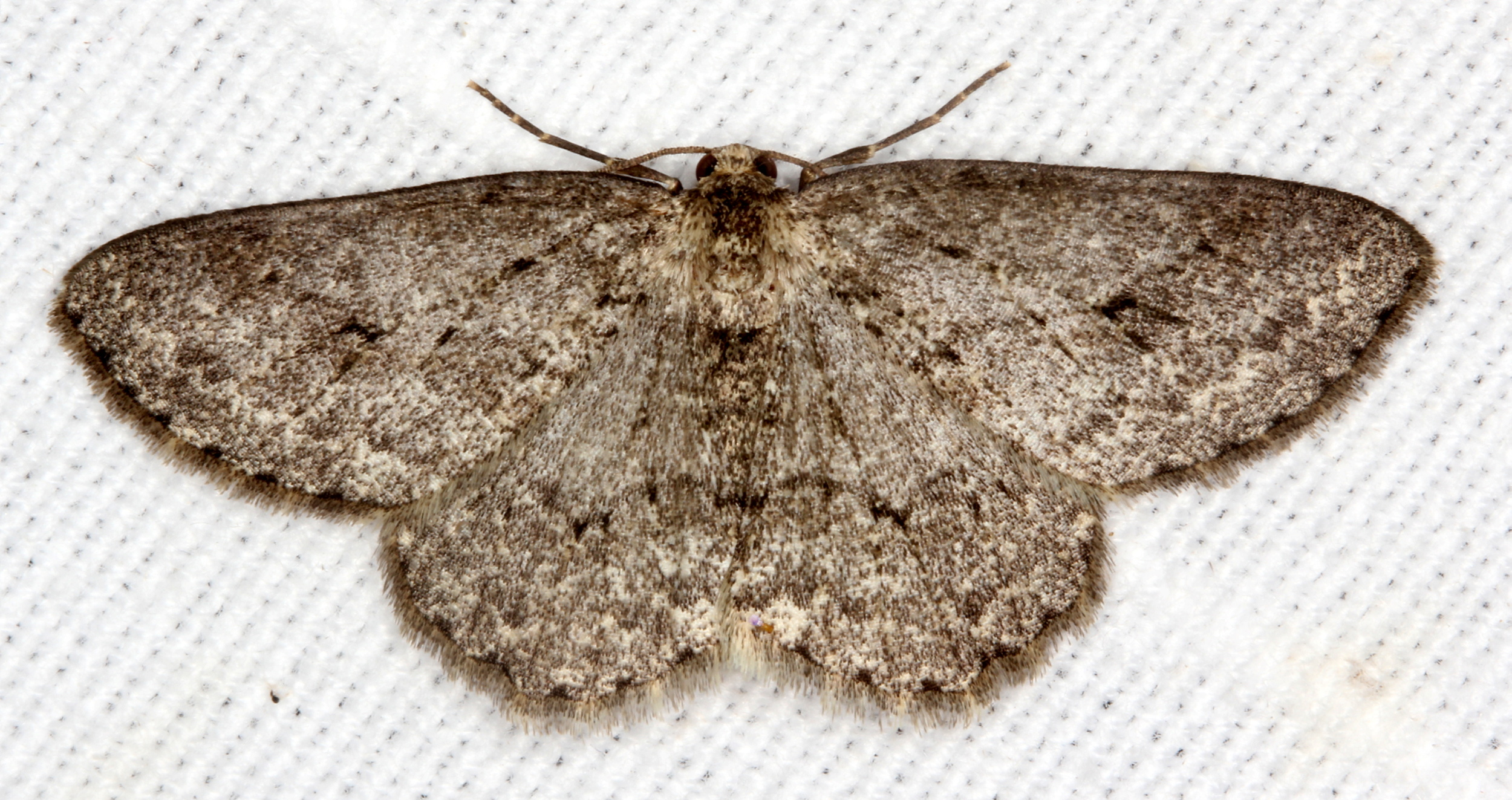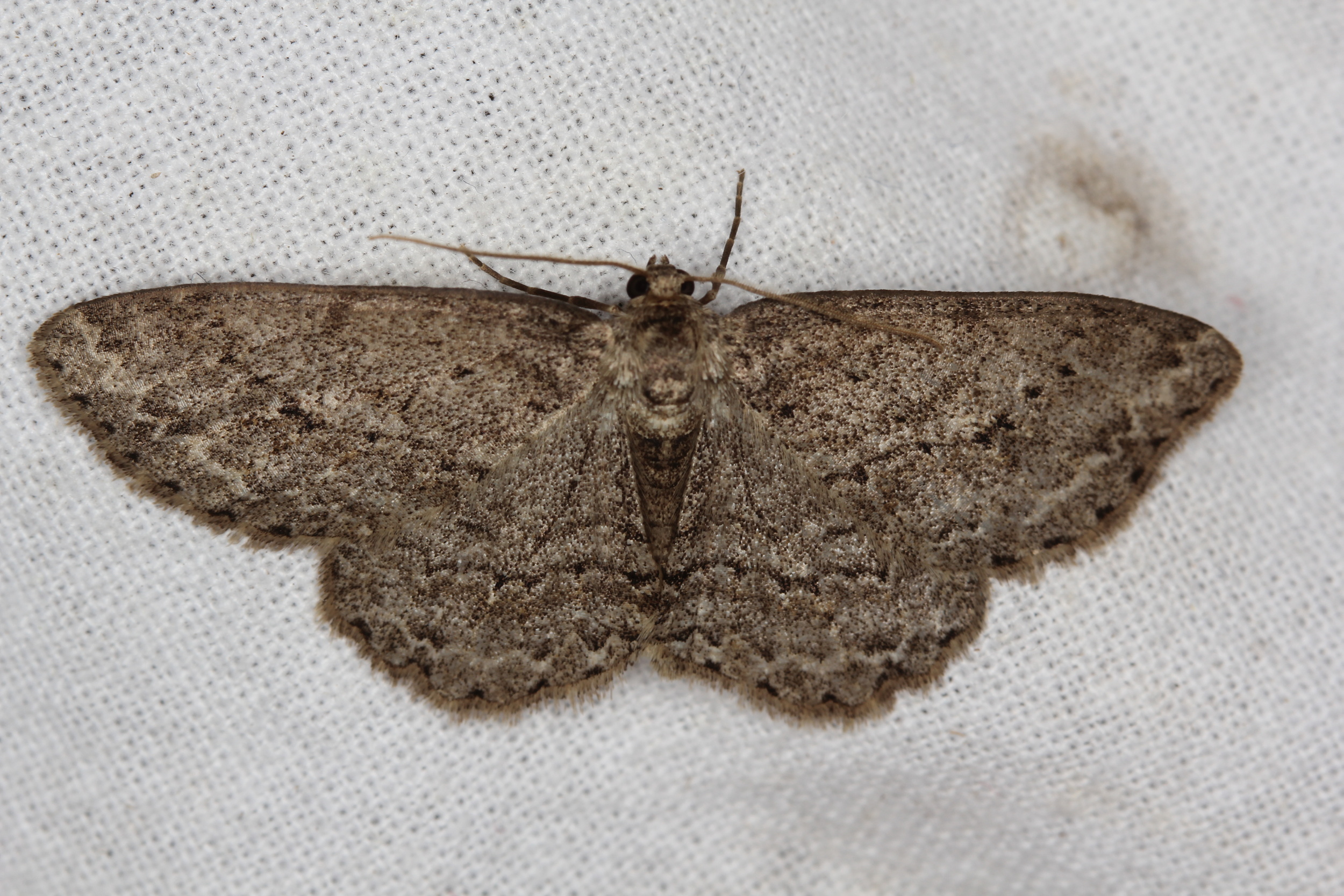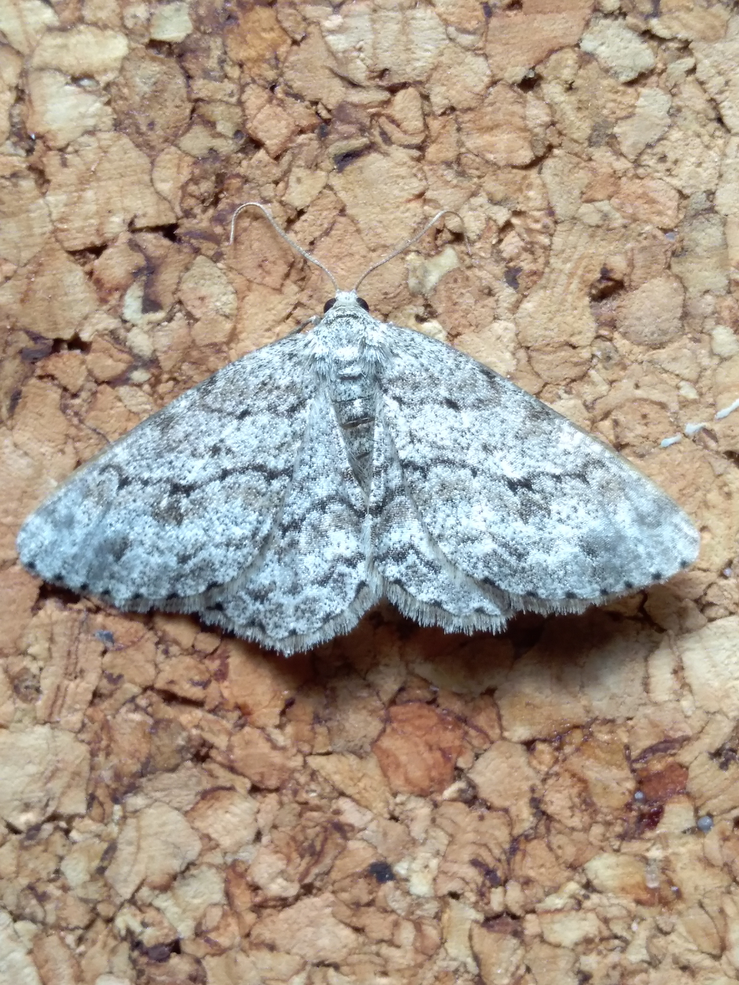 Ectropis crepuscularia (Denis & Schiffermüller, 1775), Chemnitz: Zeisigwald//Planitzwiese, 11.4.2018, seit Tagen frühsommerliche Temperaturen, passiver Lichtfang an hellem Gebäude, natürliche Farbe grau-grün