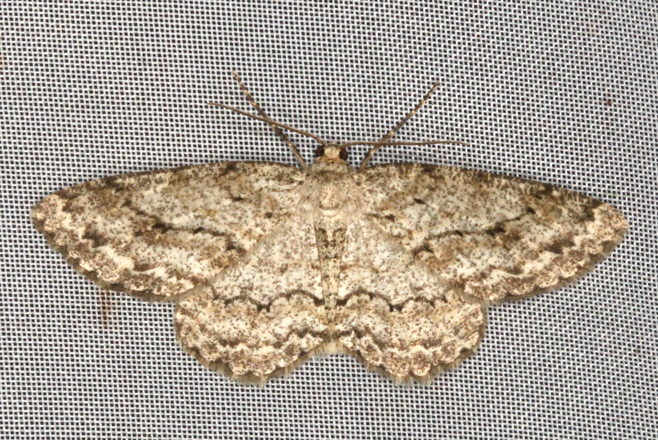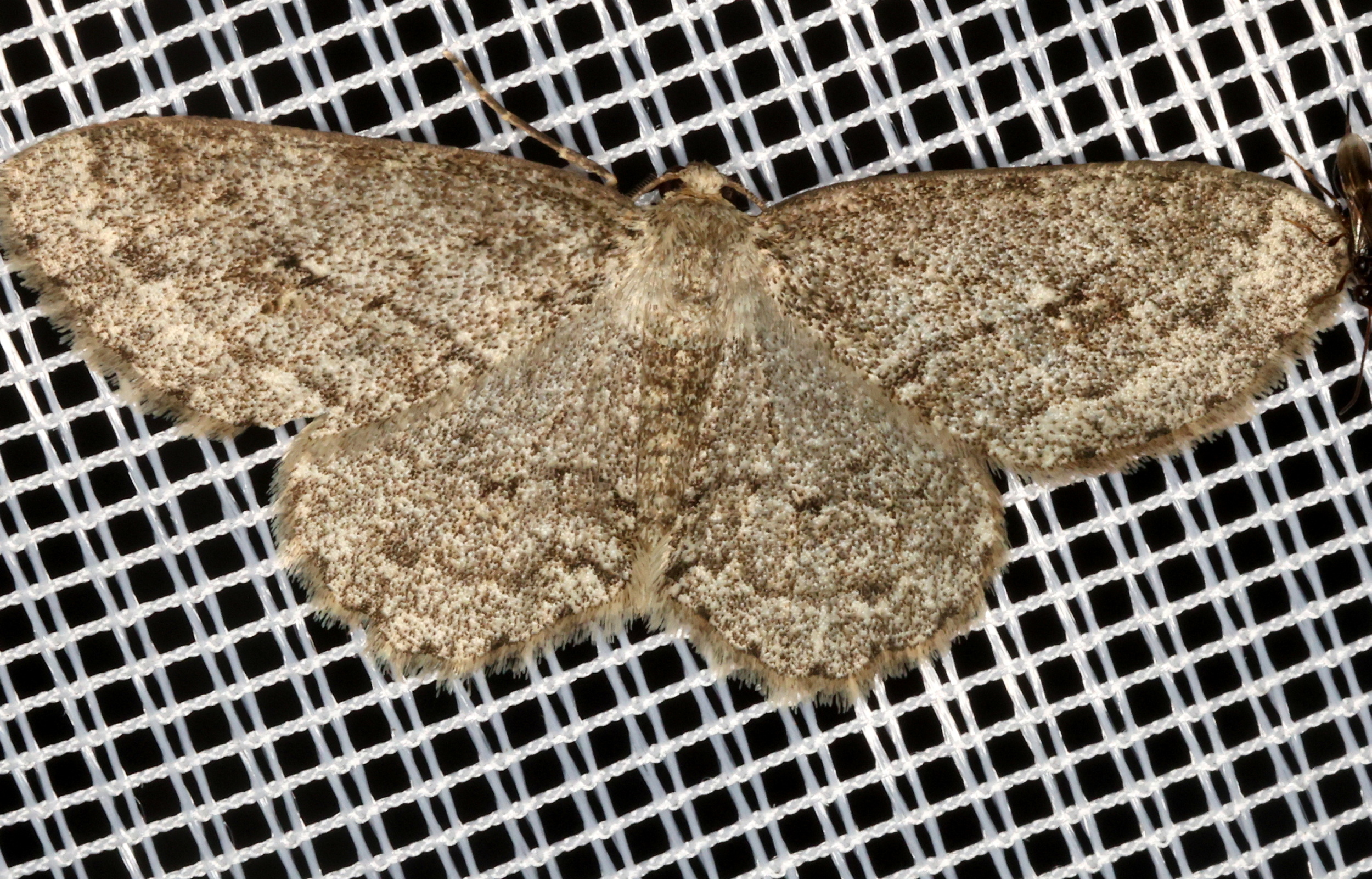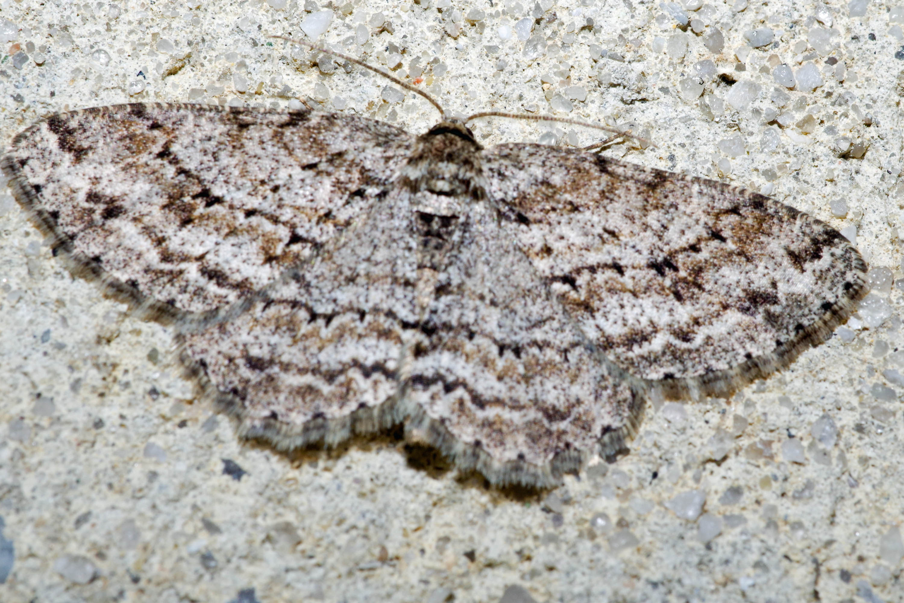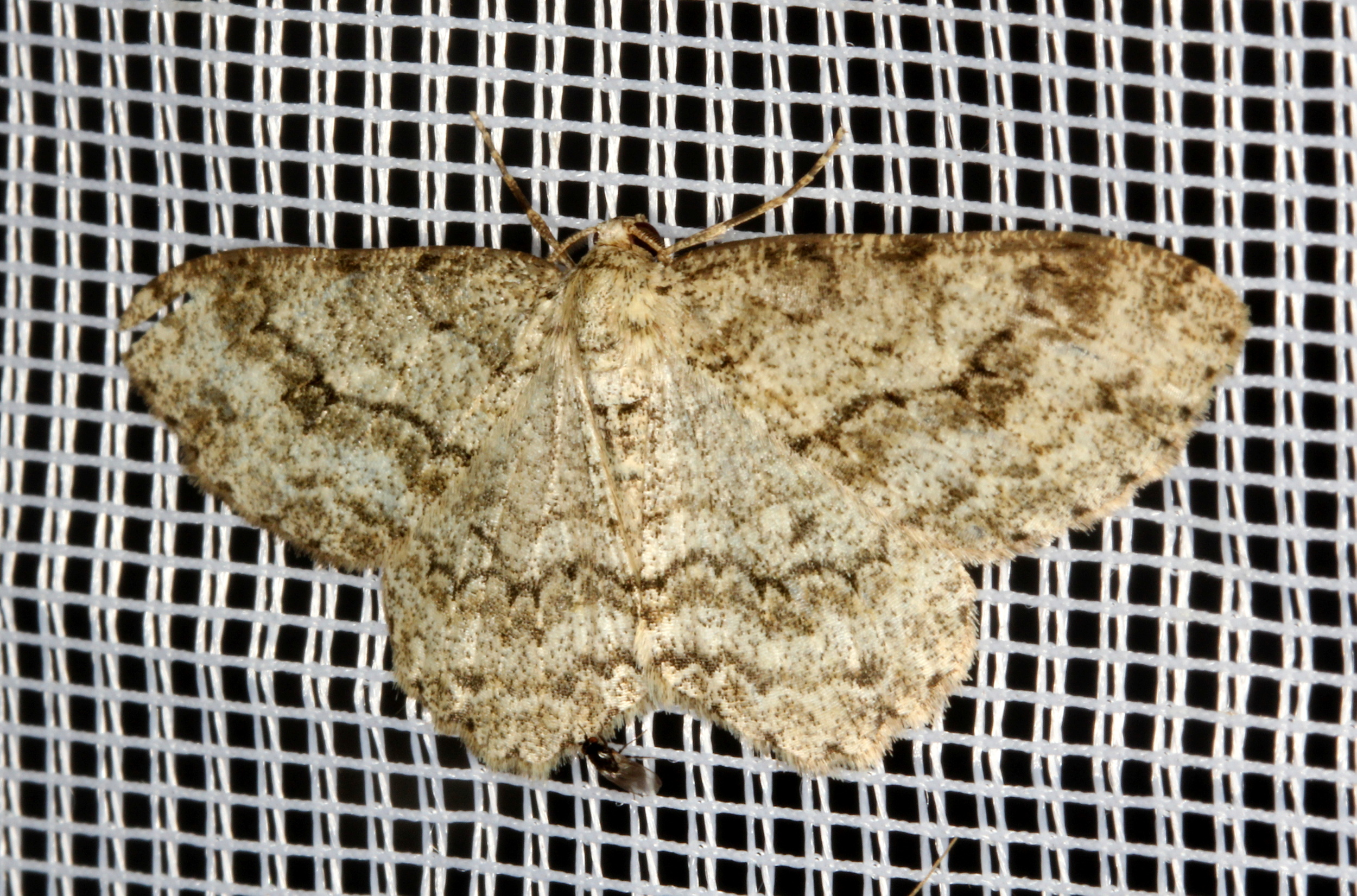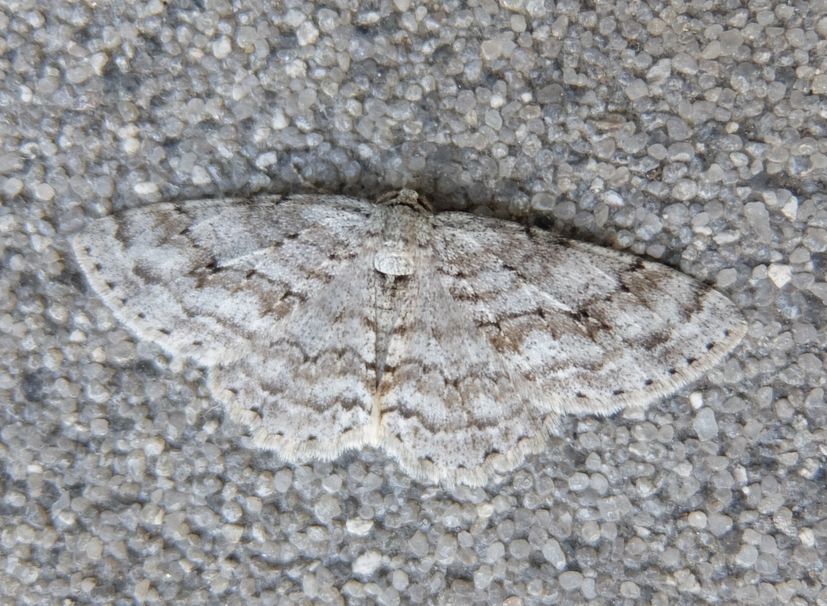 Ectropis crepuscularia (Denis & Schiffermüller, 1775), Chemnitz: Zeisigwald//Planitzwiese, 11.4.2018, seit Tagen frühsommerliche Temperaturen, passiver Lichtfang an hellem Gebäude, natürliche Farbe grau-grün