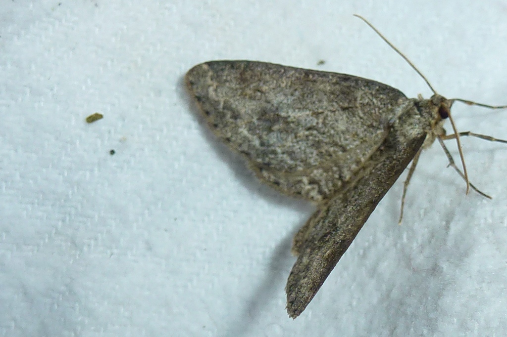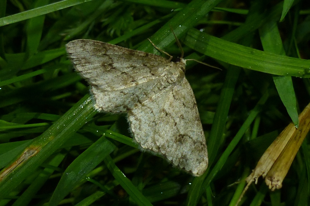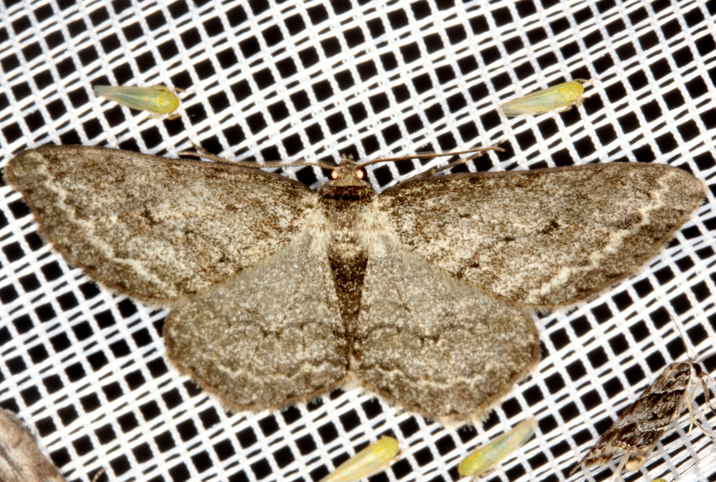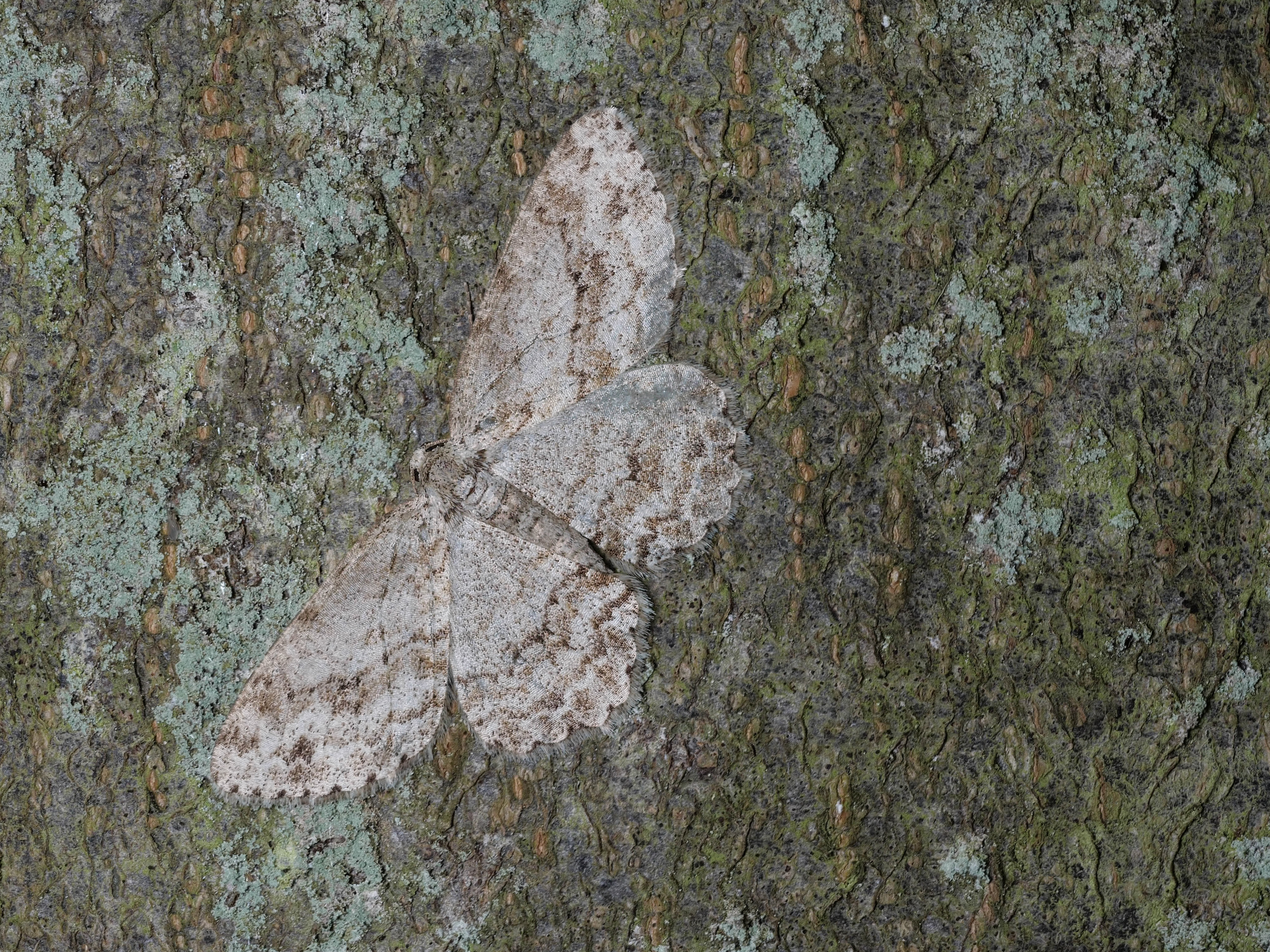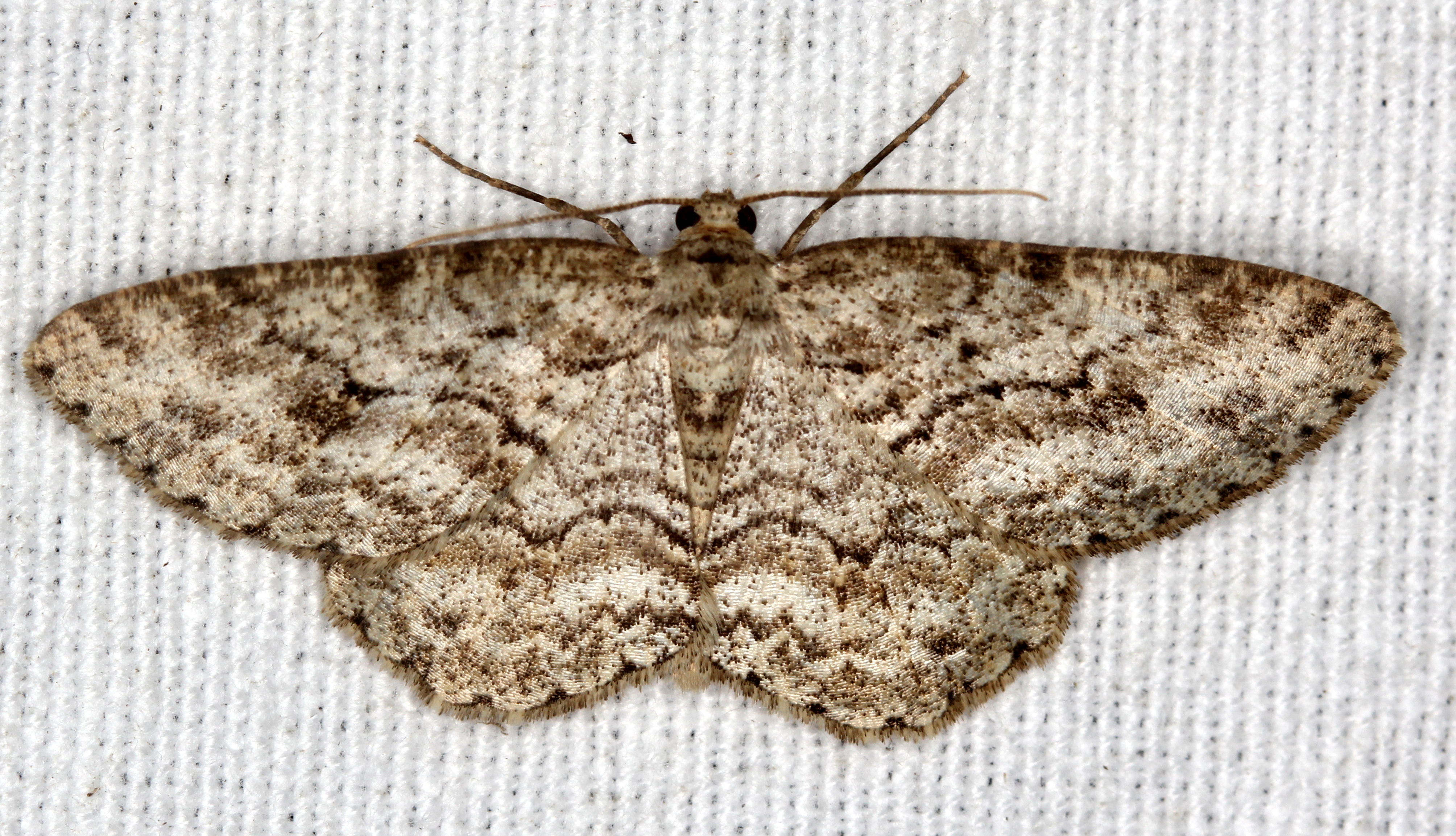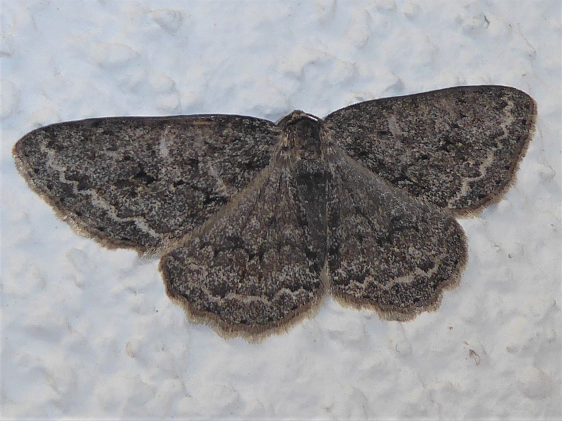 Ectropis crepuscularia (Denis & Schiffermüller, 1775), Chemnitz: Zeisigwald//Planitzwiese, 11.4.2018, seit Tagen frühsommerliche Temperaturen, passiver Lichtfang an hellem Gebäude, natürliche Farbe grau-grün