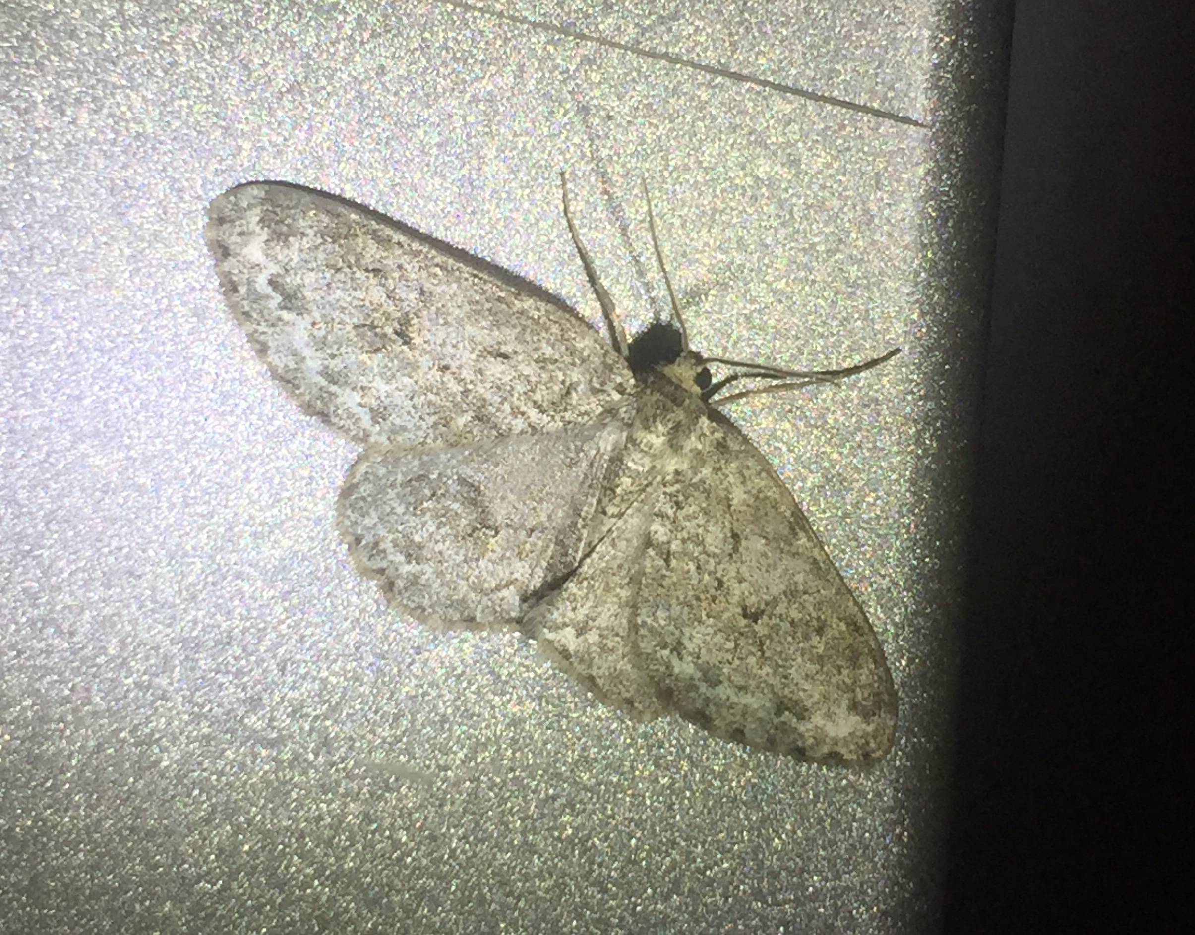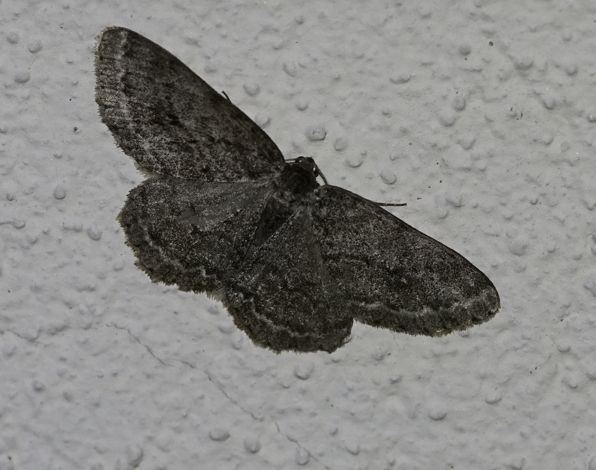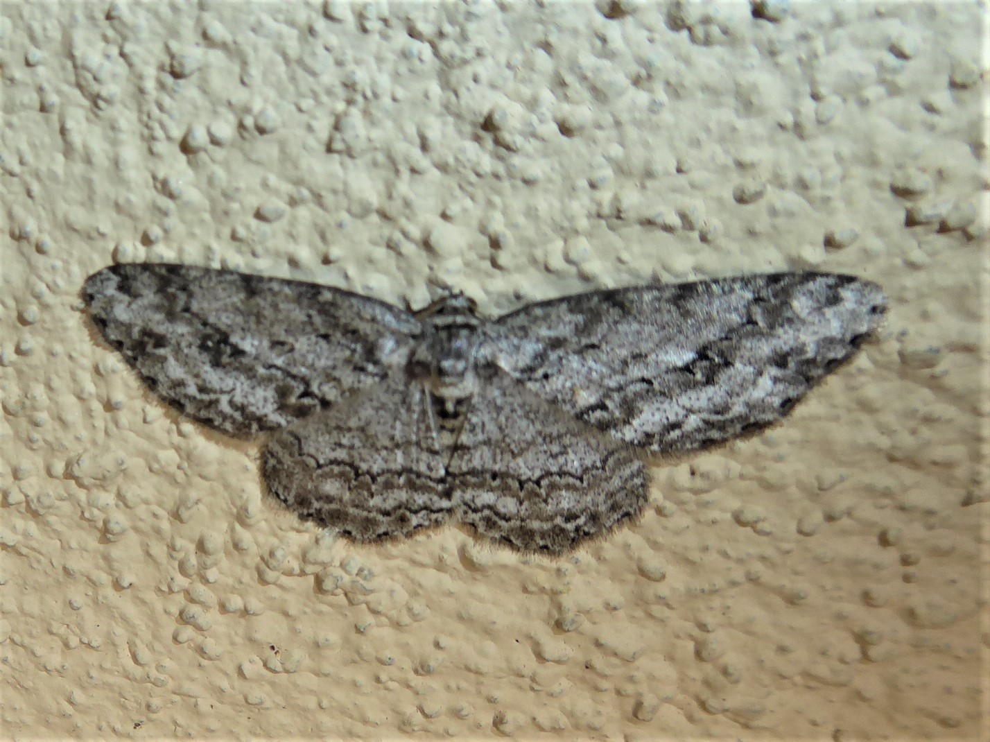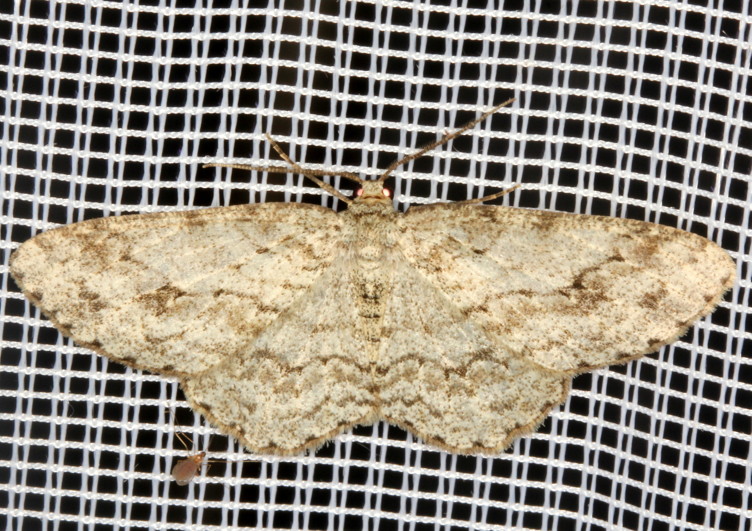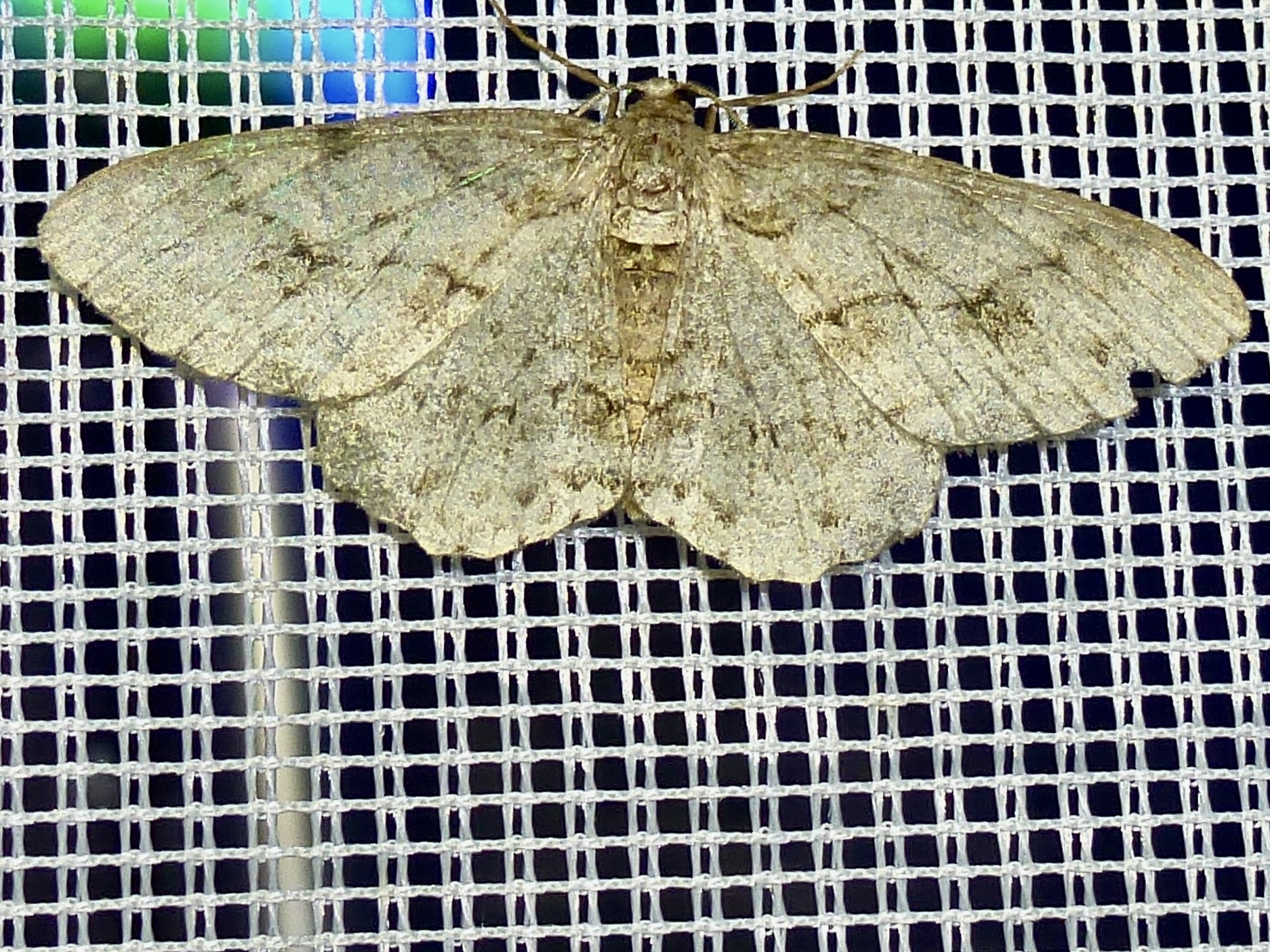 Ectropis crepuscularia (Denis & Schiffermüller, 1775), Chemnitz: Zeisigwald//Planitzwiese, 11.4.2018, seit Tagen frühsommerliche Temperaturen, passiver Lichtfang an hellem Gebäude, natürliche Farbe grau-grün