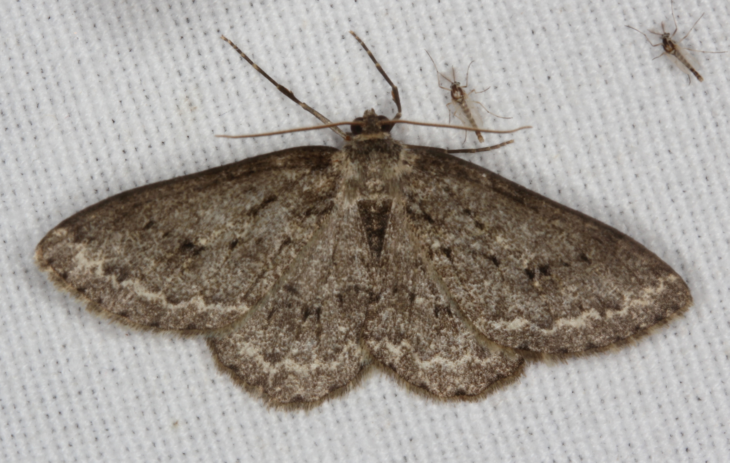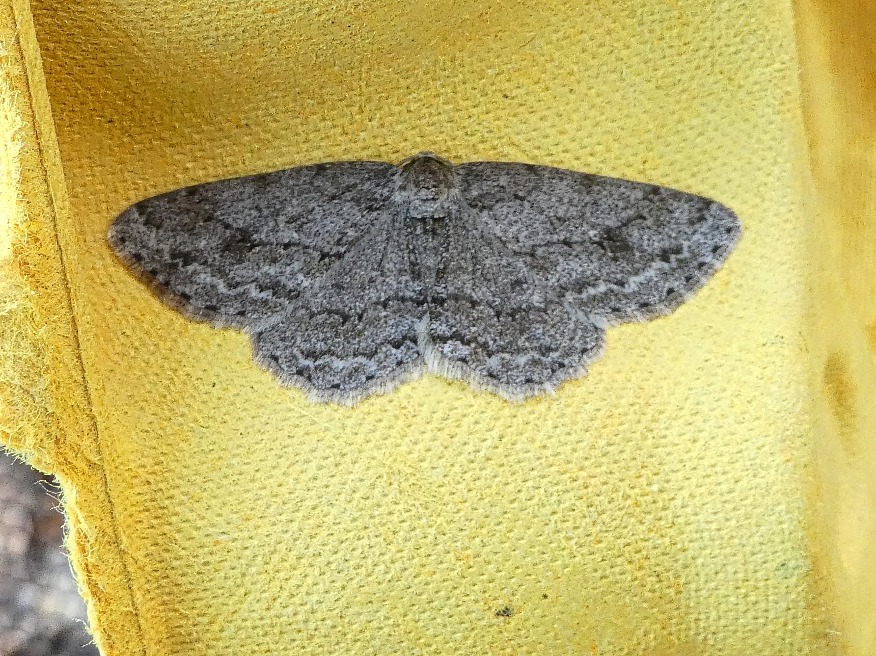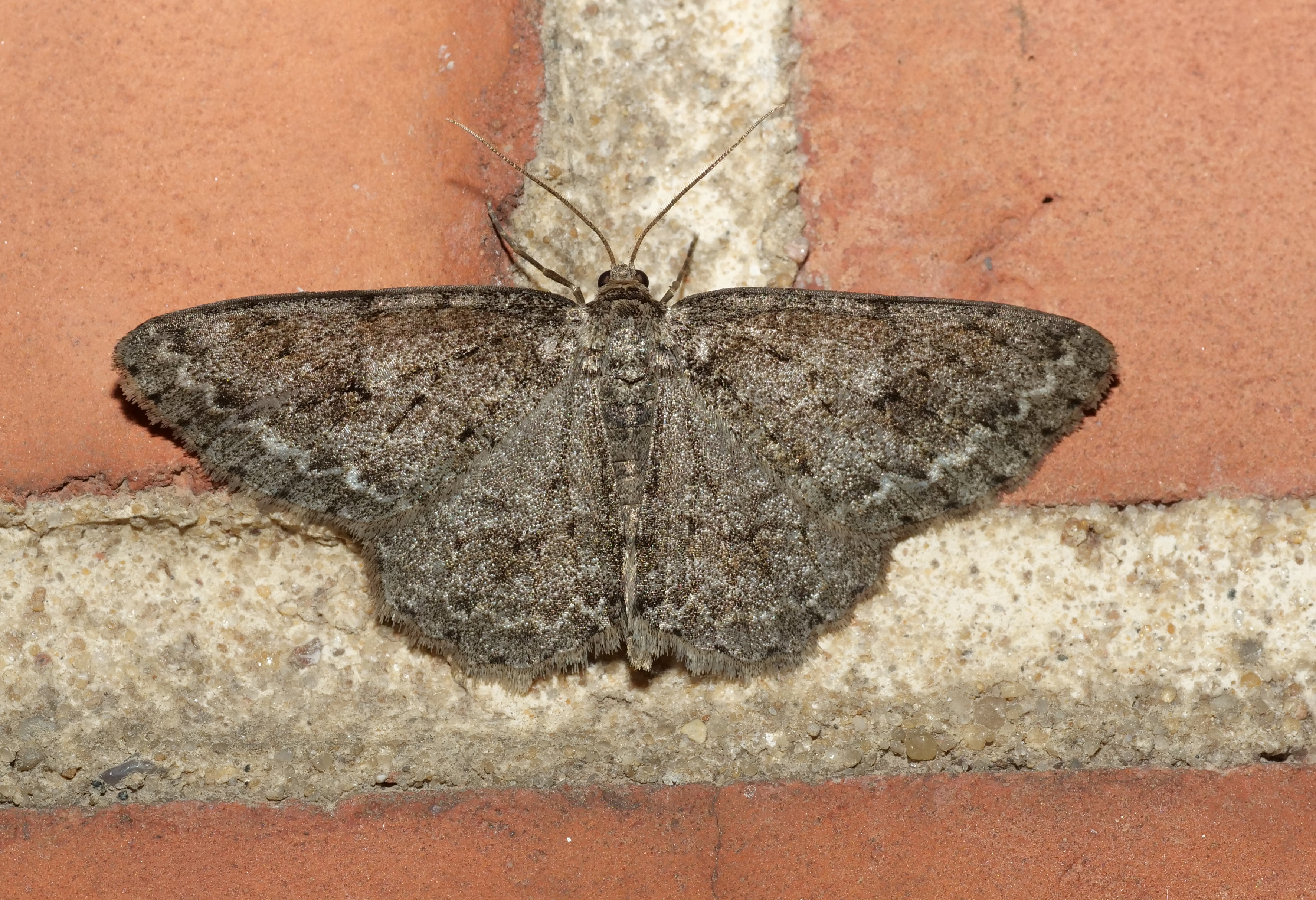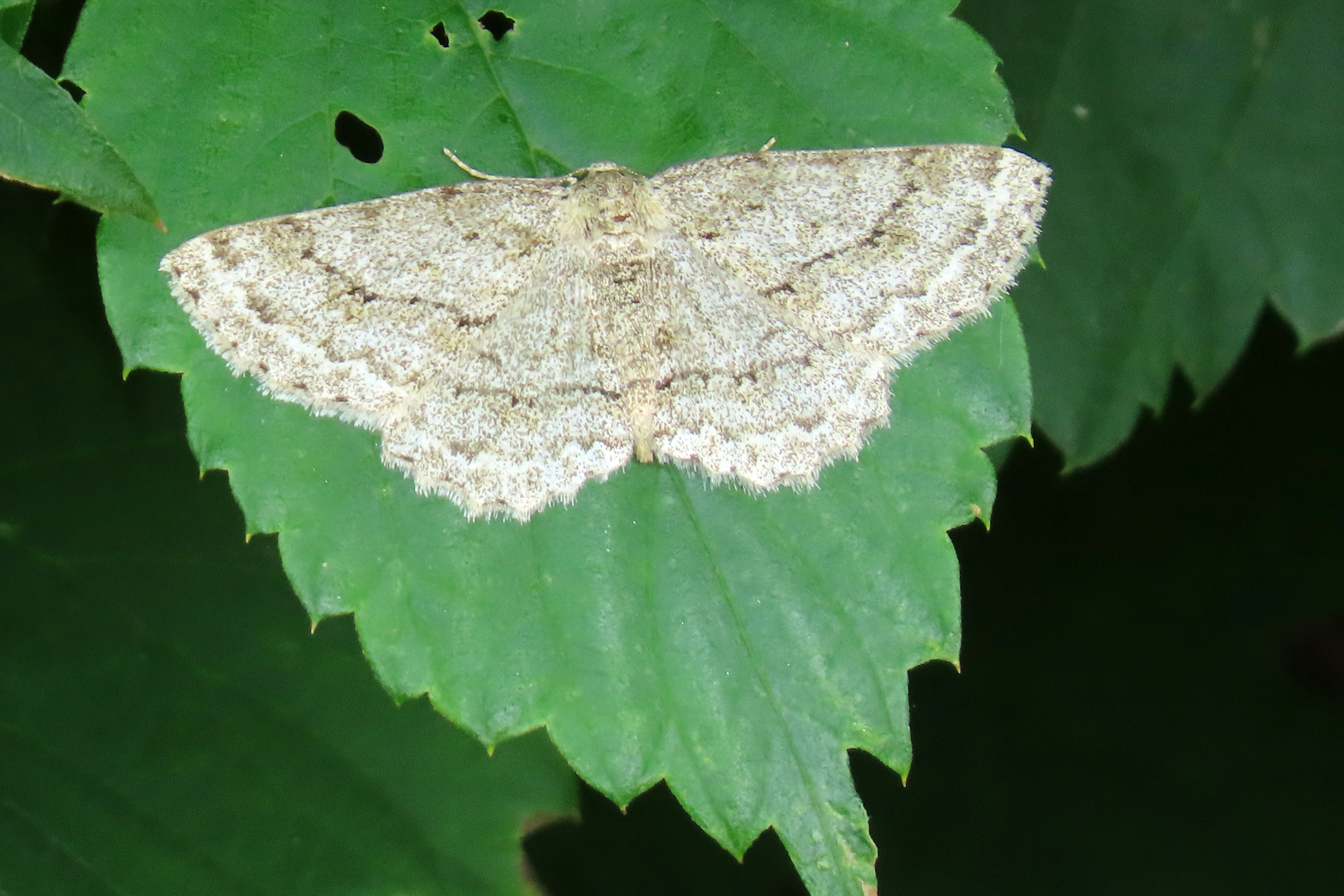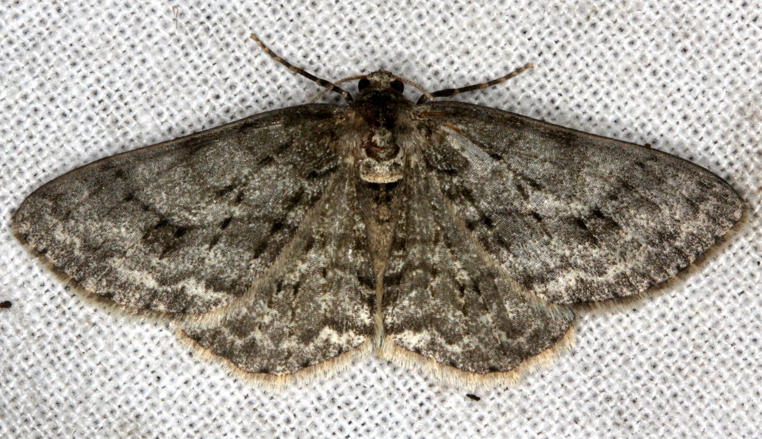 Ectropis crepuscularia (Denis & Schiffermüller, 1775), Chemnitz: Zeisigwald//Planitzwiese, 11.4.2018, seit Tagen frühsommerliche Temperaturen, passiver Lichtfang an hellem Gebäude, natürliche Farbe grau-grün