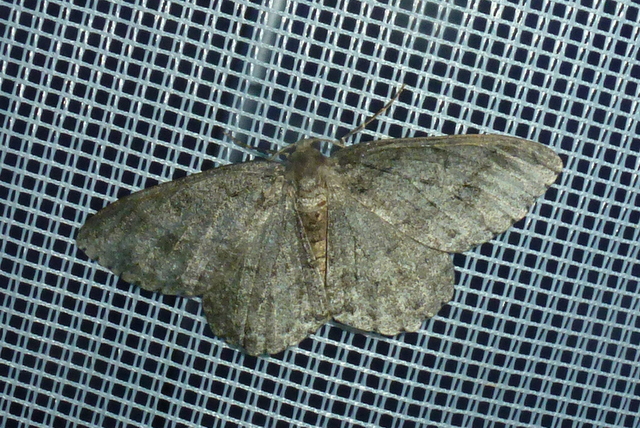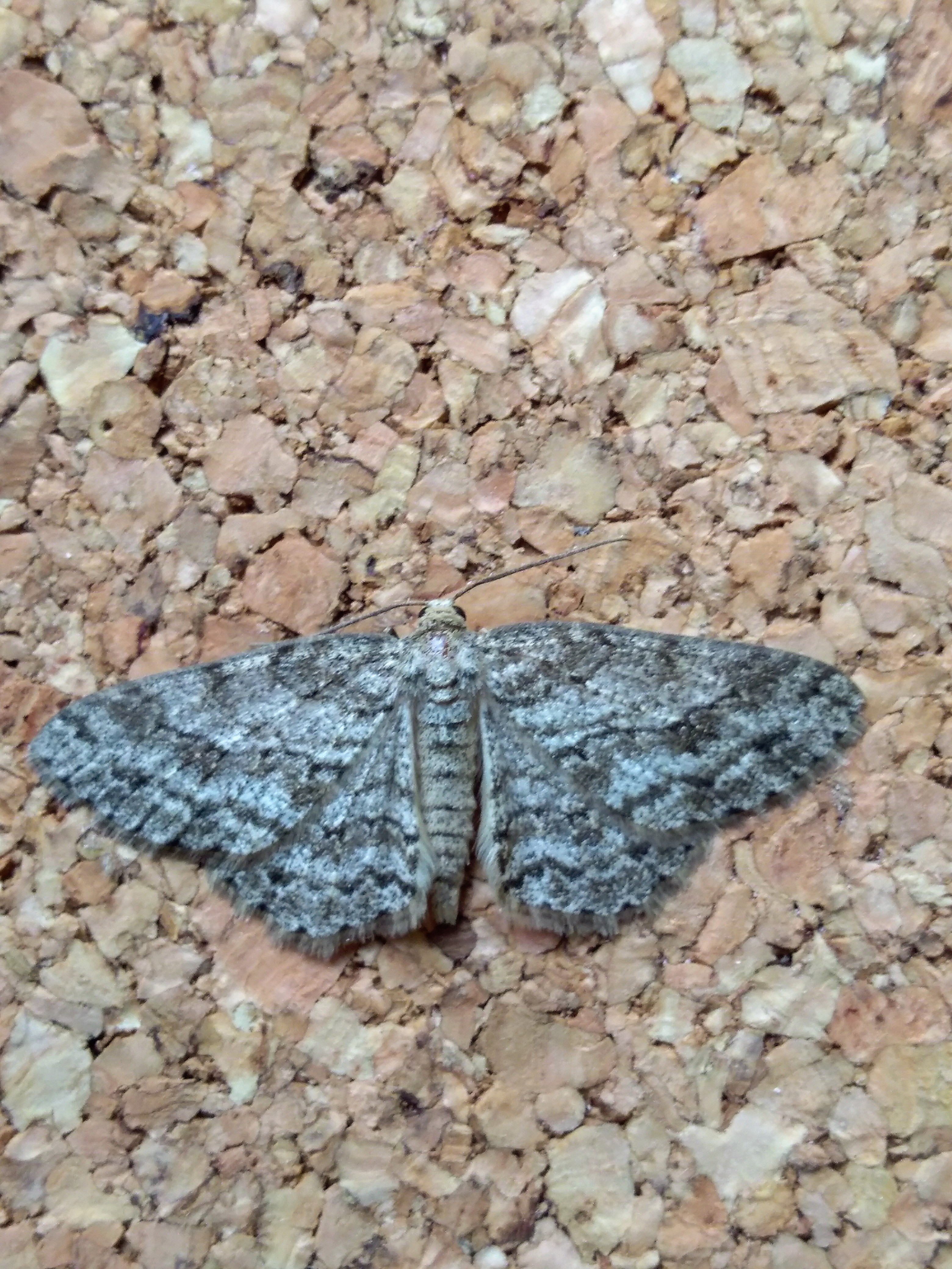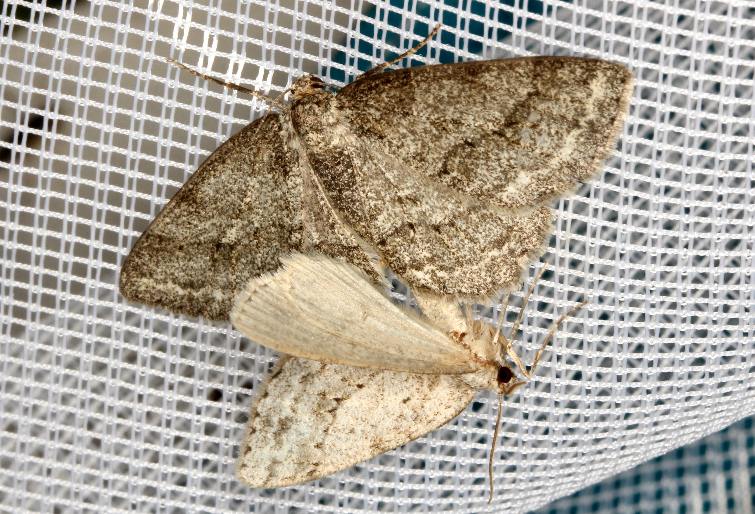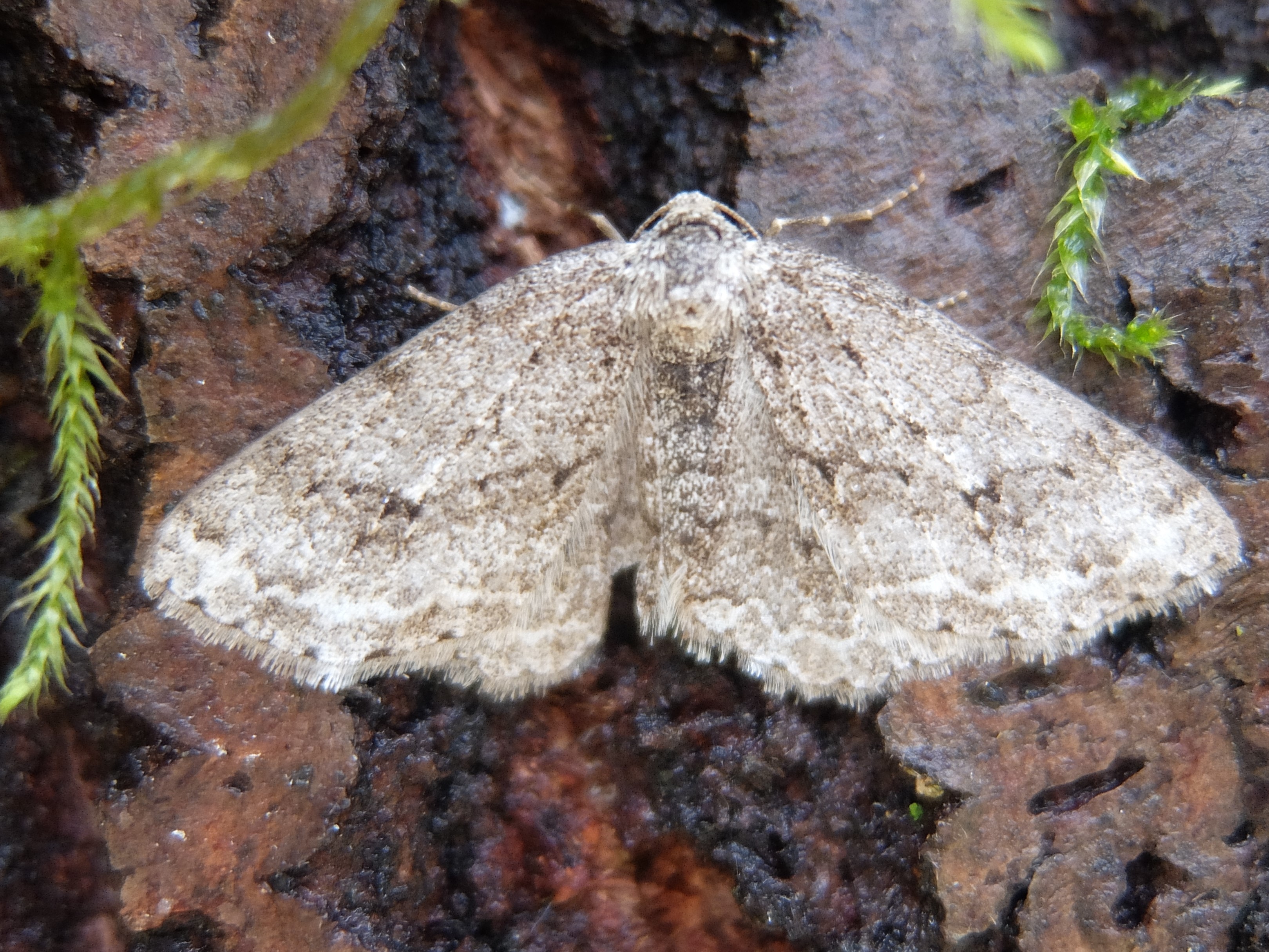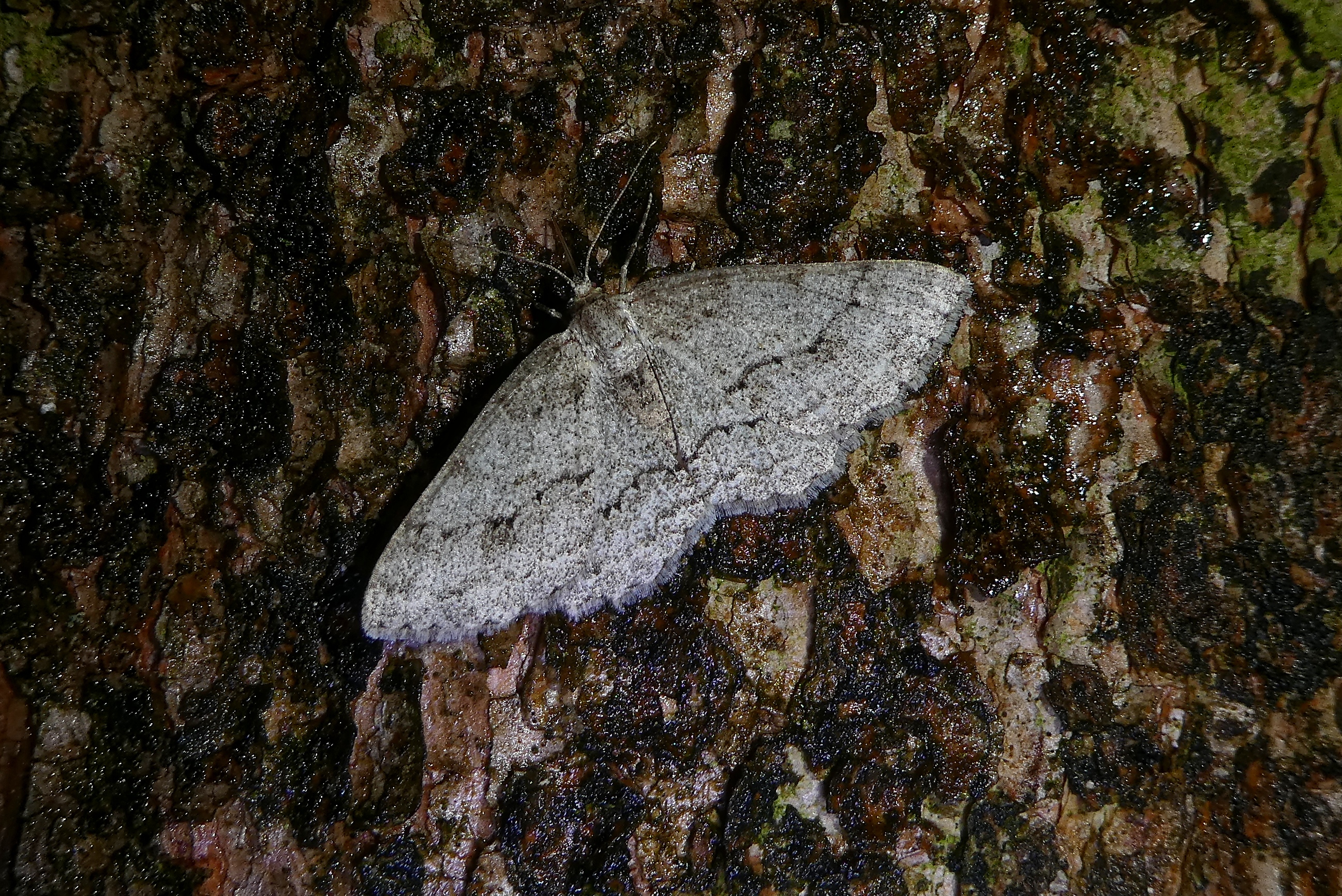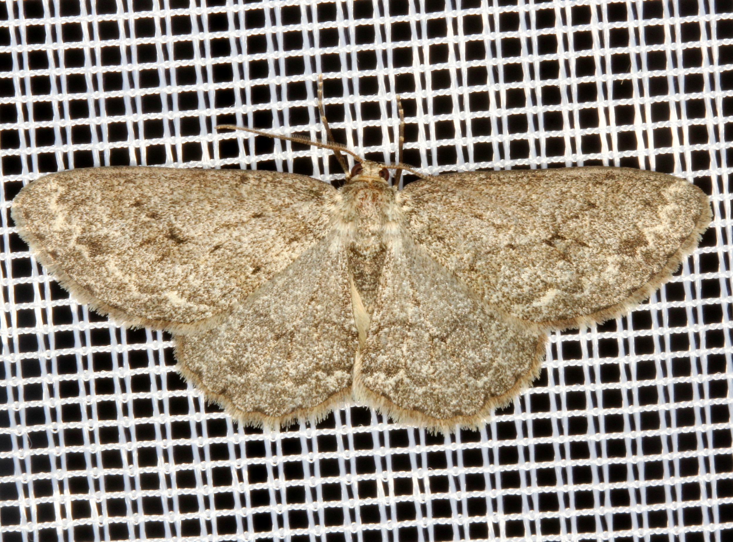 Ectropis crepuscularia (Denis & Schiffermüller, 1775), Chemnitz: Zeisigwald//Planitzwiese, 11.4.2018, seit Tagen frühsommerliche Temperaturen, passiver Lichtfang an hellem Gebäude, natürliche Farbe grau-grün