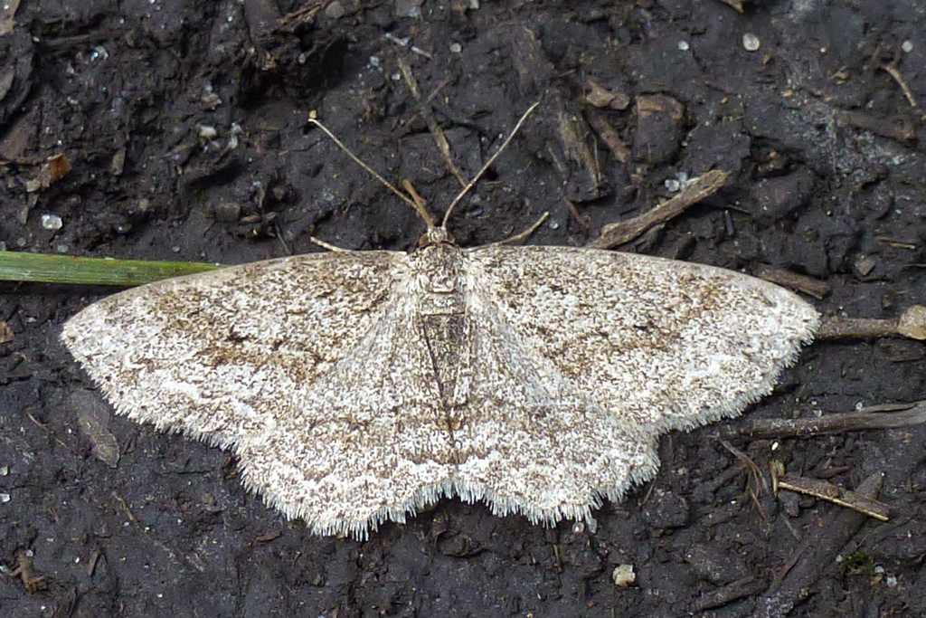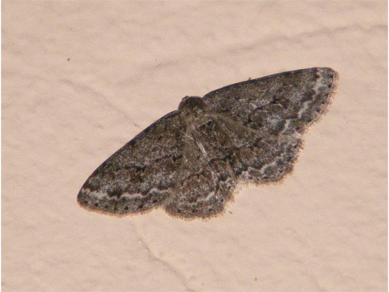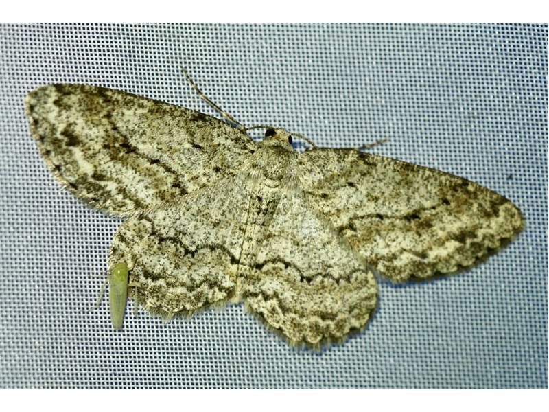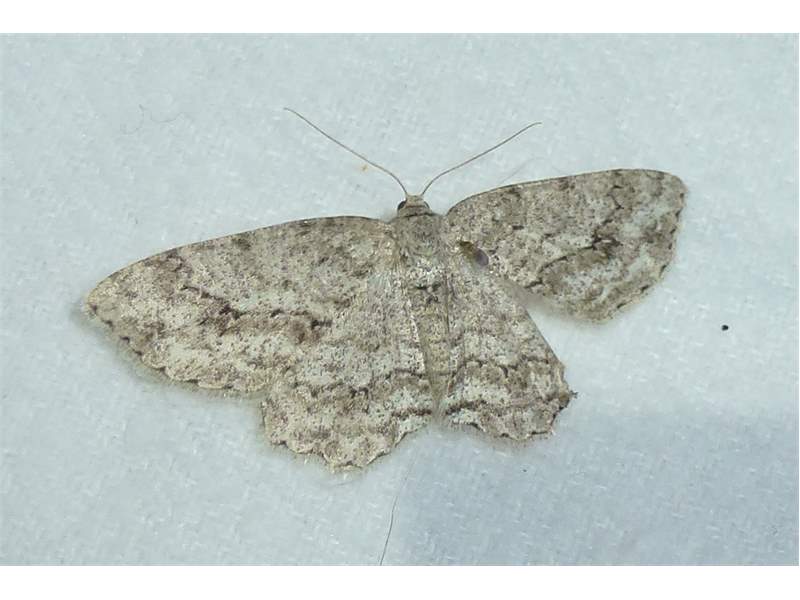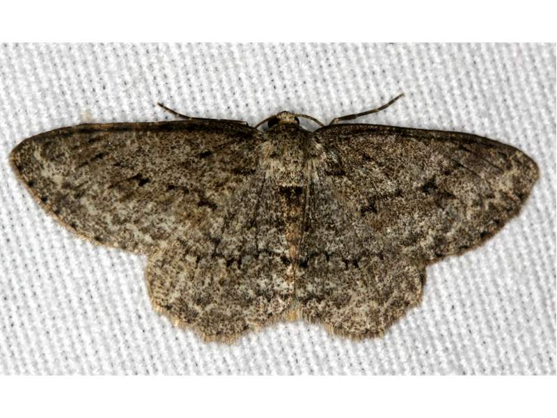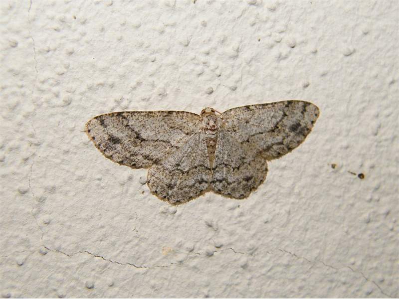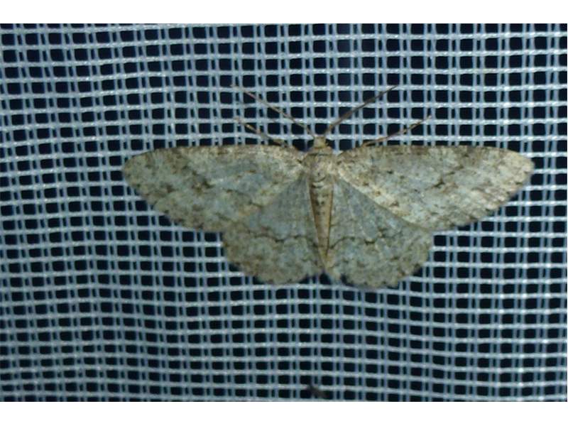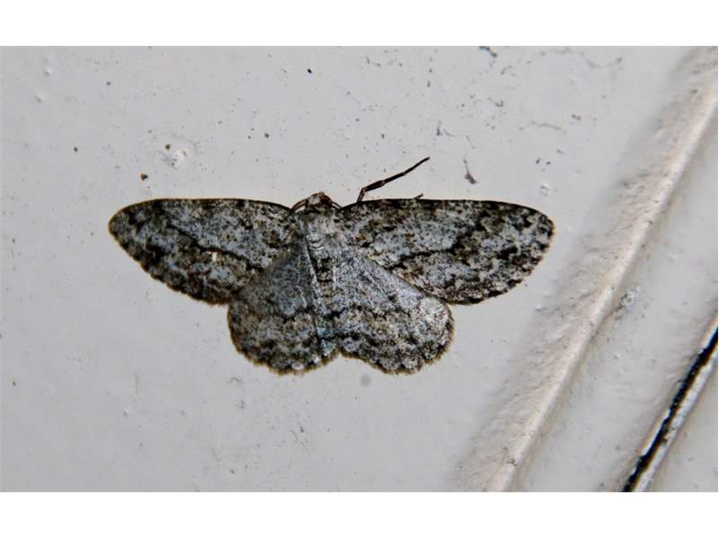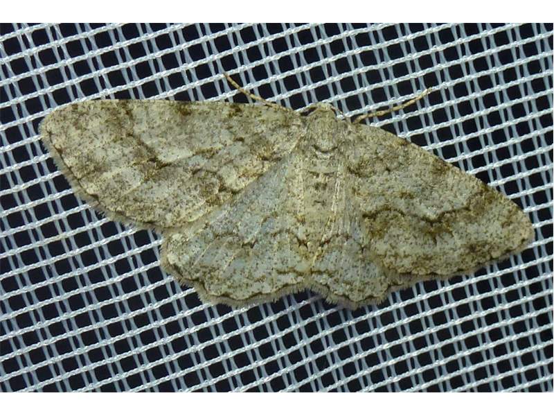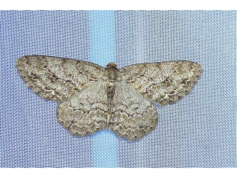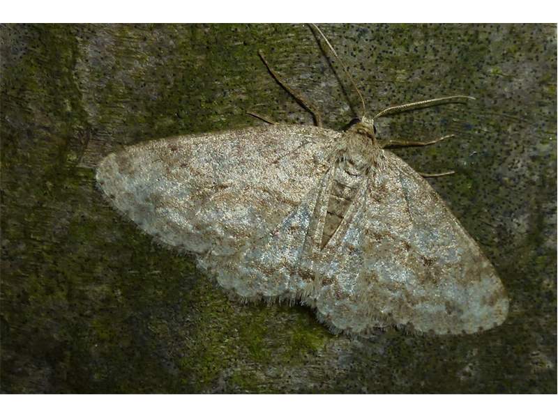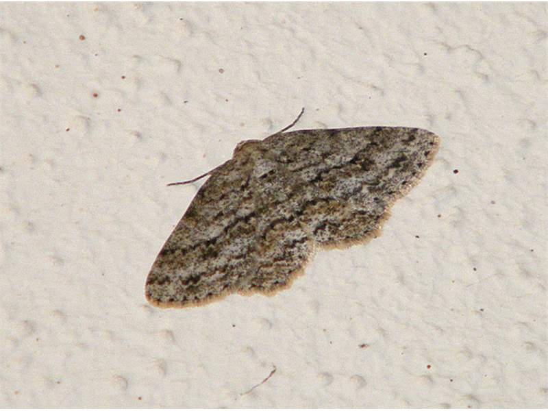 Ectropis crepuscularia (Denis & Schiffermüller, 1775), Chemnitz: Zeisigwald//Planitzwiese, 11.4.2018, seit Tagen frühsommerliche Temperaturen, passiver Lichtfang an hellem Gebäude, natürliche Farbe grau-grün (© Lutz Böttger, Chemnitz)( Bild vergrößern)