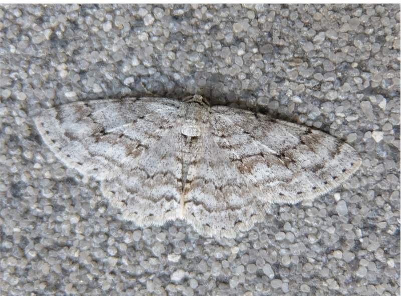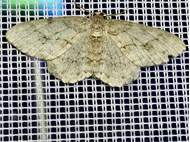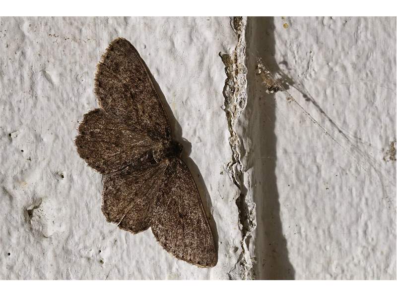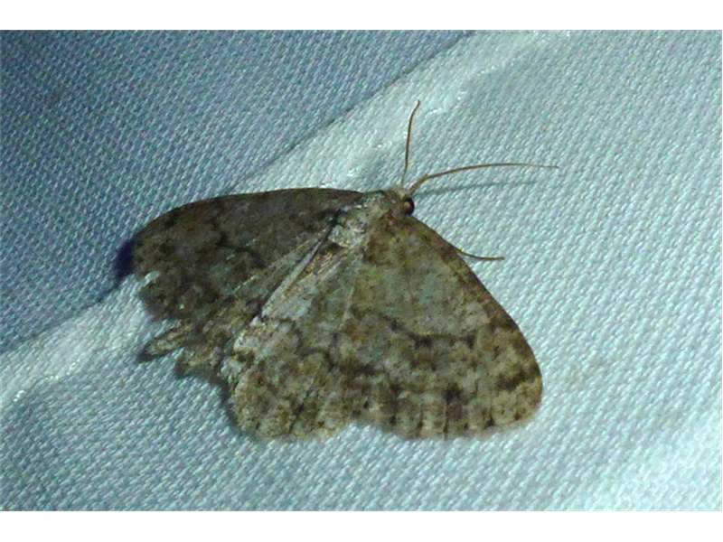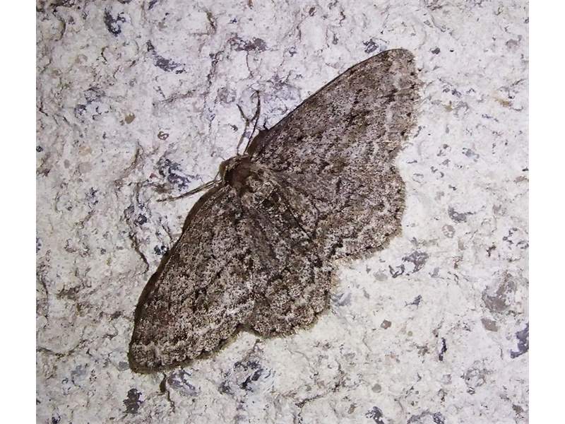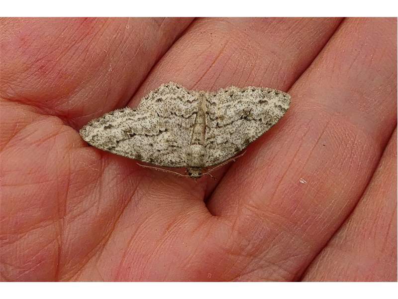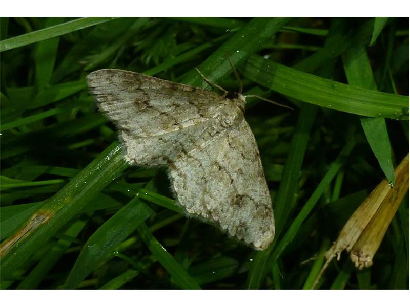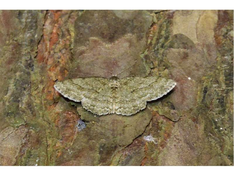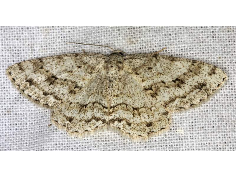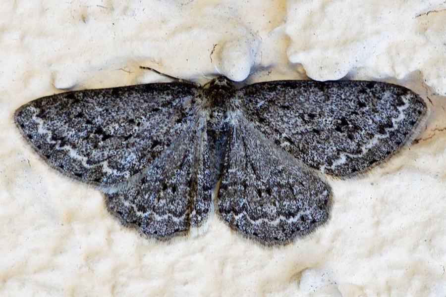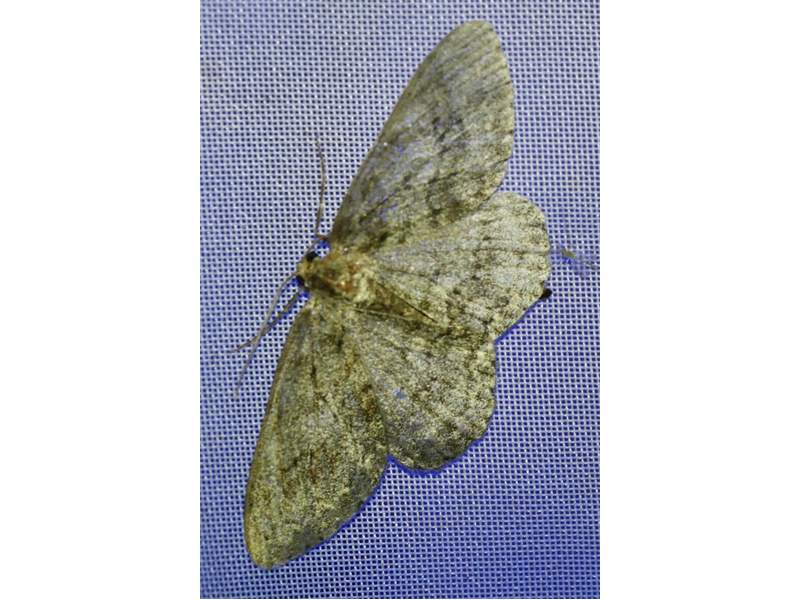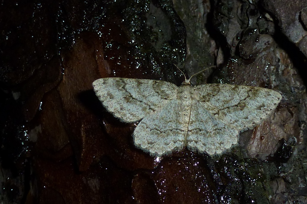 Ectropis crepuscularia (Denis & Schiffermüller, 1775), Chemnitz: Zeisigwald//Planitzwiese, 11.4.2018, seit Tagen frühsommerliche Temperaturen, passiver Lichtfang an hellem Gebäude, natürliche Farbe grau-grün (© Lutz Böttger, Chemnitz)( Bild vergrößern)
