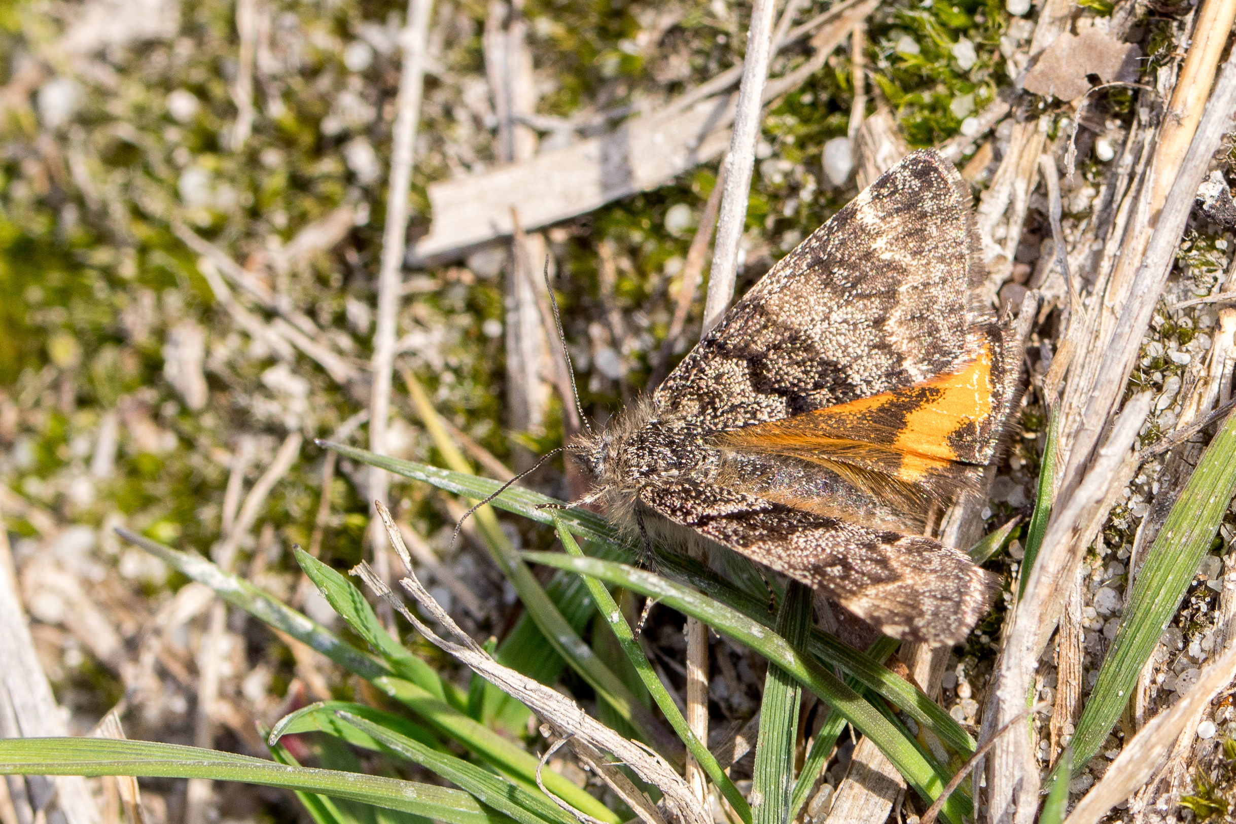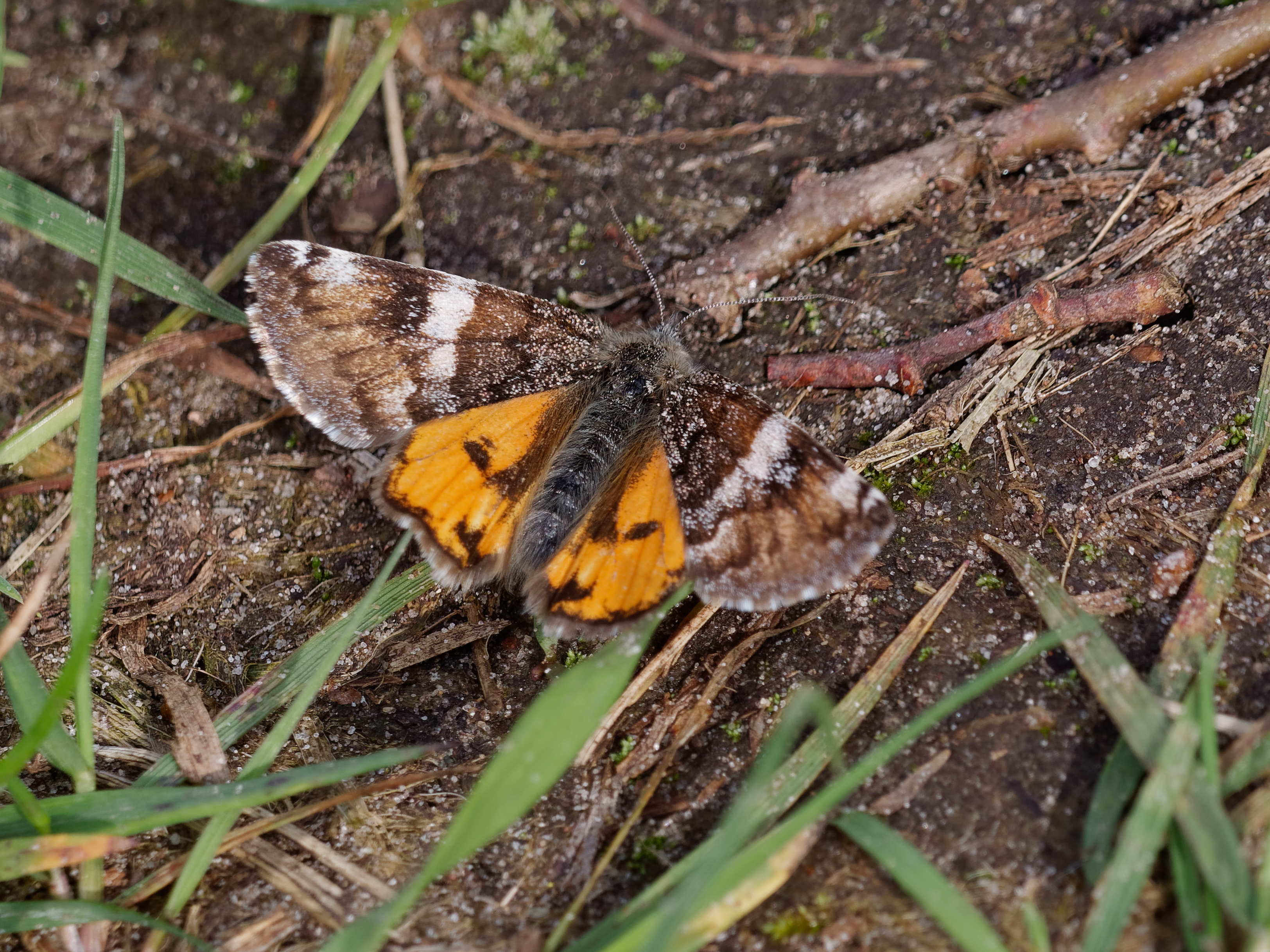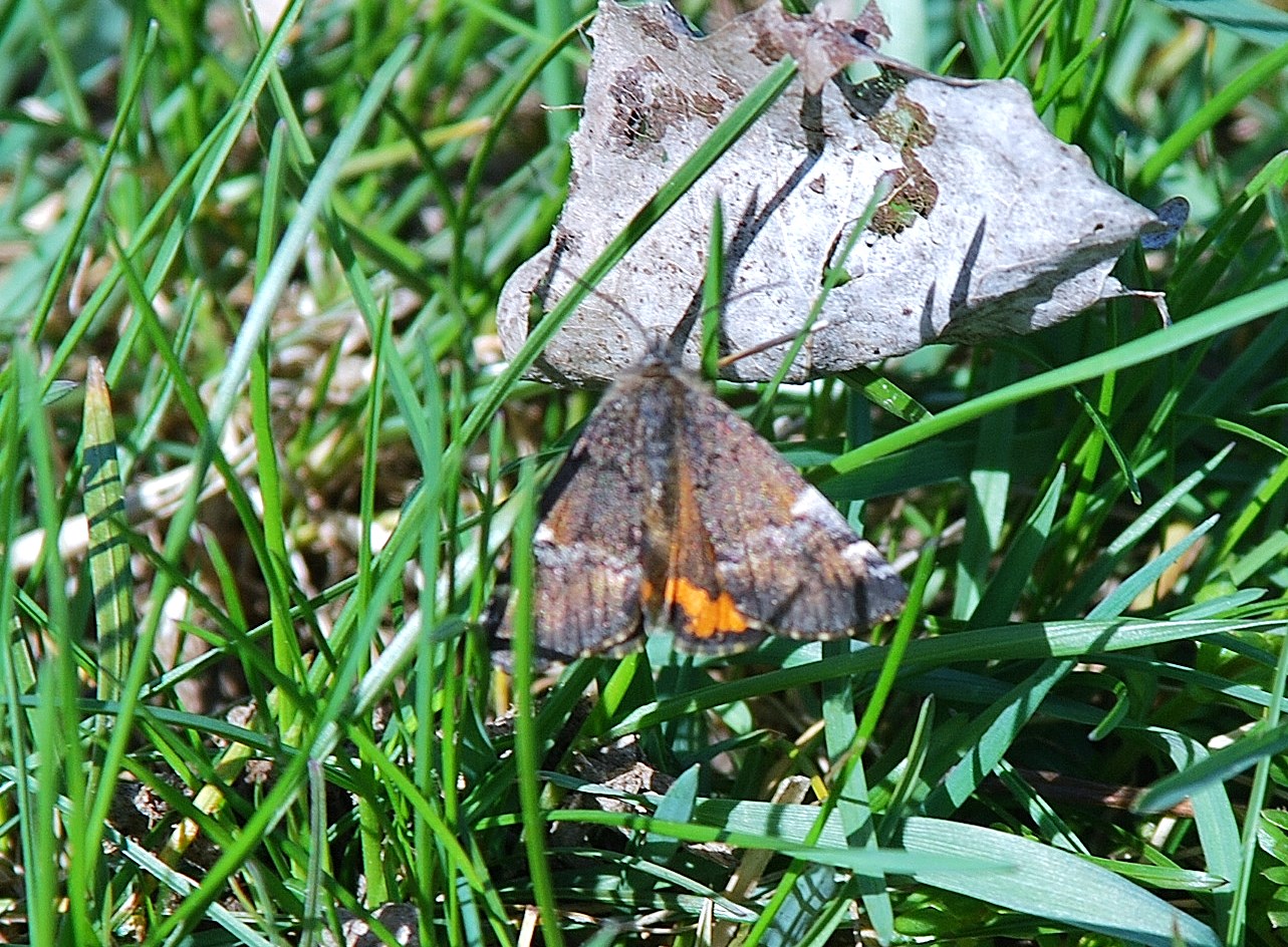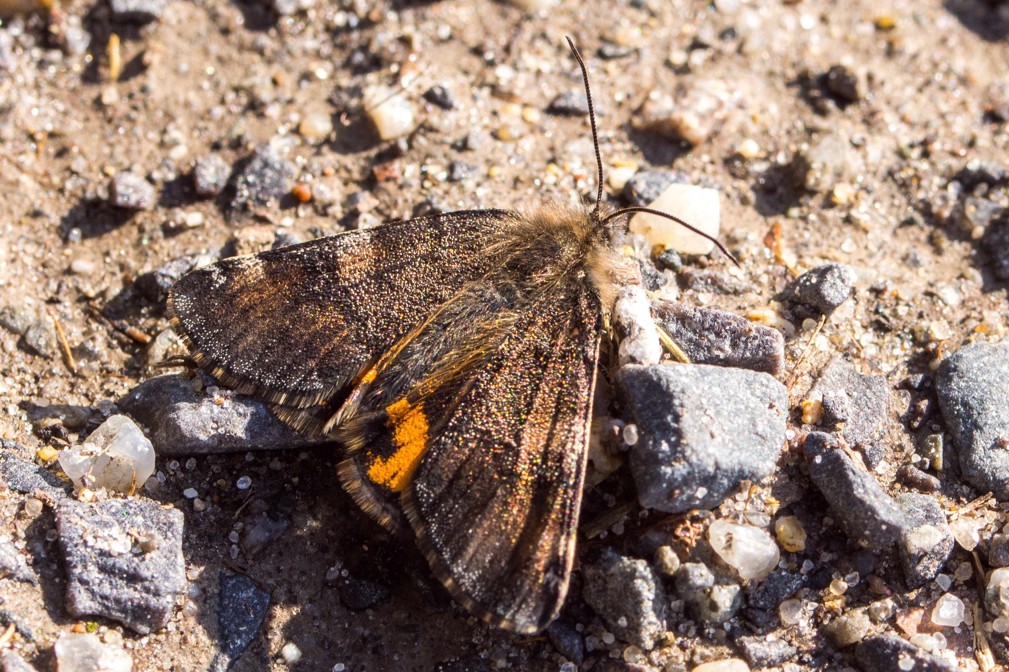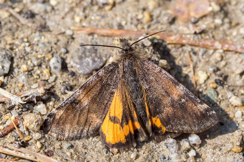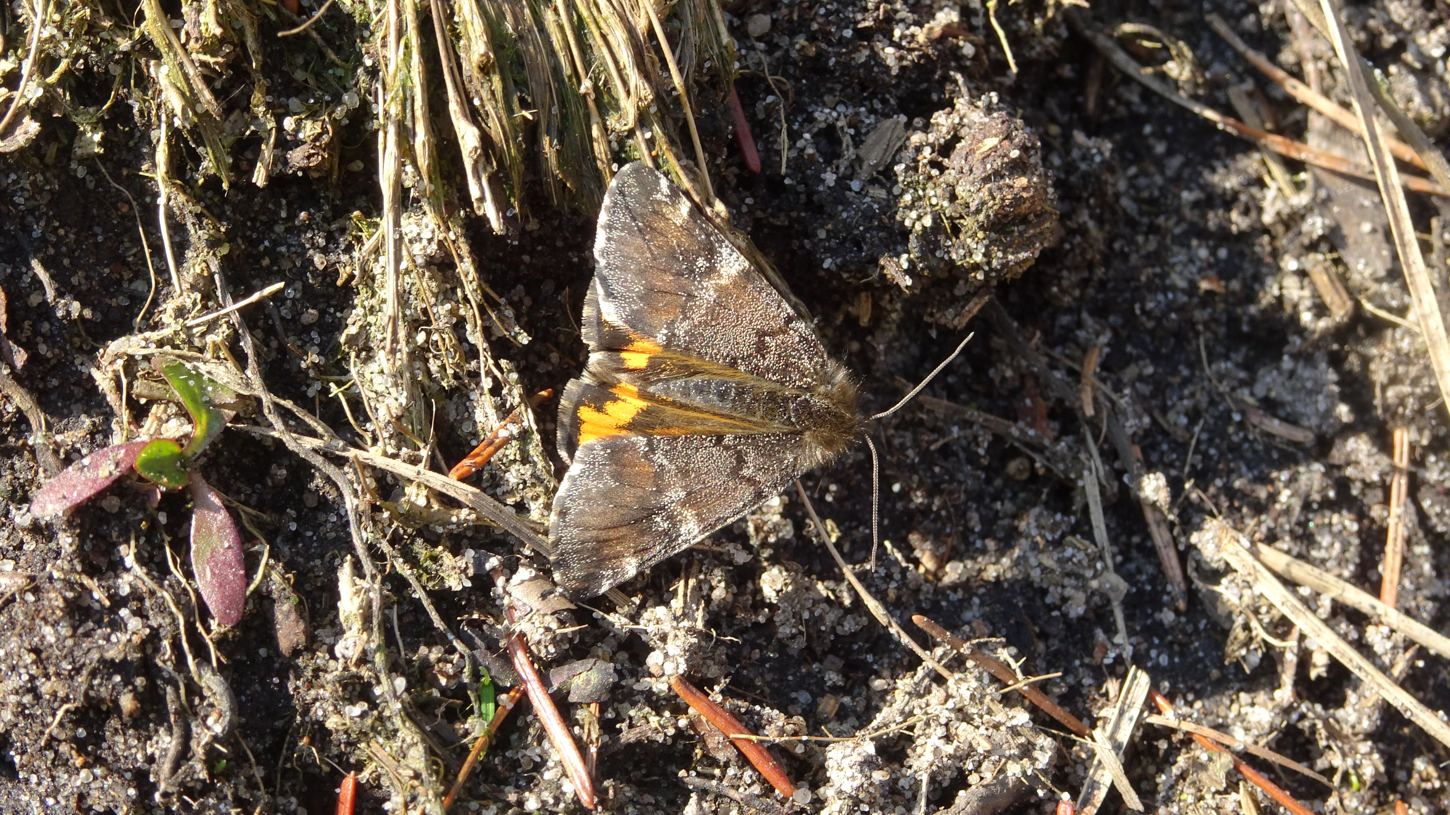 Großes Jungfernkind, auch Birken-Jungfernkind, Archiearis parthenias, Chemnitz-Zeisigwald nahe Euba, Forstschneise, mit Birken durchsetzter Mischwald, am Stapelholz, 30.März, 2018 (Raupen monophag an frischen Birkenblättern)