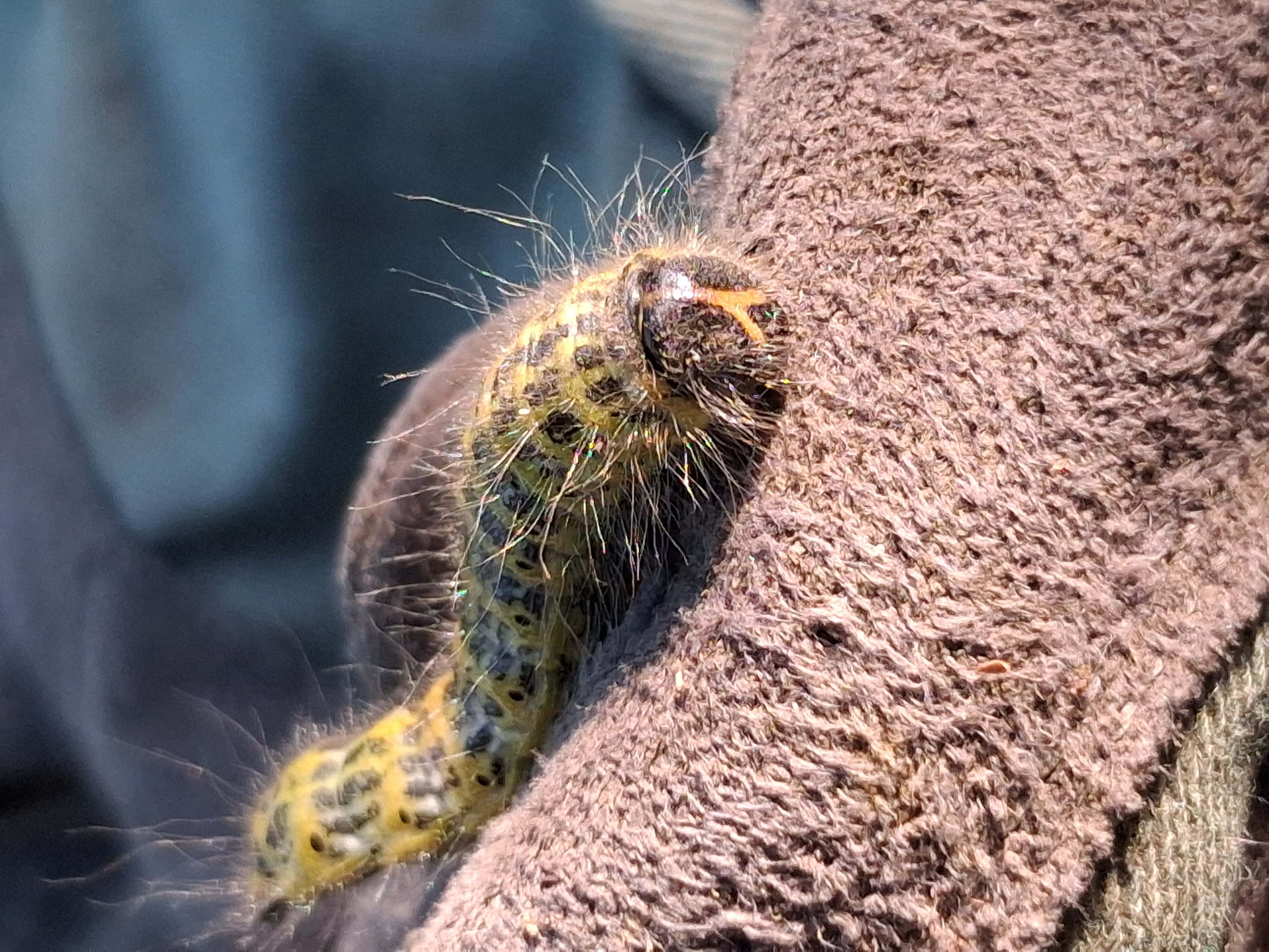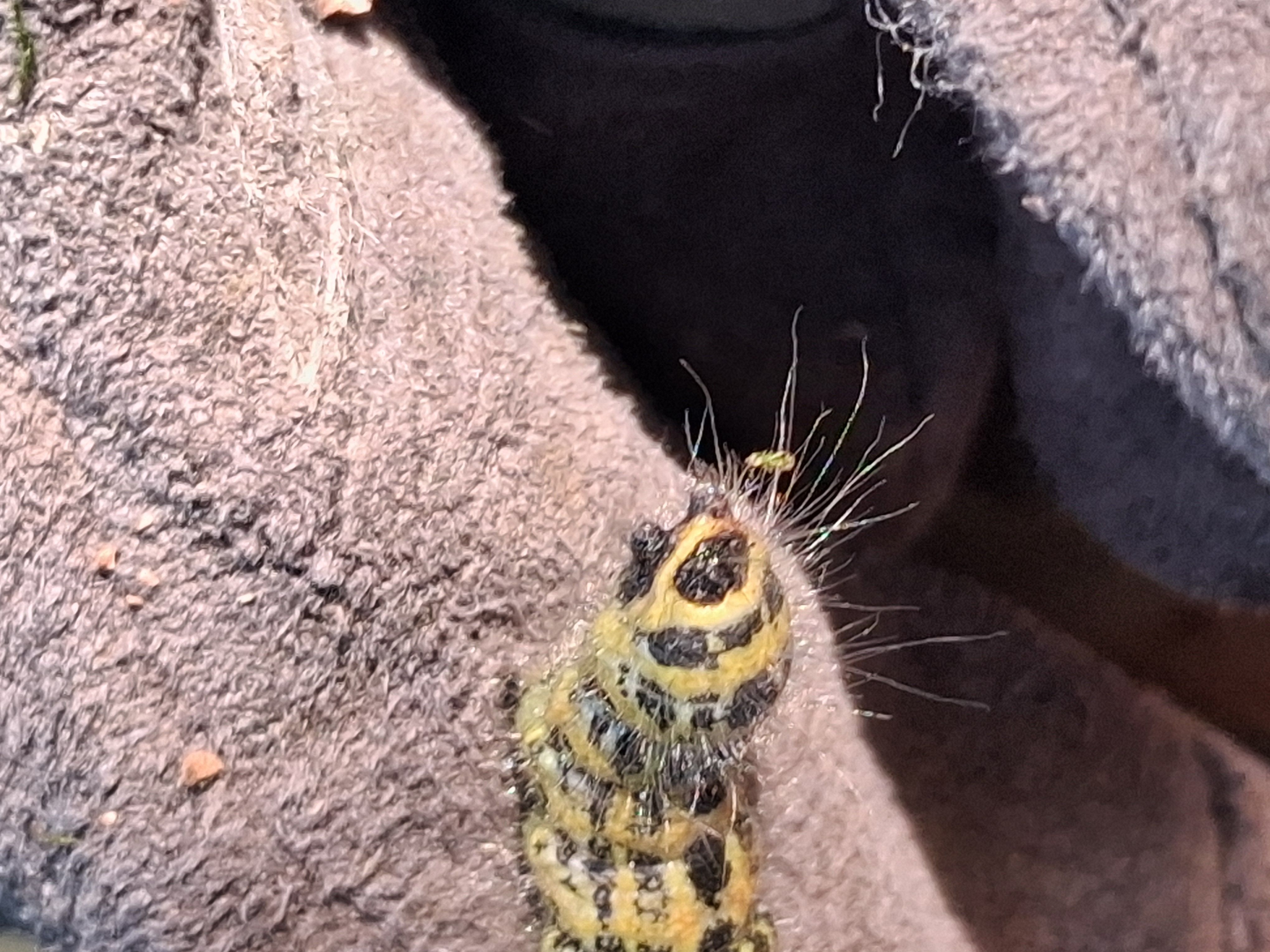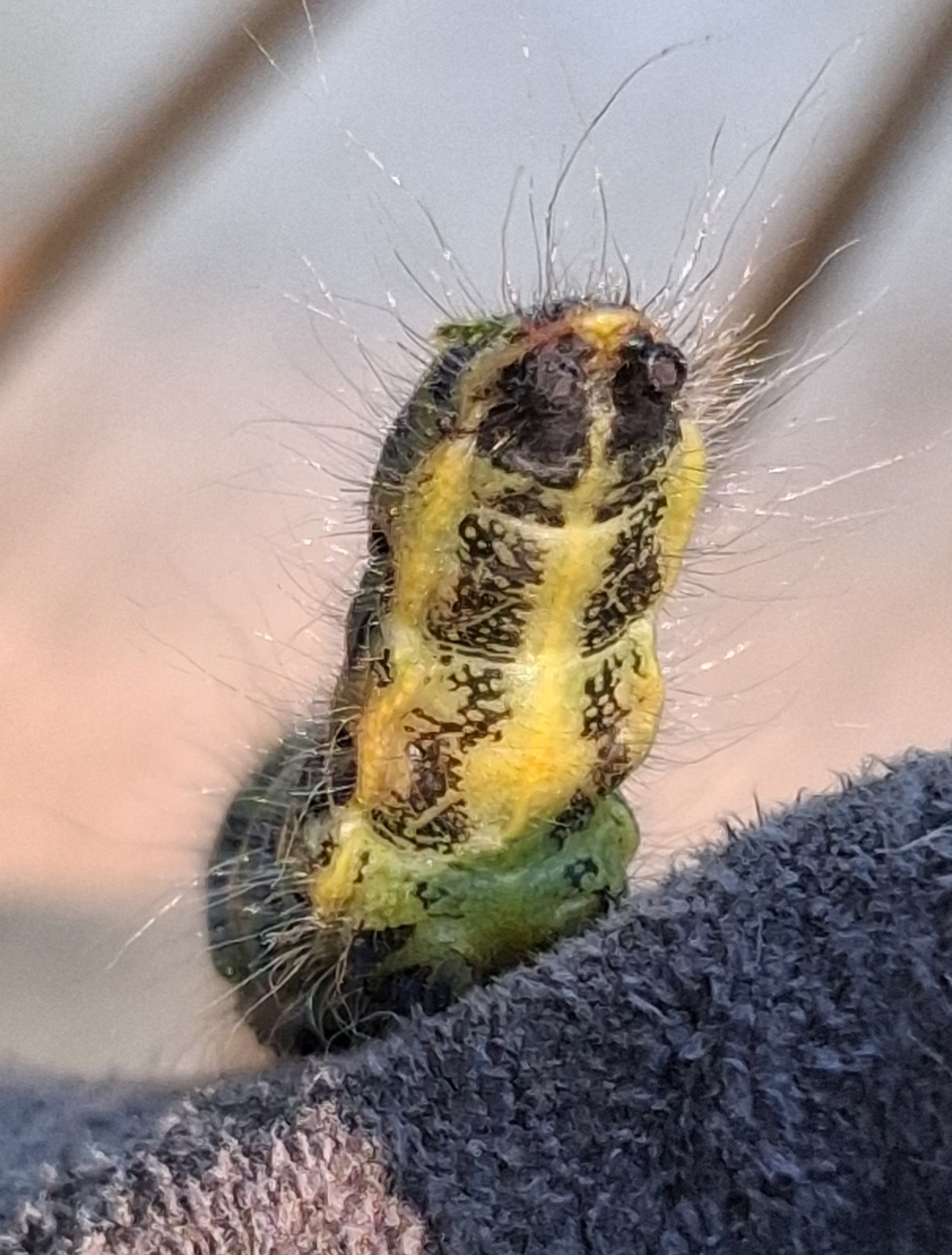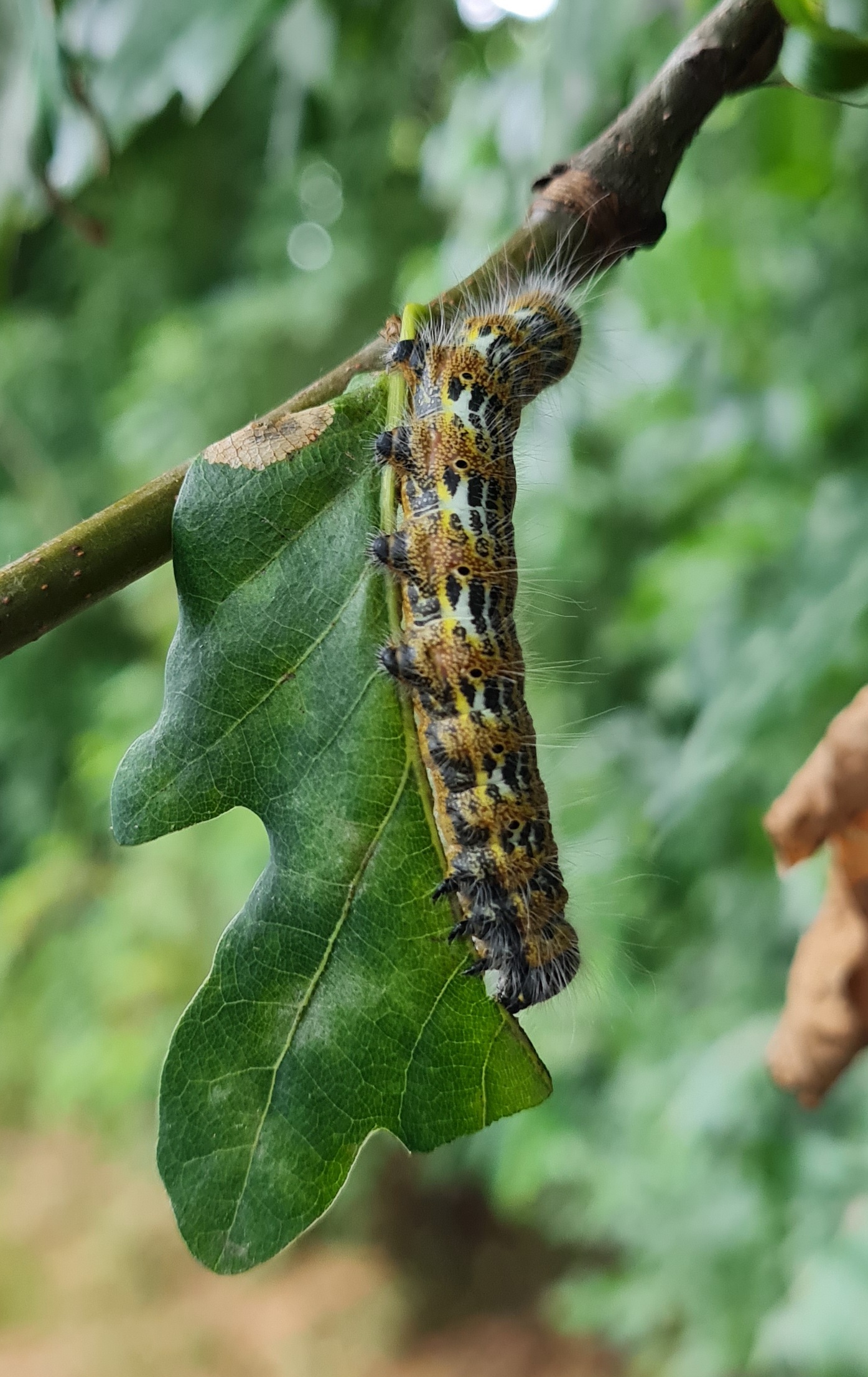 Mondvogel (Phalera bucephala (Linnaeus, 1758)), jüngeres Raupenstadium, an Eichenaufwuchs, Hochhalde Trages bei Espenhain, August 2018