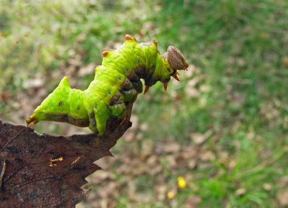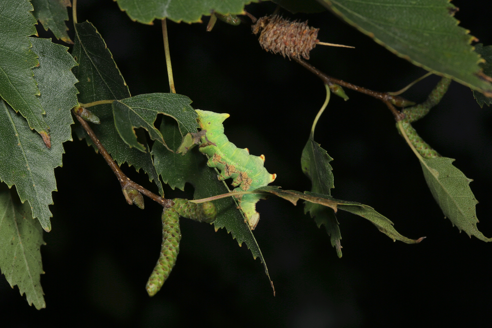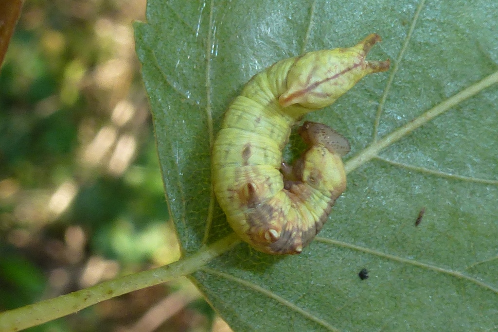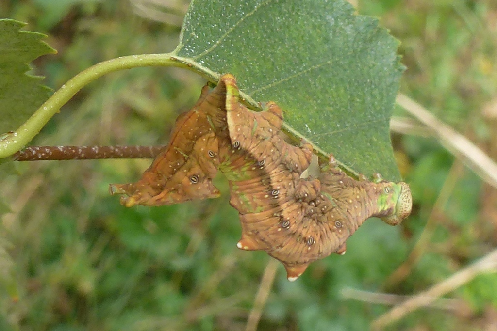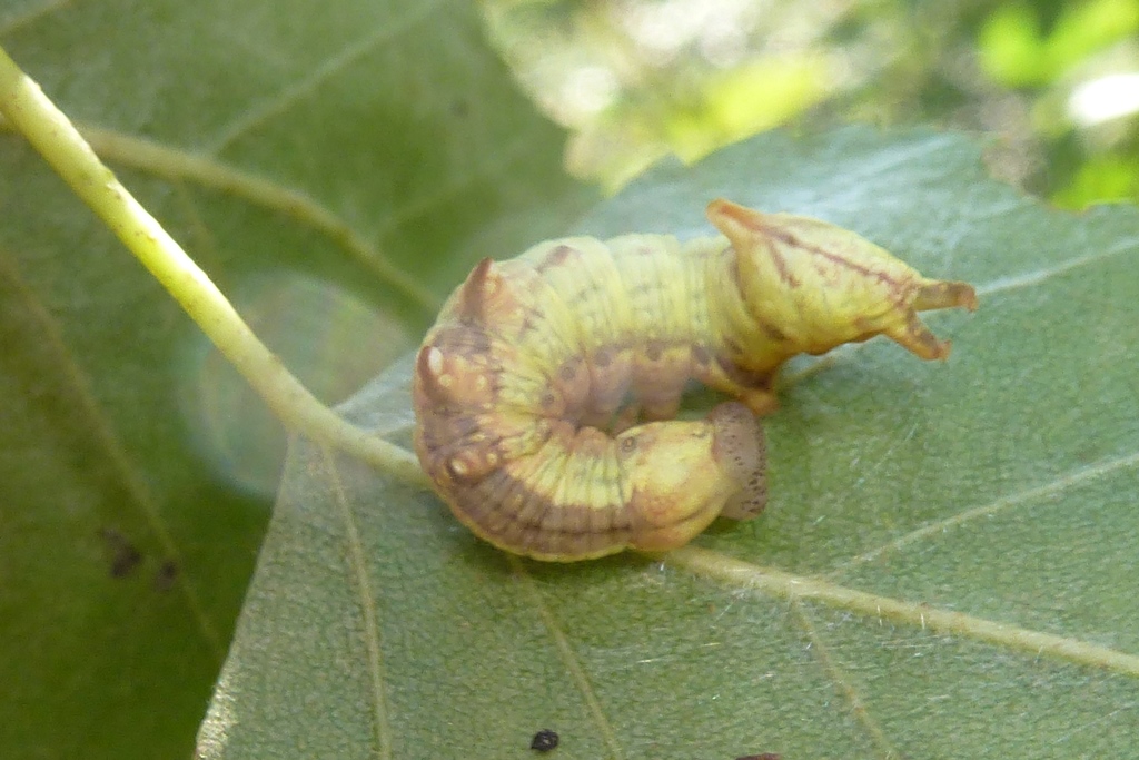 Larve des Dromedar-Zahnspinners (Notodonta dromedarius) auf Betula pendula, Friedhof an der Stadtkirche Großröhrsdorf im September 2014