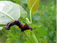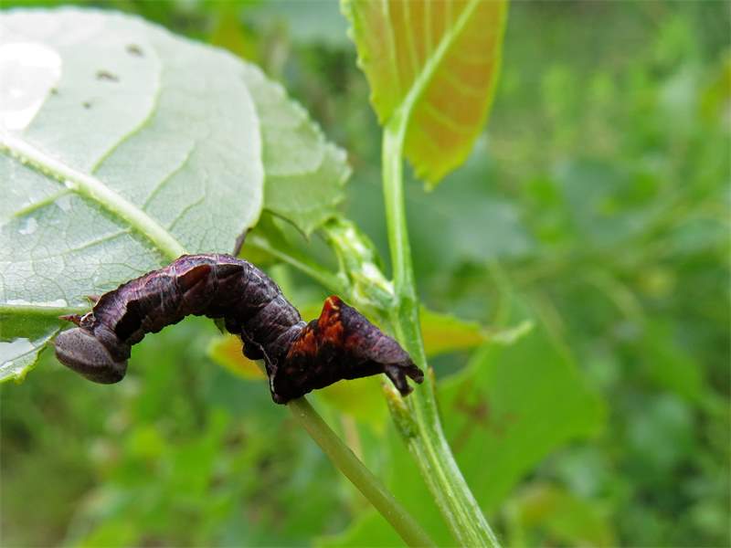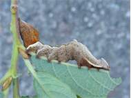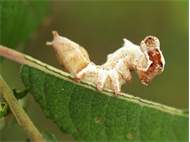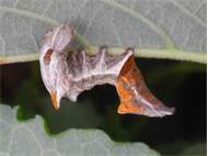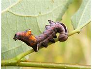 Larve des Zickzack-Zahnspinners bei der Nahrungsaufnahme an einem Pappelblatt, Hochhalde Trages bei Espenhain, Juni 2015
