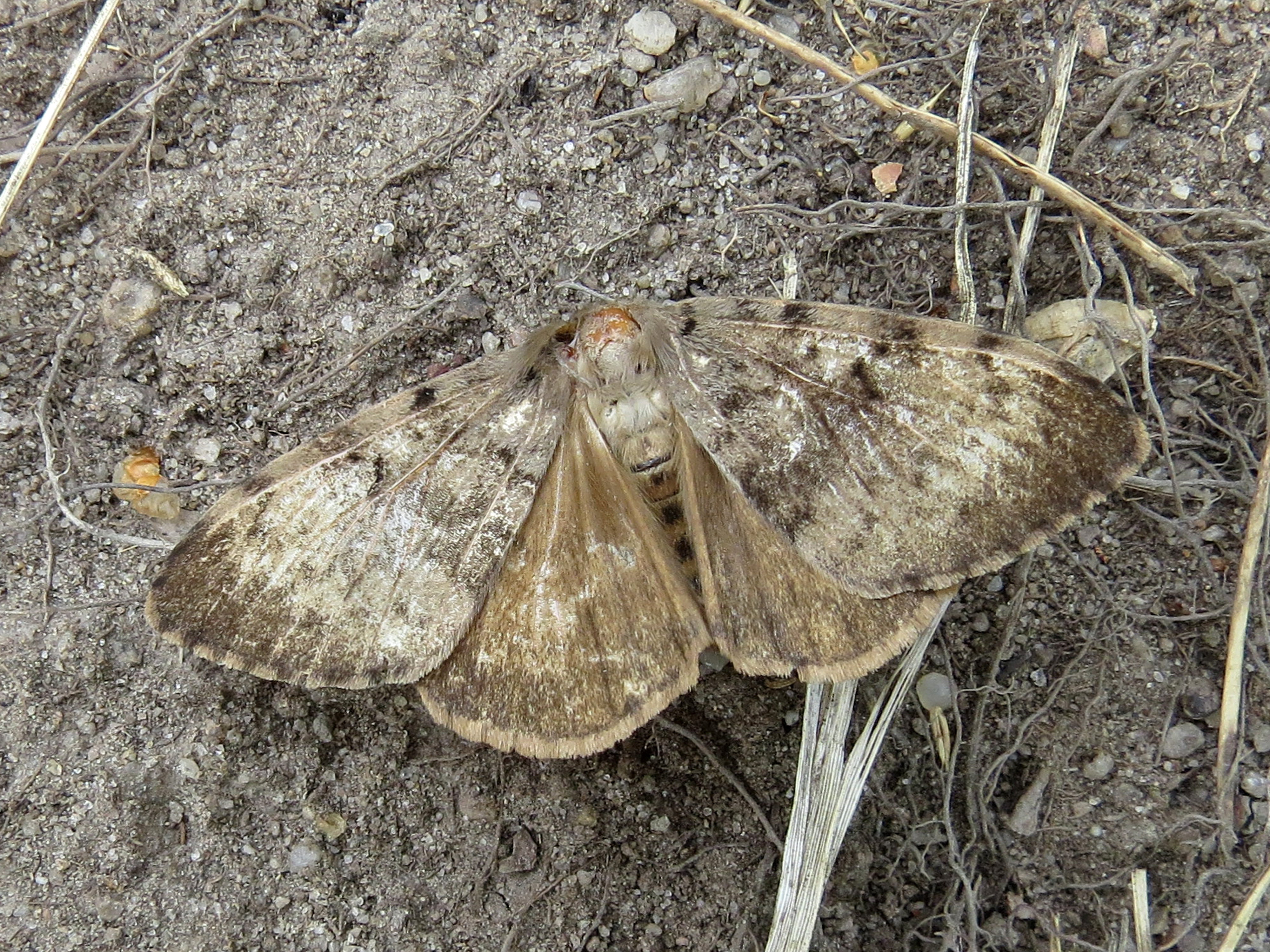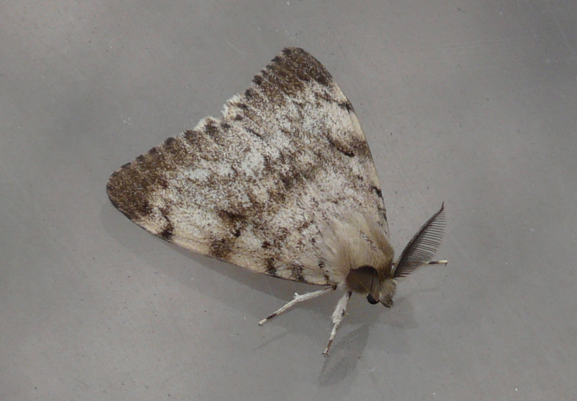 Männchen: Fühler doppelseitig gekämmt. Flügel weißgrau bis graubraun. Vorderflügel mit 4 gezackten dunklen, unterschiedlich deutlichen Querlinien; zwischen der 1. (innersten) und der 2. (nächsten) Querlinie ist in der Nähe des Vorderrandes stets ein dunkler Punkt; in der 2. Querlinie nahe des Vorderrandes stets eine zur Flügelbasis gerichtete Zacke. Flügelfransen deutlich gescheckt.