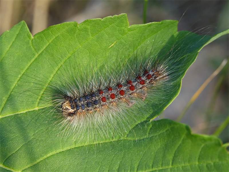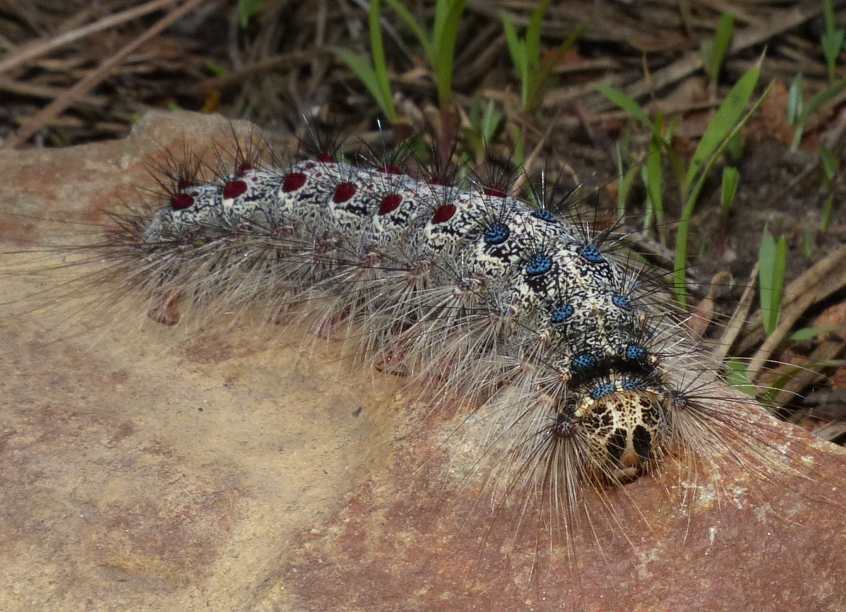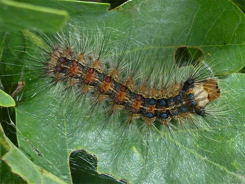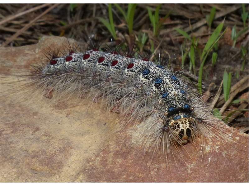 Erwachsene Larven tragen auf dem Rücken vom Kopf aus gesehen zunächst vier Paare blauer Drüsen danach sechs Paare rotbrauner Drüsen aus denen zahlreiche dunkle Borsten ragen. Der Larvenkörper ist mit zahlreichen haarförmigen Borsten besetzt.