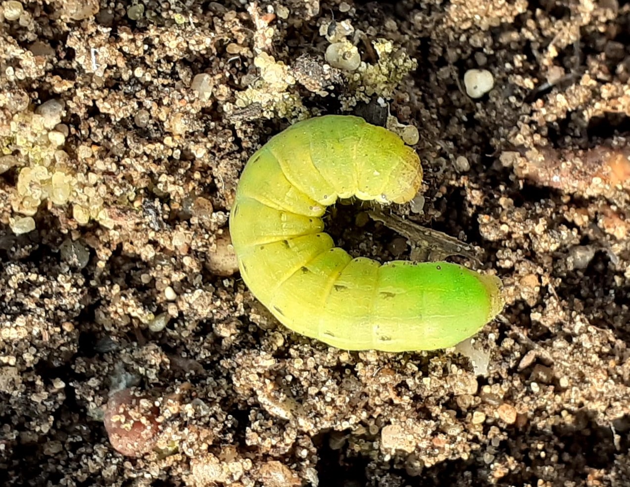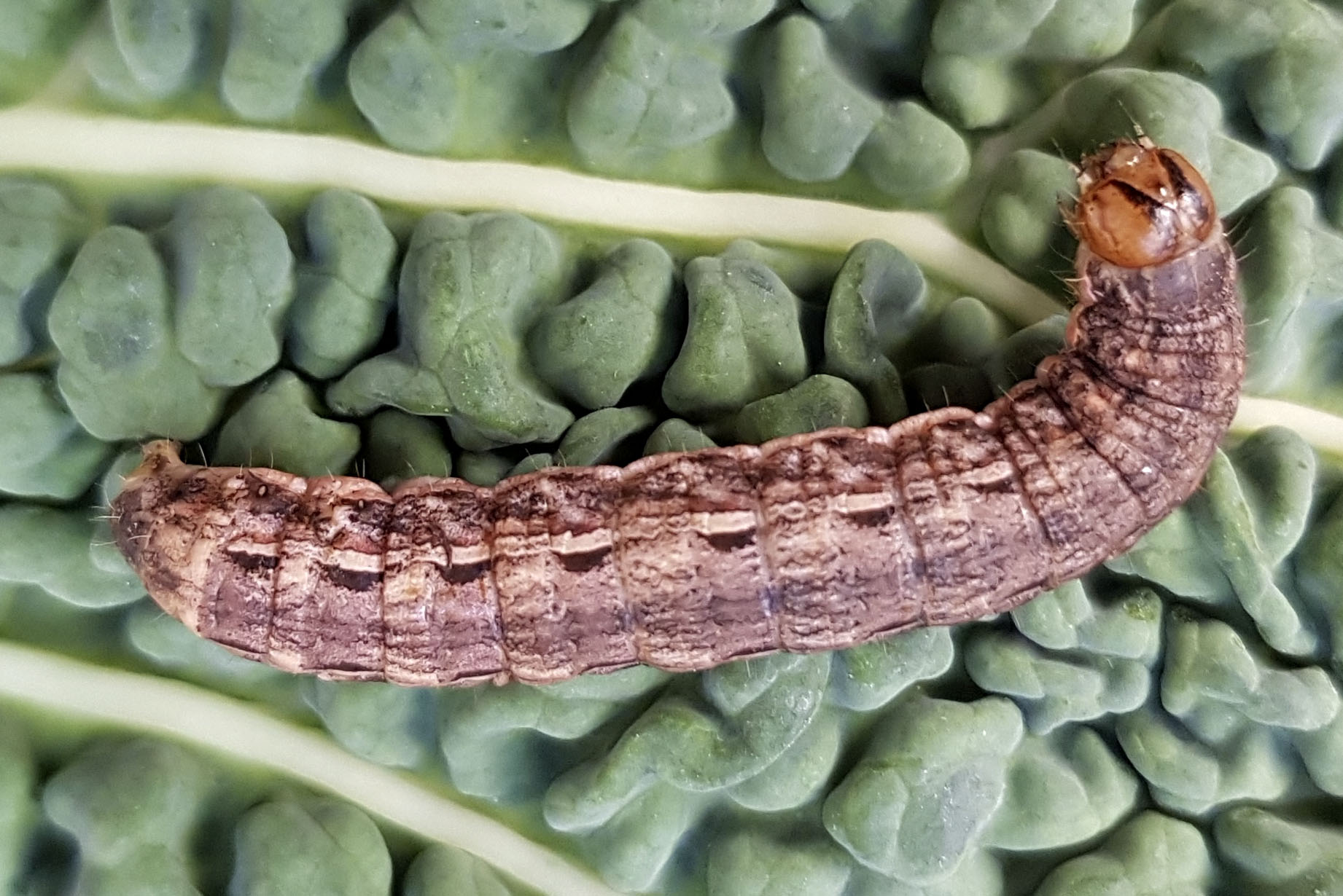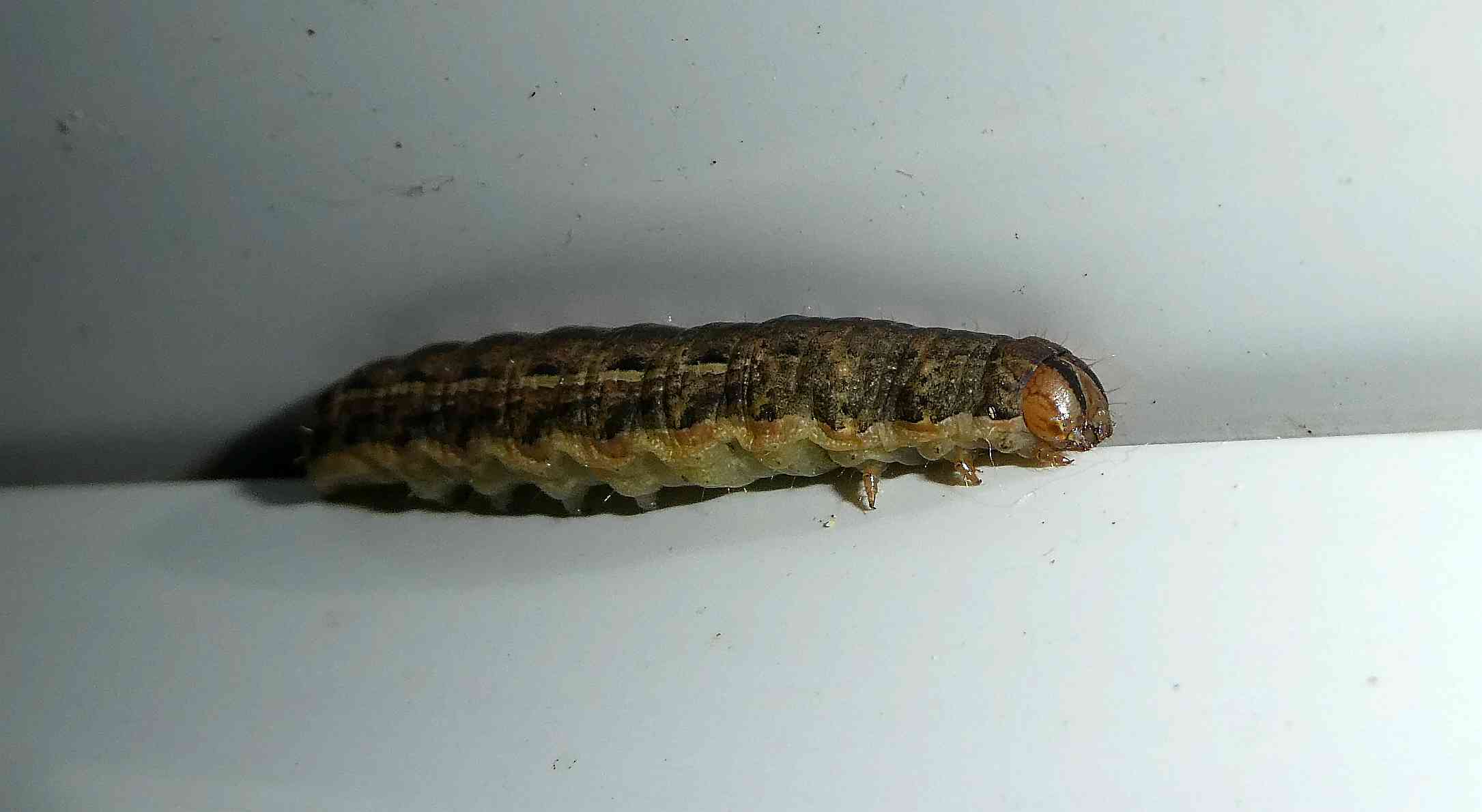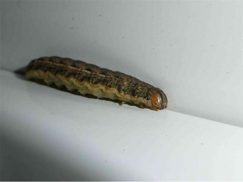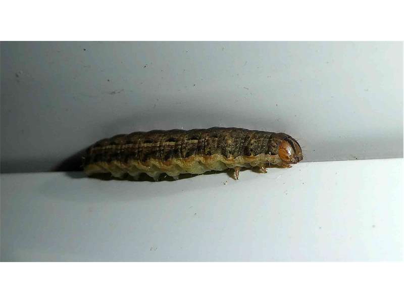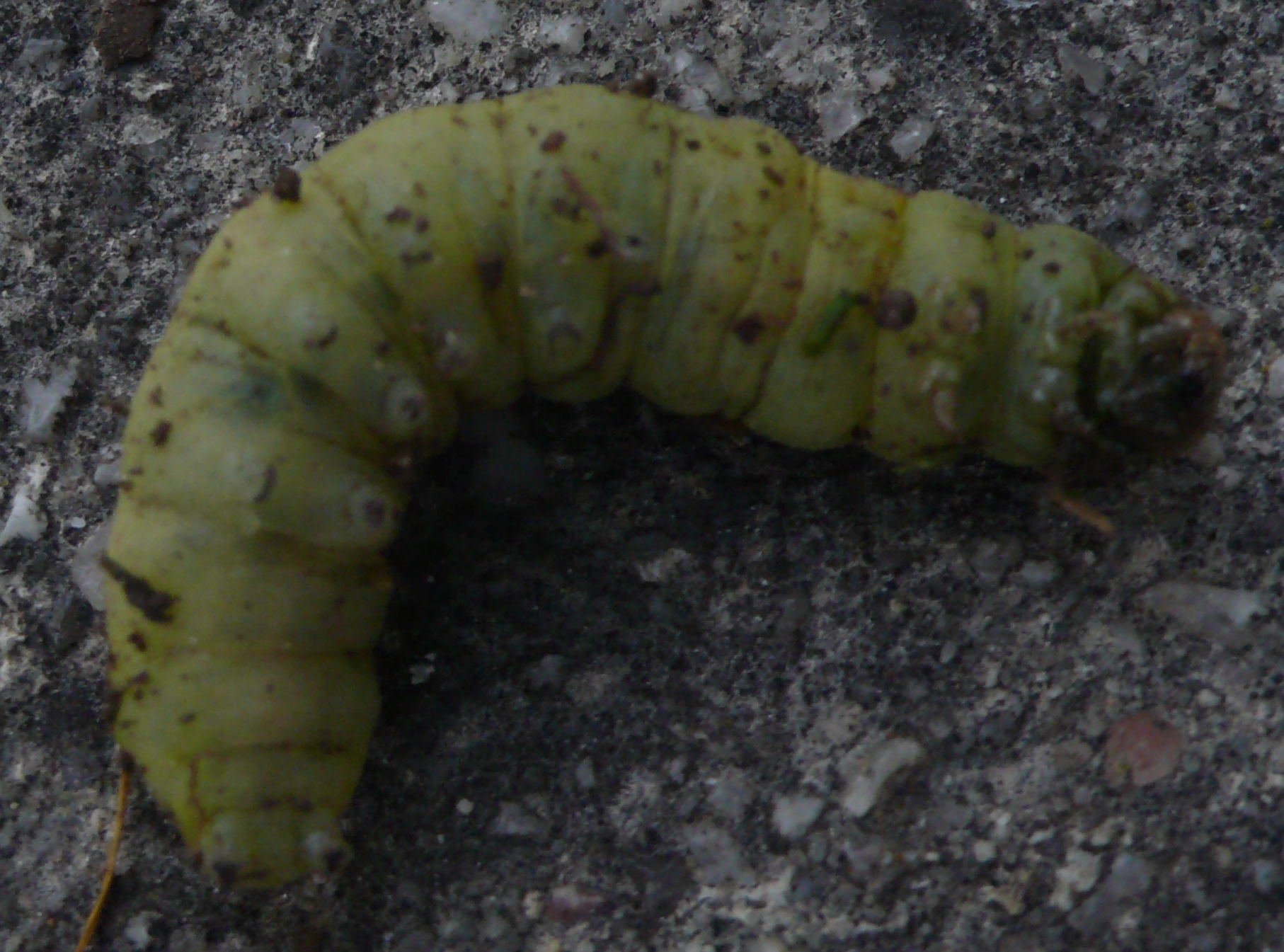 Hausmutter (Noctua pronuba (Linnaeus, 1758)), Larve (grüne Form), die sich frei bewegte, Radeberg, Dezember 2015.