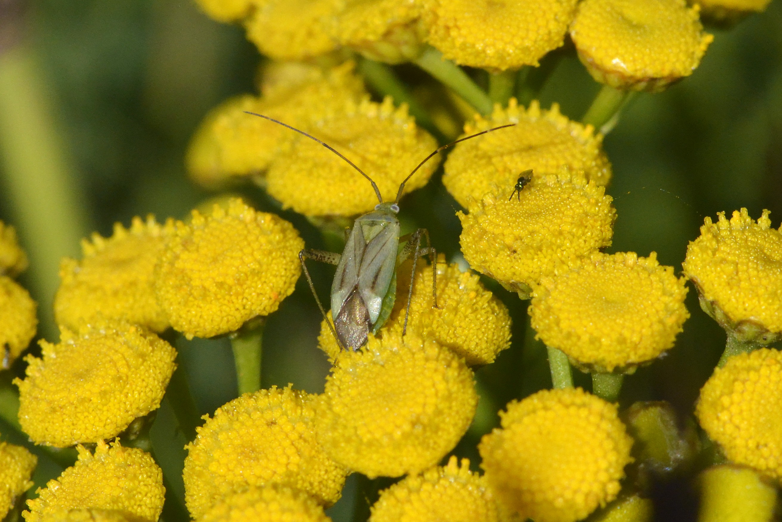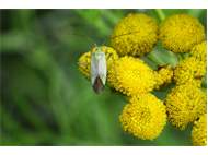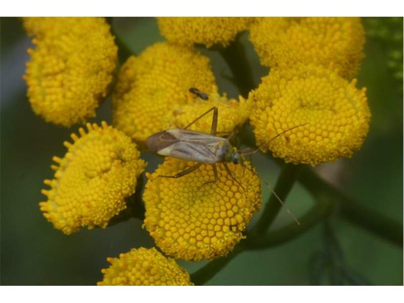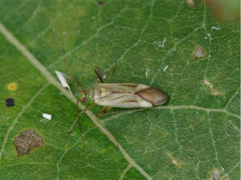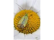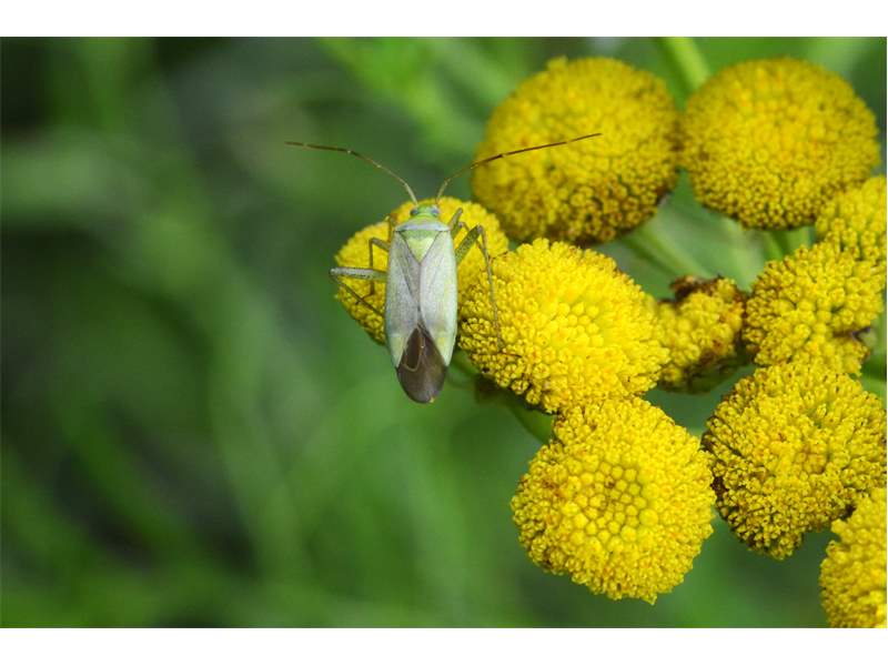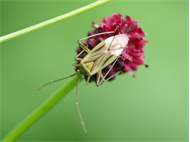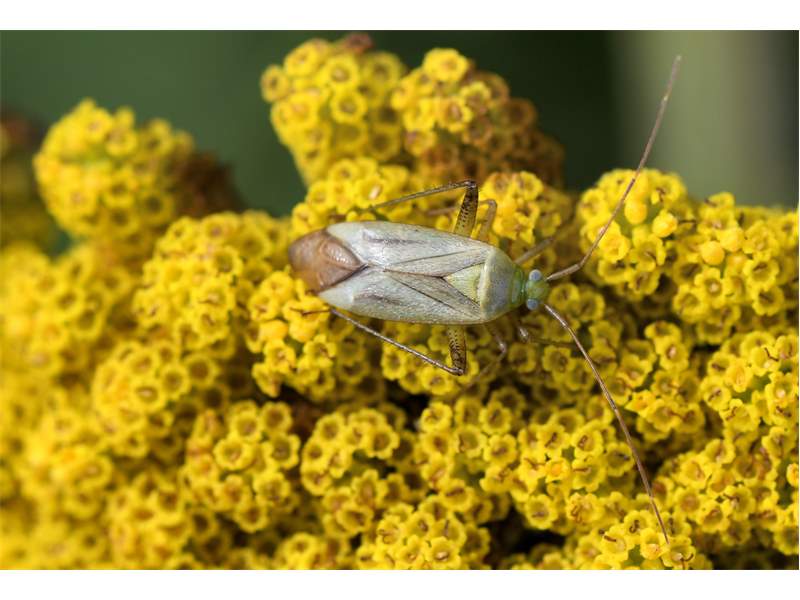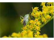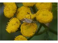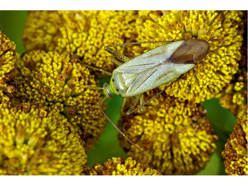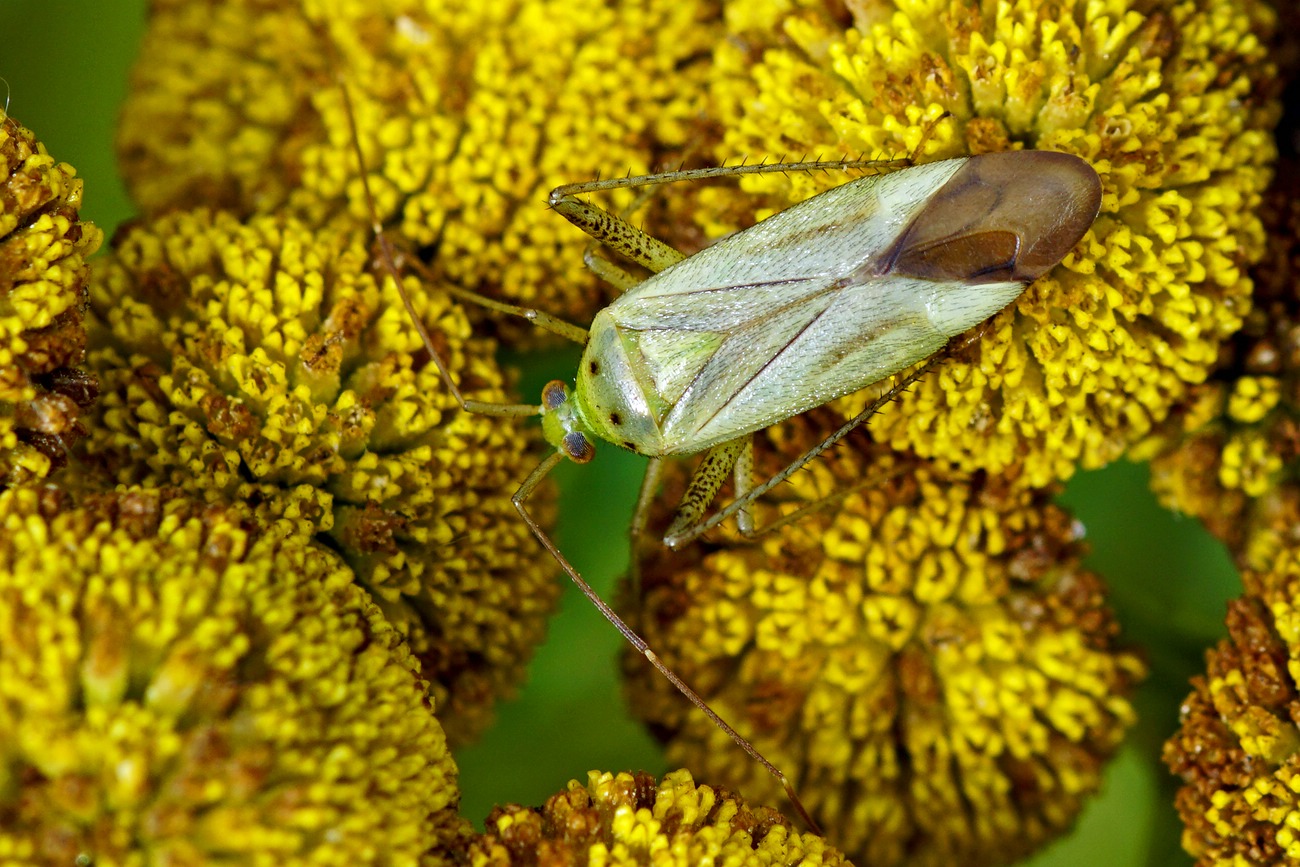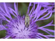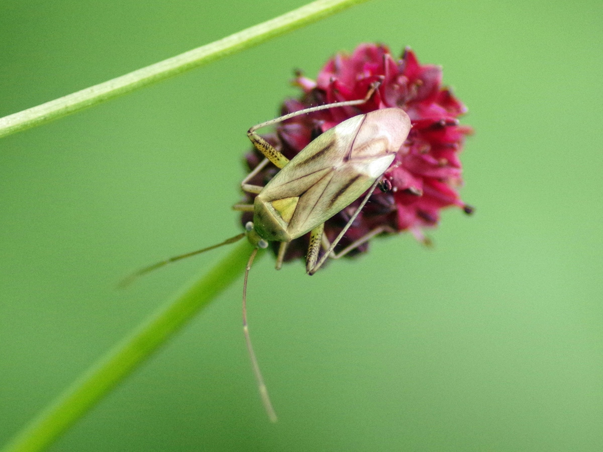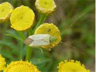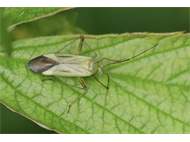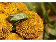 Exemplar von Adelphocoris quadripunctatus mit nur zwei deutlichen Punkten auf dem Halsschild sitzend auf auf Wiesenmargerite ( Leucanthemum vulgare s.l.), Ruderalflur an Straße Burgstädt-Lunzenau östlich Heiersdorf (Deutschland, Sachsen, Landkreis Mittelsachsen), 20.07.2009 (© Michael Münch)( Bild vergrößern)