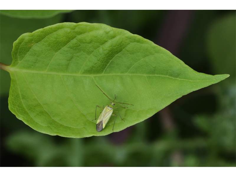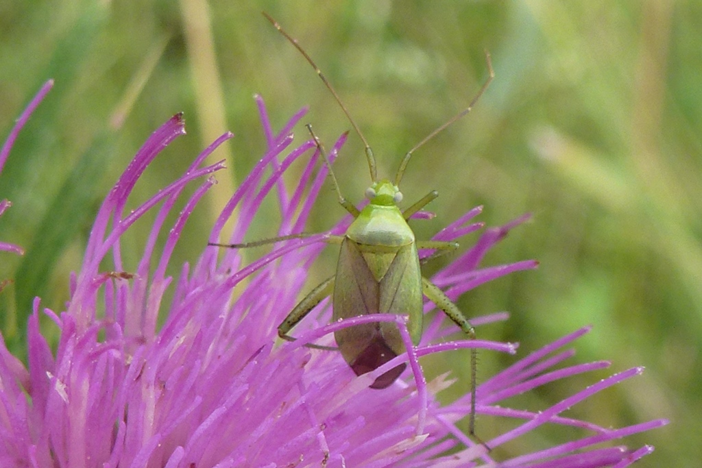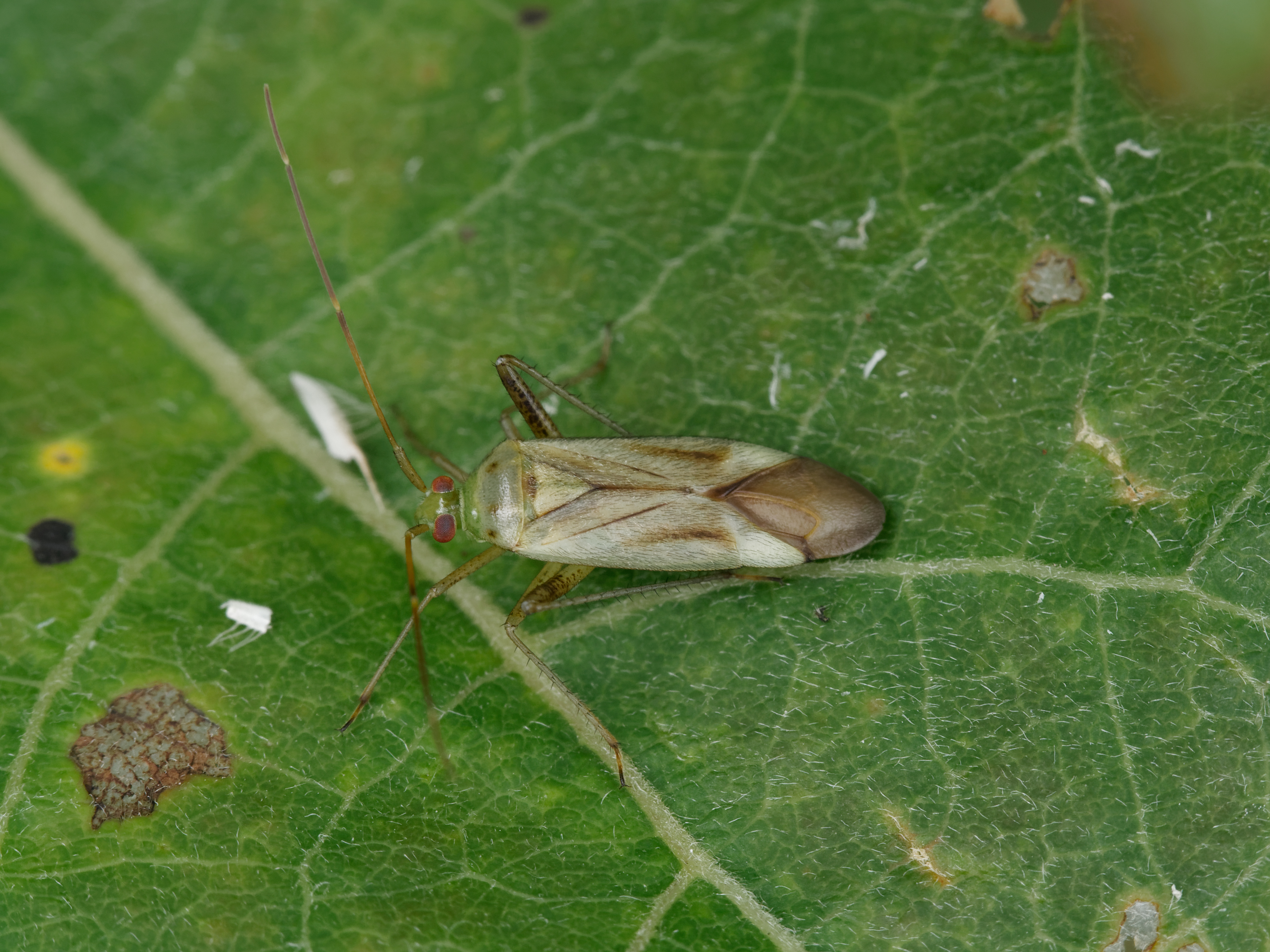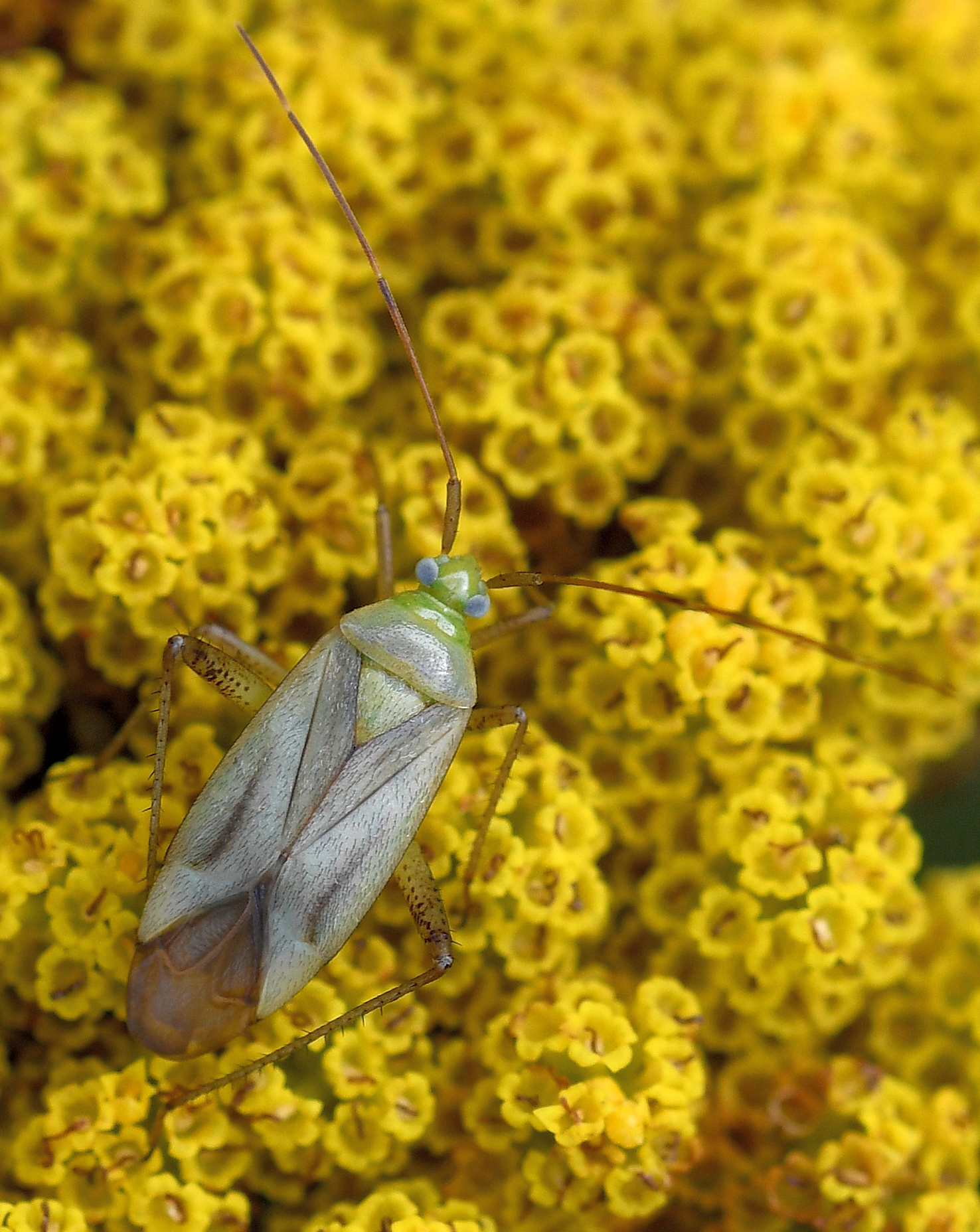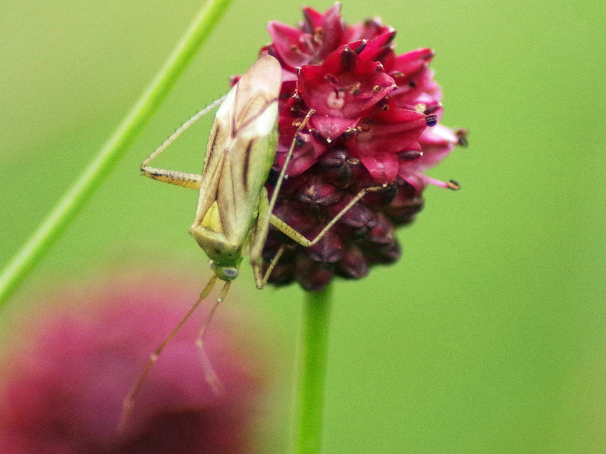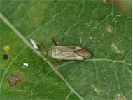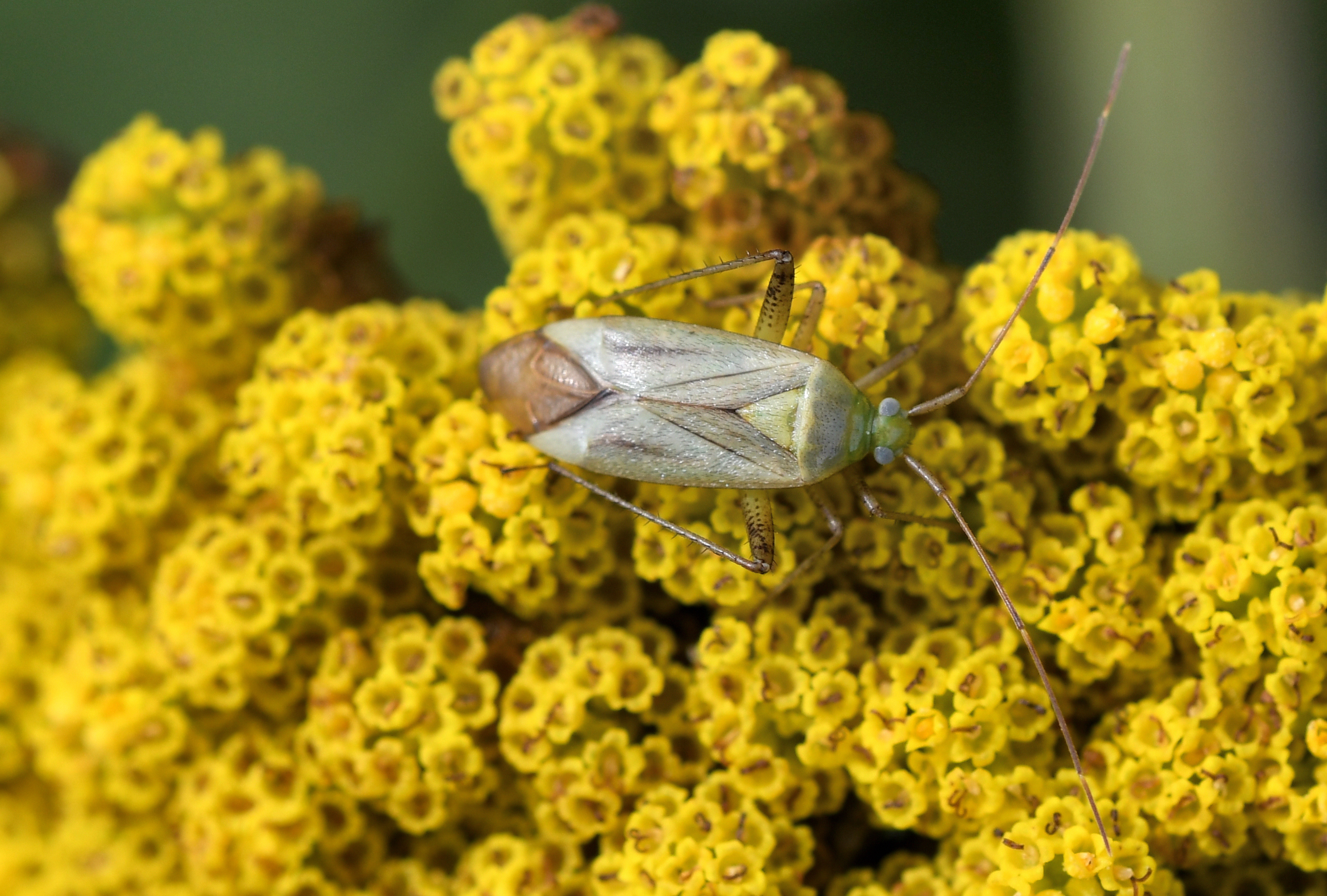 Exemplar von Adelphocoris quadripunctatus mit nur zwei deutlichen Punkten auf dem Halsschild sitzend auf auf Wiesenmargerite ( Leucanthemum vulgare s.l.), Ruderalflur an Straße Burgstädt-Lunzenau östlich Heiersdorf (Deutschland, Sachsen, Landkreis Mittelsachsen), 20.07.2009 (© Michael Münch)( Bild vergrößern)