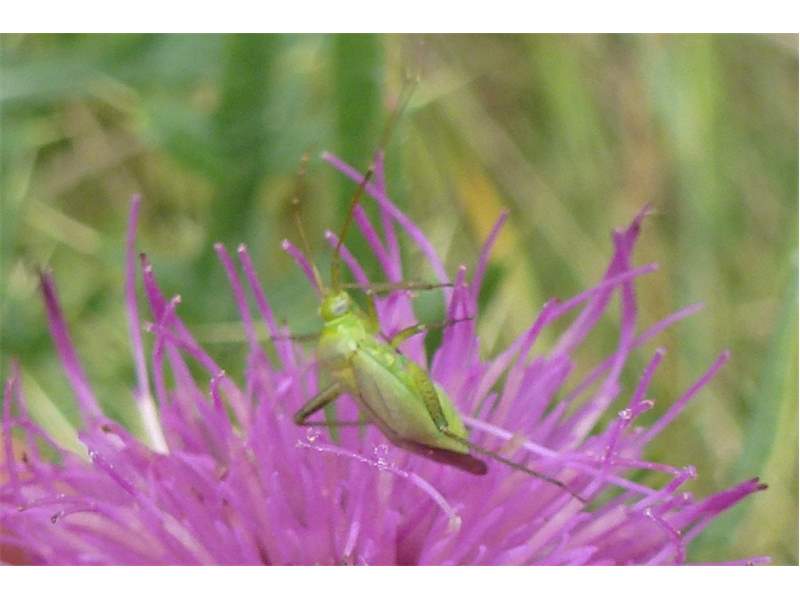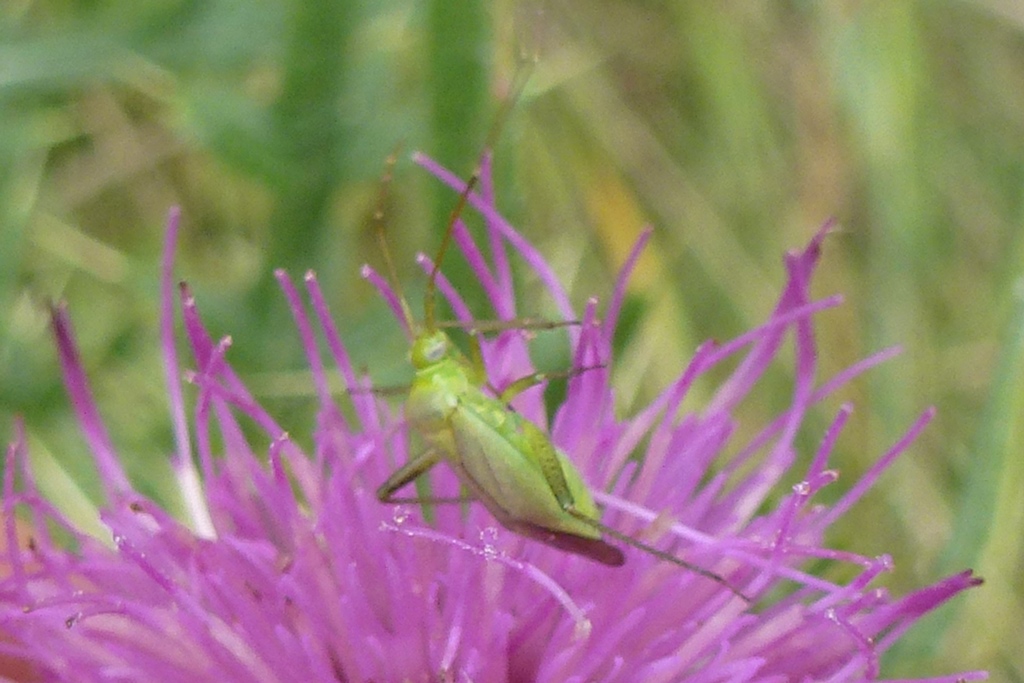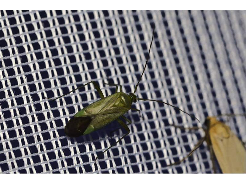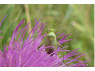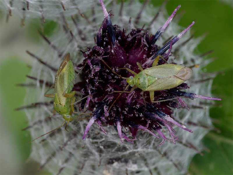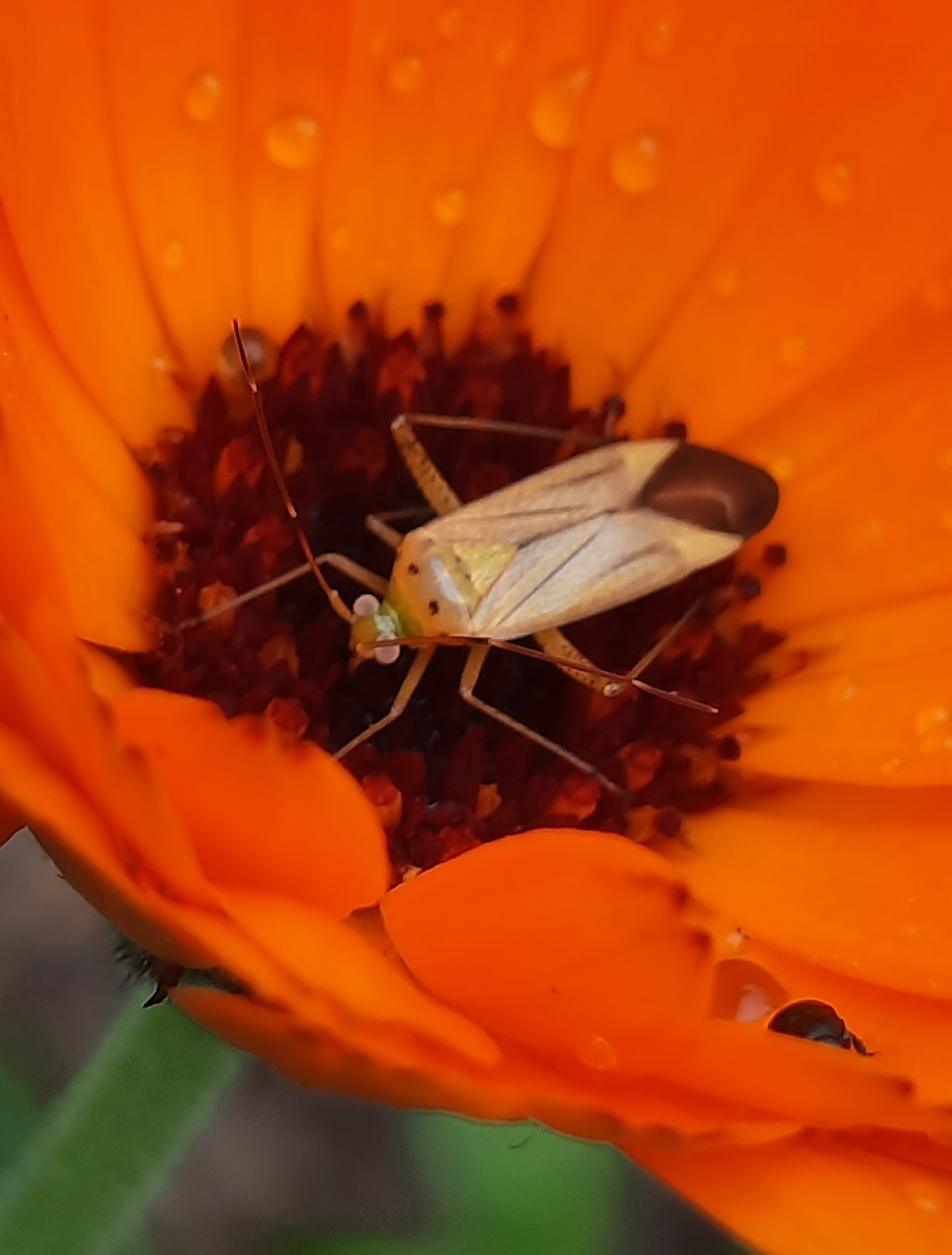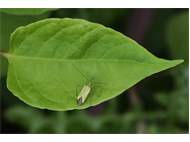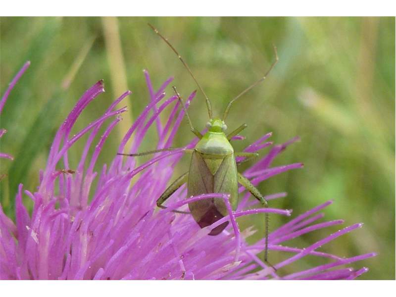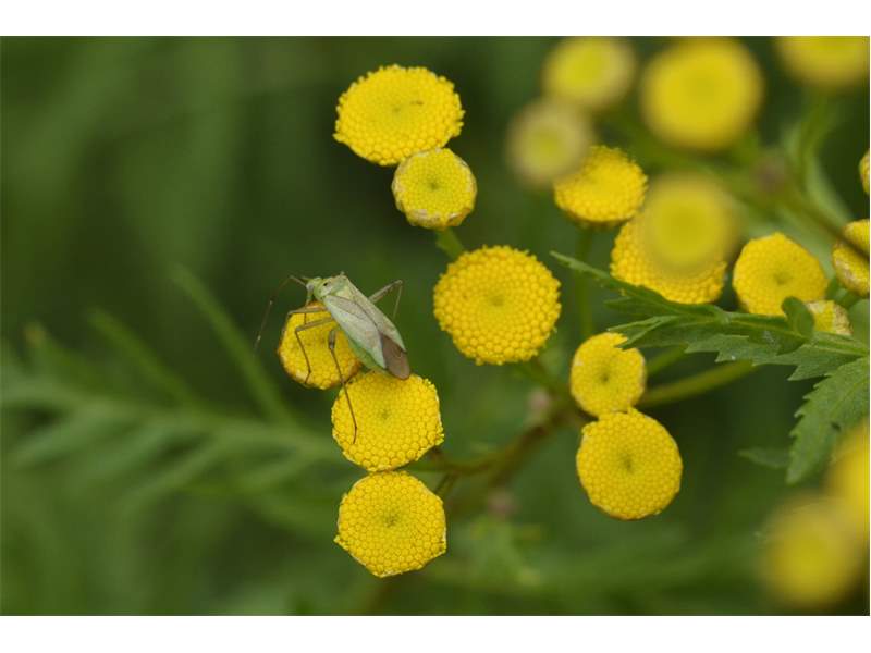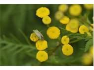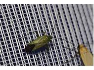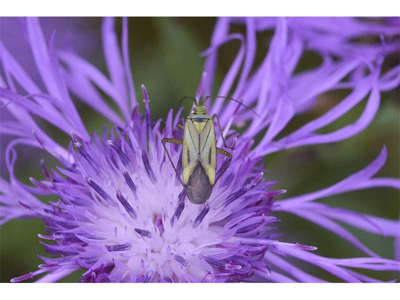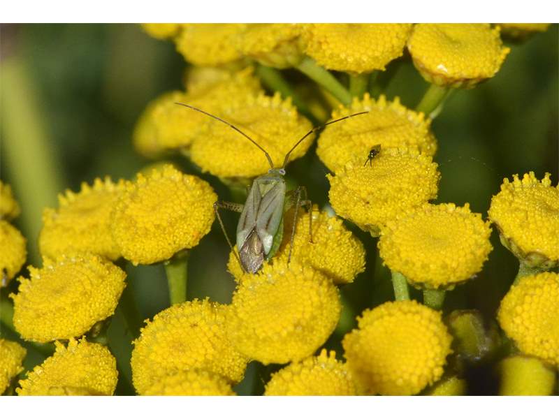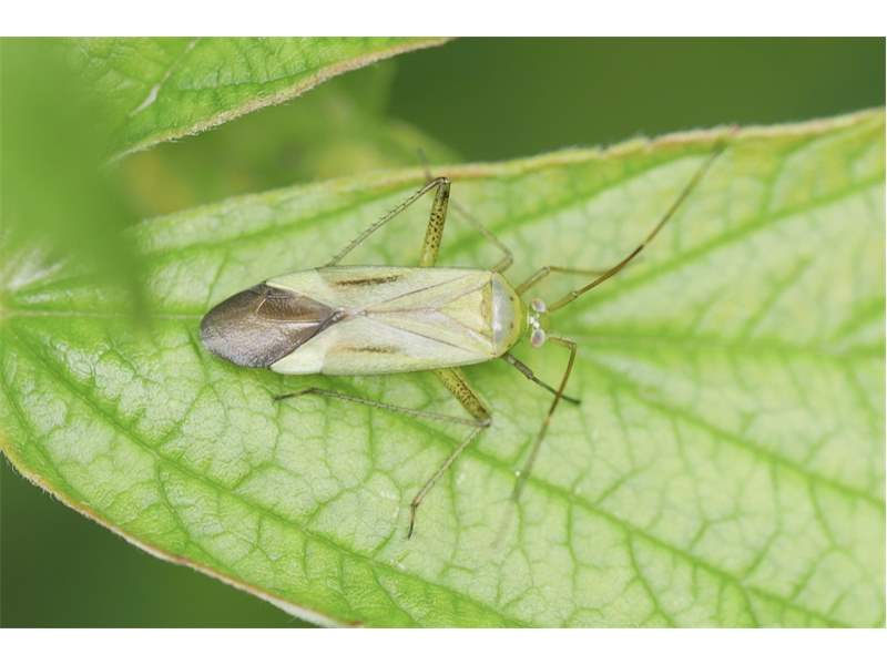 Exemplar von Adelphocoris quadripunctatus mit nur zwei deutlichen Punkten auf dem Halsschild sitzend auf auf Wiesenmargerite ( Leucanthemum vulgare s.l.), Ruderalflur an Straße Burgstädt-Lunzenau östlich Heiersdorf (Deutschland, Sachsen, Landkreis Mittelsachsen), 20.07.2009 (© Michael Münch)( Bild vergrößern)