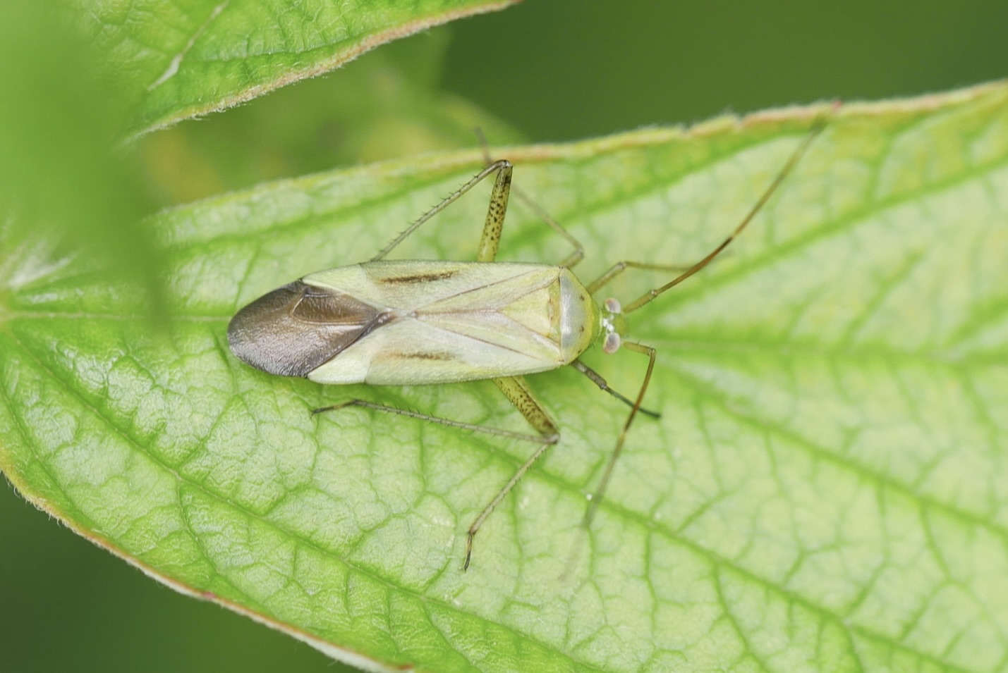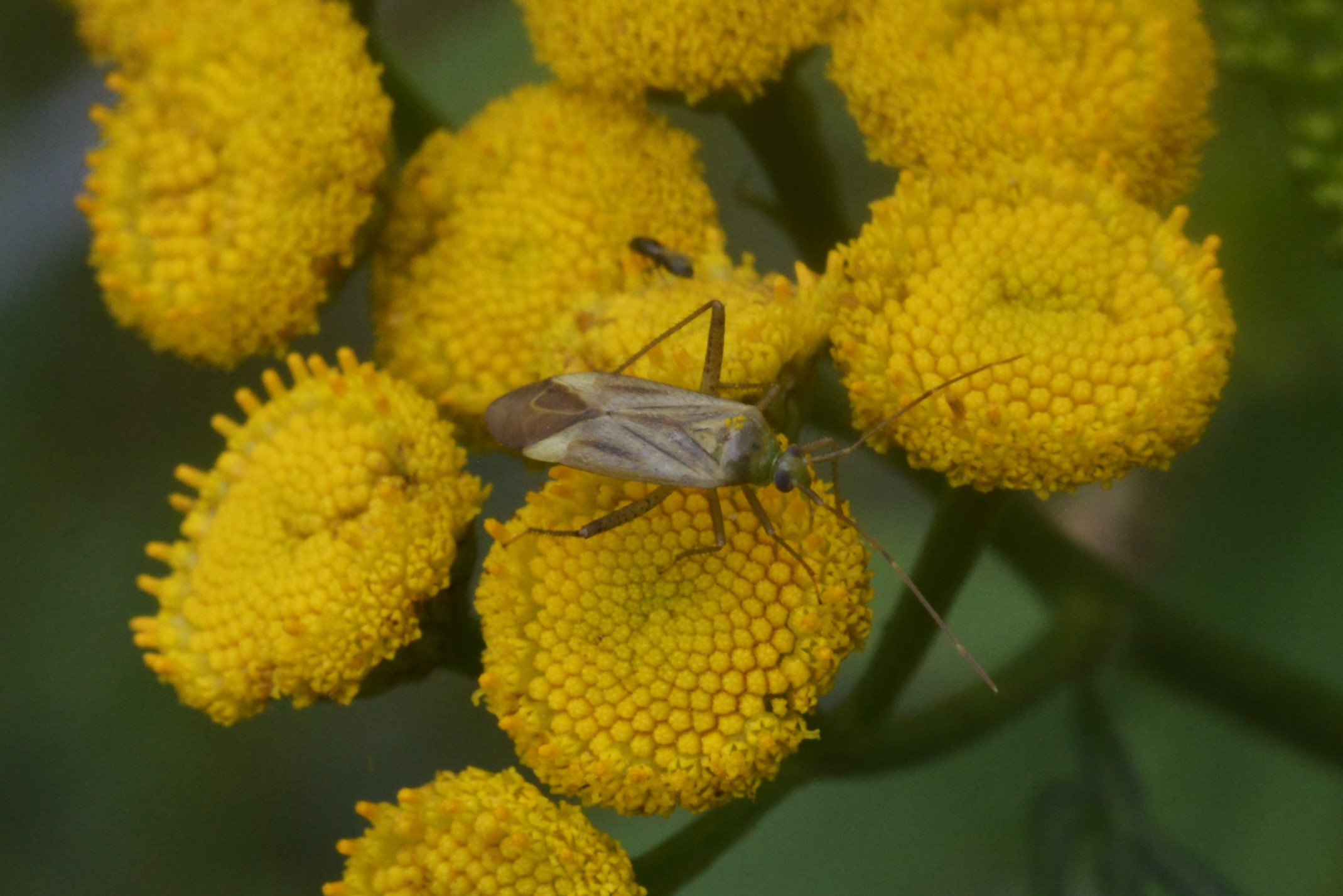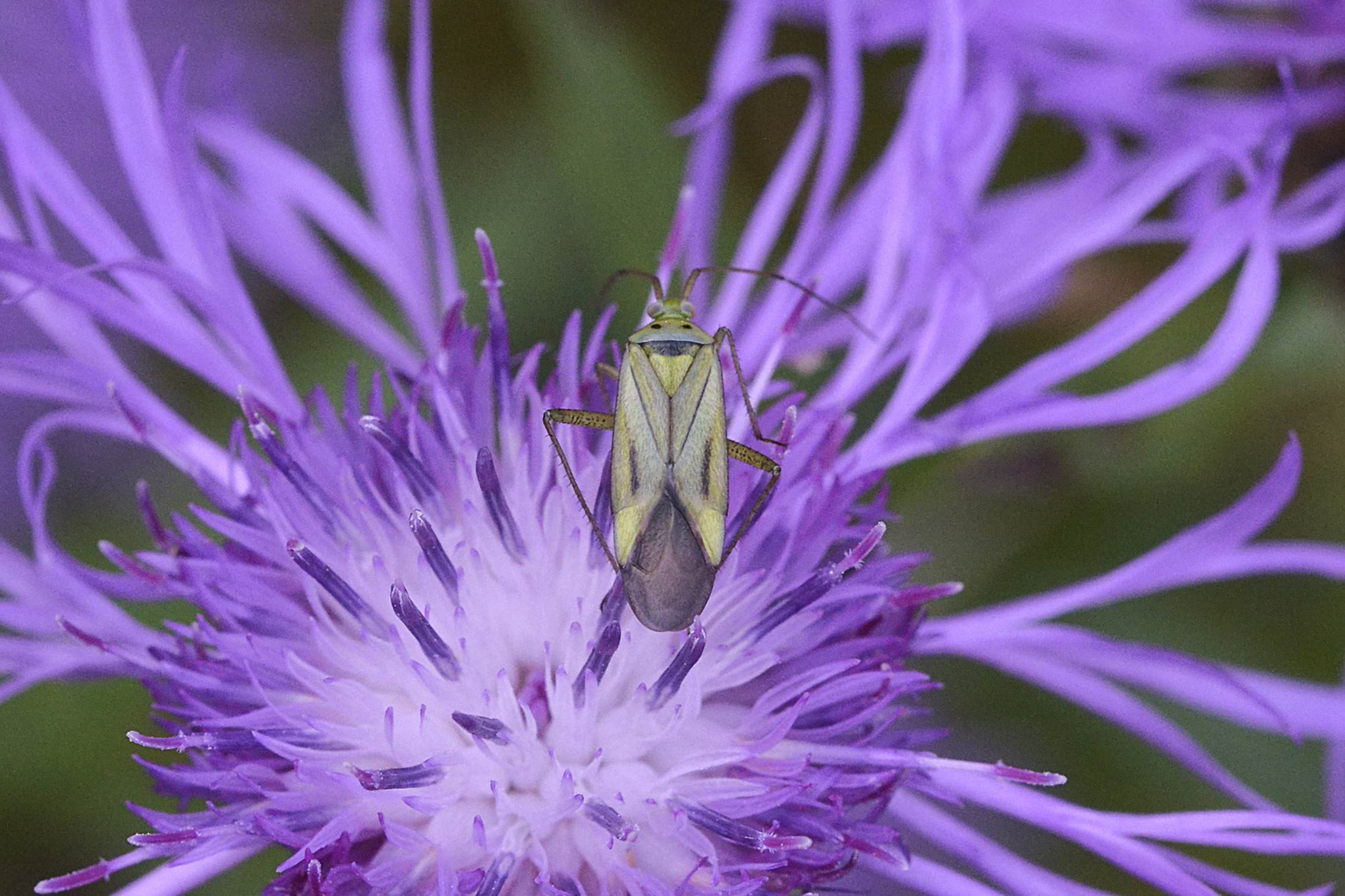 Exemplar von Adelphocoris quadripunctatus mit nur zwei deutlichen Punkten auf dem Halsschild sitzend auf auf Wiesenmargerite ( Leucanthemum vulgare s.l.), Ruderalflur an Straße Burgstädt-Lunzenau östlich Heiersdorf (Deutschland, Sachsen, Landkreis Mittelsachsen), 20.07.2009