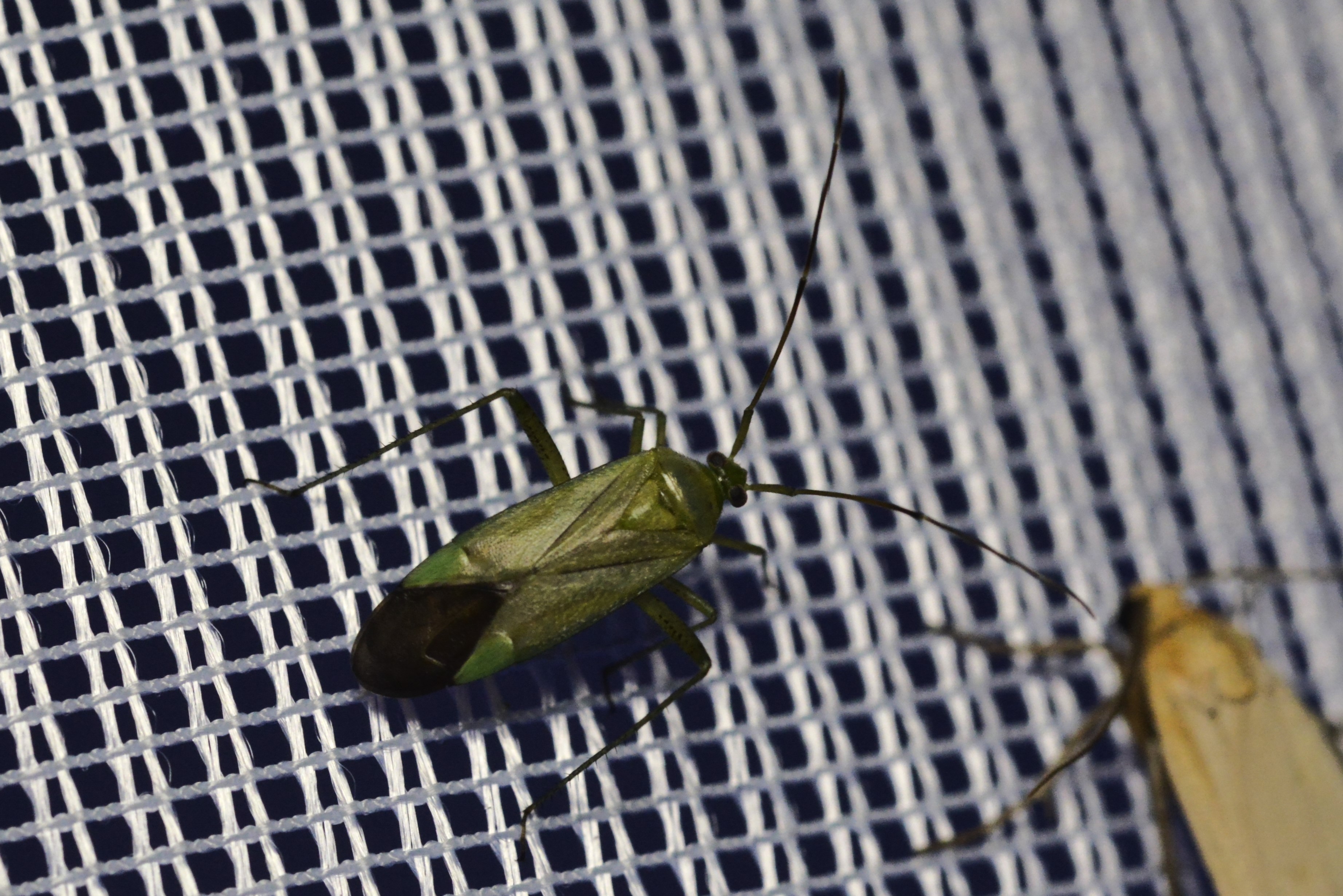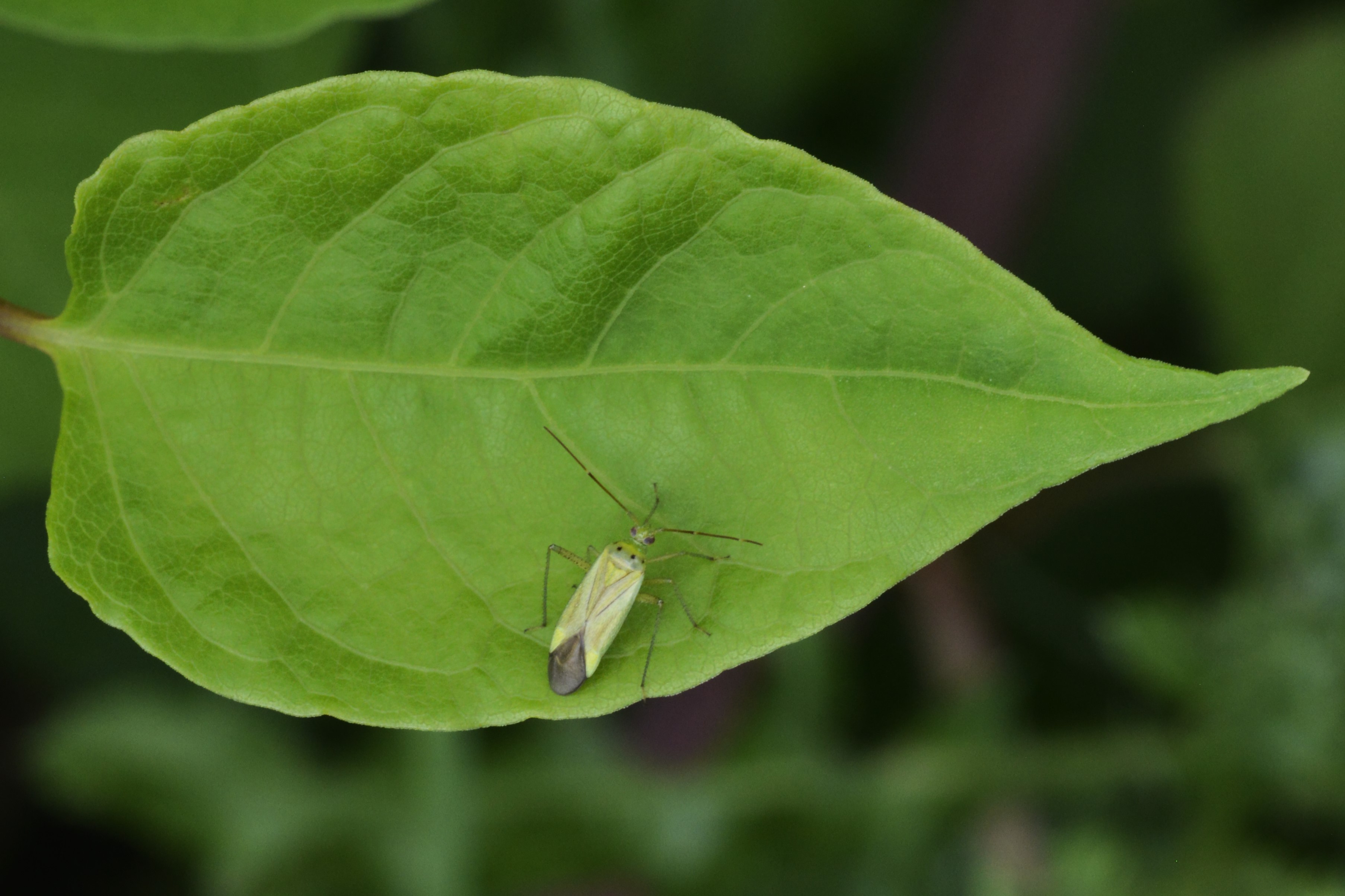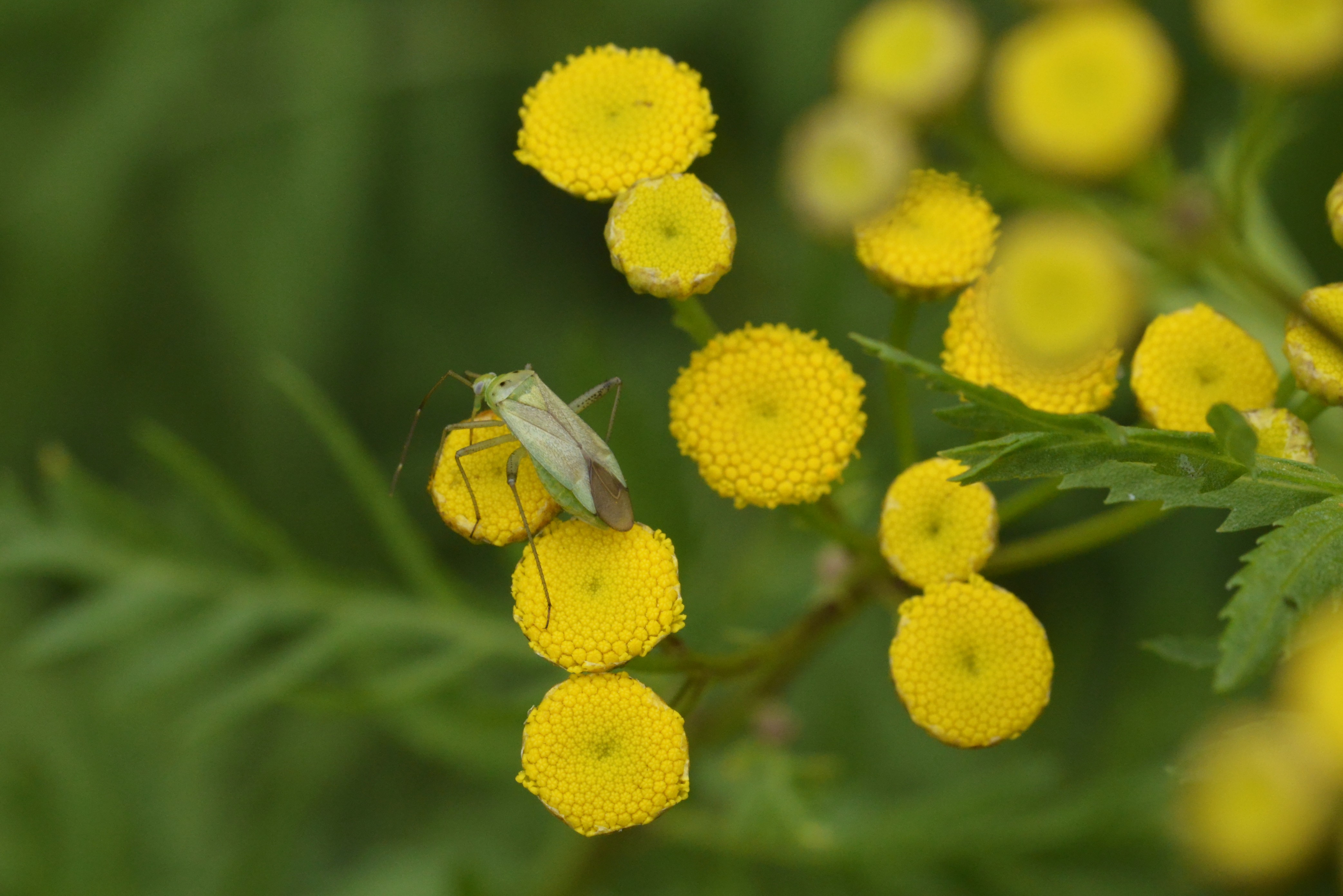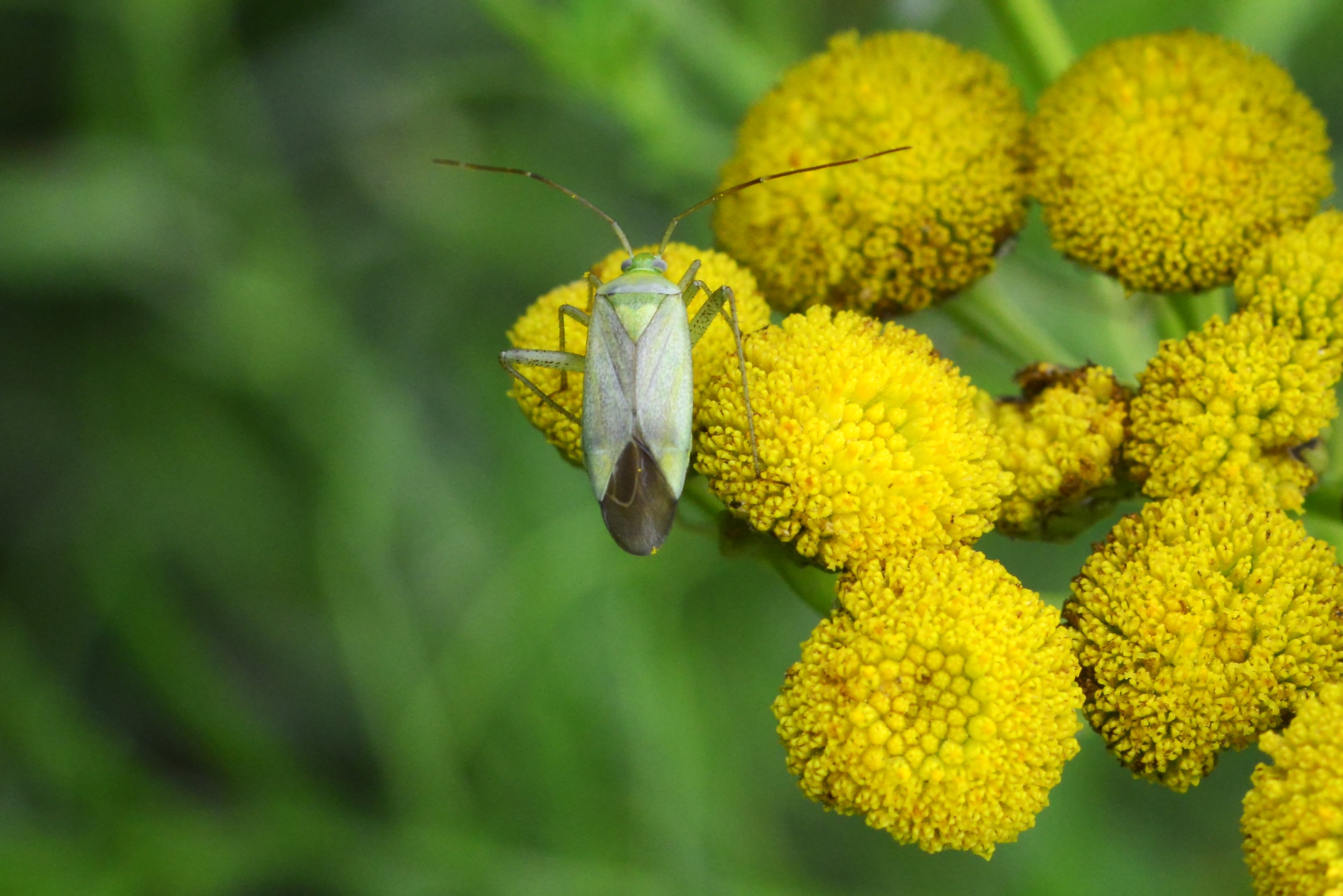 Exemplar von Adelphocoris quadripunctatus mit nur zwei deutlichen Punkten auf dem Halsschild sitzend auf auf Wiesenmargerite ( Leucanthemum vulgare s.l.), Ruderalflur an Straße Burgstädt-Lunzenau östlich Heiersdorf (Deutschland, Sachsen, Landkreis Mittelsachsen), 20.07.2009