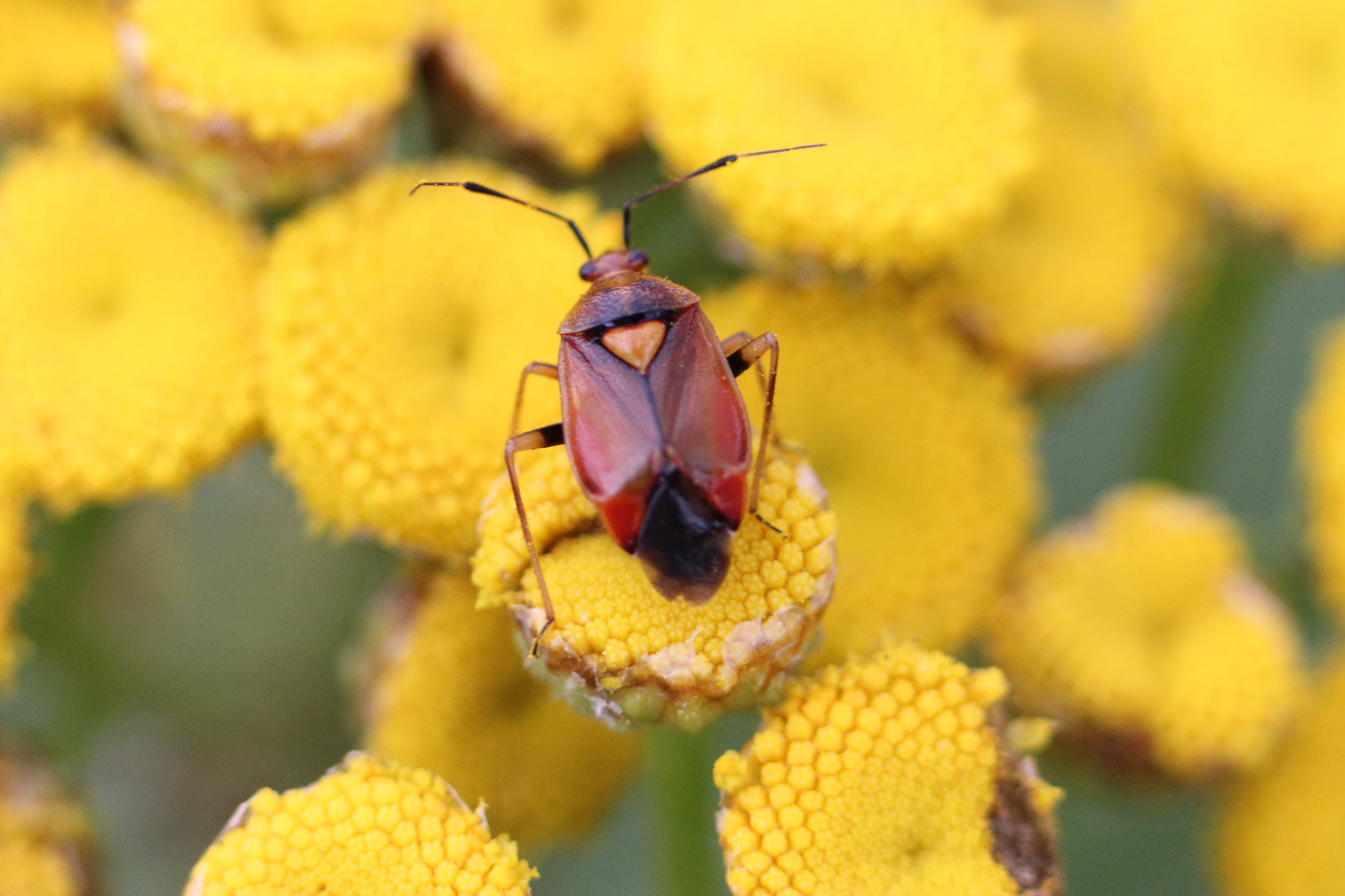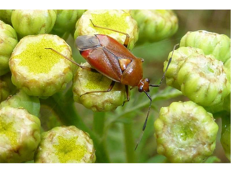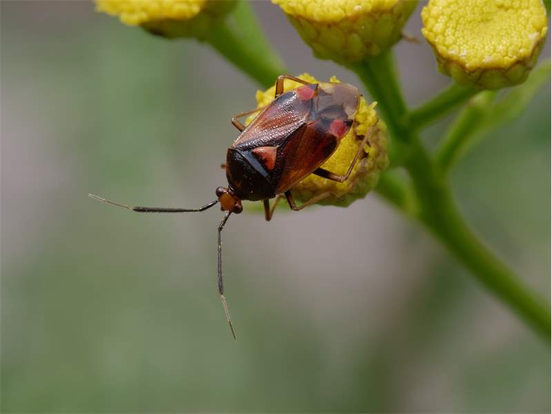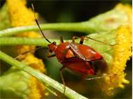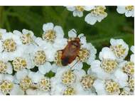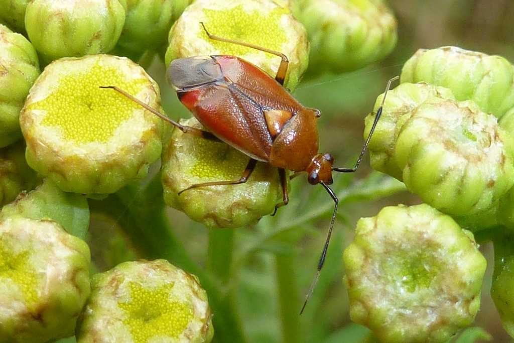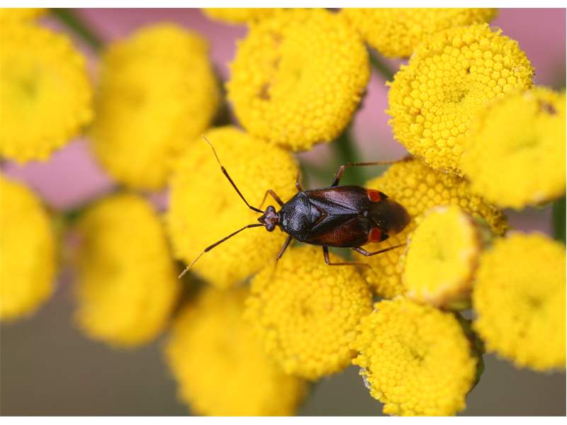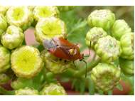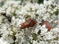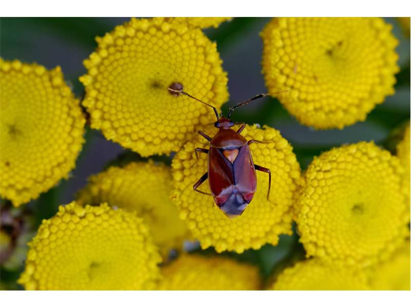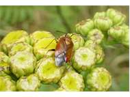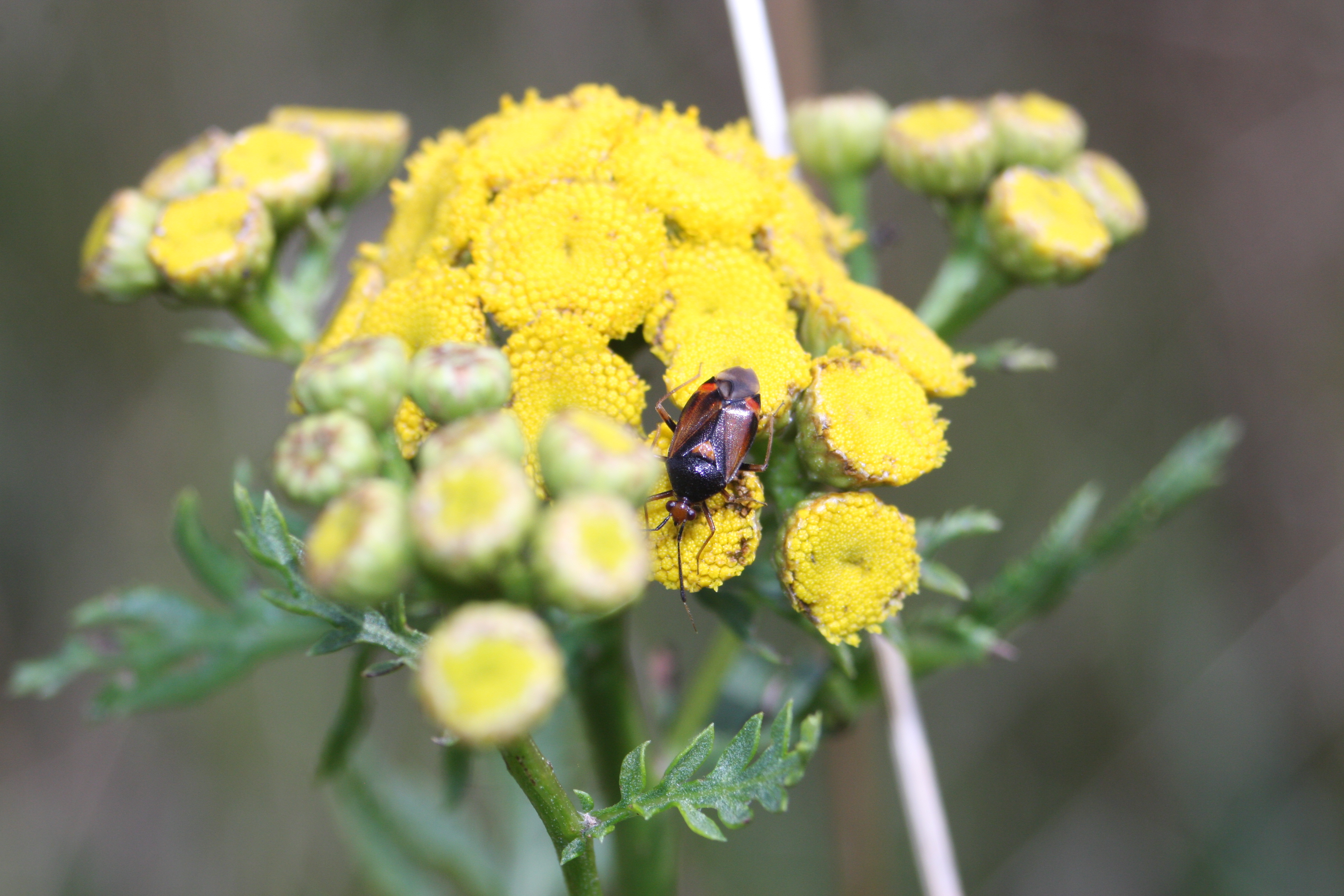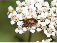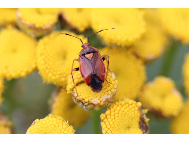 Rote Weichwanze auf Rainfarnblüten (Tanacetum vulgare). Radeberg, Juli 2008